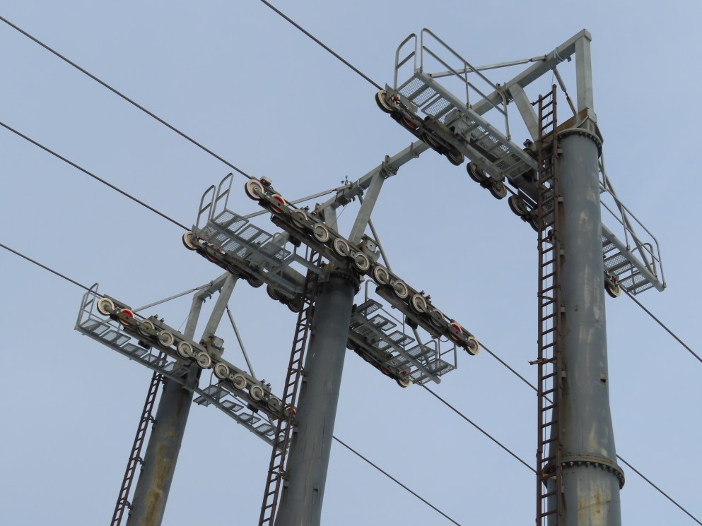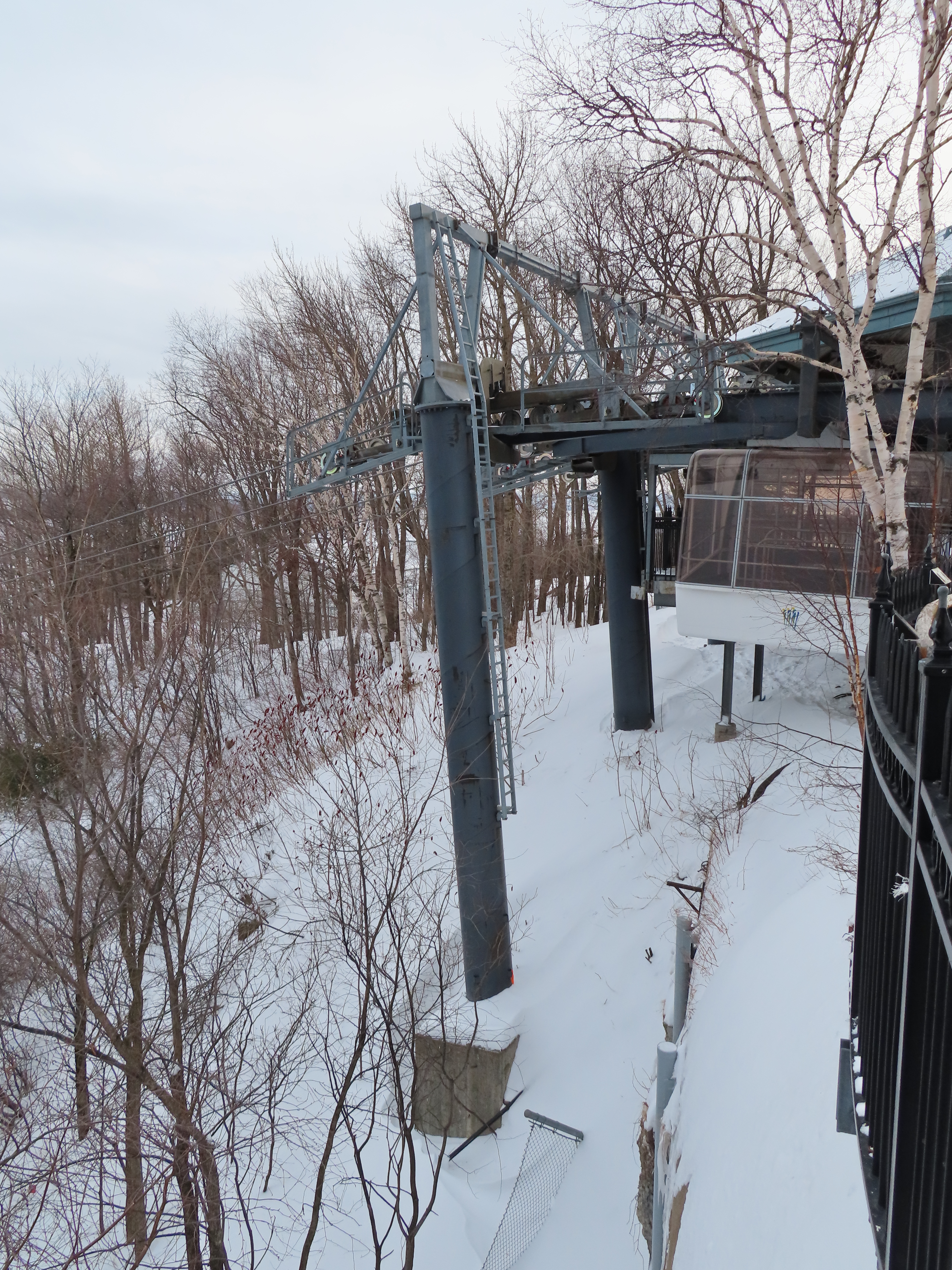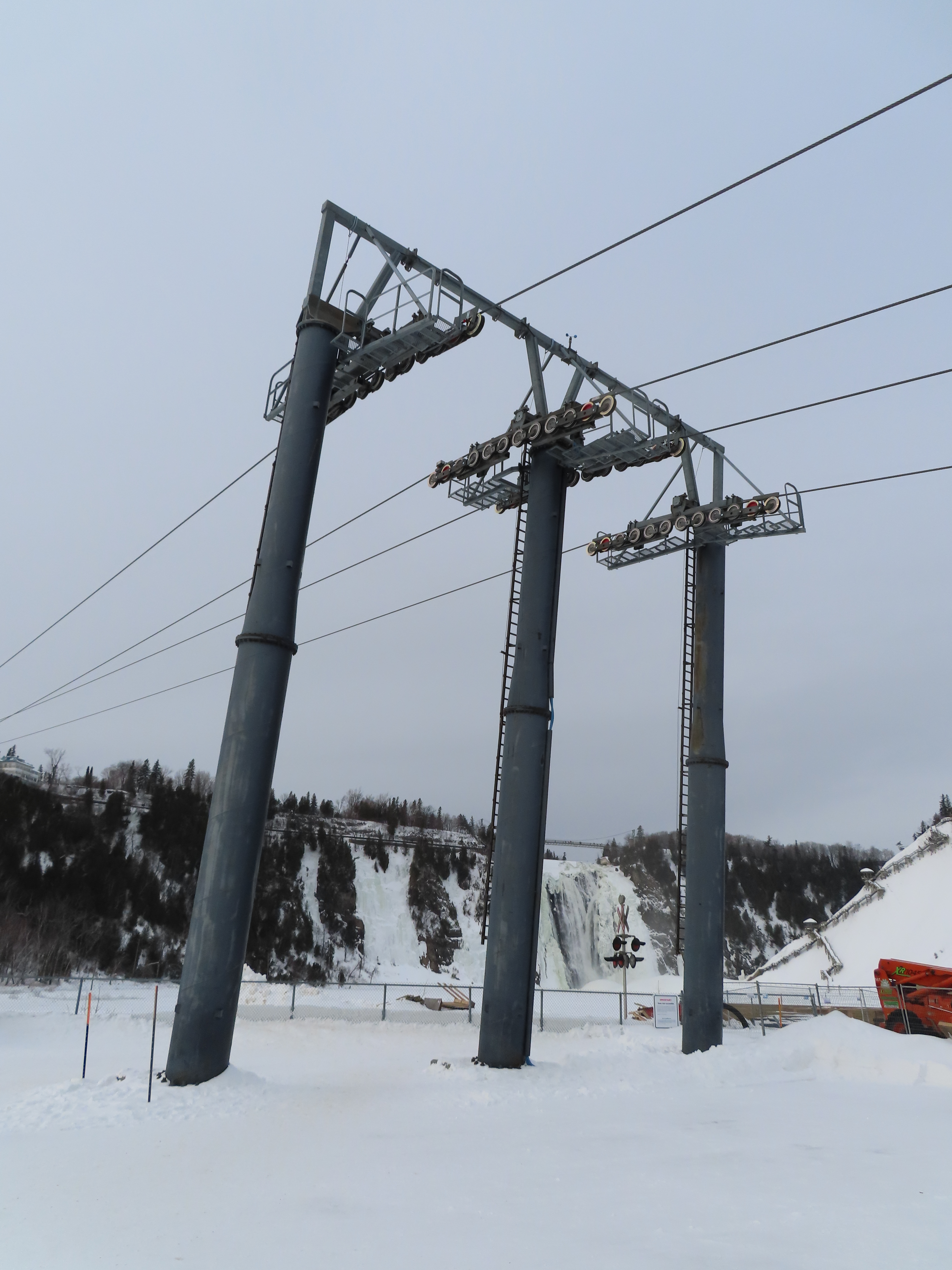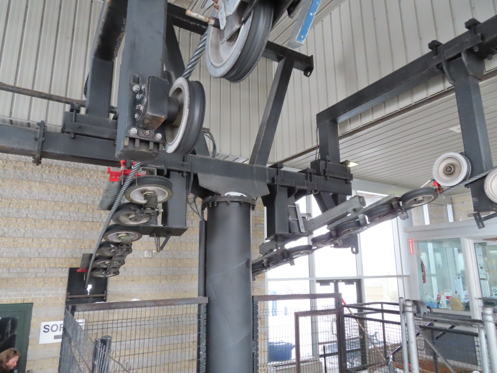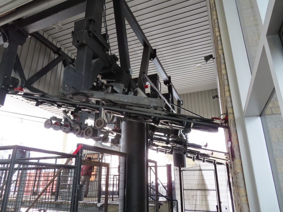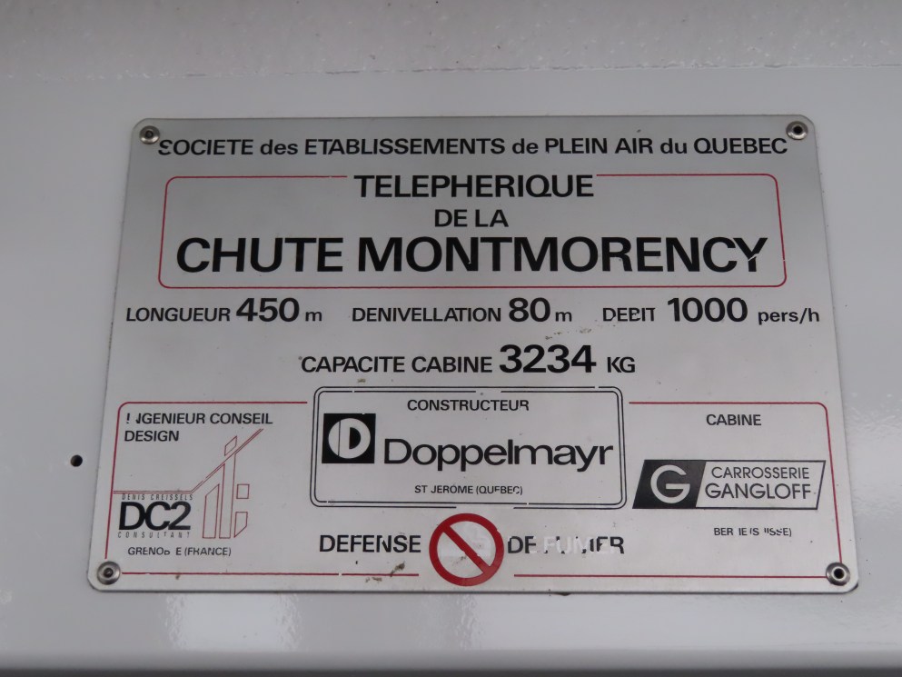 This short jig back lift provides views of a nearby waterfall.There is no easy way to walk between the top and bottom of the falls so the lift provides a link.The carriers are Gangloff funitel models for 30 passengers.There is only one tower near the bottom terminal.Beacuse the falls is on one side of the lift, both cabins face the same direction with stadium style risers for rows of passengers.The cabins are supported from two ropes for wind stability.Cabin plaque.Loading area up top.View down the line for cabin one.There are three bullwheels up top.The top terminal has another set of tower-like structures.Tower one seen from the summit.The outer rope makes two 90 degree turns up top.Upper station building.Loading area for cabin 1.All three top bullwheels.Lower station building.Lift line overview.A cabin facing the falls with loading doors on the opposite sides.Cabin near the summit.Another view of the top terminal.Return bullwheel.Upgraded Doppelmayr controls.Cabin 2 ascending.Closeup of the front of a cabin.Dual loading doors.View up from the bottom terminal.Equipment in the lower station.There are lots of different sheaves deflecting the ropes in different direction.The top station seen from below.Tower 1.Door side of a cabin.