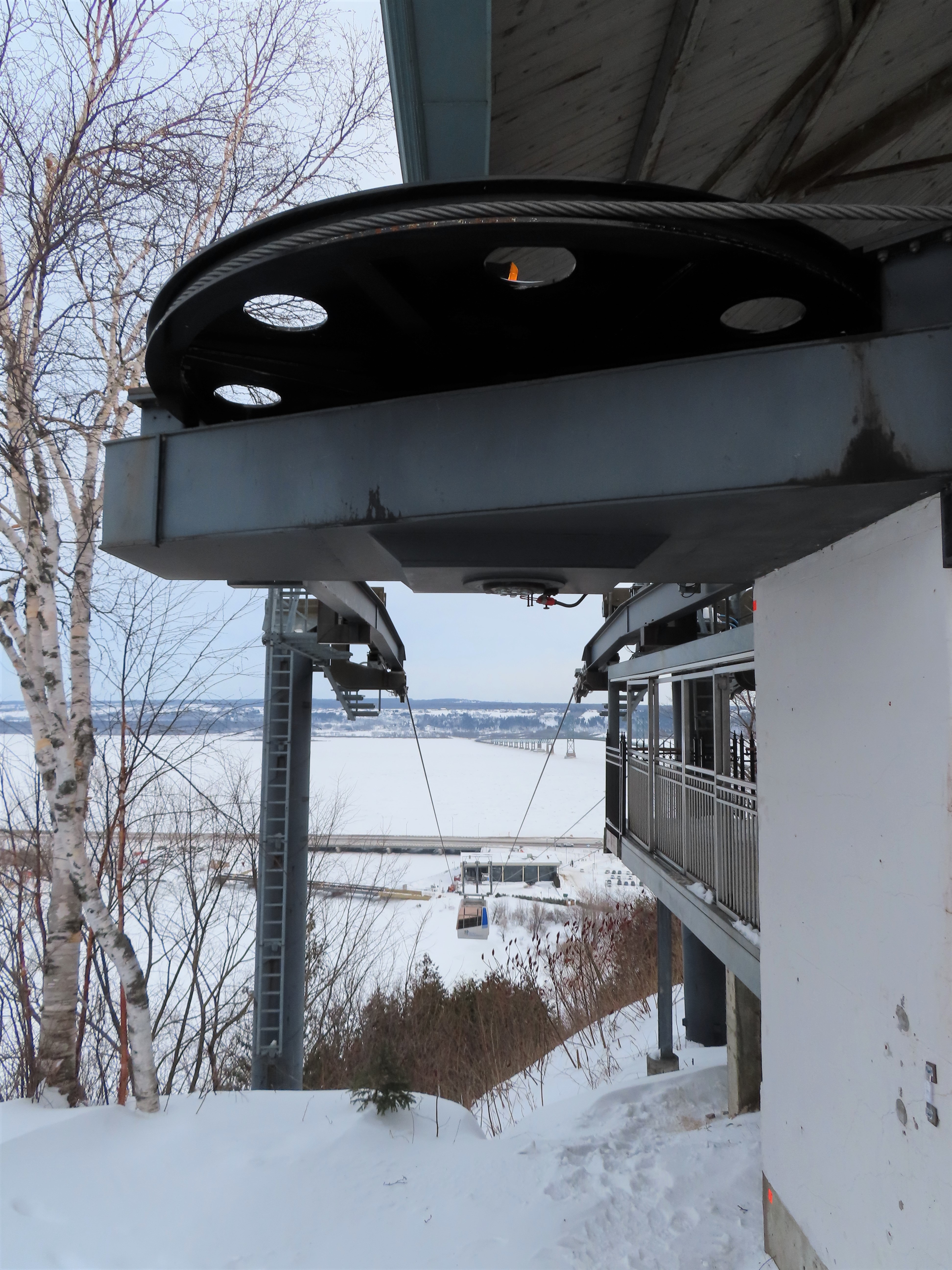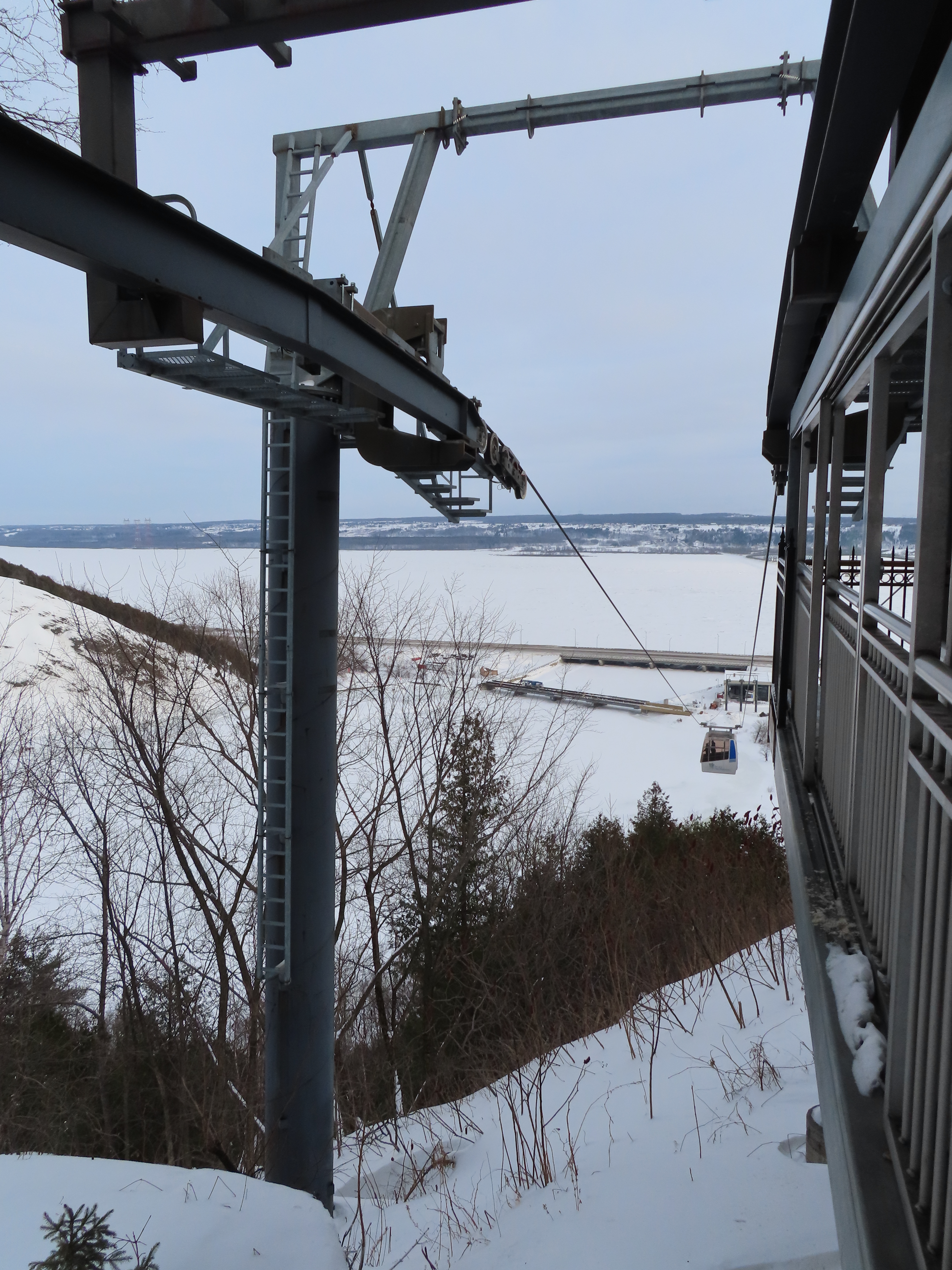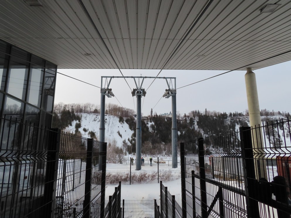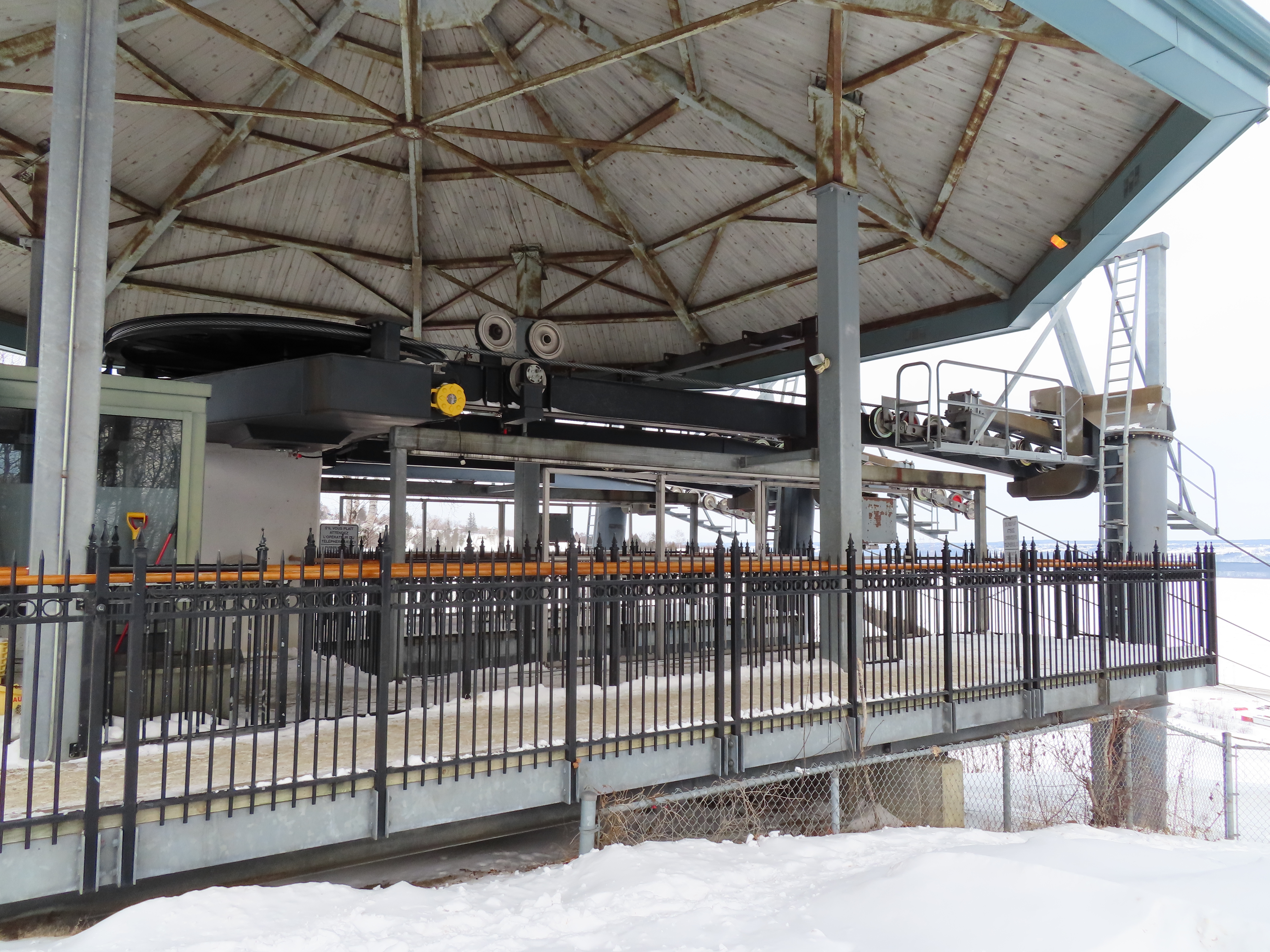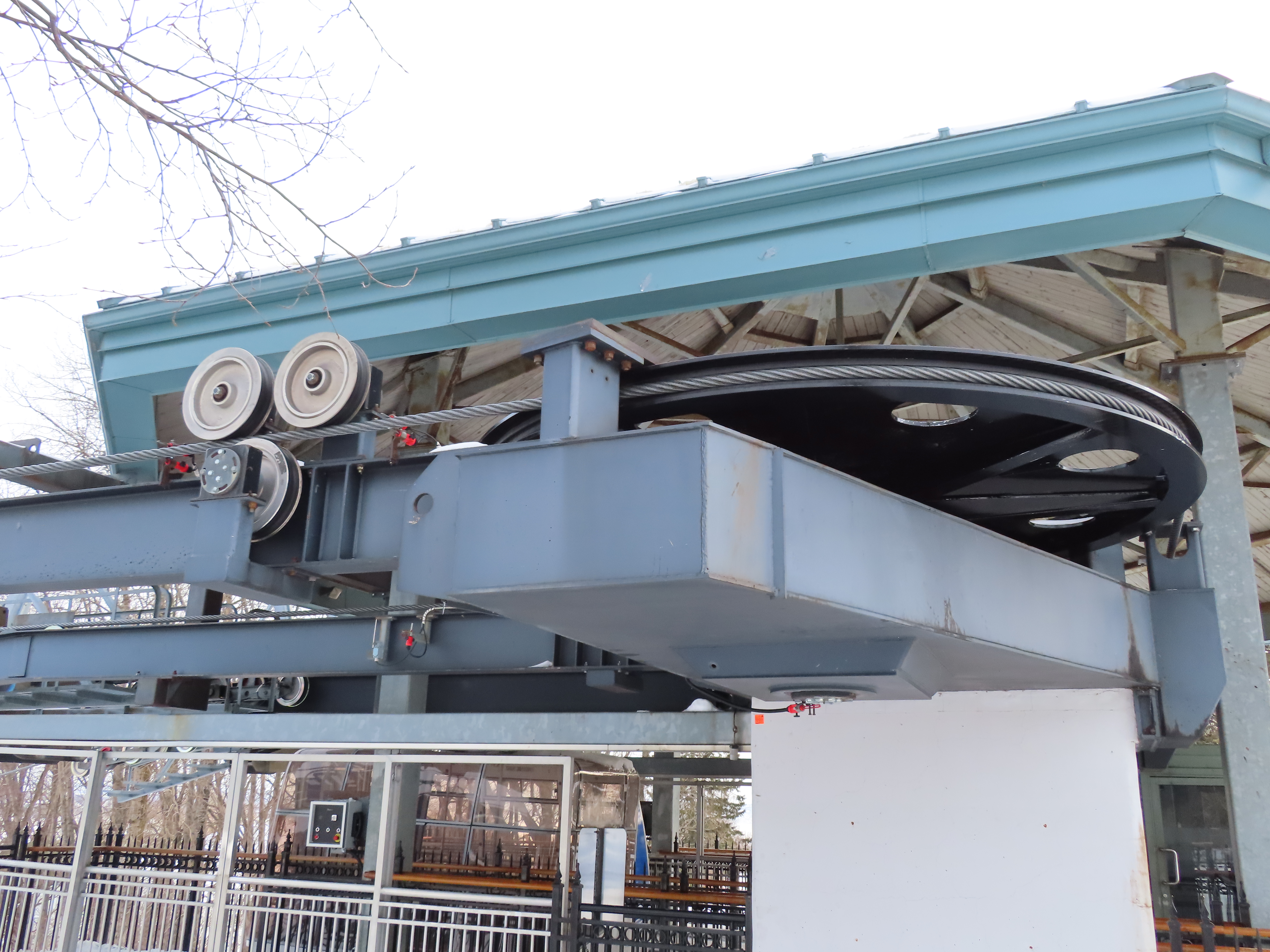 This short jig back lift provides views of a nearby waterfall.There is no easy way to walk between the top and bottom of the falls so the lift provides a link.The carriers are Gangloff funitel models for 30 passengers.There is only one tower near the bottom terminal.Beacuse the falls is on one side of the lift, both cabins face the same direction with stadium style risers for rows of passengers.The cabins are supported from two ropes for wind stability.Cabin plaque.Loading area up top.View down the line for cabin one.There are three bullwheels up top.The top terminal has another set of tower-like structures.Tower one seen from the summit.The outer rope makes two 90 degree turns up top.Upper station building.Loading area for cabin 1.All three top bullwheels.Lower station building.Lift line overview.A cabin facing the falls with loading doors on the opposite sides.Cabin near the summit.Another view of the top terminal.Return bullwheel.Upgraded Doppelmayr controls.Cabin 2 ascending.Closeup of the front of a cabin.Dual loading doors.View up from the bottom terminal.Equipment in the lower station.There are lots of different sheaves deflecting the ropes in different direction.The top station seen from below.Tower 1.Door side of a cabin.
