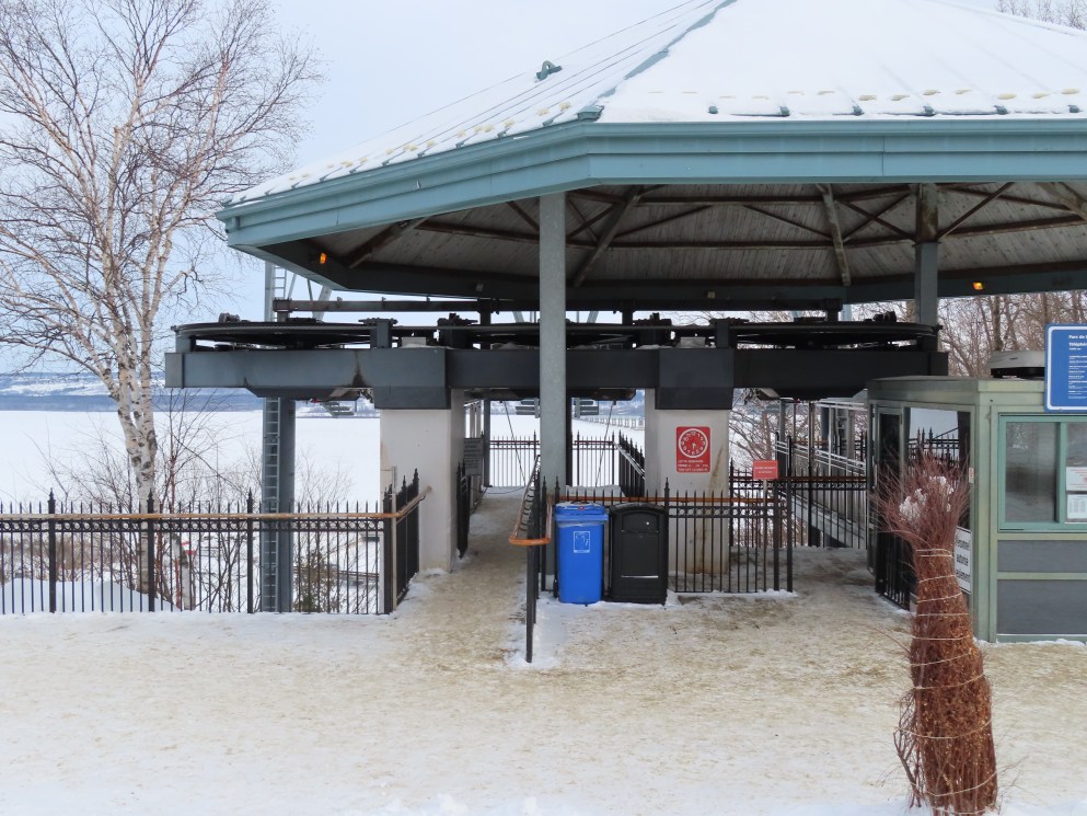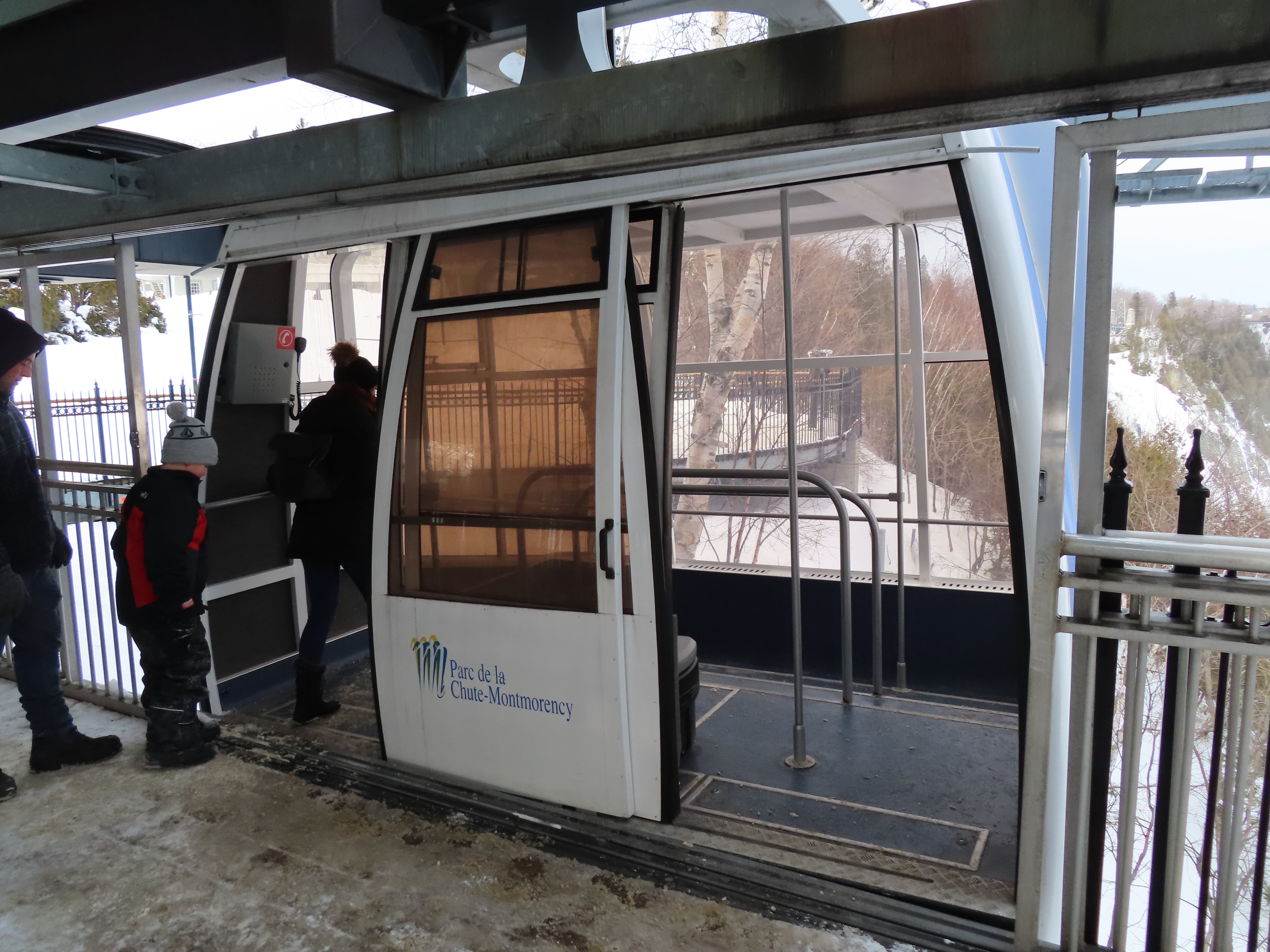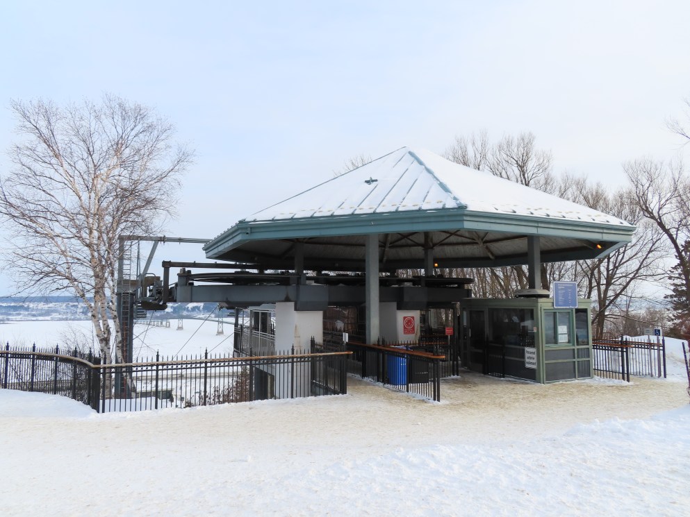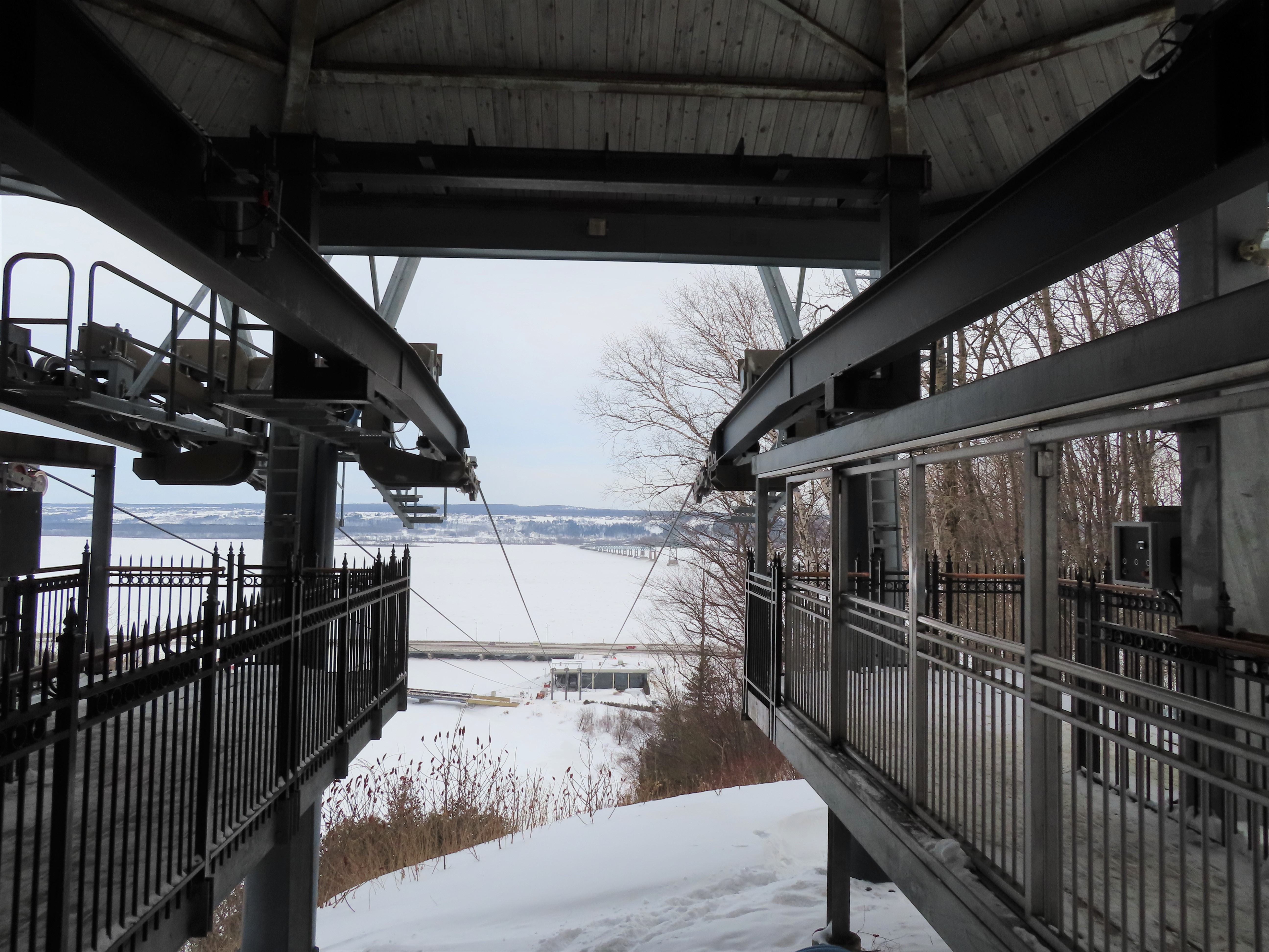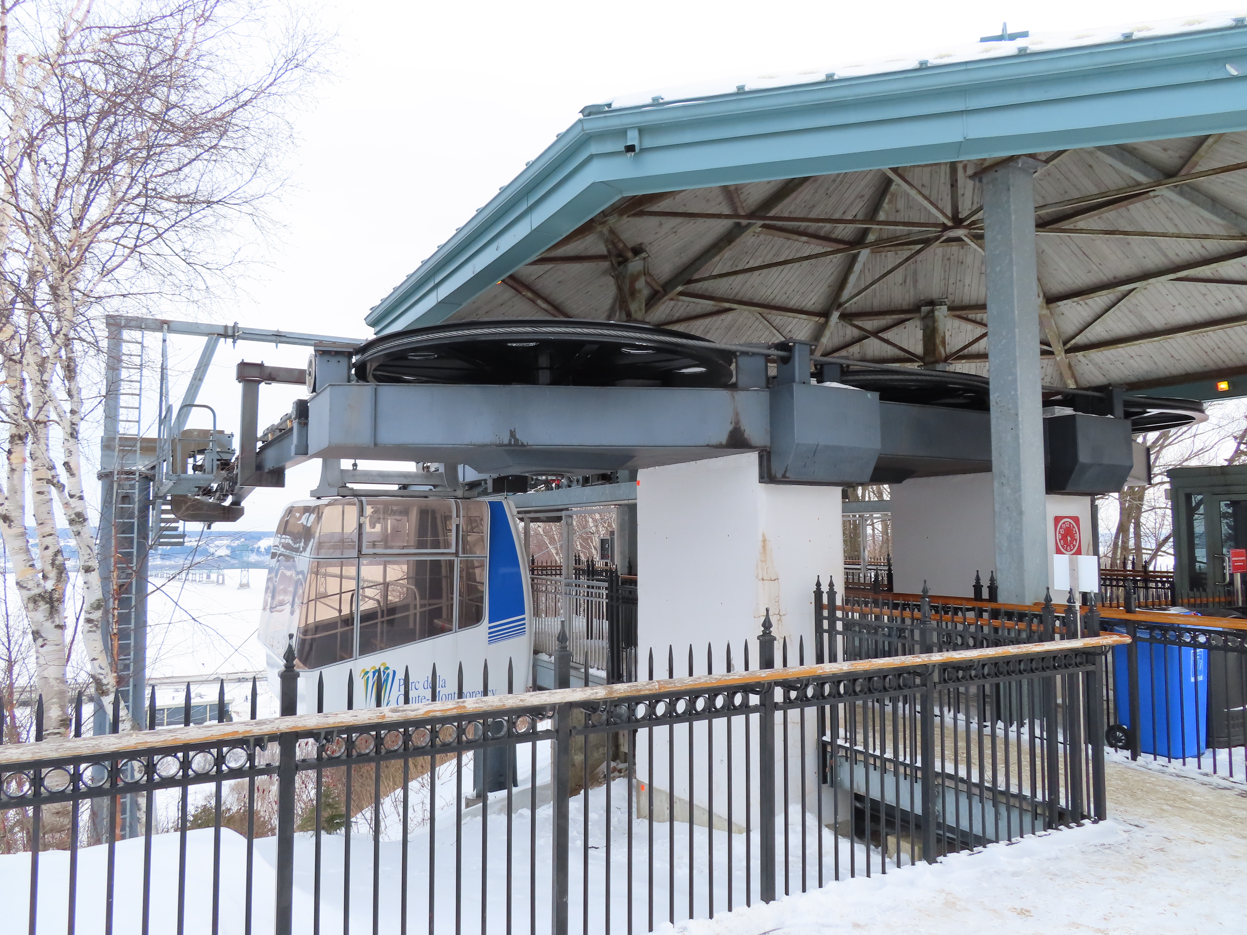 This short jig back lift provides views of a nearby waterfall.There is no easy way to walk between the top and bottom of the falls so the lift provides a link.The carriers are Gangloff funitel models for 30 passengers.There is only one tower near the bottom terminal.Beacuse the falls is on one side of the lift, both cabins face the same direction with stadium style risers for rows of passengers.The cabins are supported from two ropes for wind stability.Cabin plaque.Loading area up top.View down the line for cabin one.There are three bullwheels up top.The top terminal has another set of tower-like structures.Tower one seen from the summit.The outer rope makes two 90 degree turns up top.Upper station building.Loading area for cabin 1.All three top bullwheels.Lower station building.Lift line overview.A cabin facing the falls with loading doors on the opposite sides.Cabin near the summit.Another view of the top terminal.Return bullwheel.Upgraded Doppelmayr controls.Cabin 2 ascending.Closeup of the front of a cabin.Dual loading doors.View up from the bottom terminal.Equipment in the lower station.There are lots of different sheaves deflecting the ropes in different direction.The top station seen from below.Tower 1.Door side of a cabin.