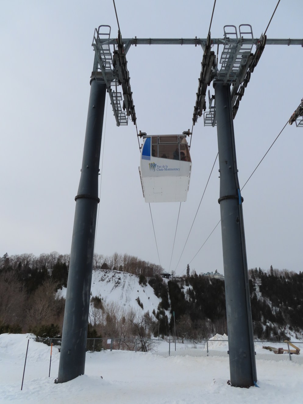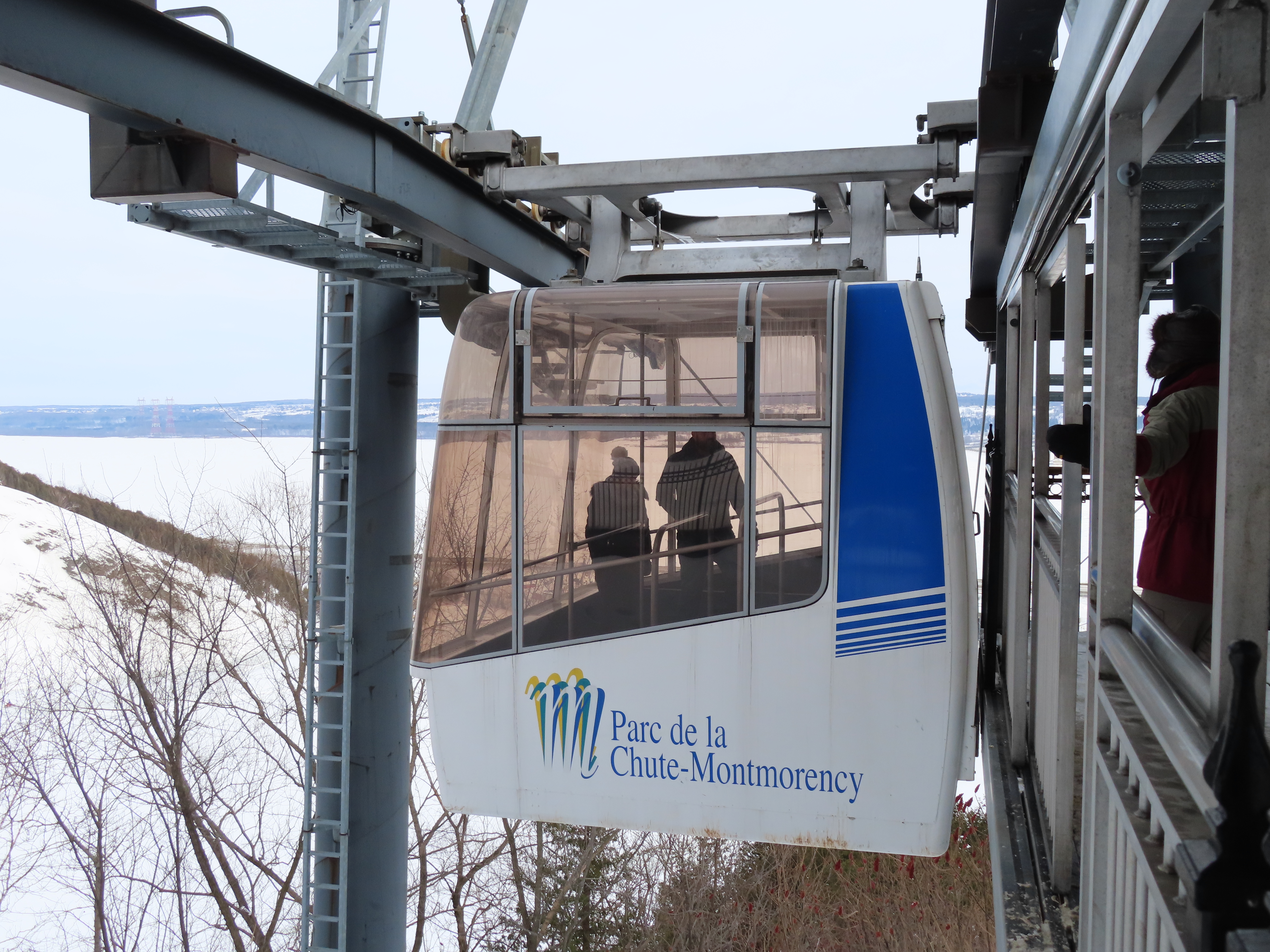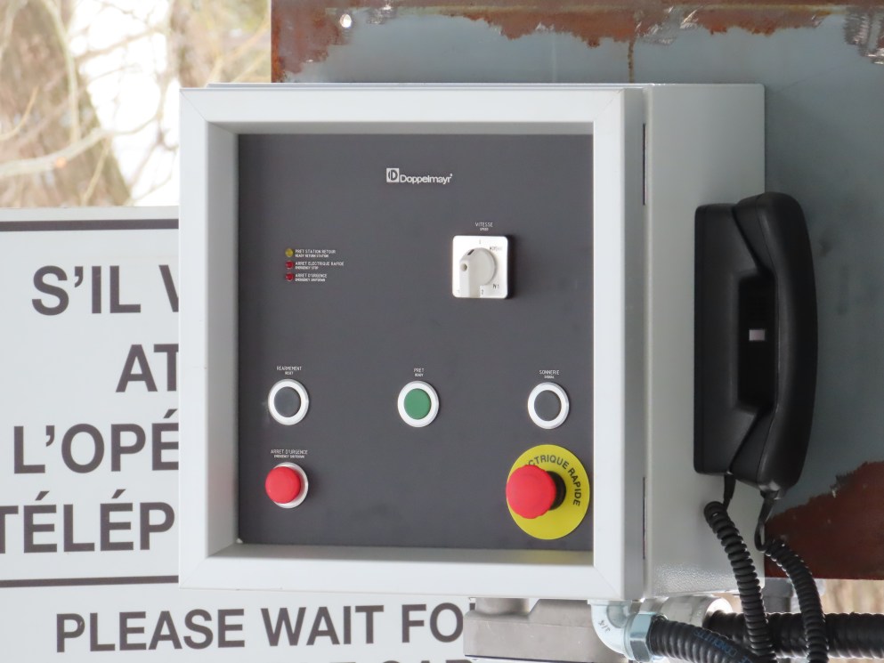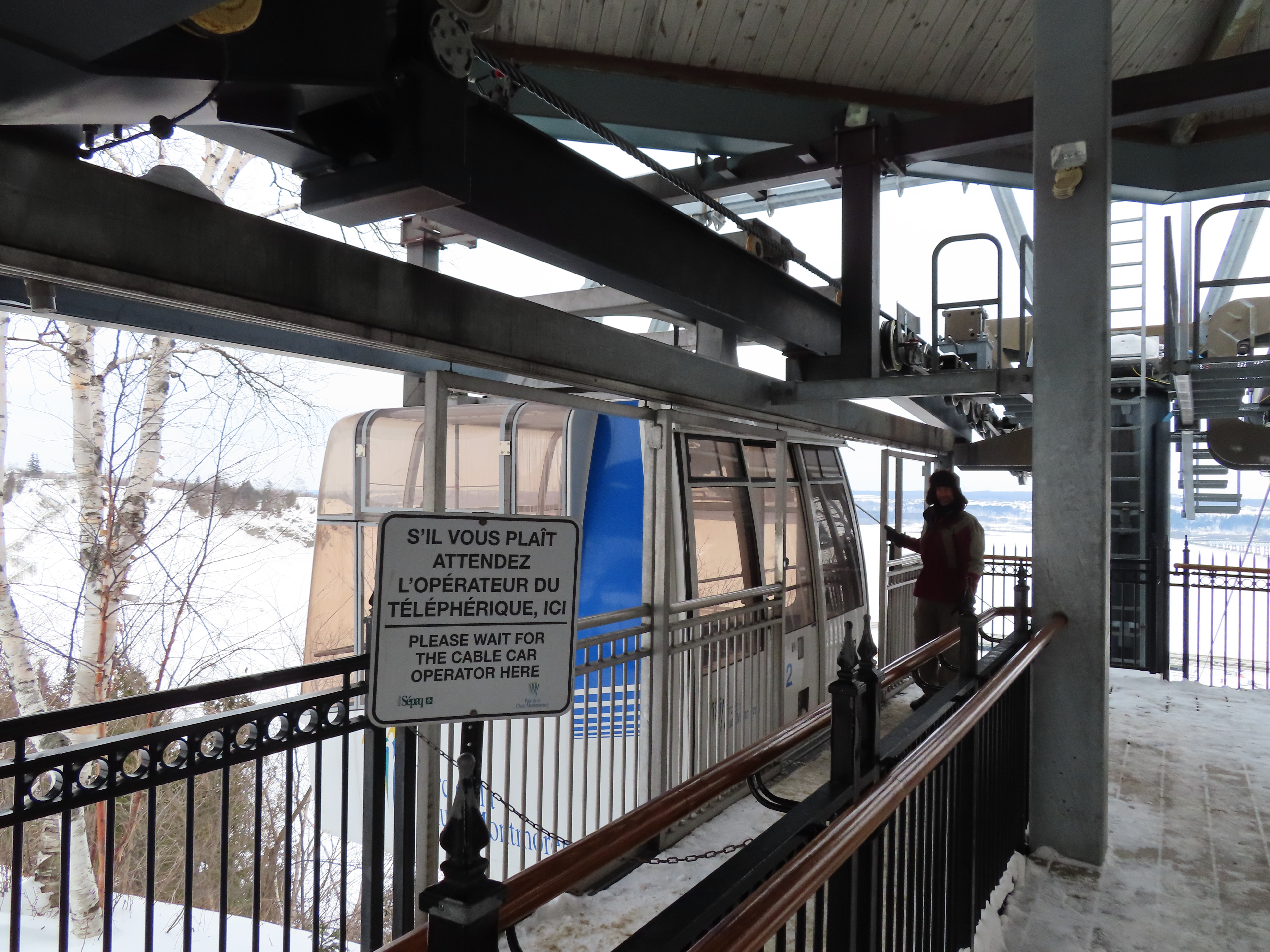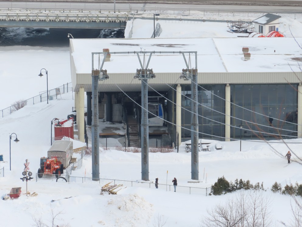 This short jig back lift provides views of a nearby waterfall.There is no easy way to walk between the top and bottom of the falls so the lift provides a link.The carriers are Gangloff funitel models for 30 passengers.There is only one tower near the bottom terminal.Beacuse the falls is on one side of the lift, both cabins face the same direction with stadium style risers for rows of passengers.The cabins are supported from two ropes for wind stability.Cabin plaque.Loading area up top.View down the line for cabin one.There are three bullwheels up top.The top terminal has another set of tower-like structures.Tower one seen from the summit.The outer rope makes two 90 degree turns up top.Upper station building.Loading area for cabin 1.All three top bullwheels.Lower station building.Lift line overview.A cabin facing the falls with loading doors on the opposite sides.Cabin near the summit.Another view of the top terminal.Return bullwheel.Upgraded Doppelmayr controls.Cabin 2 ascending.Closeup of the front of a cabin.Dual loading doors.View up from the bottom terminal.Equipment in the lower station.There are lots of different sheaves deflecting the ropes in different direction.The top station seen from below.Tower 1.Door side of a cabin.