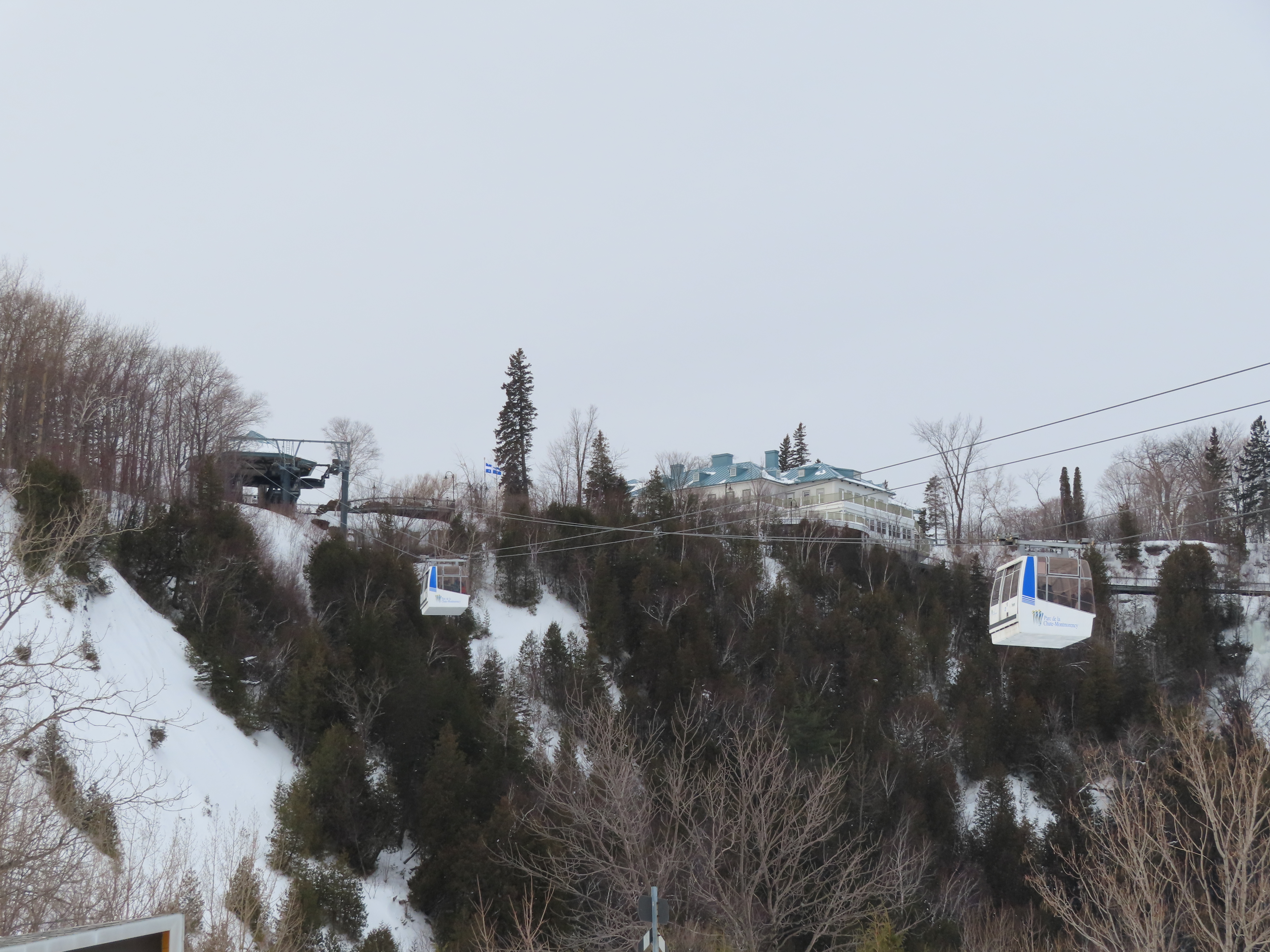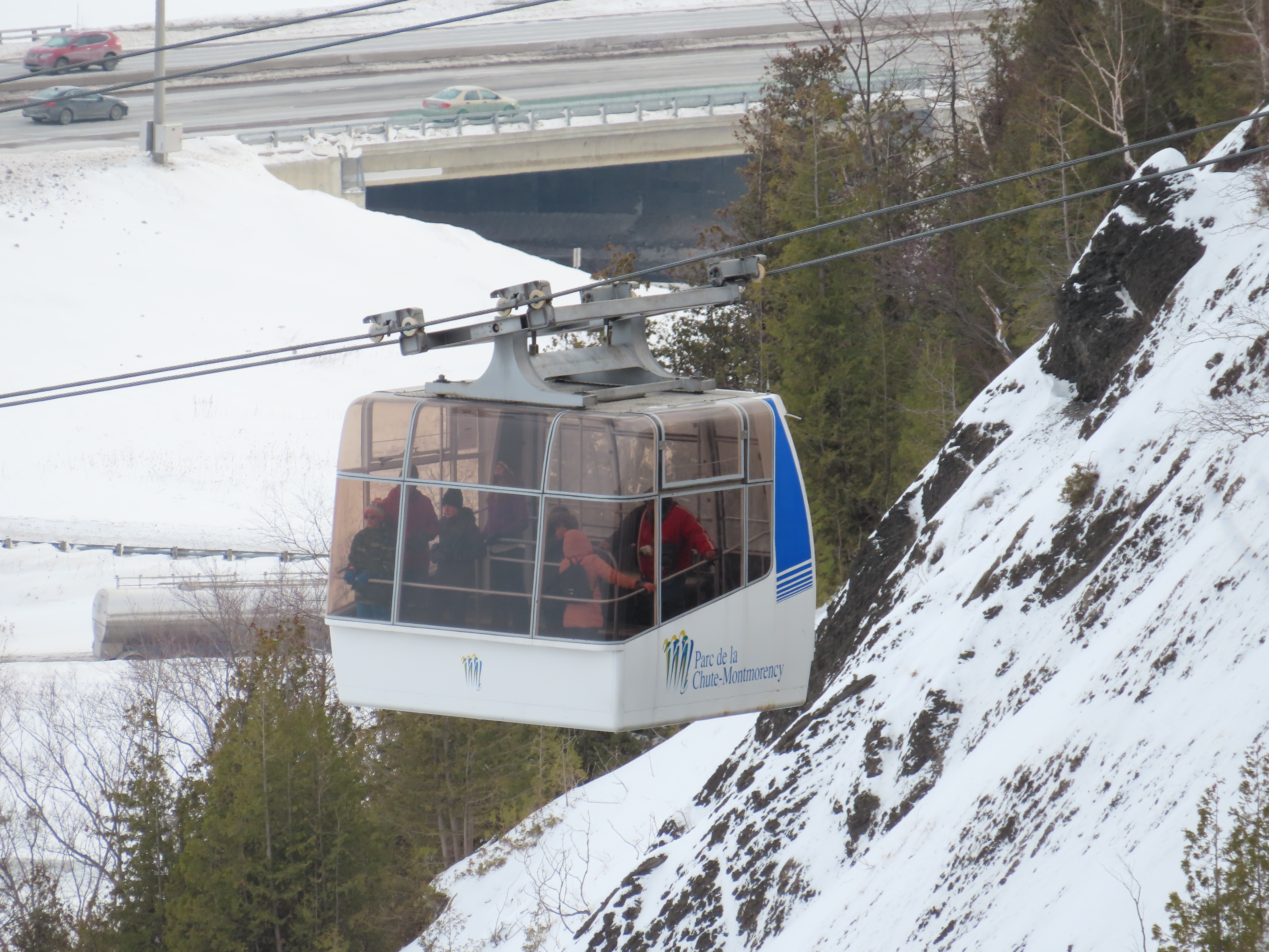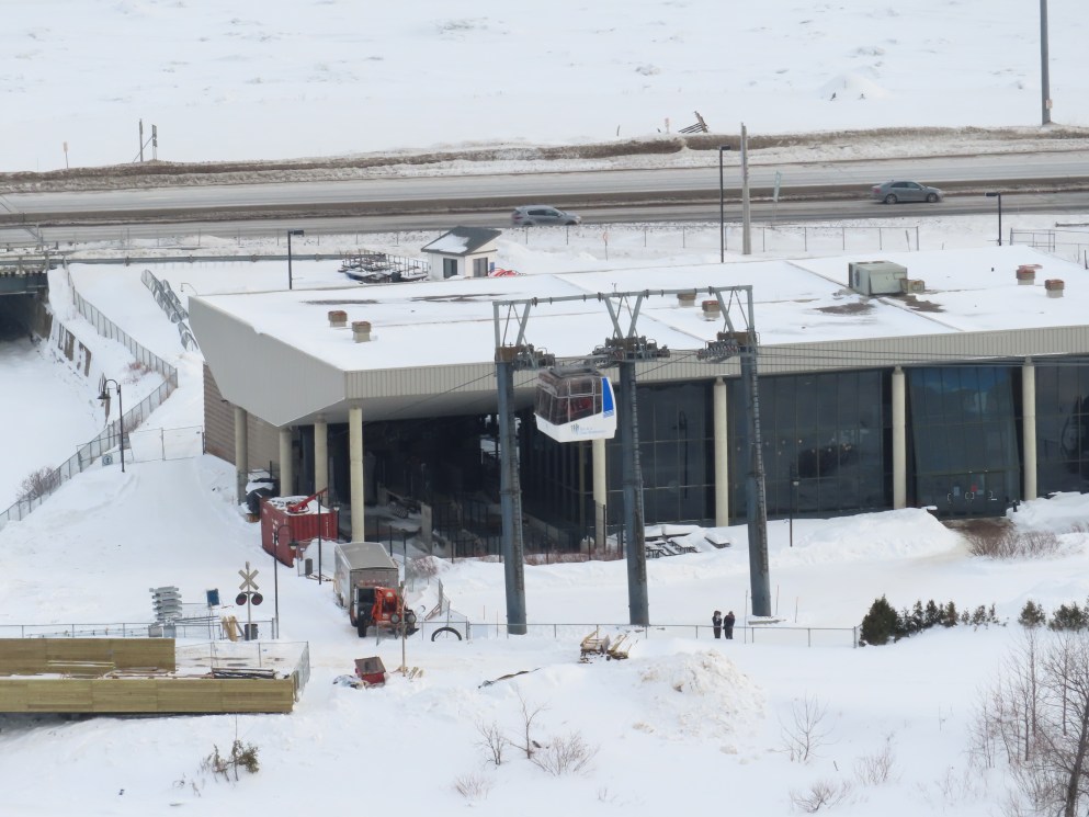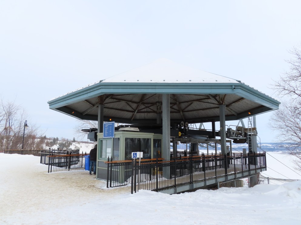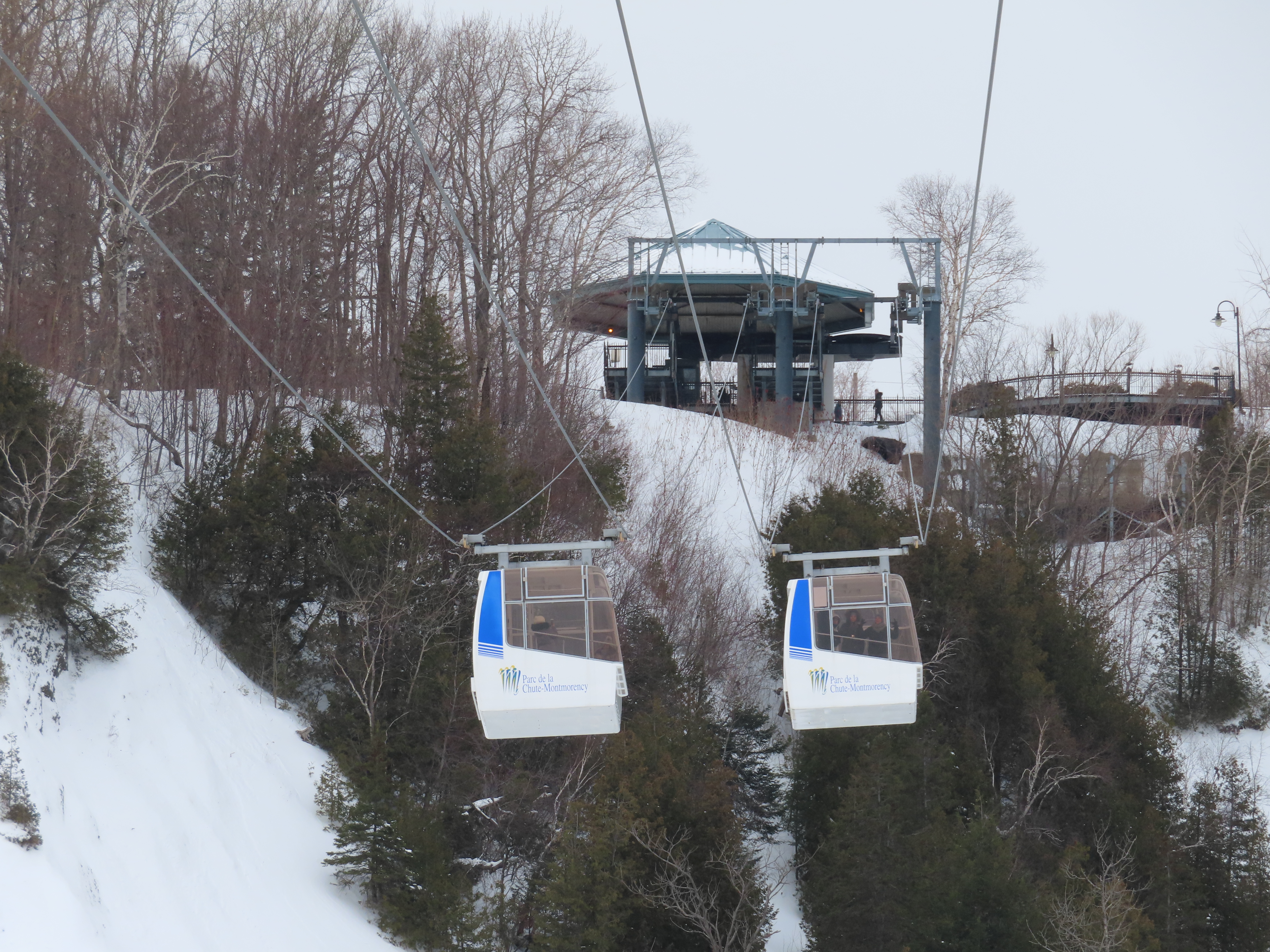 This short jig back lift provides views of a nearby waterfall.There is no easy way to walk between the top and bottom of the falls so the lift provides a link.The carriers are Gangloff funitel models for 30 passengers.There is only one tower near the bottom terminal.Beacuse the falls is on one side of the lift, both cabins face the same direction with stadium style risers for rows of passengers.The cabins are supported from two ropes for wind stability.Cabin plaque.Loading area up top.View down the line for cabin one.There are three bullwheels up top.The top terminal has another set of tower-like structures.Tower one seen from the summit.The outer rope makes two 90 degree turns up top.Upper station building.Loading area for cabin 1.All three top bullwheels.Lower station building.Lift line overview.A cabin facing the falls with loading doors on the opposite sides.Cabin near the summit.Another view of the top terminal.Return bullwheel.Upgraded Doppelmayr controls.Cabin 2 ascending.Closeup of the front of a cabin.Dual loading doors.View up from the bottom terminal.Equipment in the lower station.There are lots of different sheaves deflecting the ropes in different direction.The top station seen from below.Tower 1.Door side of a cabin.