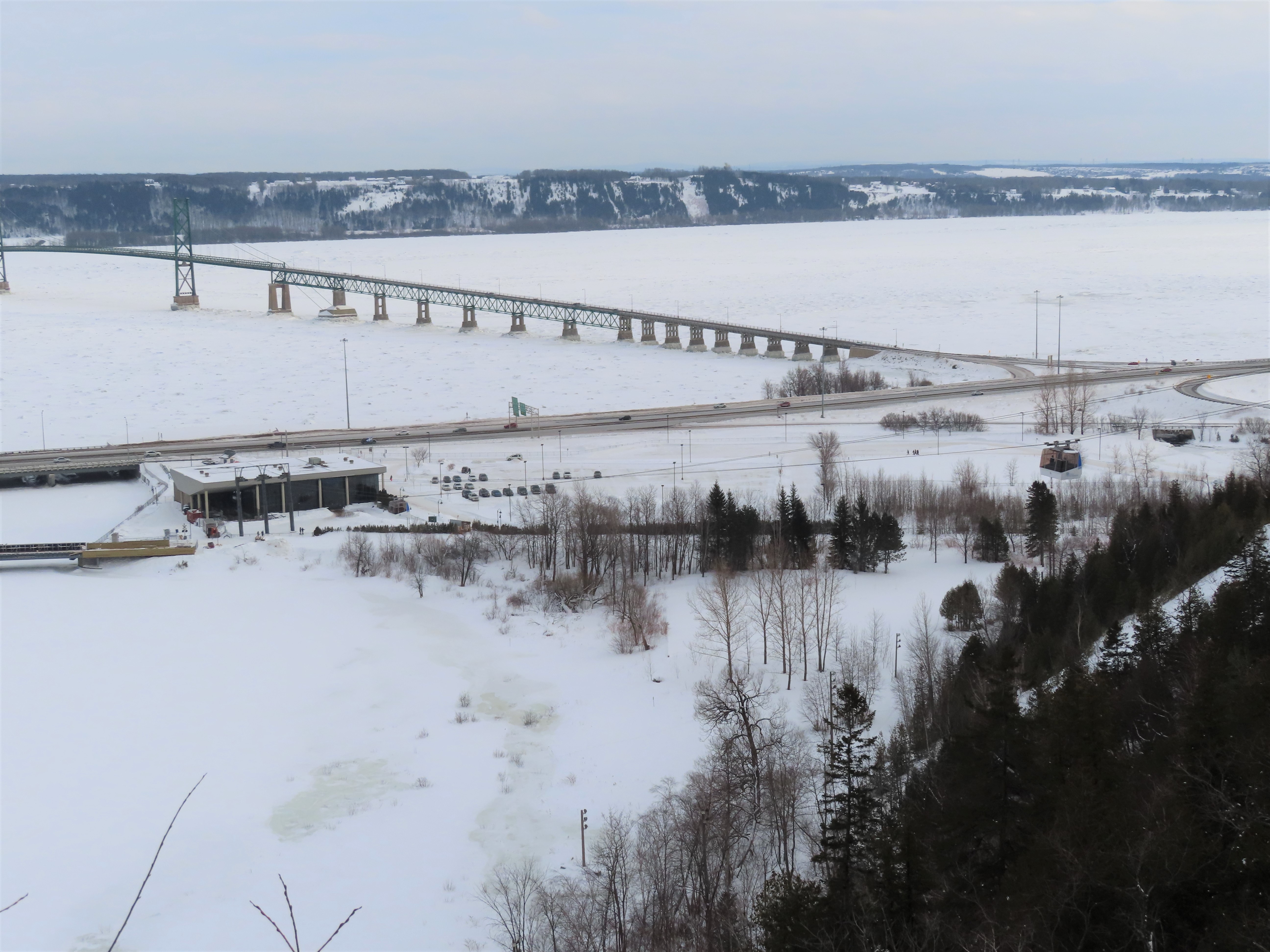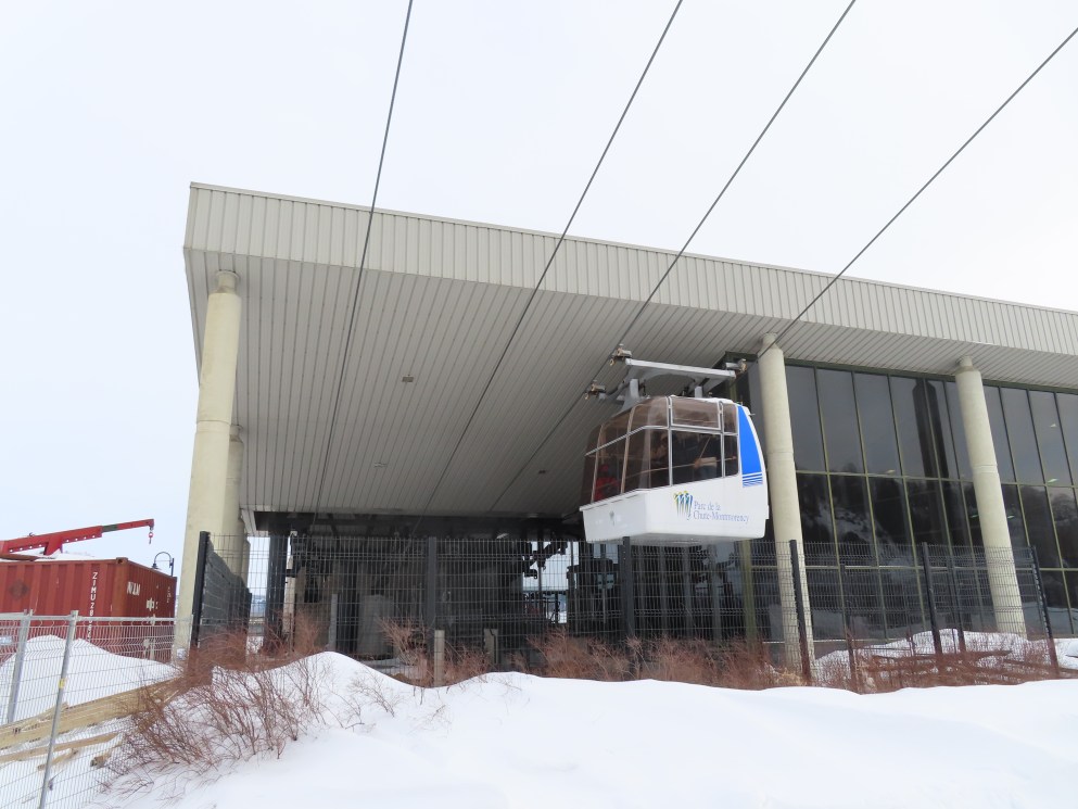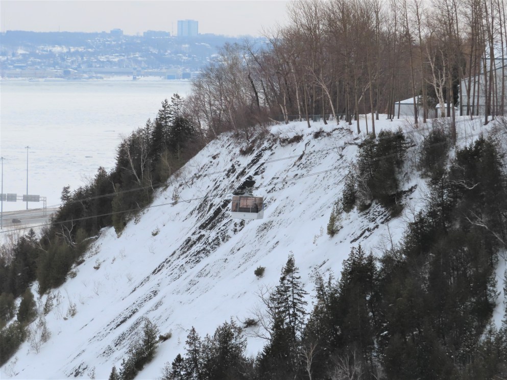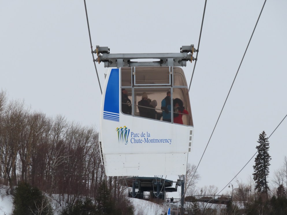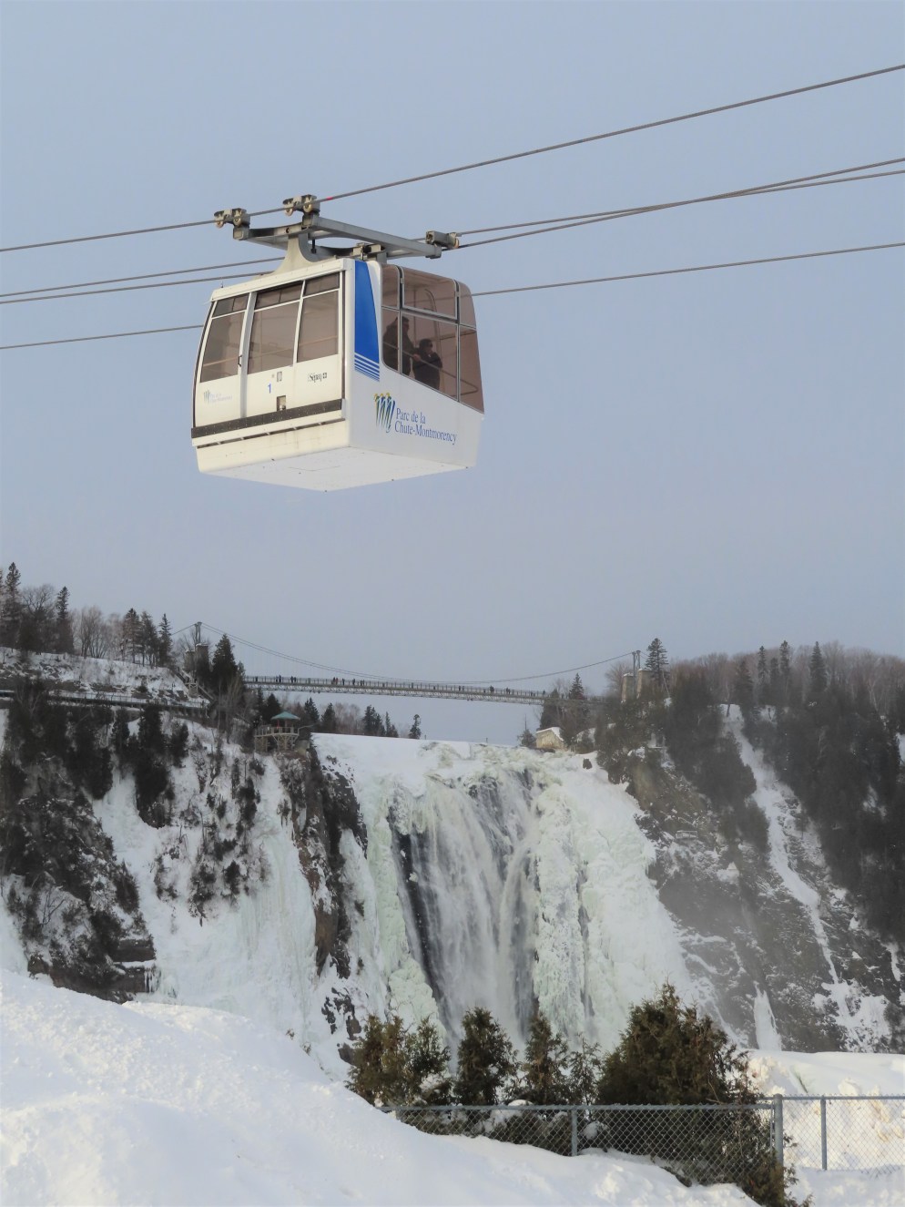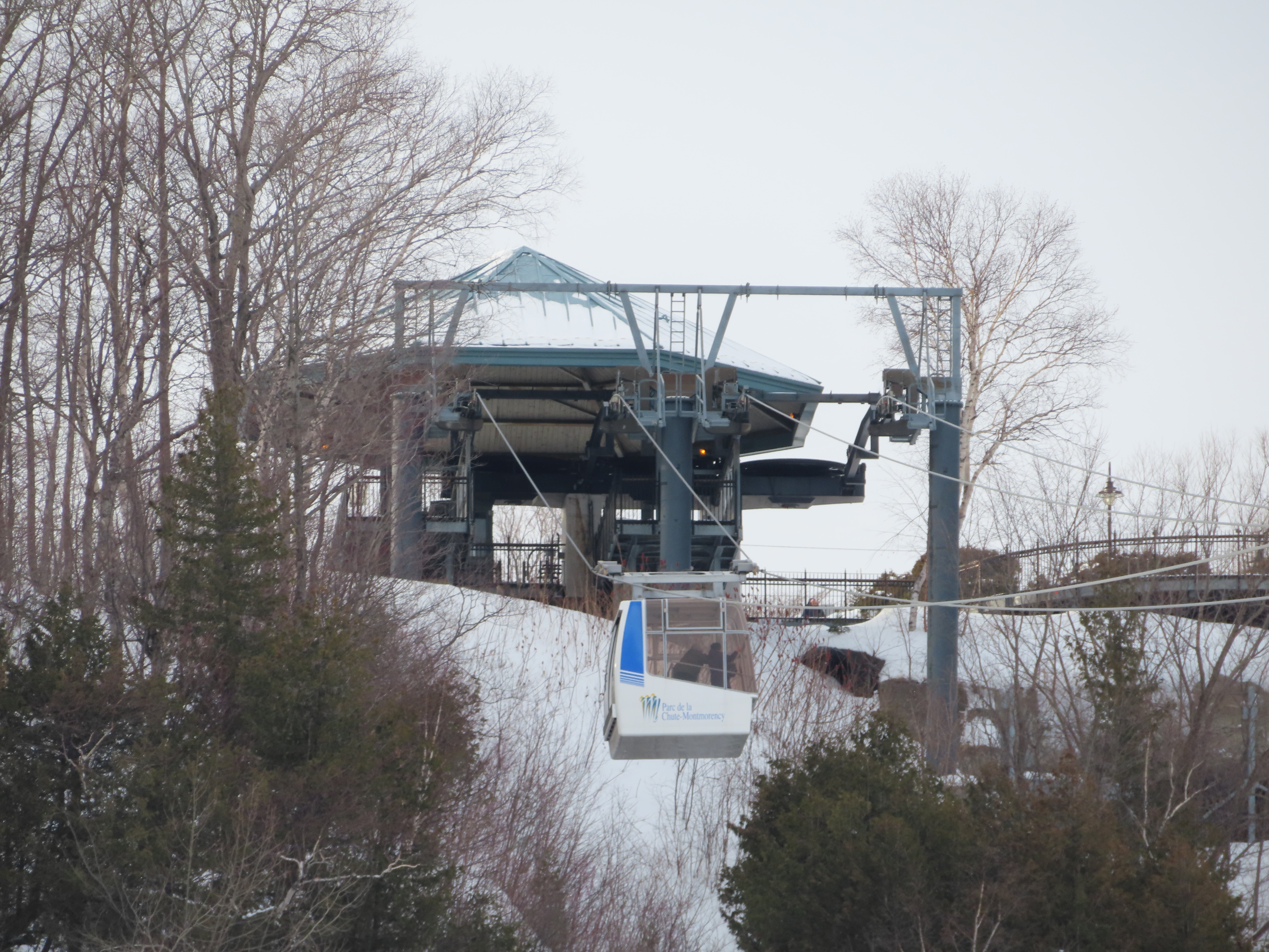 This short jig back lift provides views of a nearby waterfall.There is no easy way to walk between the top and bottom of the falls so the lift provides a link.The carriers are Gangloff funitel models for 30 passengers.There is only one tower near the bottom terminal.Beacuse the falls is on one side of the lift, both cabins face the same direction with stadium style risers for rows of passengers.The cabins are supported from two ropes for wind stability.Cabin plaque.Loading area up top.View down the line for cabin one.There are three bullwheels up top.The top terminal has another set of tower-like structures.Tower one seen from the summit.The outer rope makes two 90 degree turns up top.Upper station building.Loading area for cabin 1.All three top bullwheels.Lower station building.Lift line overview.A cabin facing the falls with loading doors on the opposite sides.Cabin near the summit.Another view of the top terminal.Return bullwheel.Upgraded Doppelmayr controls.Cabin 2 ascending.Closeup of the front of a cabin.Dual loading doors.View up from the bottom terminal.Equipment in the lower station.There are lots of different sheaves deflecting the ropes in different direction.The top station seen from below.Tower 1.Door side of a cabin.