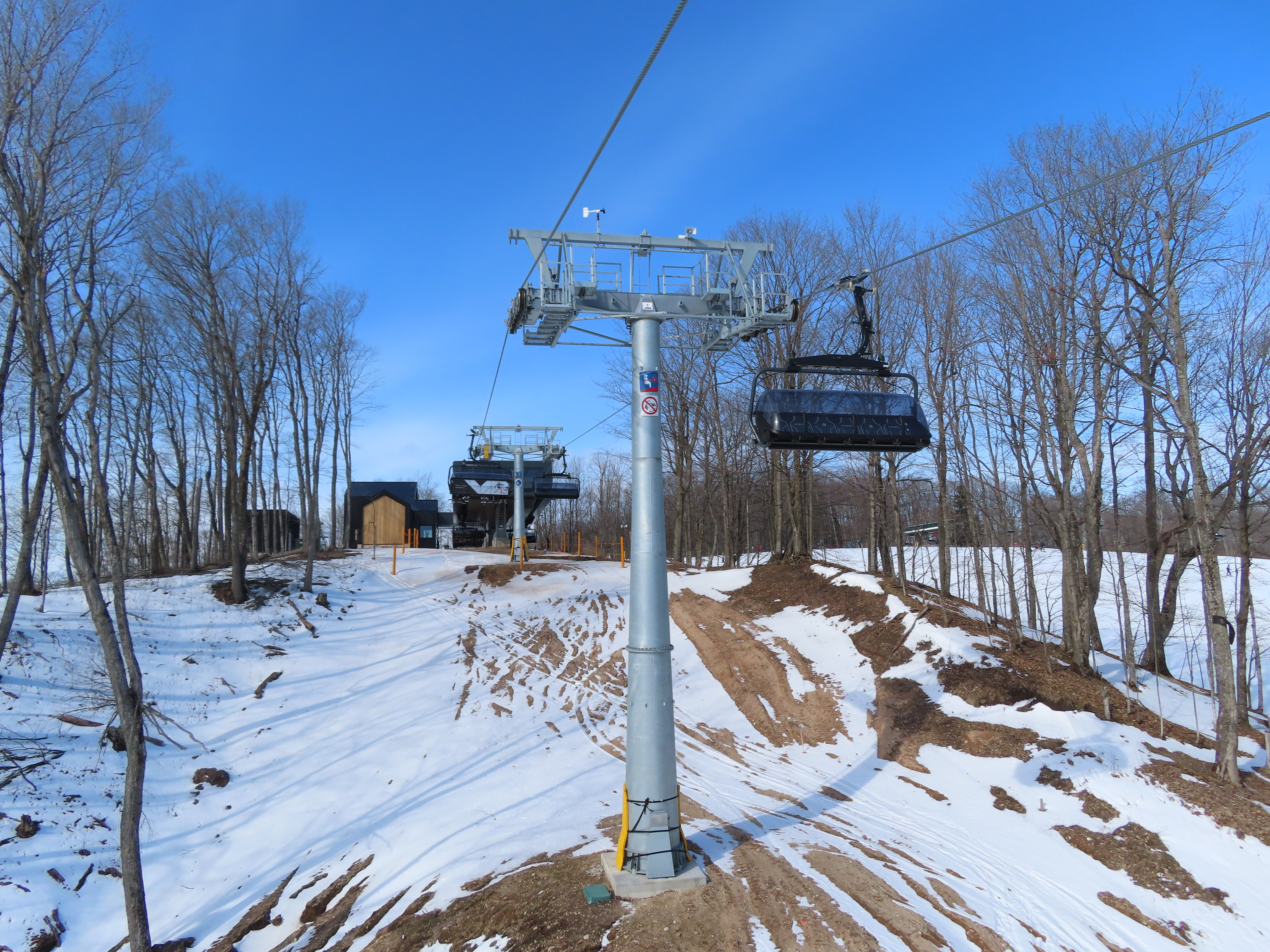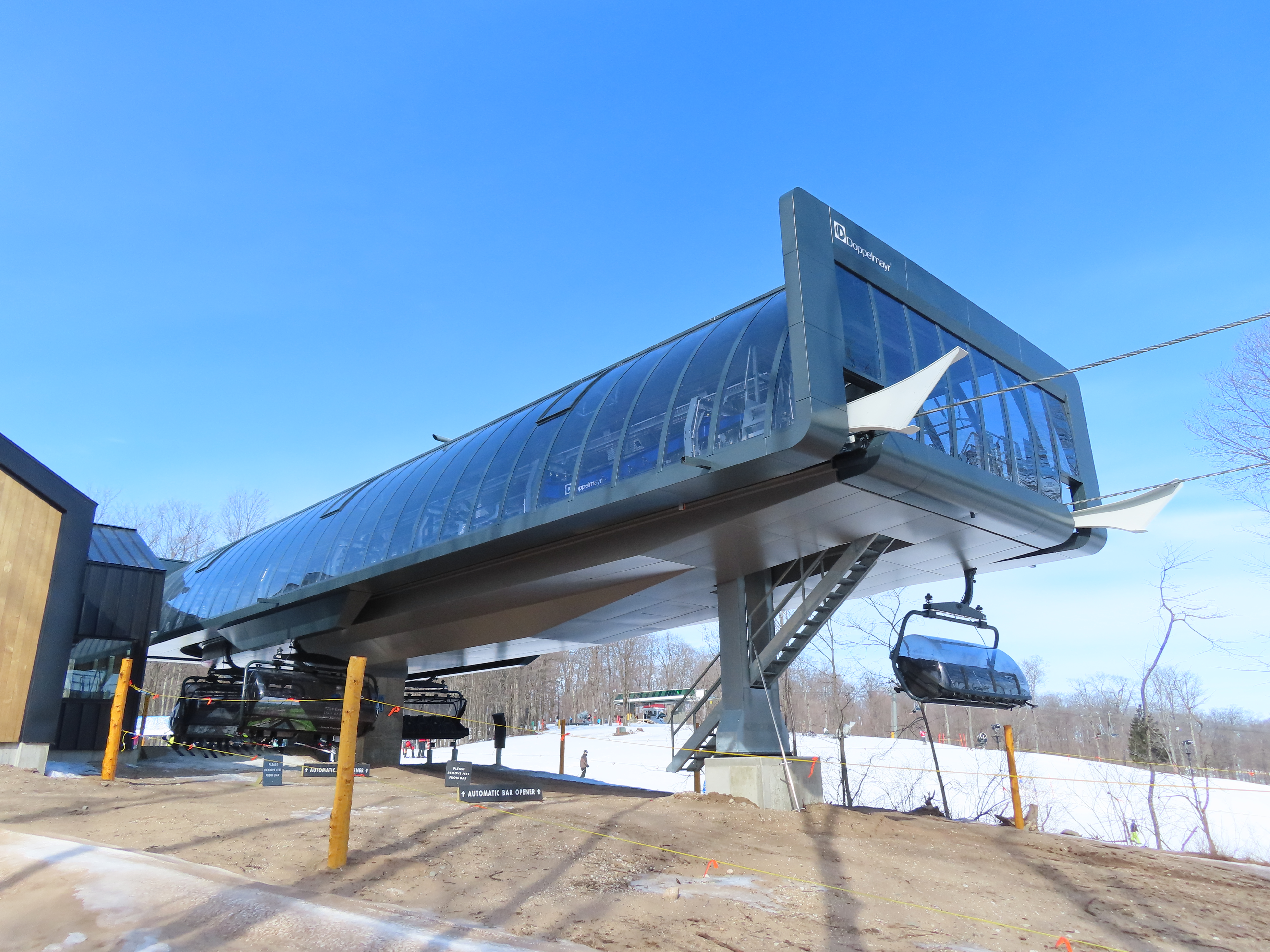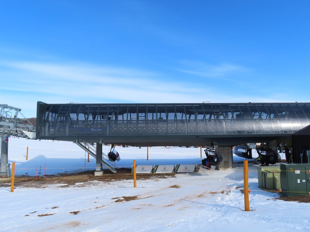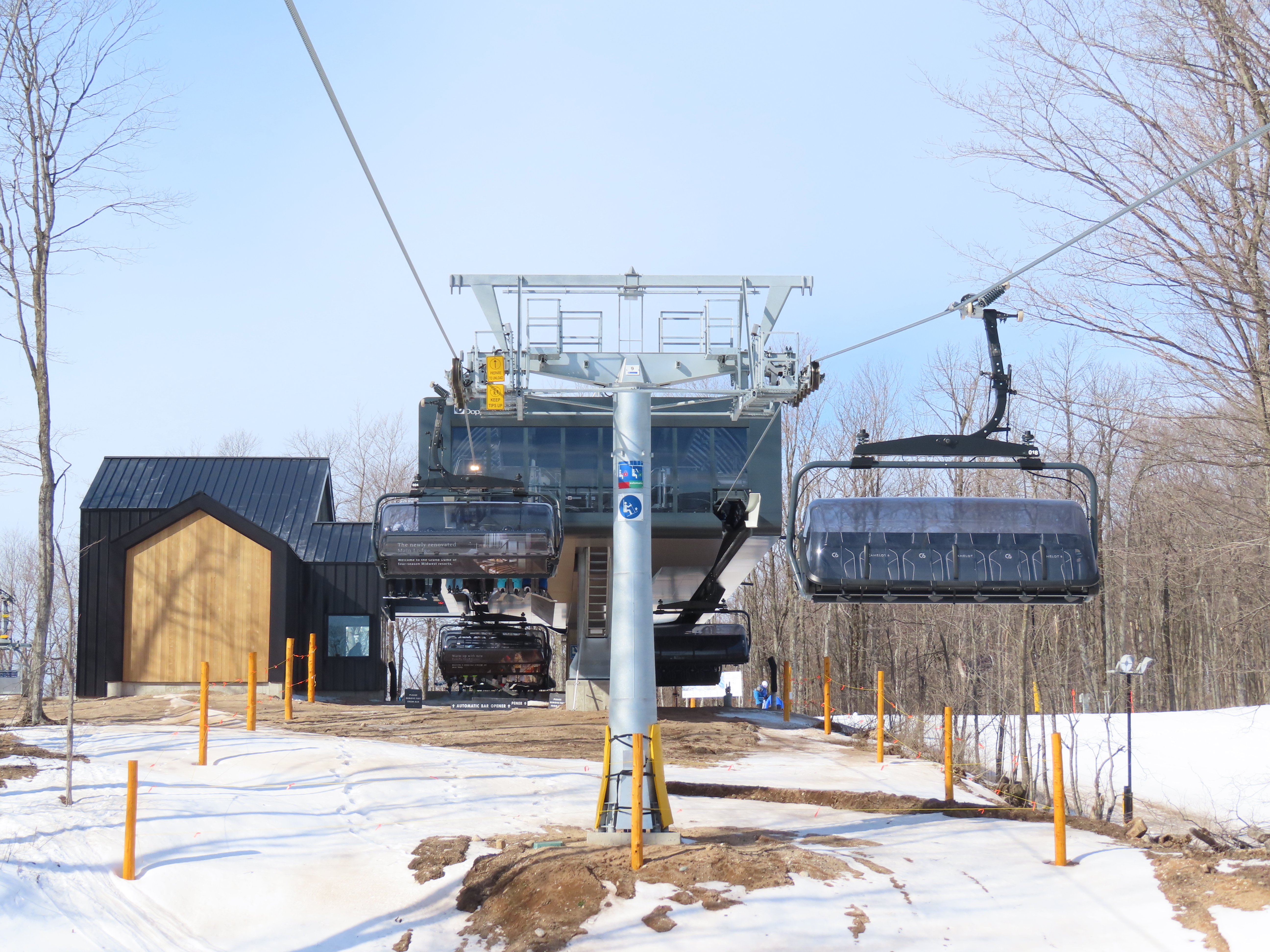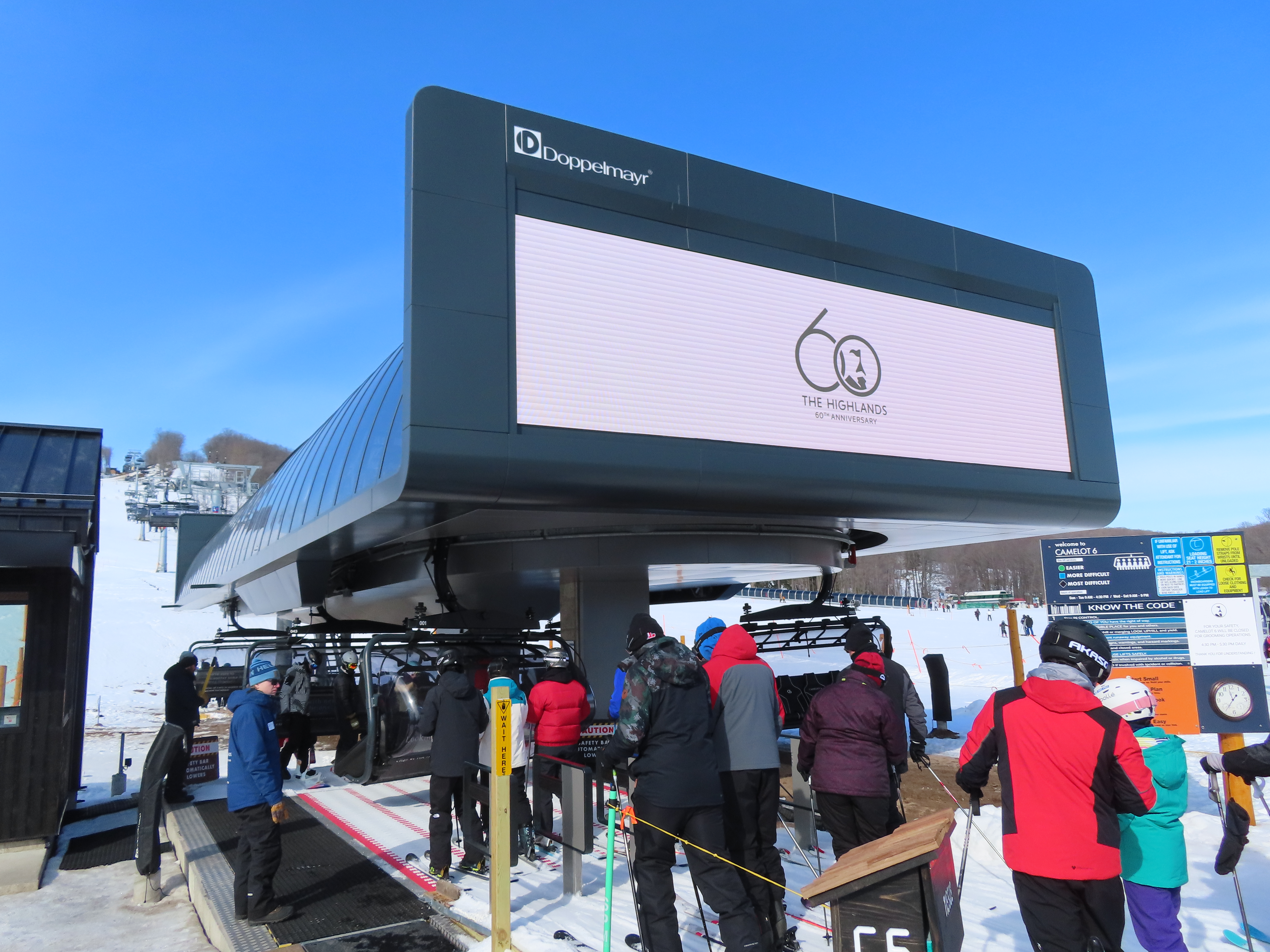 This Doppelmayr six place replaced three Riblet chairlifts on the south side of The Highlands in 2023.Extremely long bottom terminal for chair parking and bubble opening/closing.Turnaround at the bottom terminal.Six place chair with heated seats.Doppelmayr name plate.The back of a chair at the unload.Upper station with attached maintenance building.Drive terminal up top.The lower part of the lift line is a golf course in the summer season.Tower 3.Lower station and tower 1.Chair acceleration zone.Loading conveyor with gates.In-terminal LED screen.View riding up the line.Tower 4.T5.Nearing the summit.Arriving at the summit, which is near the older Heather Express.Unloading area with auto raising restraint bar.View from the top.Side view of the upper station.View down at tower 7.Work chair.Side view of a support tower.Large combination assemblies.Middle section of the lift line.T2.Lift overview.View up at tower 2.Closed bubble chair.View back down the line.Tower 9.Upper station turnaround.Another view of the upper lift line.Looking down the line.Upper station overview.