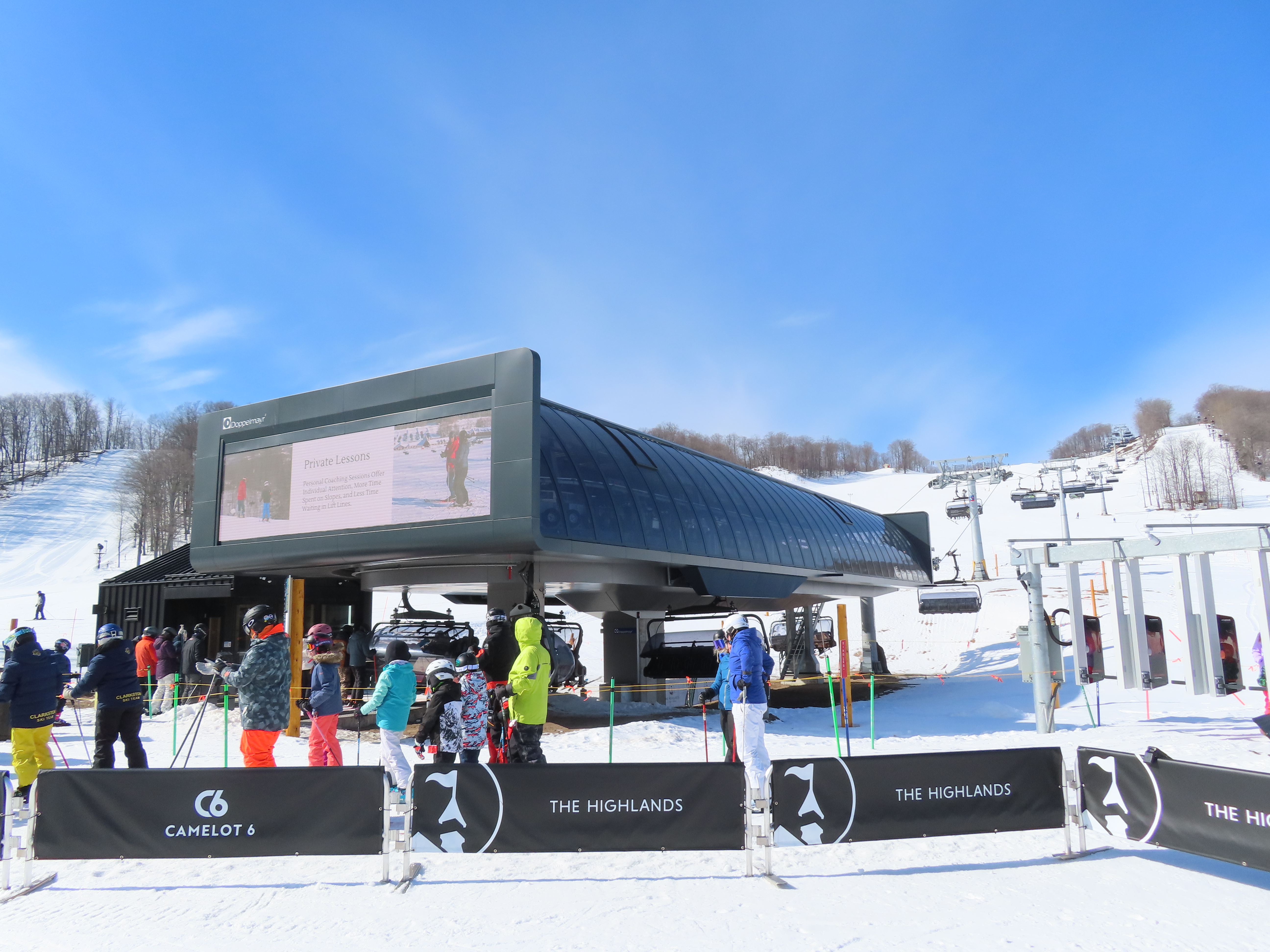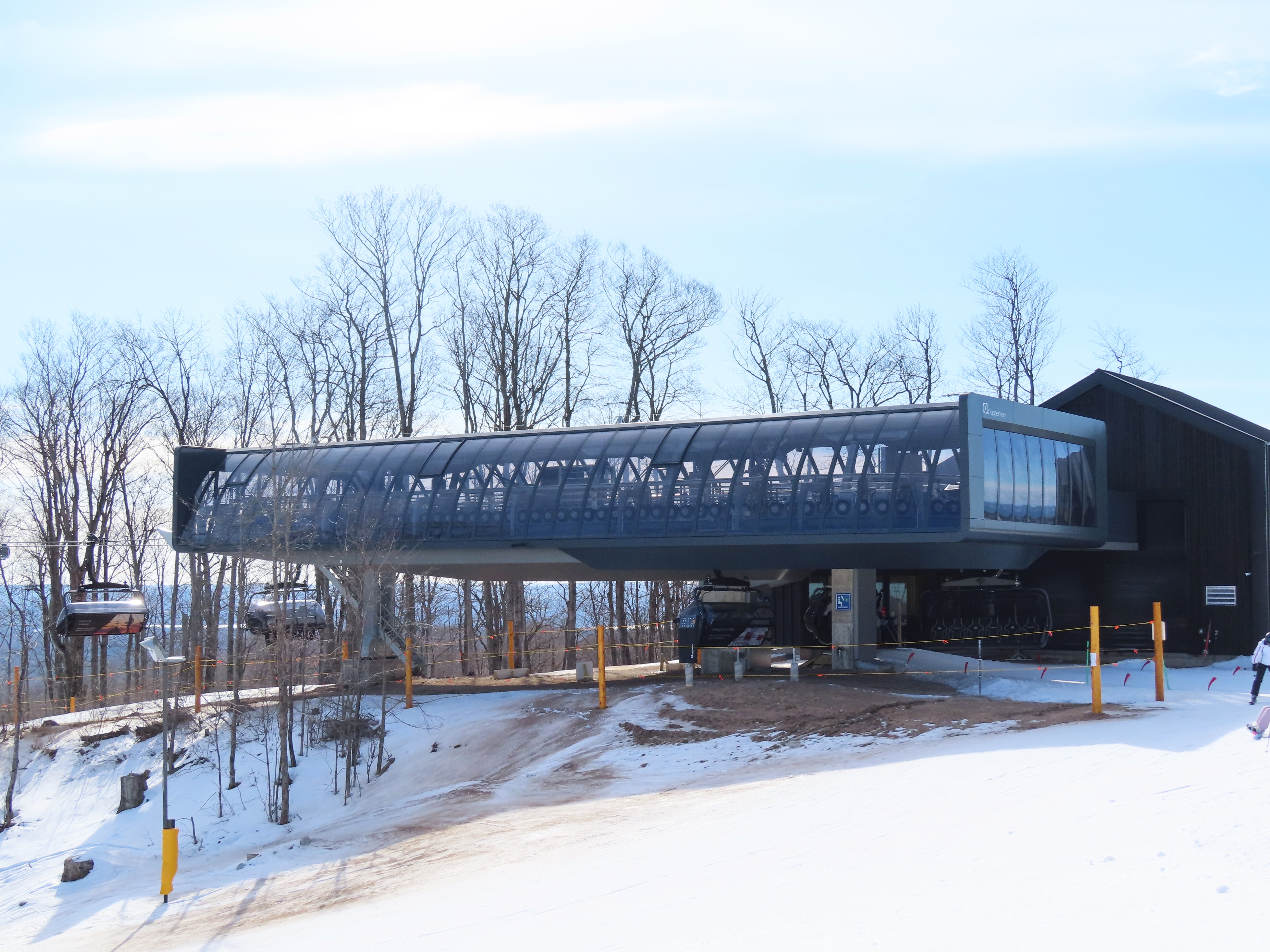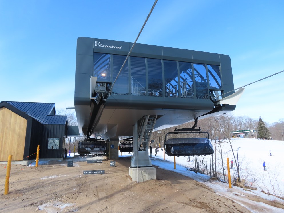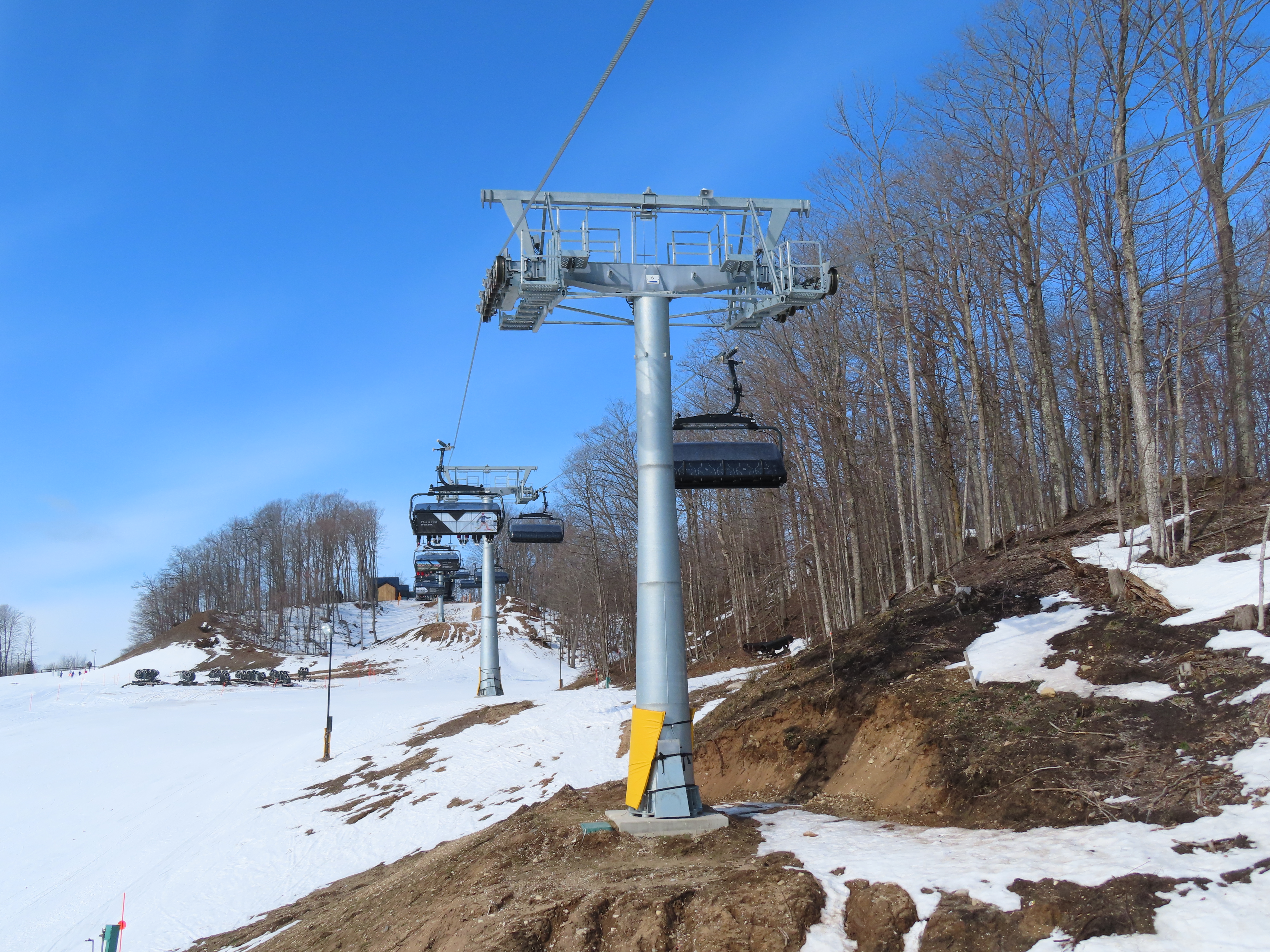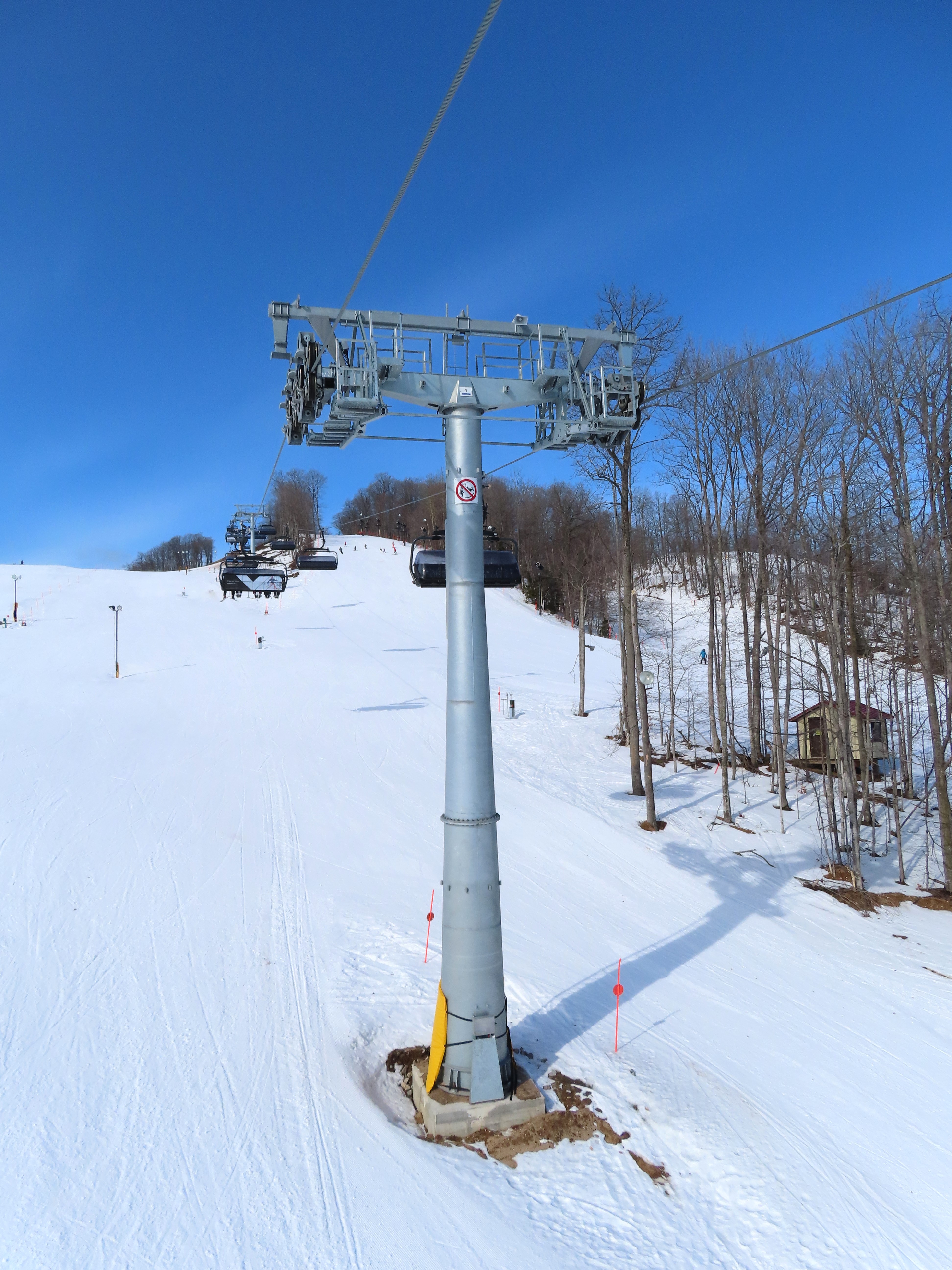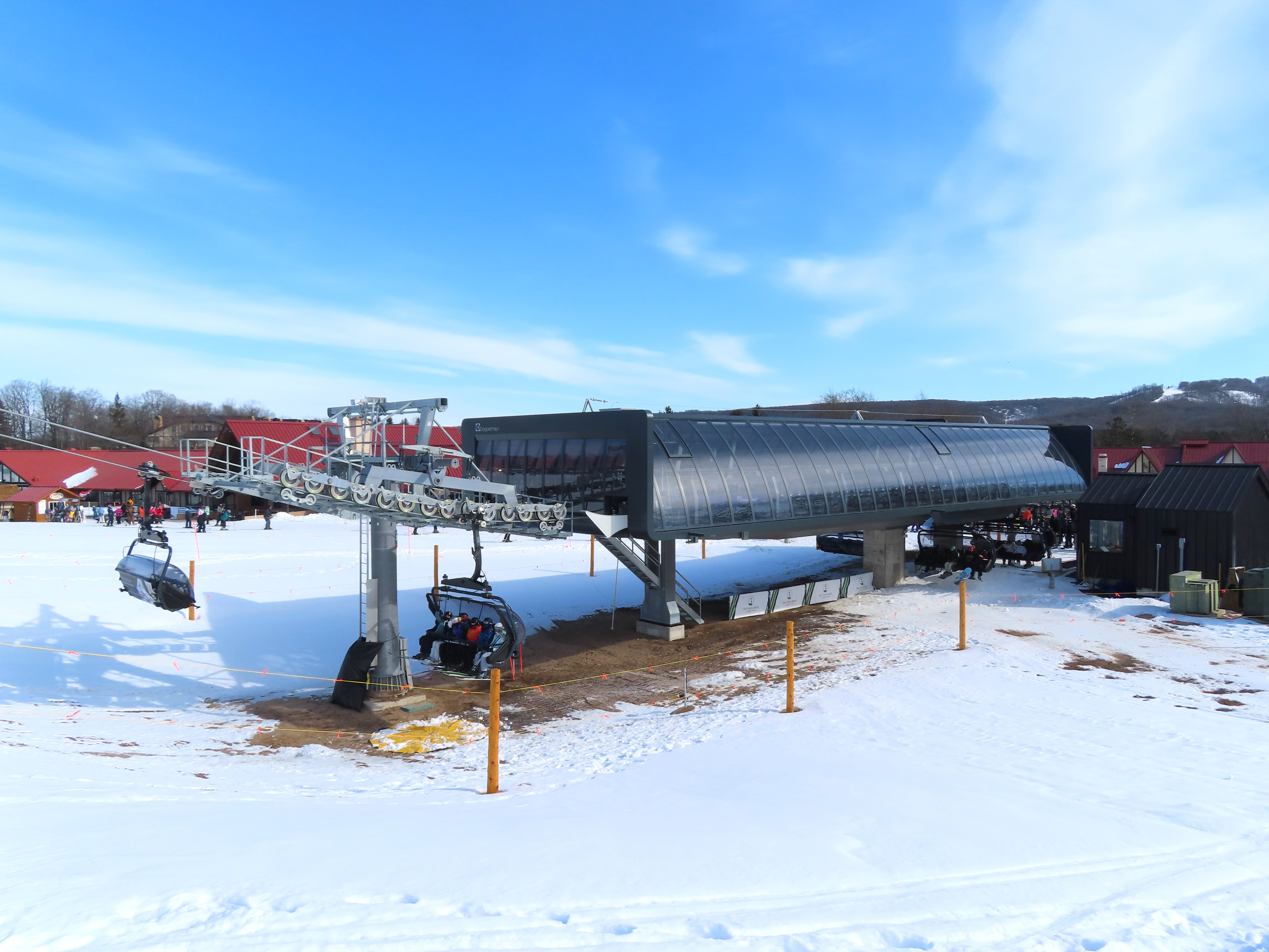 This Doppelmayr six place replaced three Riblet chairlifts on the south side of The Highlands in 2023.Extremely long bottom terminal for chair parking and bubble opening/closing.Turnaround at the bottom terminal.Six place chair with heated seats.Doppelmayr name plate.The back of a chair at the unload.Upper station with attached maintenance building.Drive terminal up top.The lower part of the lift line is a golf course in the summer season.Tower 3.Lower station and tower 1.Chair acceleration zone.Loading conveyor with gates.In-terminal LED screen.View riding up the line.Tower 4.T5.Nearing the summit.Arriving at the summit, which is near the older Heather Express.Unloading area with auto raising restraint bar.View from the top.Side view of the upper station.View down at tower 7.Work chair.Side view of a support tower.Large combination assemblies.Middle section of the lift line.T2.Lift overview.View up at tower 2.Closed bubble chair.View back down the line.Tower 9.Upper station turnaround.Another view of the upper lift line.Looking down the line.Upper station overview.