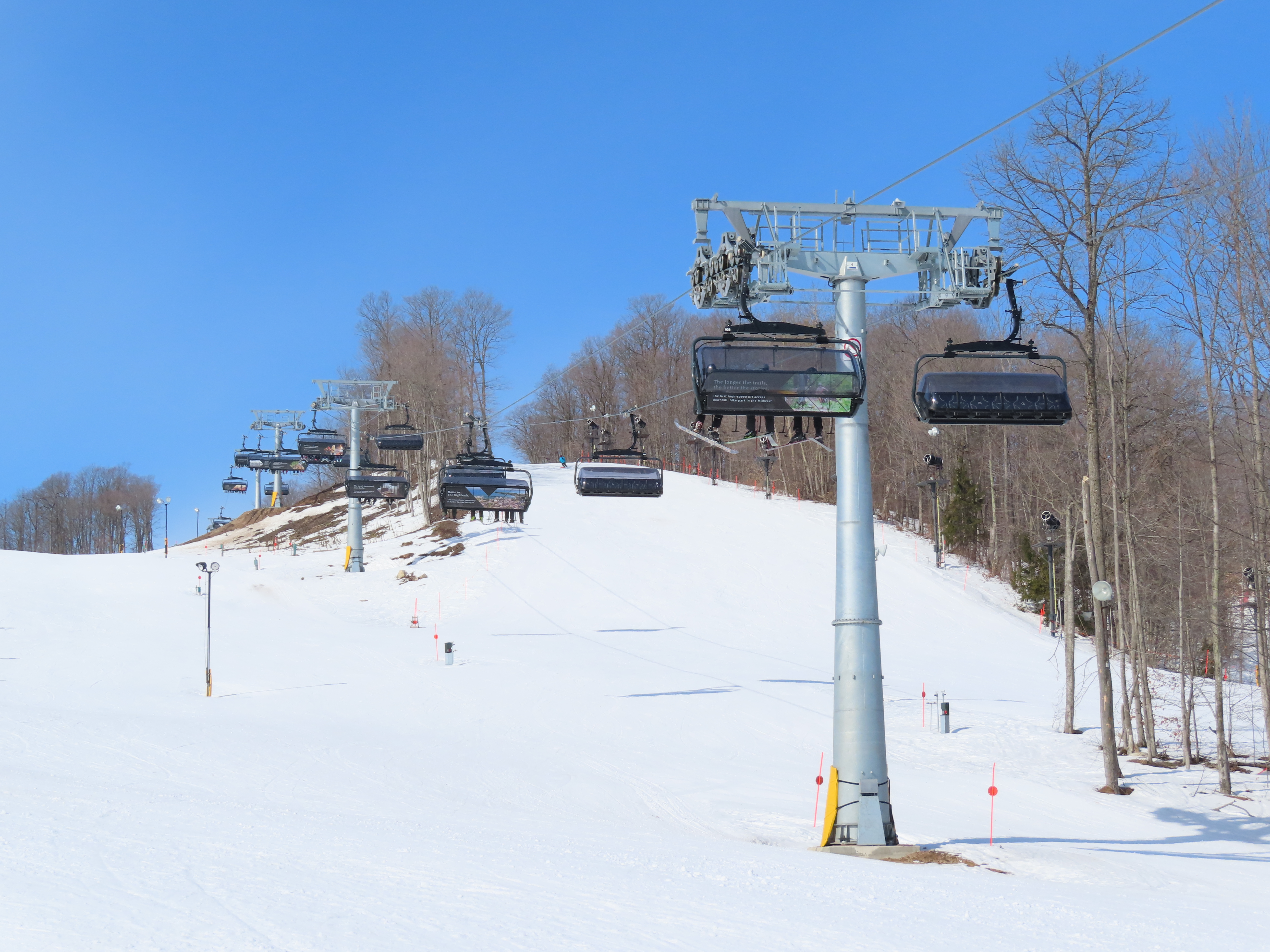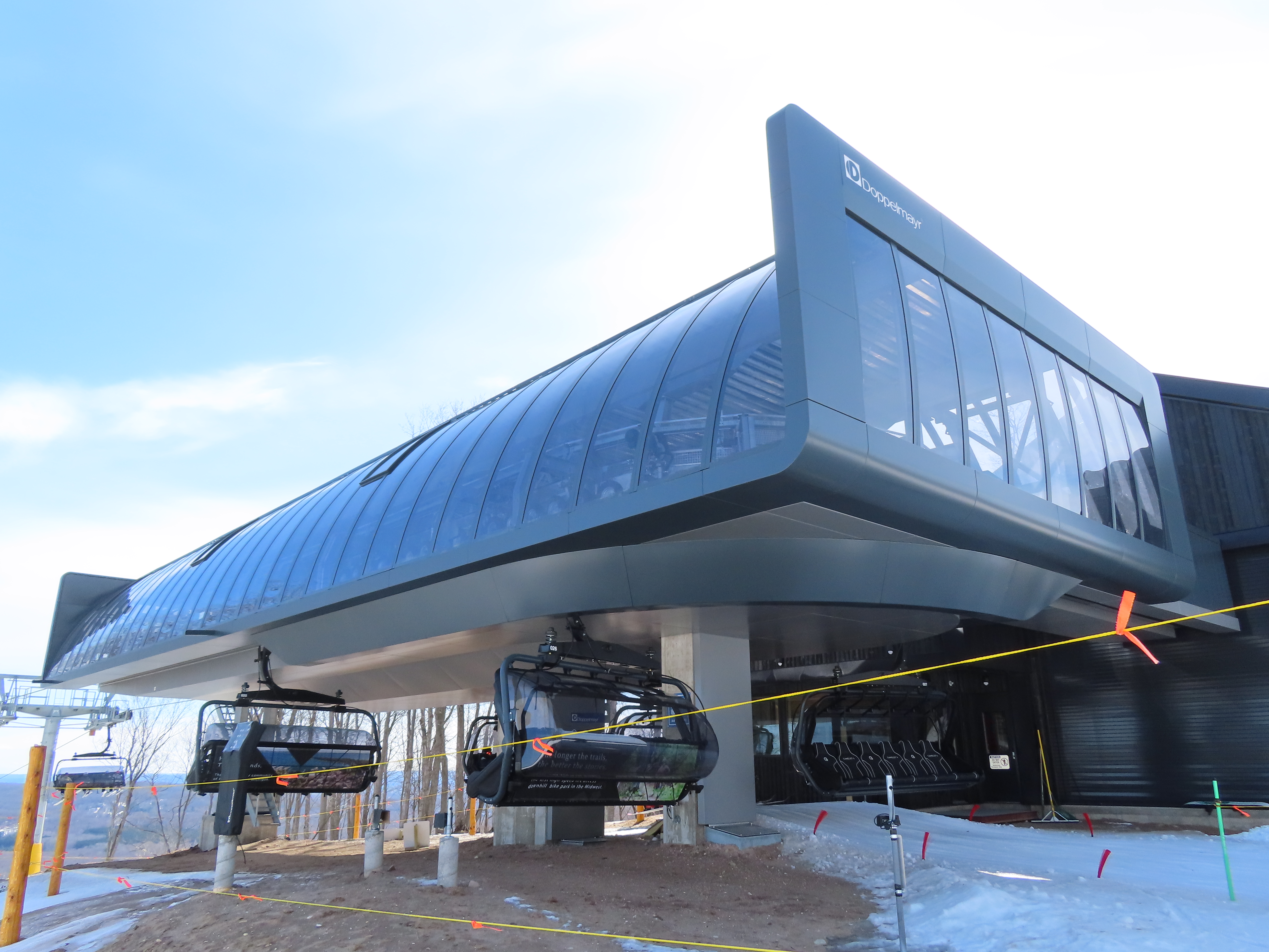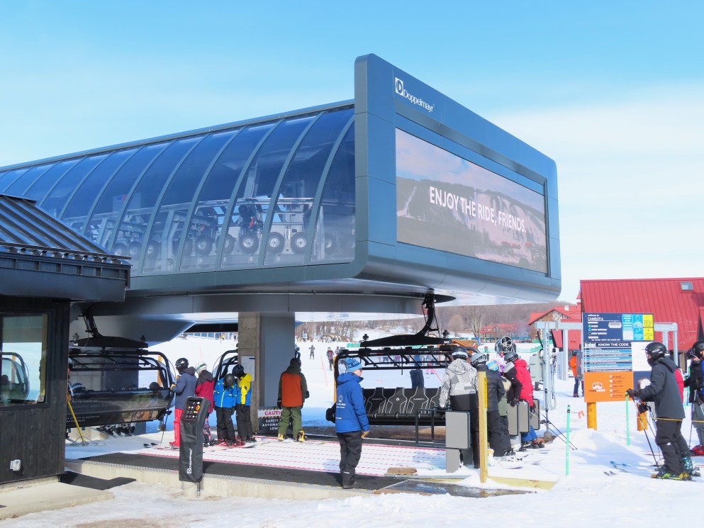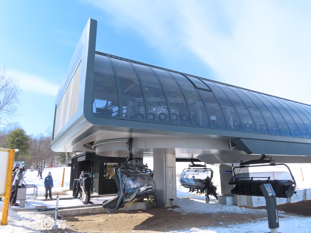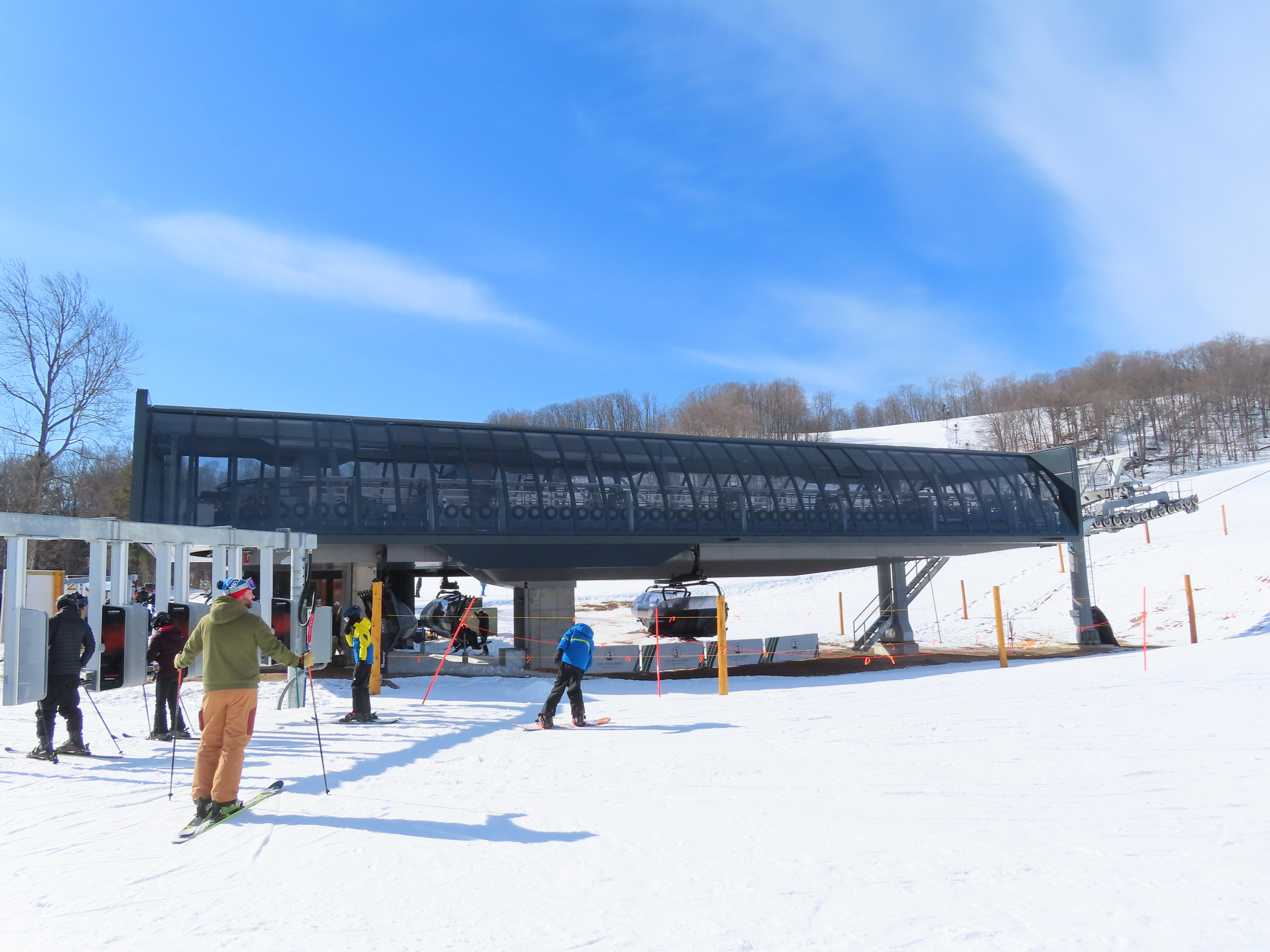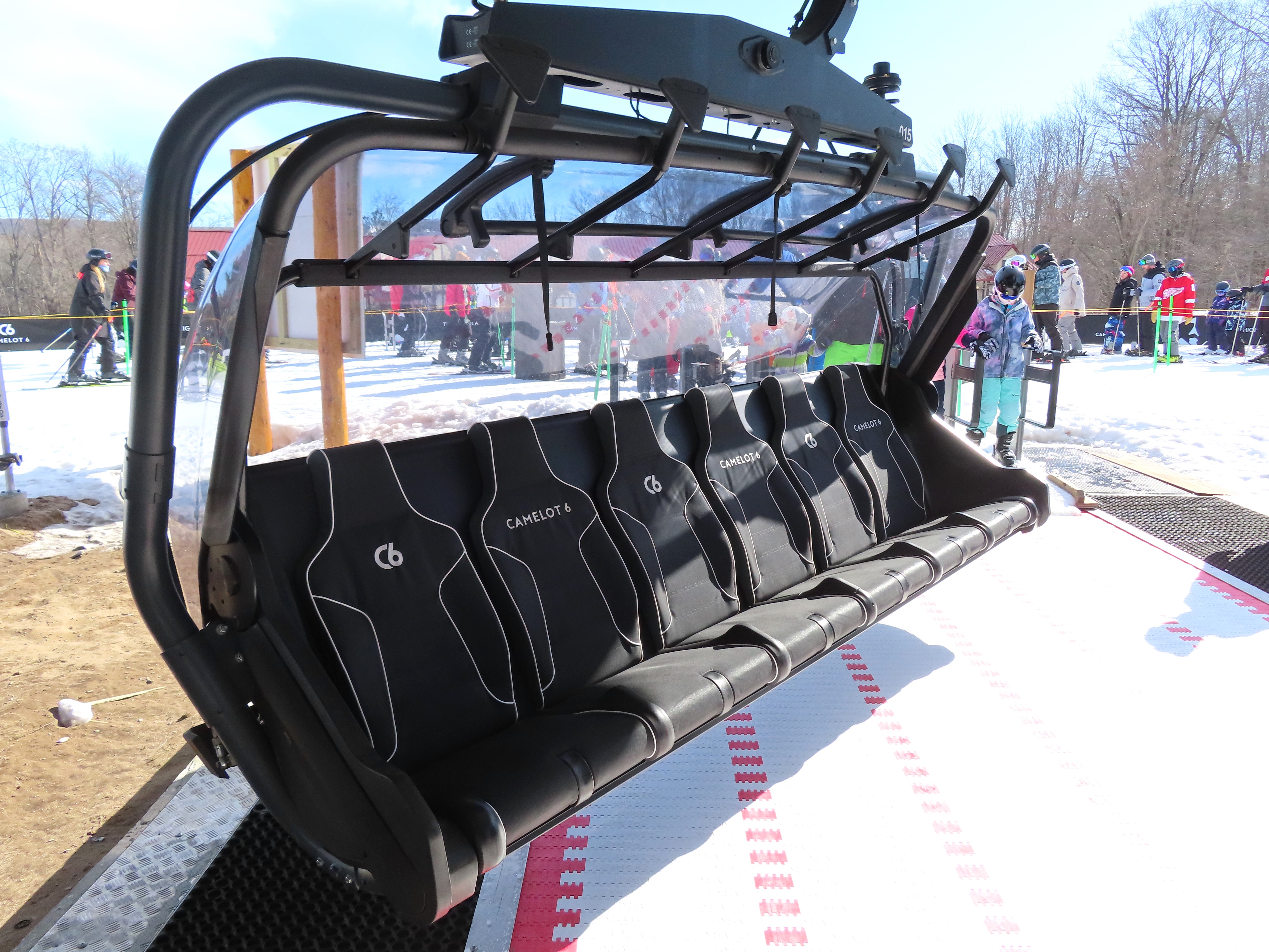 This Doppelmayr six place replaced three Riblet chairlifts on the south side of The Highlands in 2023.Extremely long bottom terminal for chair parking and bubble opening/closing.Turnaround at the bottom terminal.Six place chair with heated seats.Doppelmayr name plate.The back of a chair at the unload.Upper station with attached maintenance building.Drive terminal up top.The lower part of the lift line is a golf course in the summer season.Tower 3.Lower station and tower 1.Chair acceleration zone.Loading conveyor with gates.In-terminal LED screen.View riding up the line.Tower 4.T5.Nearing the summit.Arriving at the summit, which is near the older Heather Express.Unloading area with auto raising restraint bar.View from the top.Side view of the upper station.View down at tower 7.Work chair.Side view of a support tower.Large combination assemblies.Middle section of the lift line.T2.Lift overview.View up at tower 2.Closed bubble chair.View back down the line.Tower 9.Upper station turnaround.Another view of the upper lift line.Looking down the line.Upper station overview.