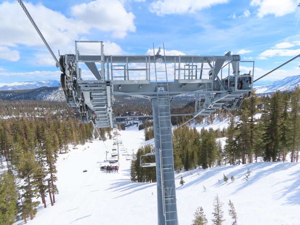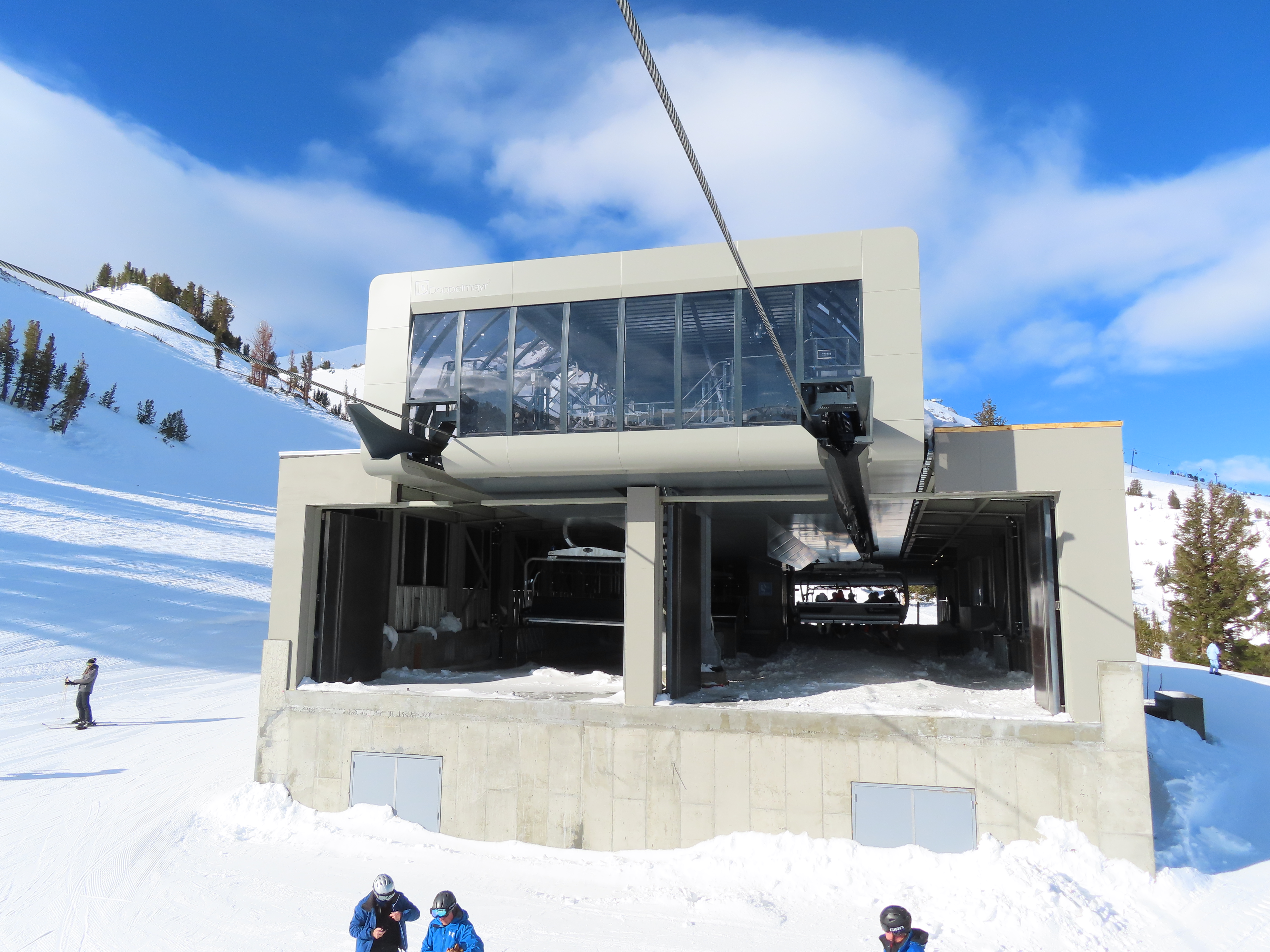 This lift was originally scheduled to be built in 2020 but was delayed until 2023 due to the Covid-19 pandemic.This is the first D-Line lift for Mammoth and features in-station parking buildings.View from the summit.Top terminal in its first season with missing glass panels.The final tower and top terminal.Breakover towers 14 and 15.Tower 13.Middle section of the lift line.View down the steepest part of the line.Upper lift line.View down at tower 8.Looking up the line at T8.Lower lift line.Tower 6.Looking up the line near the bottom terminal.Tower 4.View up the not very steep alignment.The first few towers above Canyon Lodge.Bottom station near the Schoolyard Express.D-Line station with added building.Lower station overview.D-Line towers and chairs.Indoor contour loading with conveyor.Riding up the line.View back down.Tower 15.Arriving at the drive terminal which move slightly from the previous lift.Chairs coming and going from the top station.Upper lift line.The top terminal seen from above.Lift line.Lift overview.Acceleration and parking area in the bottom station.Bottom terminal location within the Canyon base.Six place chair with locking restraint bar.Middle section of the line.View back down at tower 7.A tower head with combination assemblies.View down the line.Nearing the summit.Turnaround in the upper station.