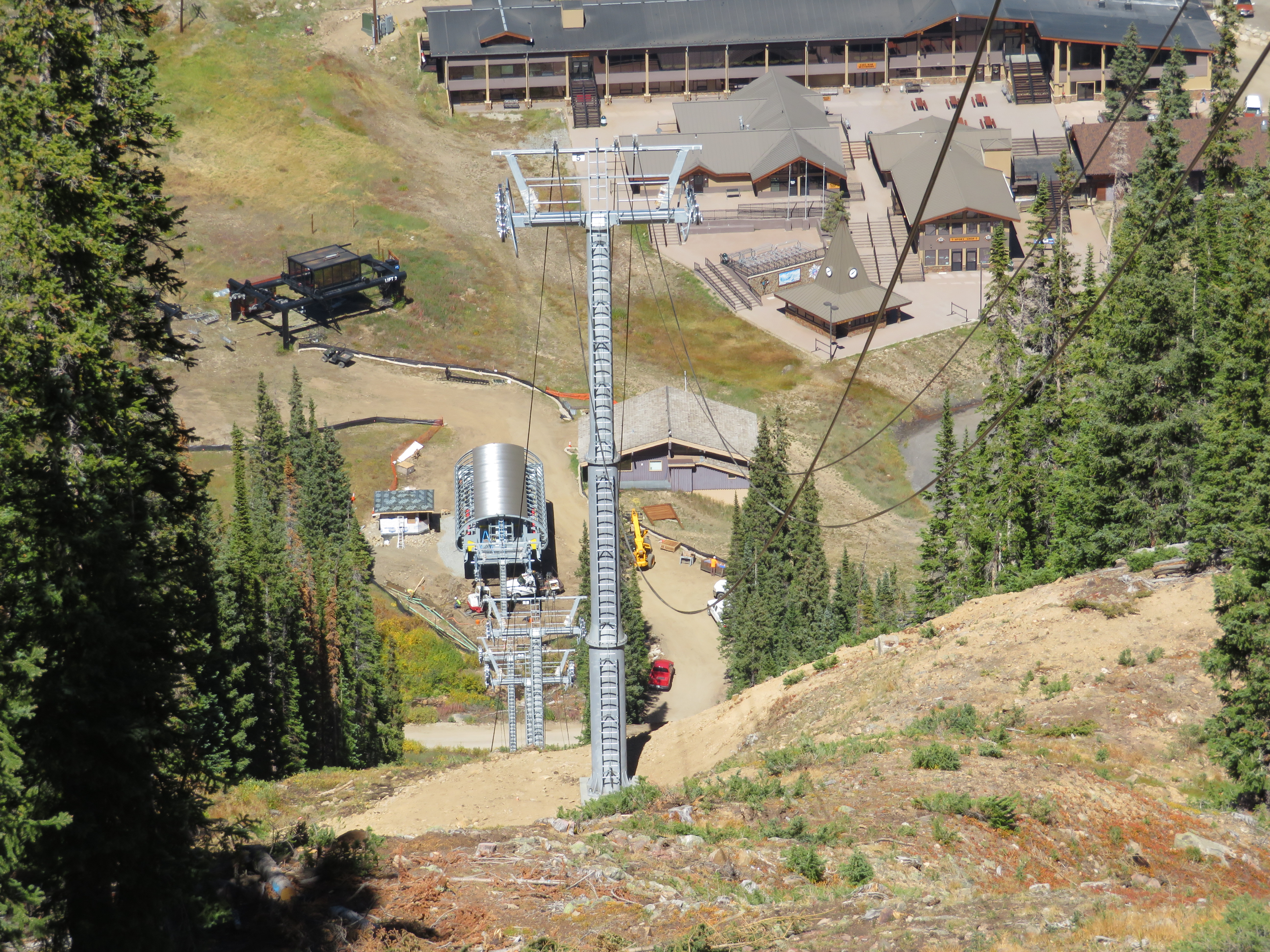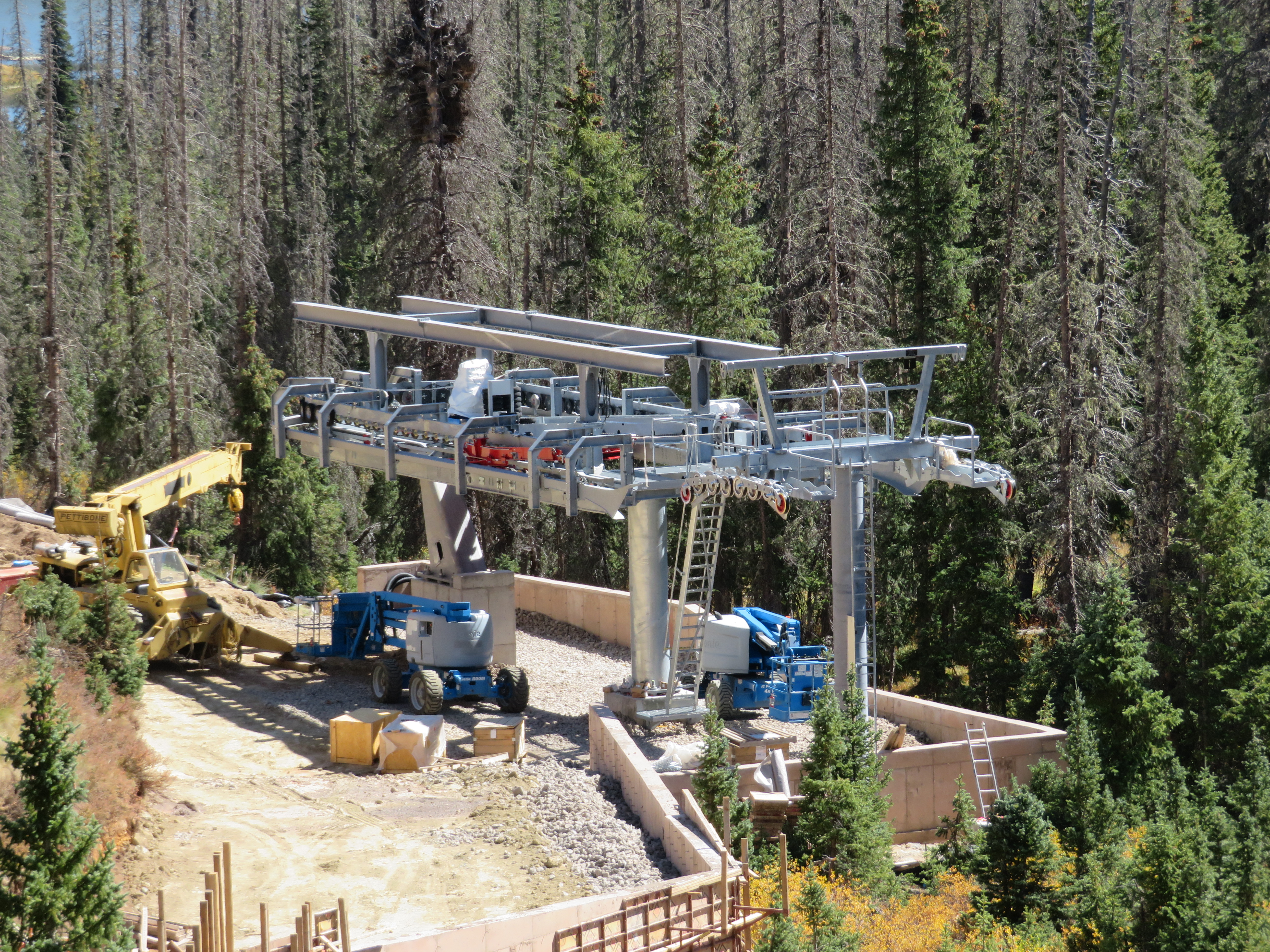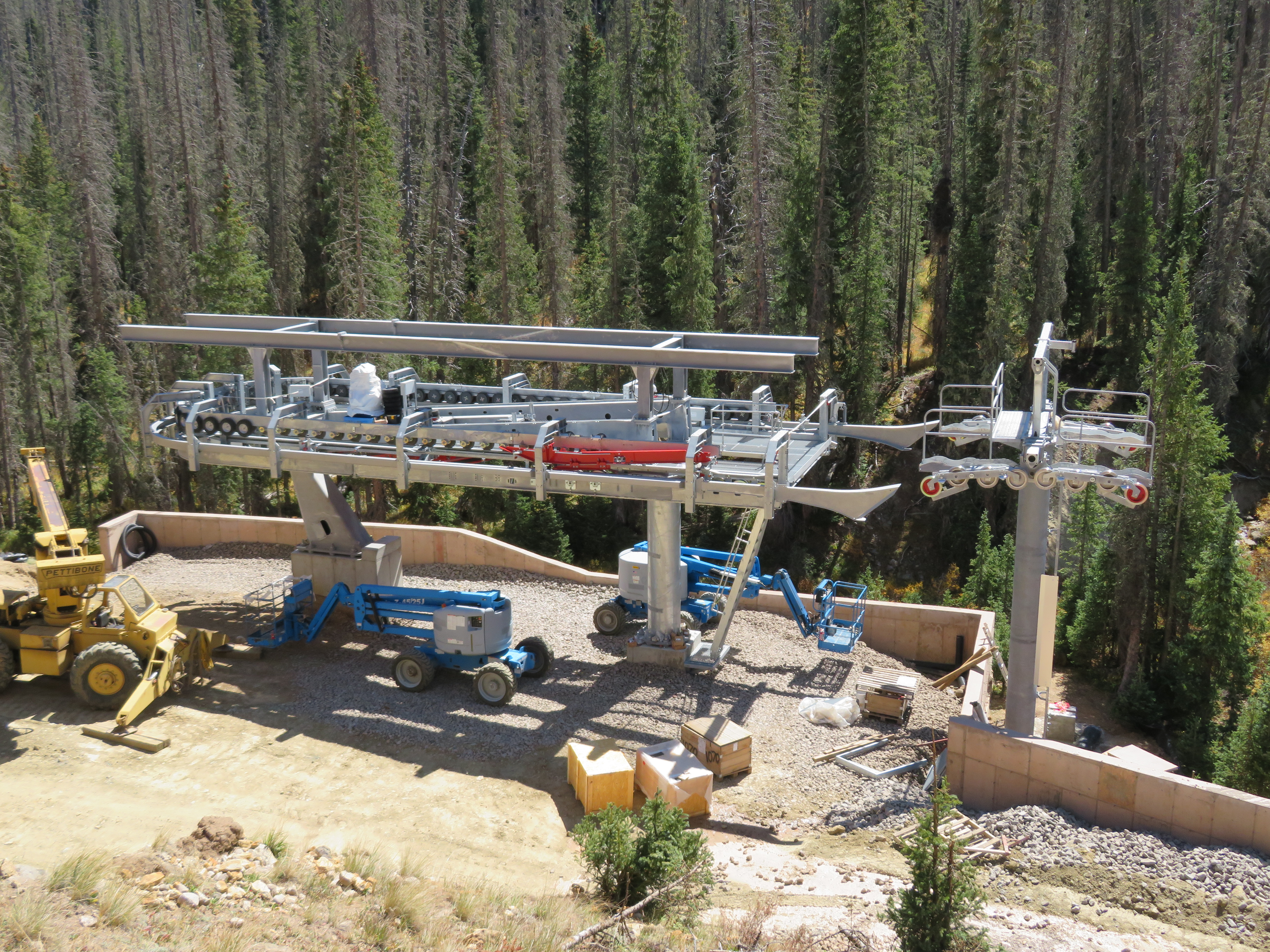 Before I get into a construction rundown, the video below shows a new Doppelmayr gondola in Turkey that appears to allow carriers to come to complete stops for loading and unloading while the haul rope keeps moving. In this installation, many of the carriers are buckets carrying ore that must be stopped to fill and dump while others carry workers and go through a standard turnaround. With double turnarounds at both ends, the setup appears to be similar to the six double loading stations going up at Walt Disney World.
