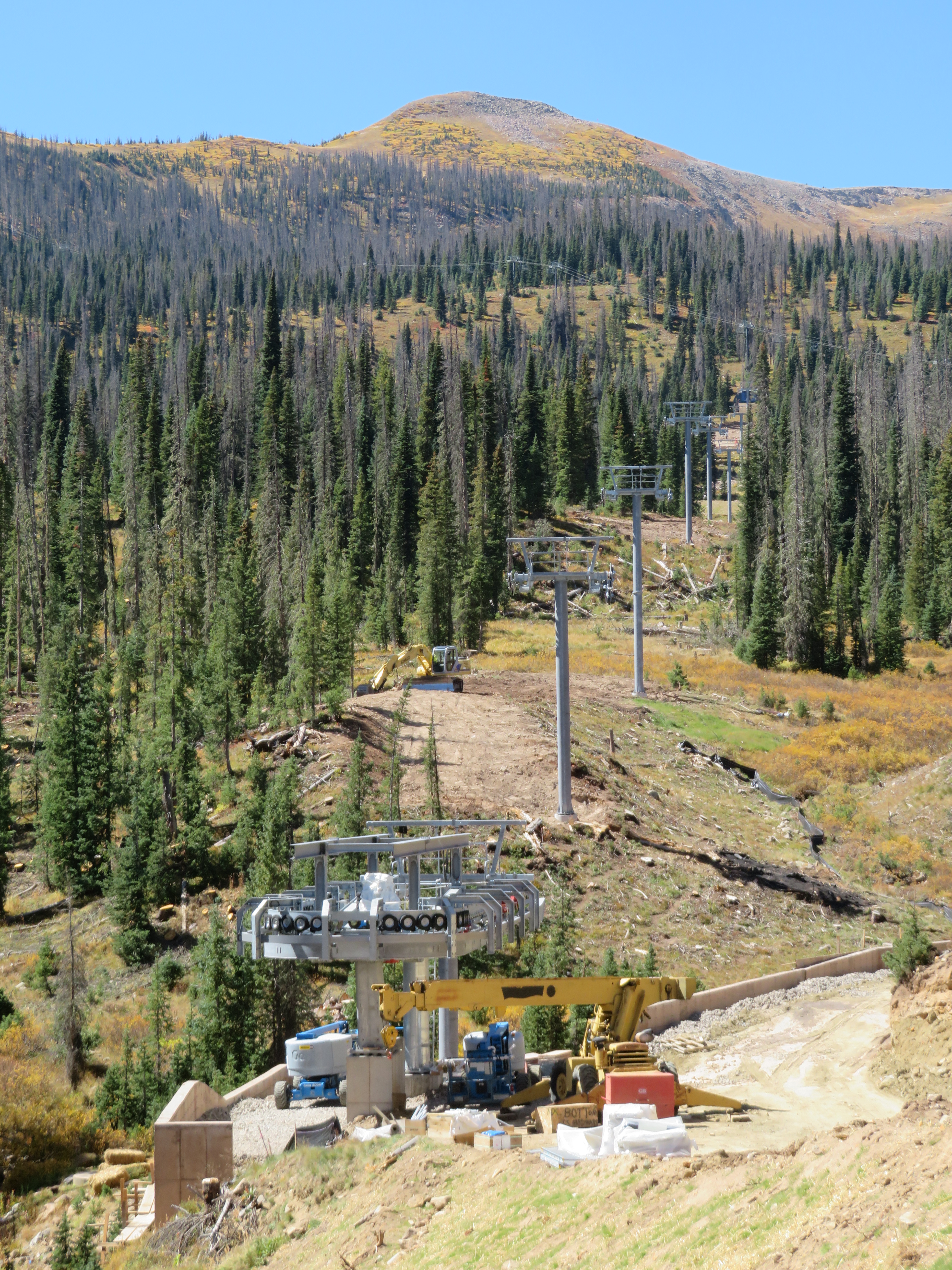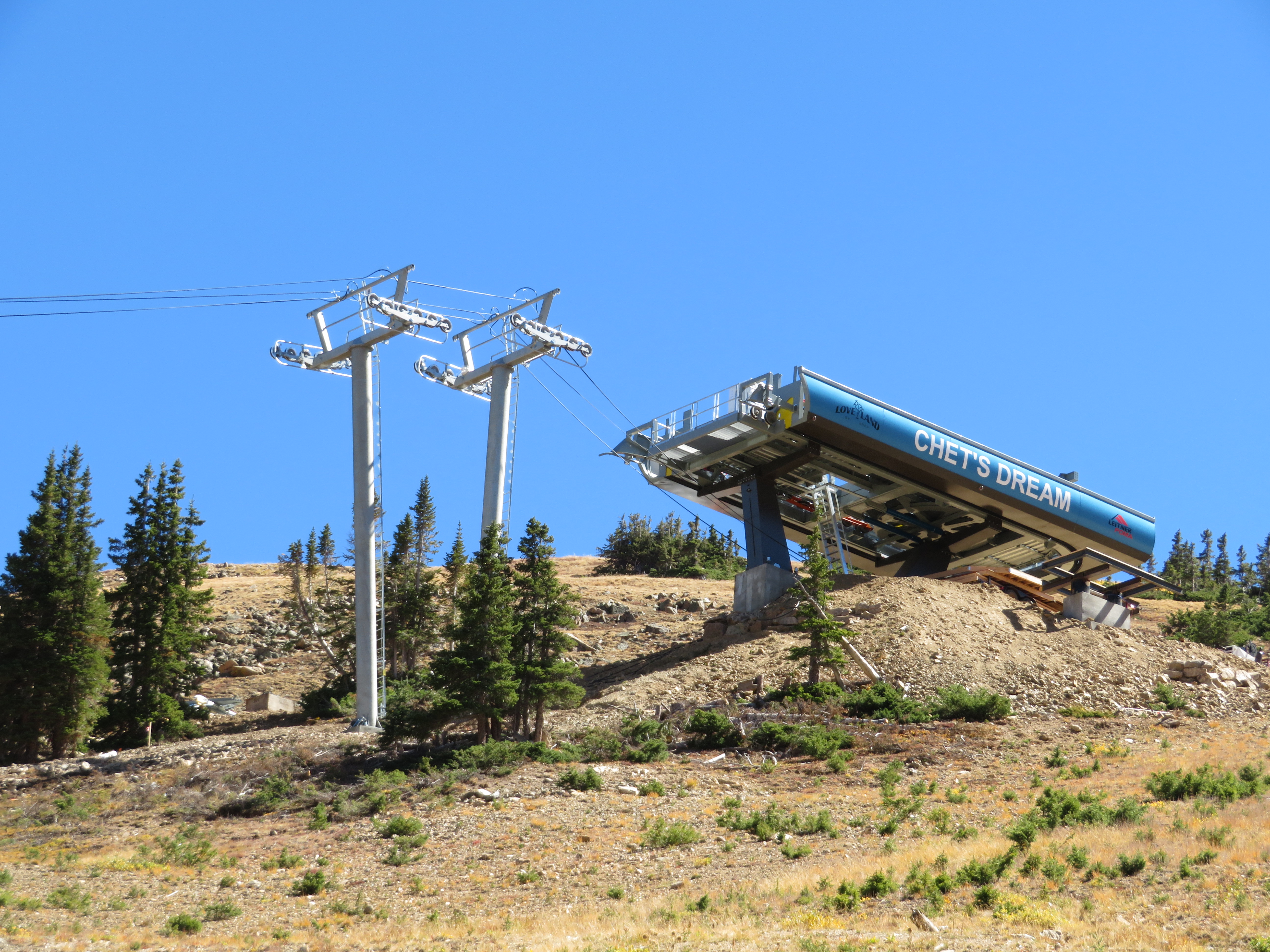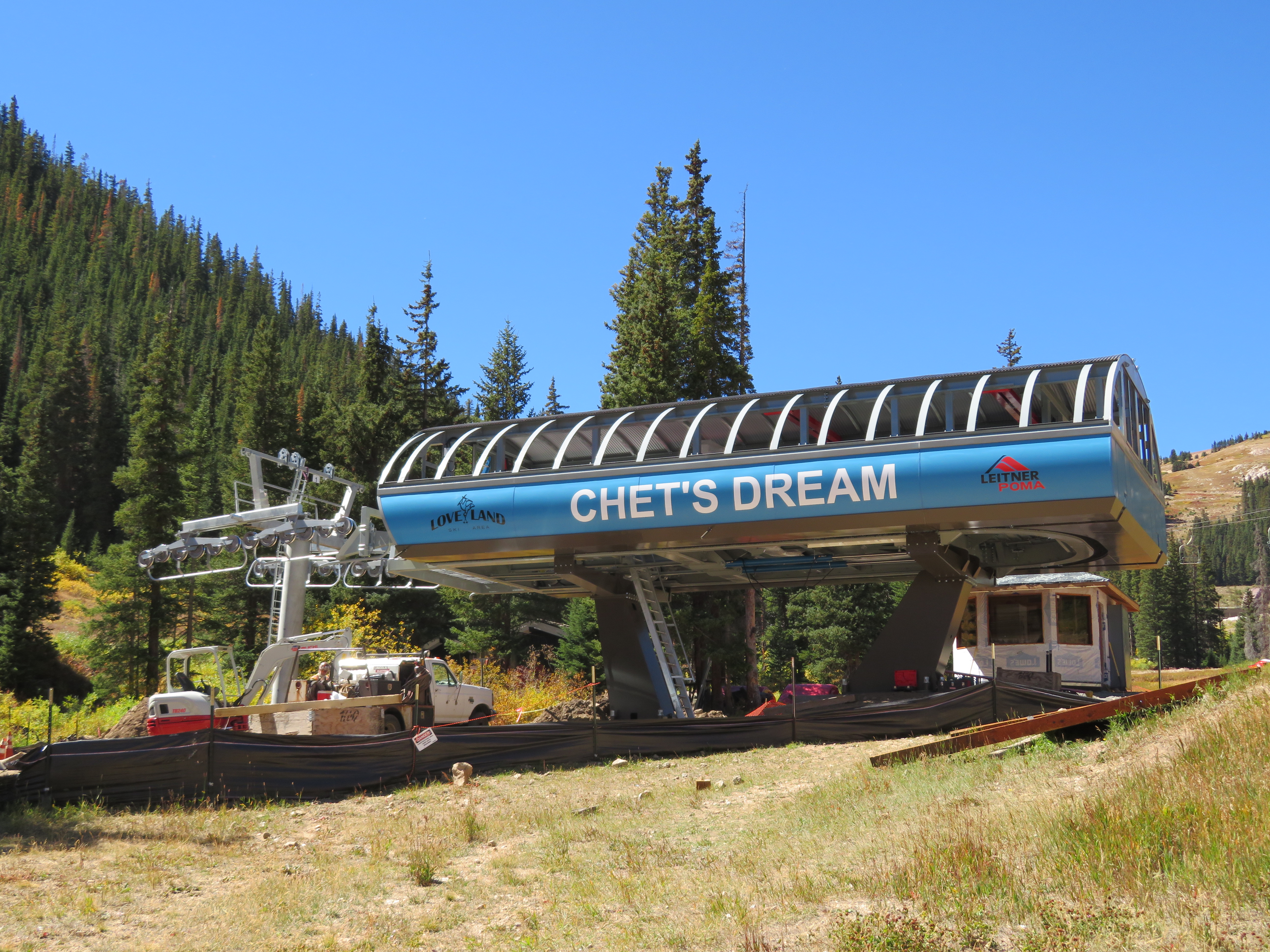 Two of the five biggest American ski areas without detachable lifts will leave the club this year. They are Loveland and Taos, both coincidentally adding bright blue Leitner-Poma high speed quads to serve as out-of-base workhorses. Along the Continental Divide at Loveland, the newly-named Chet’s Dream is the third chairlift to follow the Lift 1 line, carrying on the legacy of a Heron double and later a Lift Engineering triple. Family-owned Loveland ordered this lift early as 1 is usually among the first in the country to open for skiing in October. “It’s a big deal for both us and our guests,” Marketing & Communications Director John Sellers told me when I visited last week. “This lift will be in operation for the next few decades and we are excited to offer the increased speed and reliability to our customers for years to come.” With towers all flown and the rope going up shortly, the project is right on schedule.