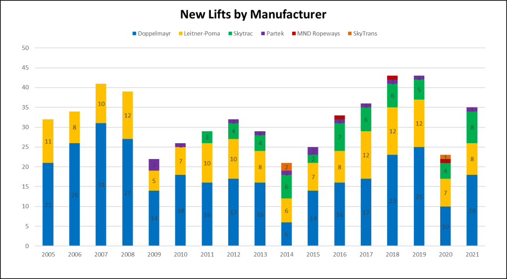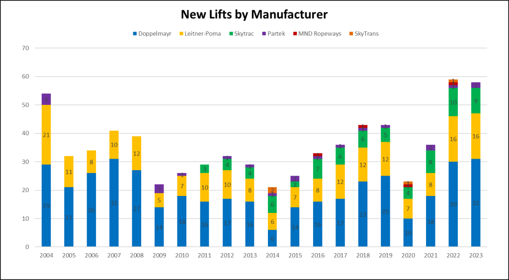 Doppelmayr installed slightly more lifts than competitors Leitner-Poma and Skytrac but the Austrians’ number of projects declined the most from 2023. Partek, MND and SkyTrans fabricated no aerial lifts, leaving customers with a true duopoly in 2024.