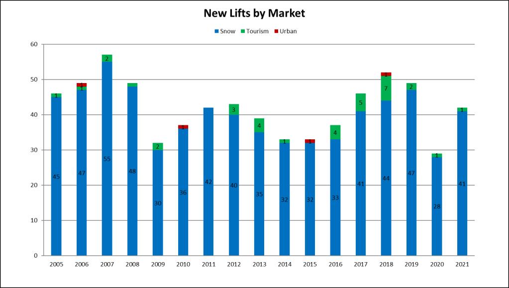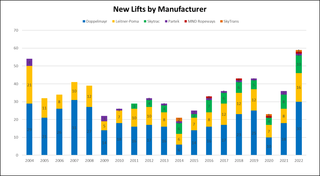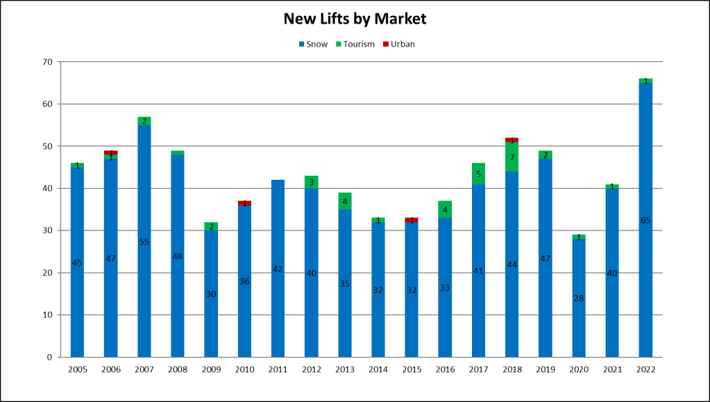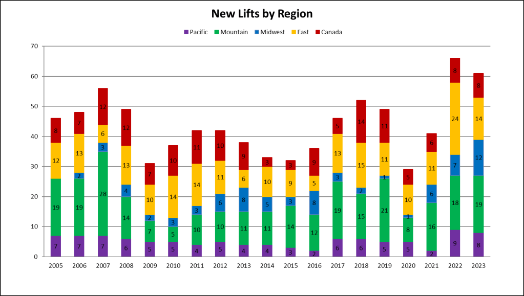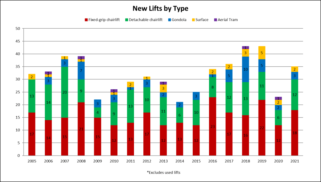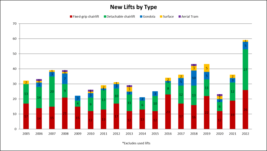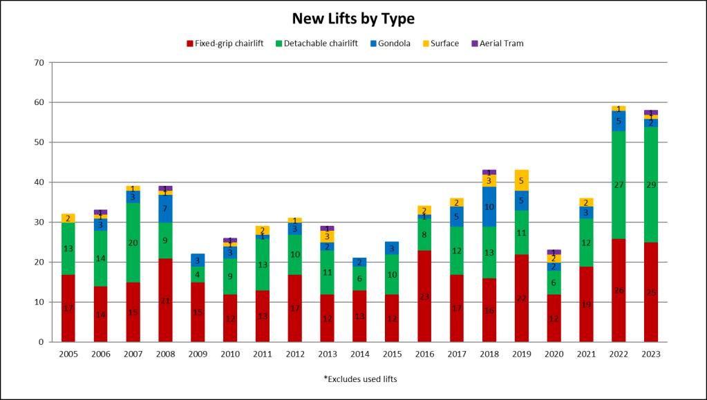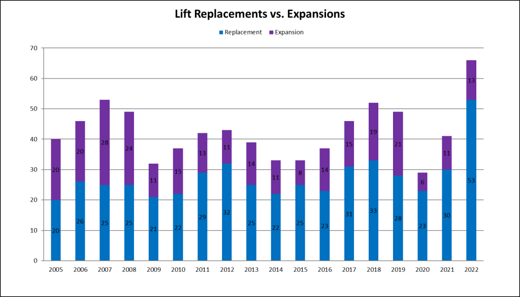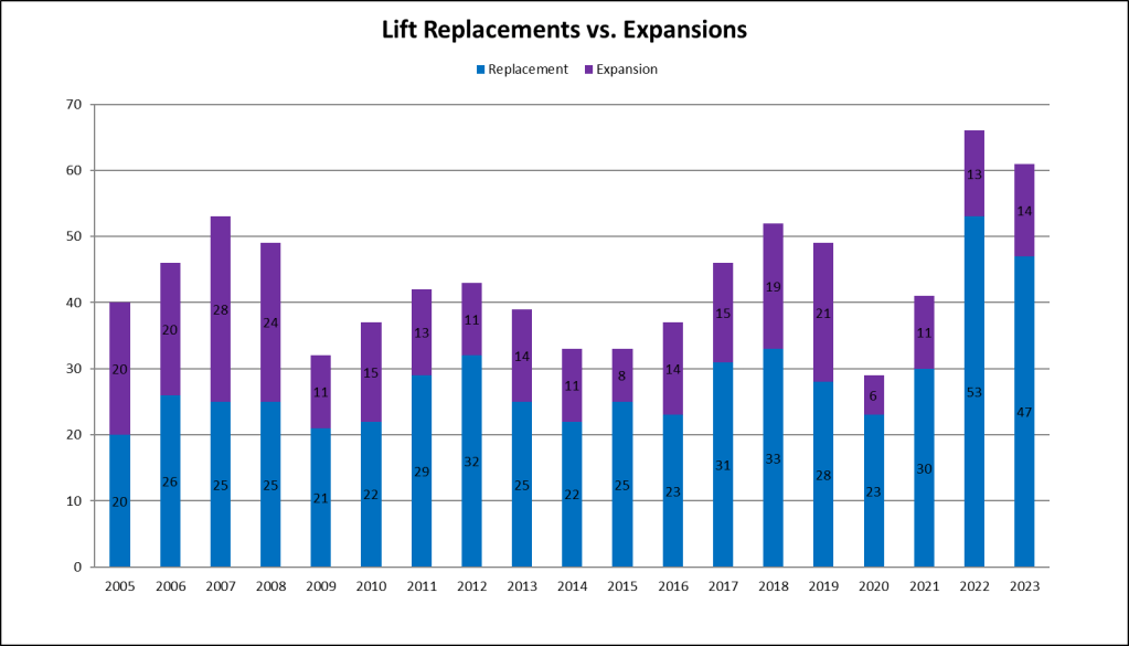 This year was the second best for expansion lifts since the 2008 financial crisis, signaling resorts are looking to grow operations rather than simply replacing old lifts. Part of that is of course the Deer Valley East Village megaproject, encompassing five projects this year and many more to come.