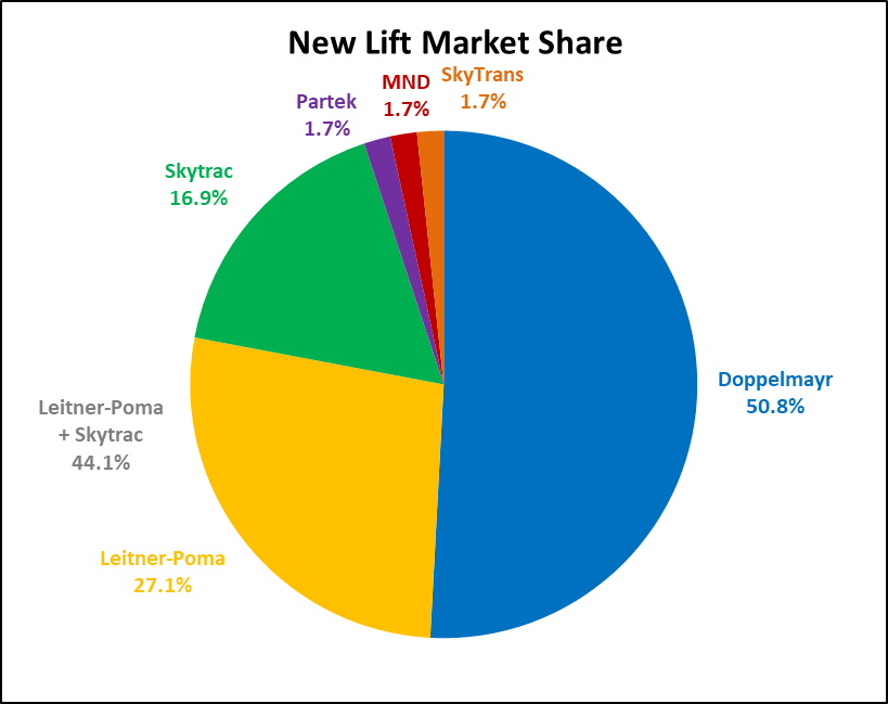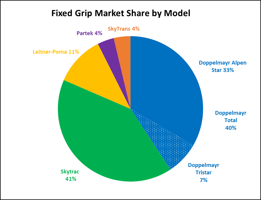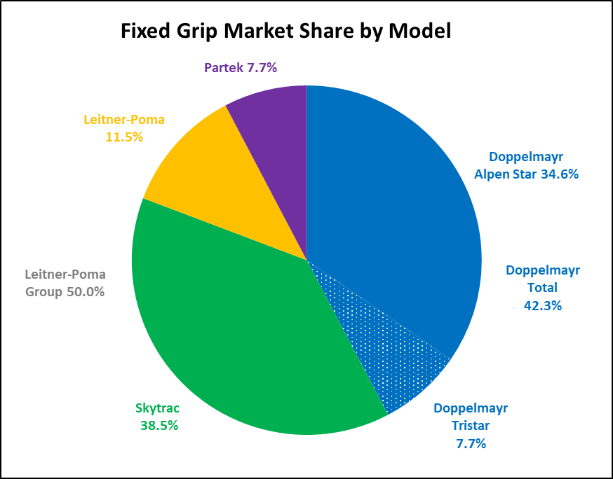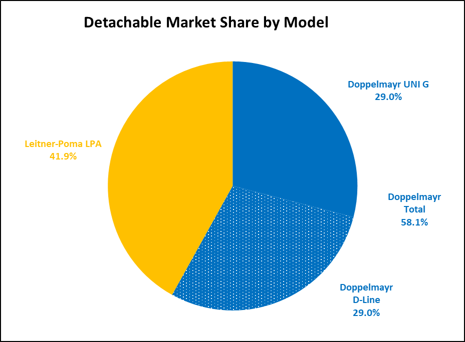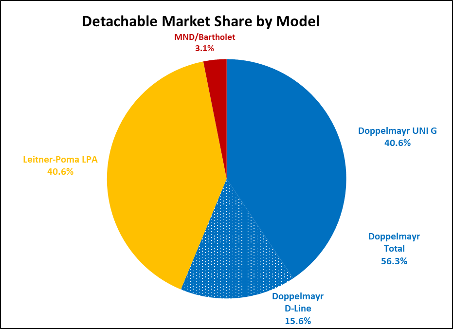 Doppelmayr dominated the fixed grip market with 57 percent share while detachables were split exactly evenly between the two builders. Doppelmayr supplied fewer D-Line detaches this year, installing two big ones at Big Sky Resort and one each at Mammoth Mountain and Deer Valley. Signs point to more D-Lines in 2025.