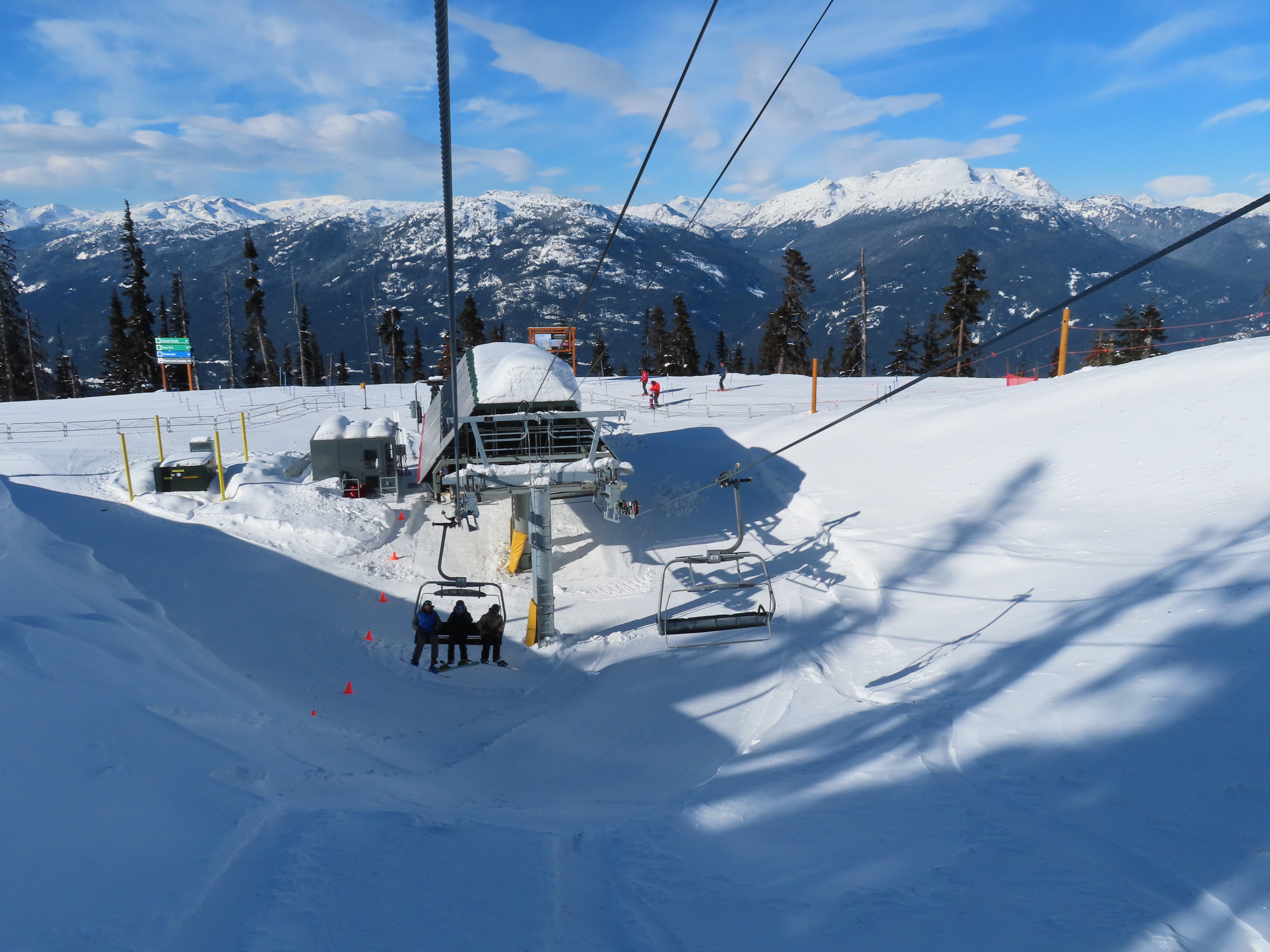This Doppelmayr detachble quad was relocated from Emerald on Whistler (background) and rebuilt in 2018.The top terminal houses the drive and is located next to Peak 2 Peak tower 4.The top station and last tower next to Blackcomb Gondola Upper.View down the short lift line.Upper section of the line.Middle lift line.Another section of the line.View up the line.Doppelmayr EJ chairs and new towers.The return terminal with a view of Whistler Mountain.Side view of the return station.Loading area and small maintenance rail.The operator houses were also new in 2018 as the old ones stayed on Whistler.Riding up the lift line.View back down the line.Upper part of the lift line.The terminals got a new paint job but the emerald remains on the roof.