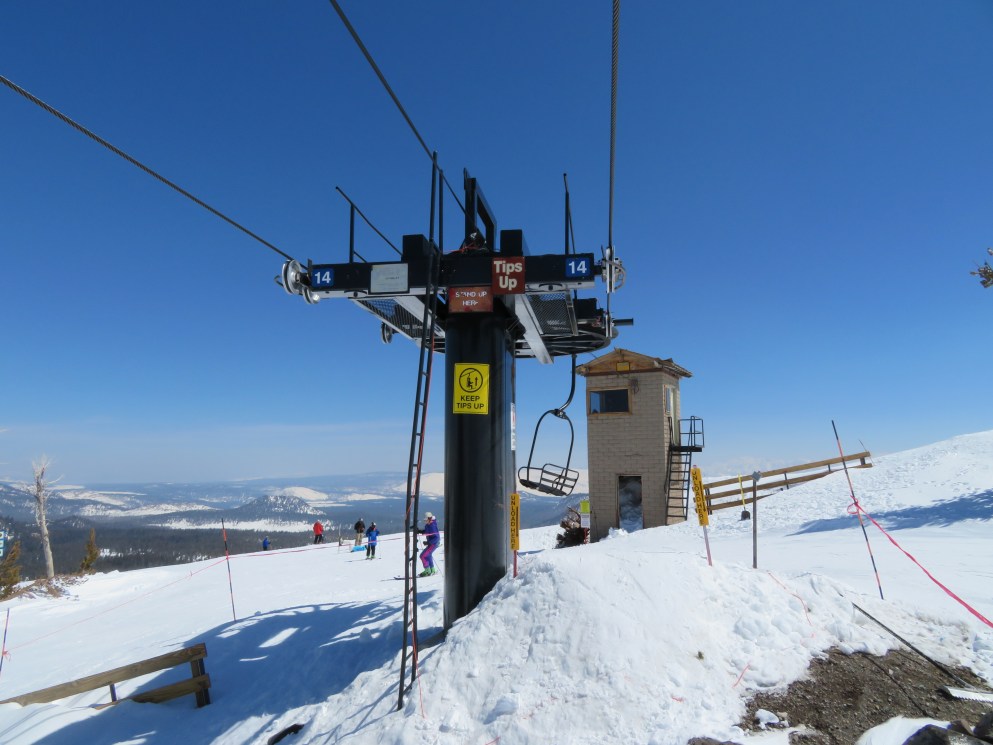 Top station with fixed bullwheel.Lift line.Looking down the line towards Chair 14.Lower lift line.Chair 13 is one of three Yan double chairs opened in 1972 with loading areas separate from the motor room.Drive.Another view of the motor room.Load and lift line.View back down the line.Arriving up top.Top station overview.