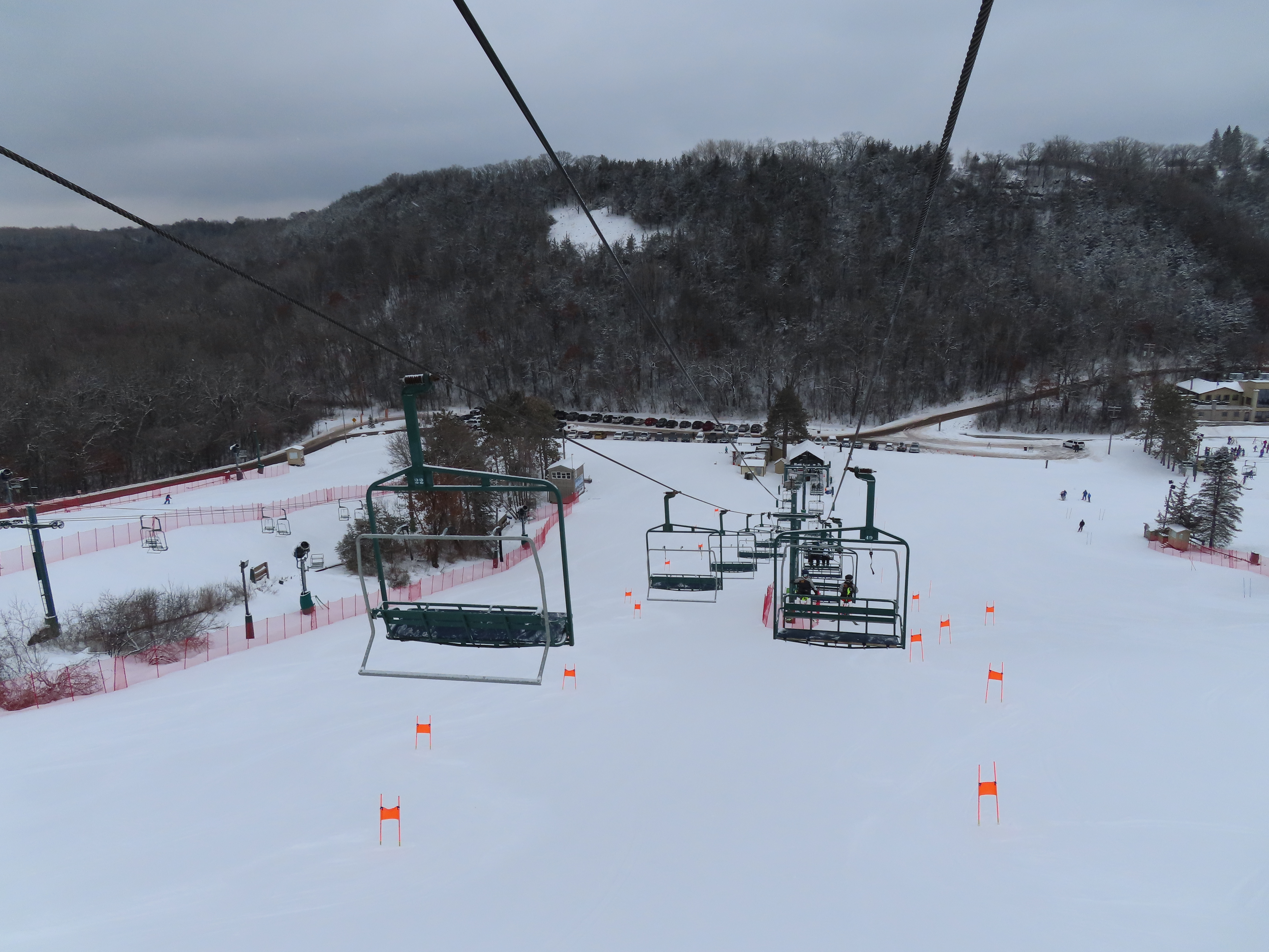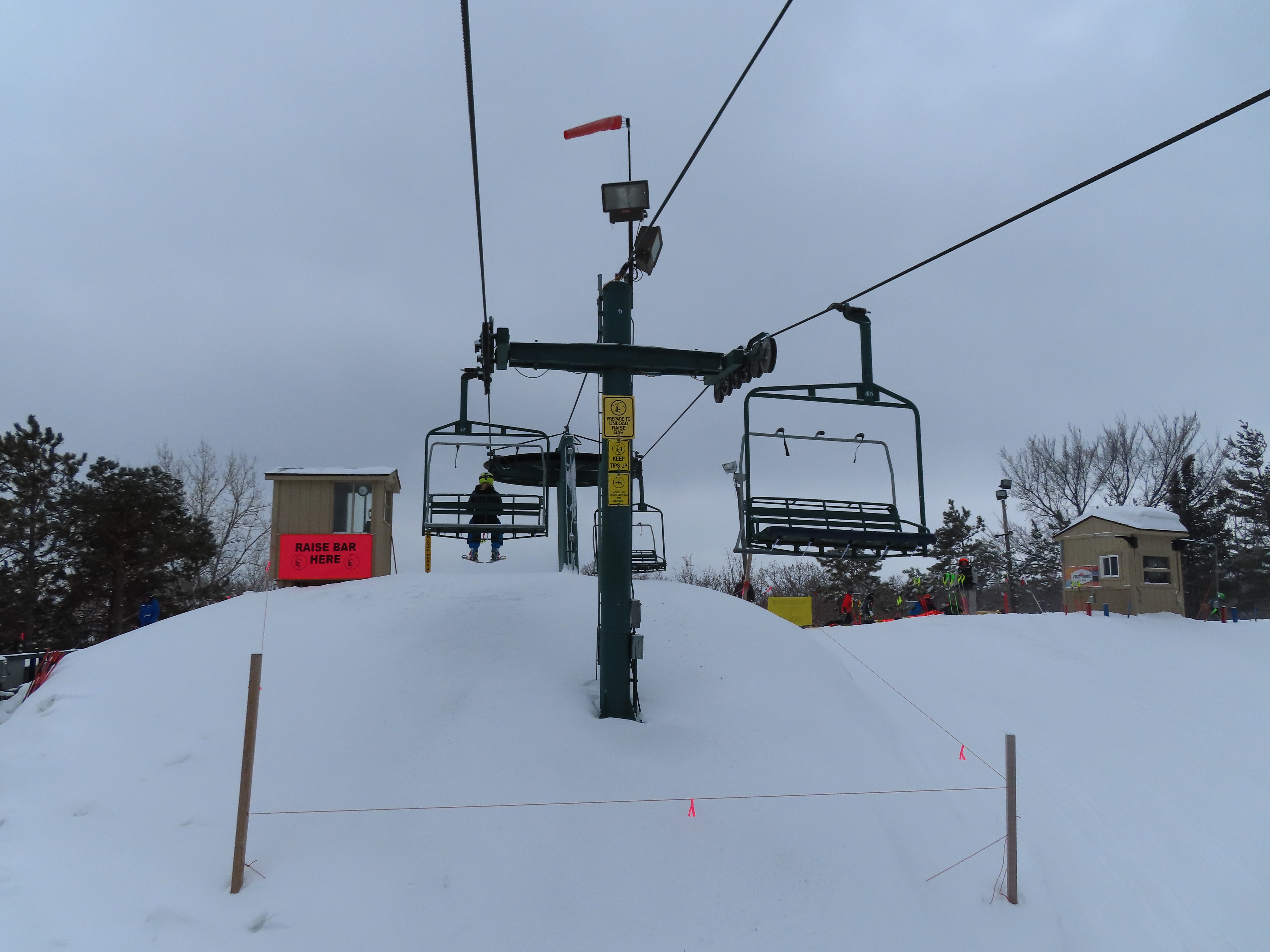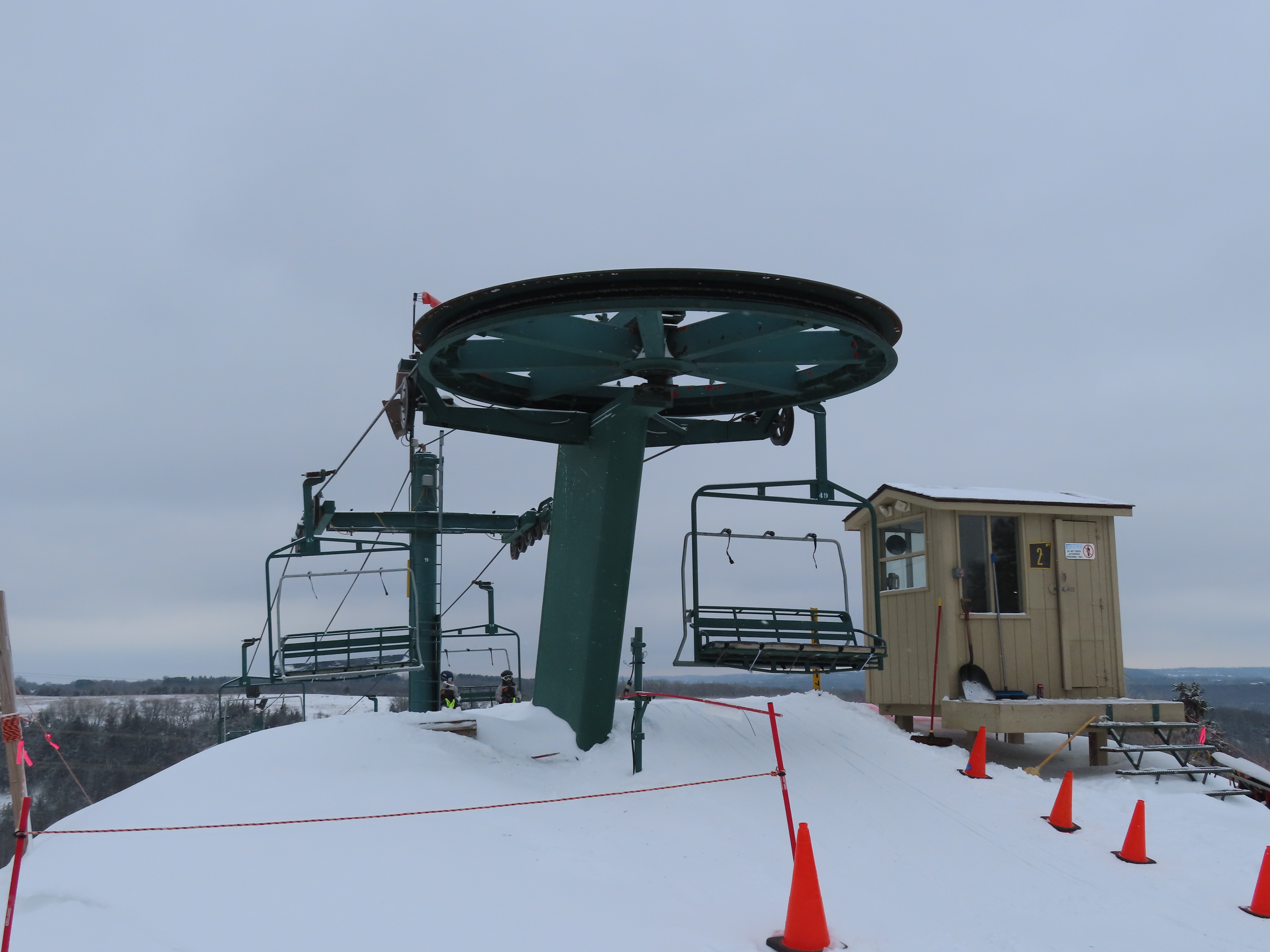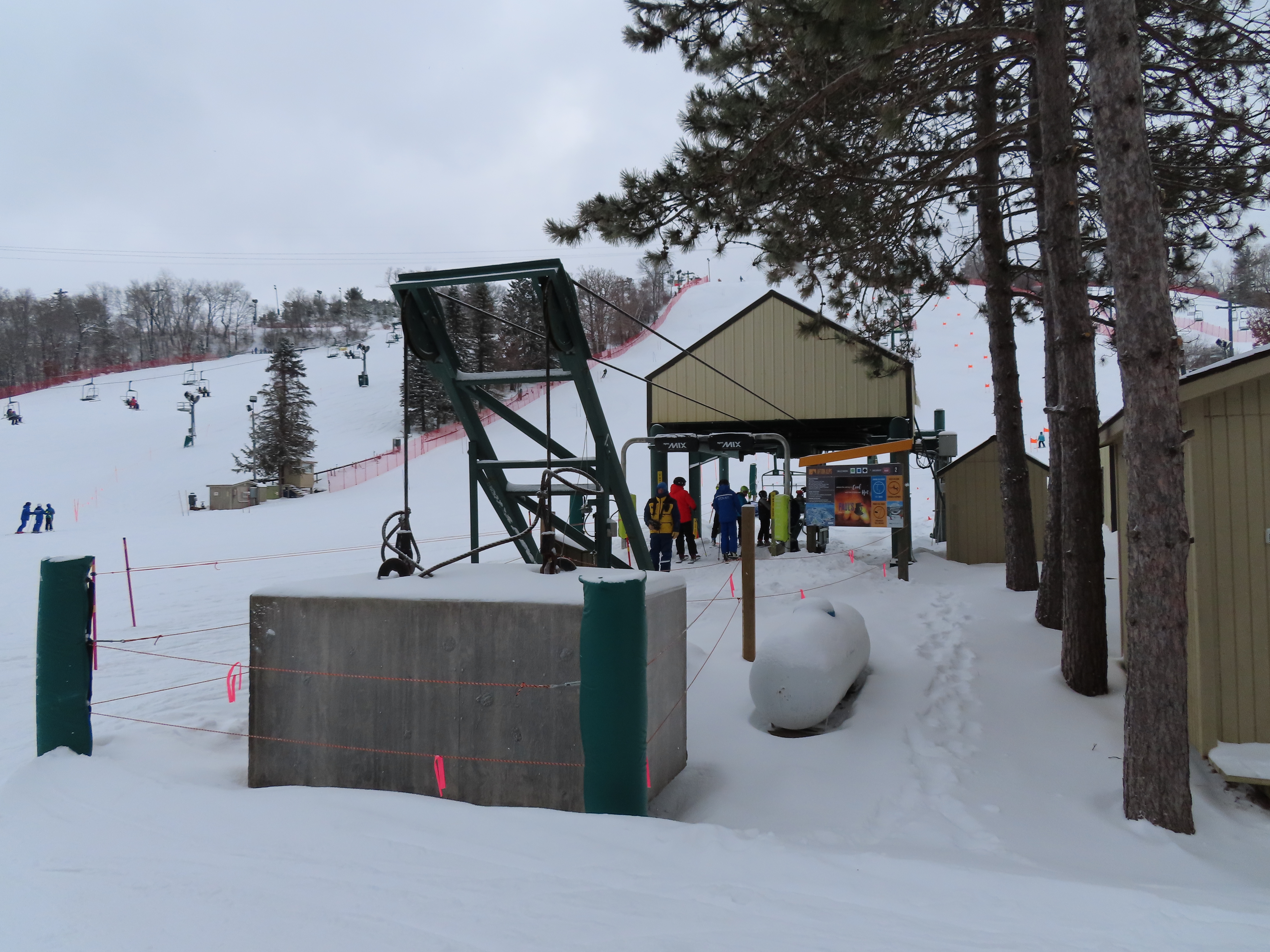 This was the only quad Hall built at Afton Alps.Counterweight.Lift overview.The first tower is a portal design.Vail Resorts added bars to all the chairs upon acquiring Afton Alps.View back down the lift line.Arriving at the summit.Top bullwheel.Drive-tension station seen from above.A reinforced hold down tower.