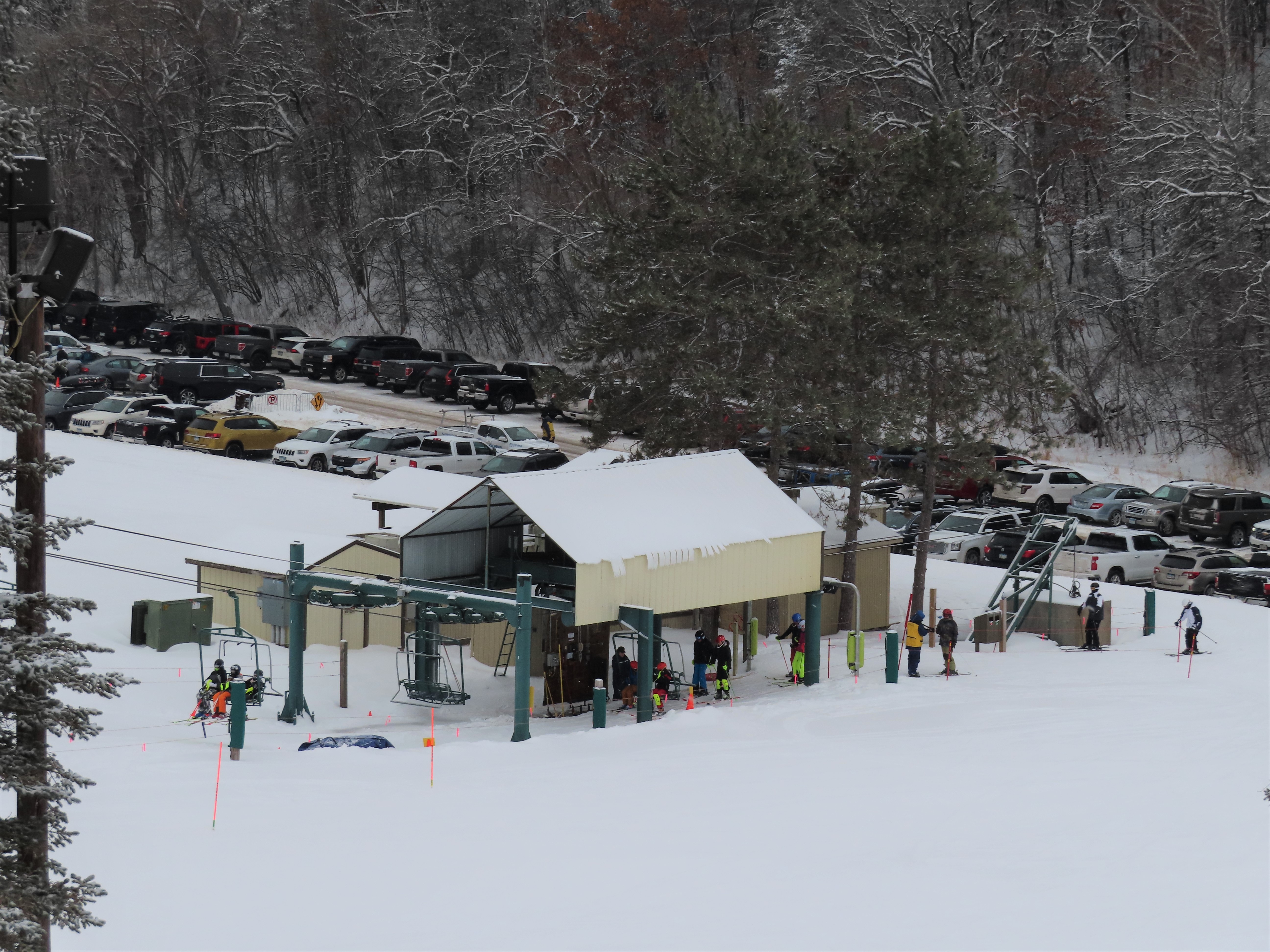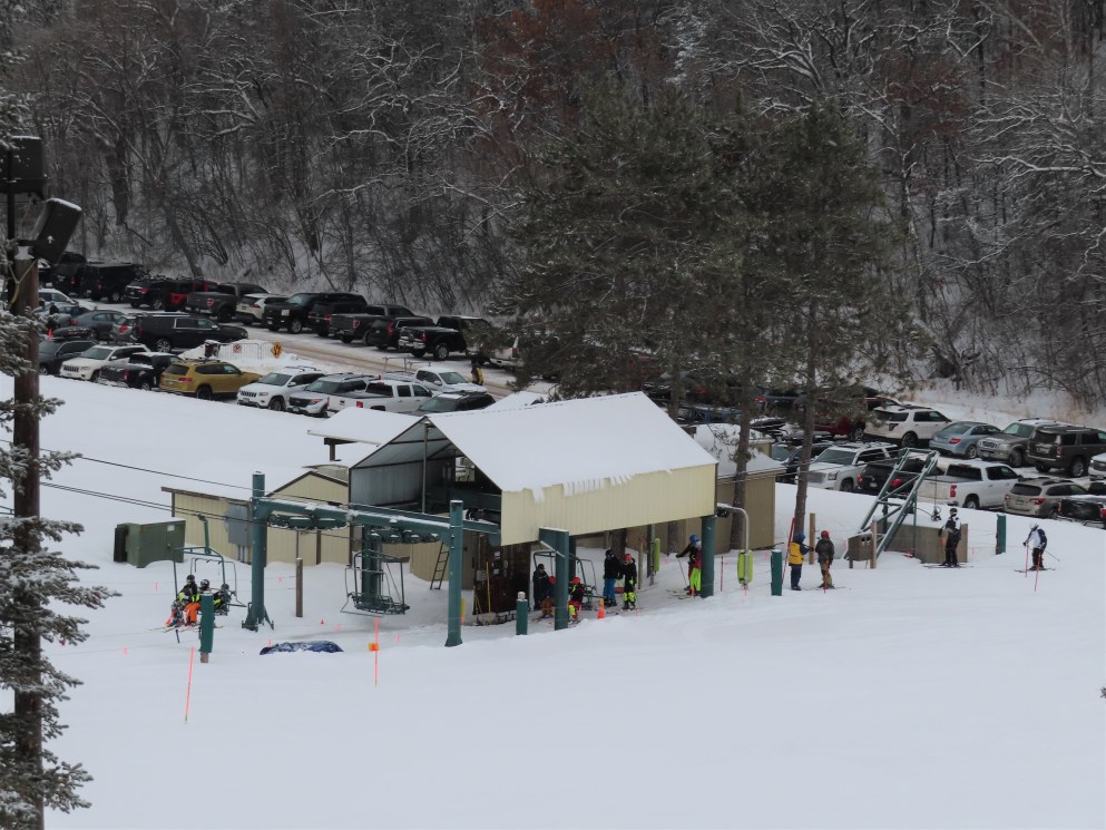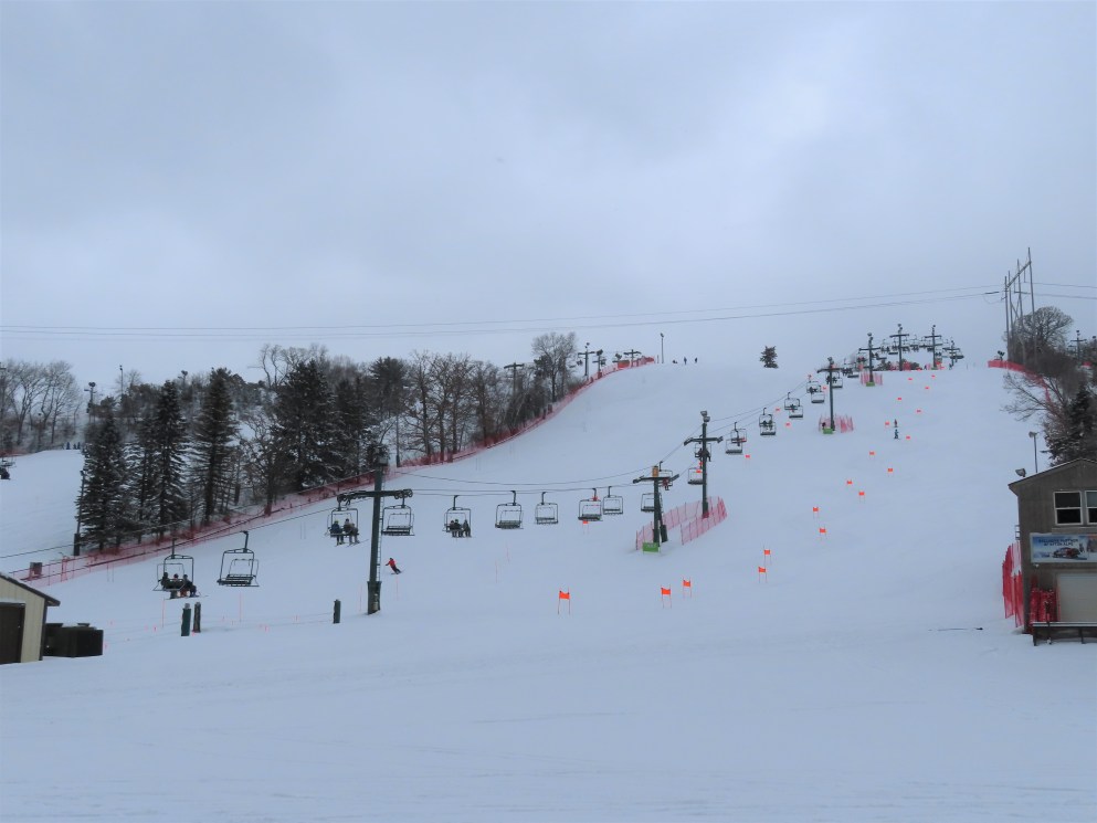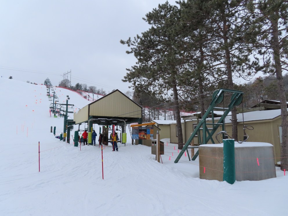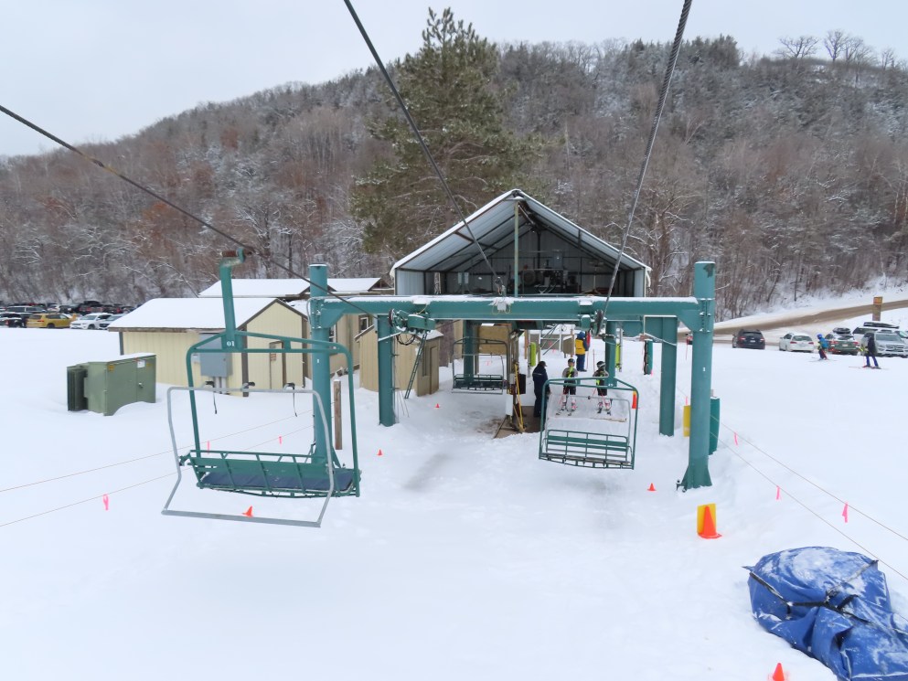 This was the only quad Hall built at Afton Alps.Counterweight.Lift overview.The first tower is a portal design.Vail Resorts added bars to all the chairs upon acquiring Afton Alps.View back down the lift line.Arriving at the summit.Top bullwheel.Drive-tension station seen from above.A reinforced hold down tower.
