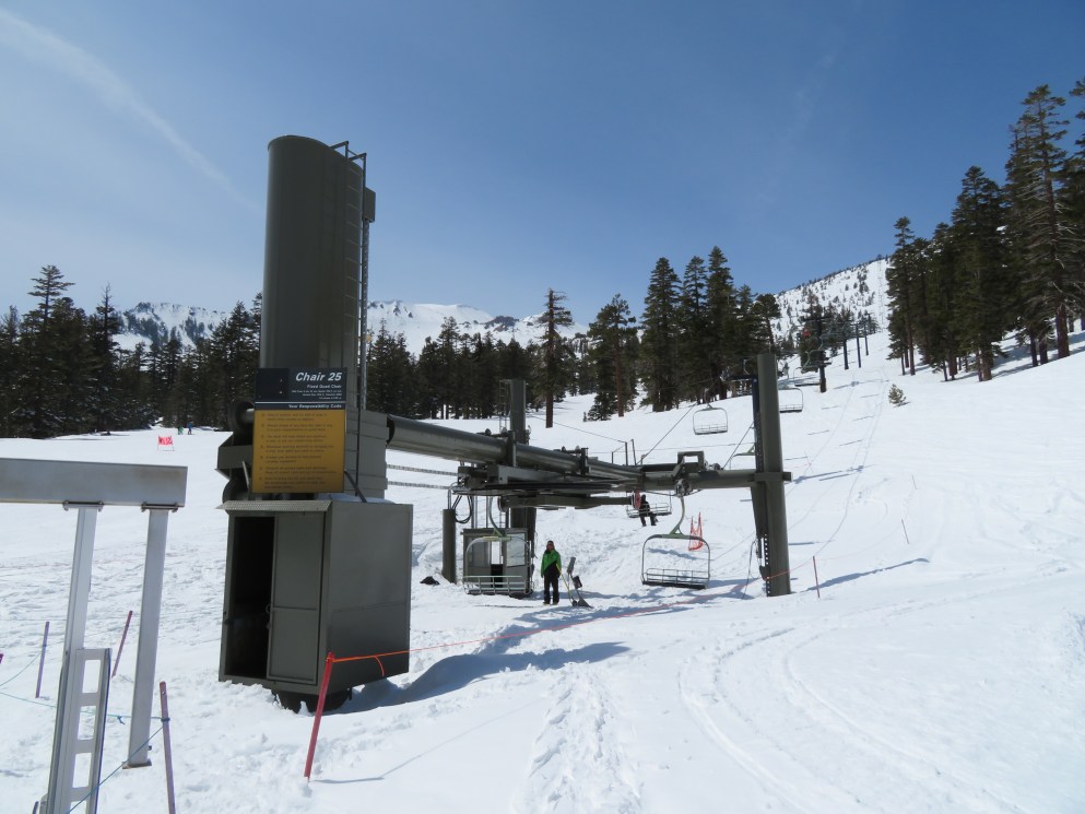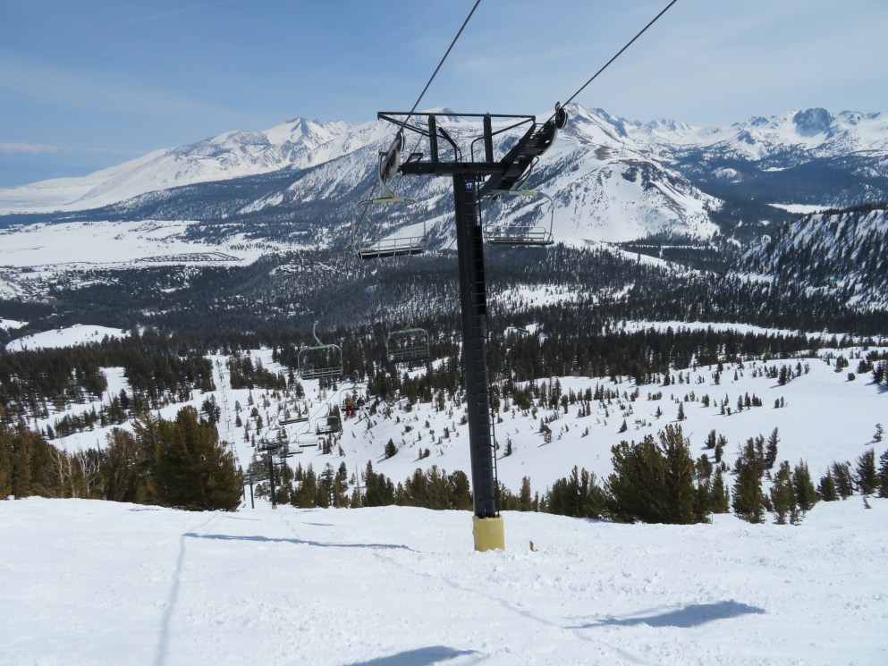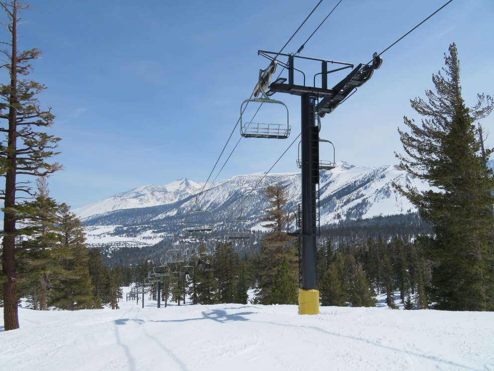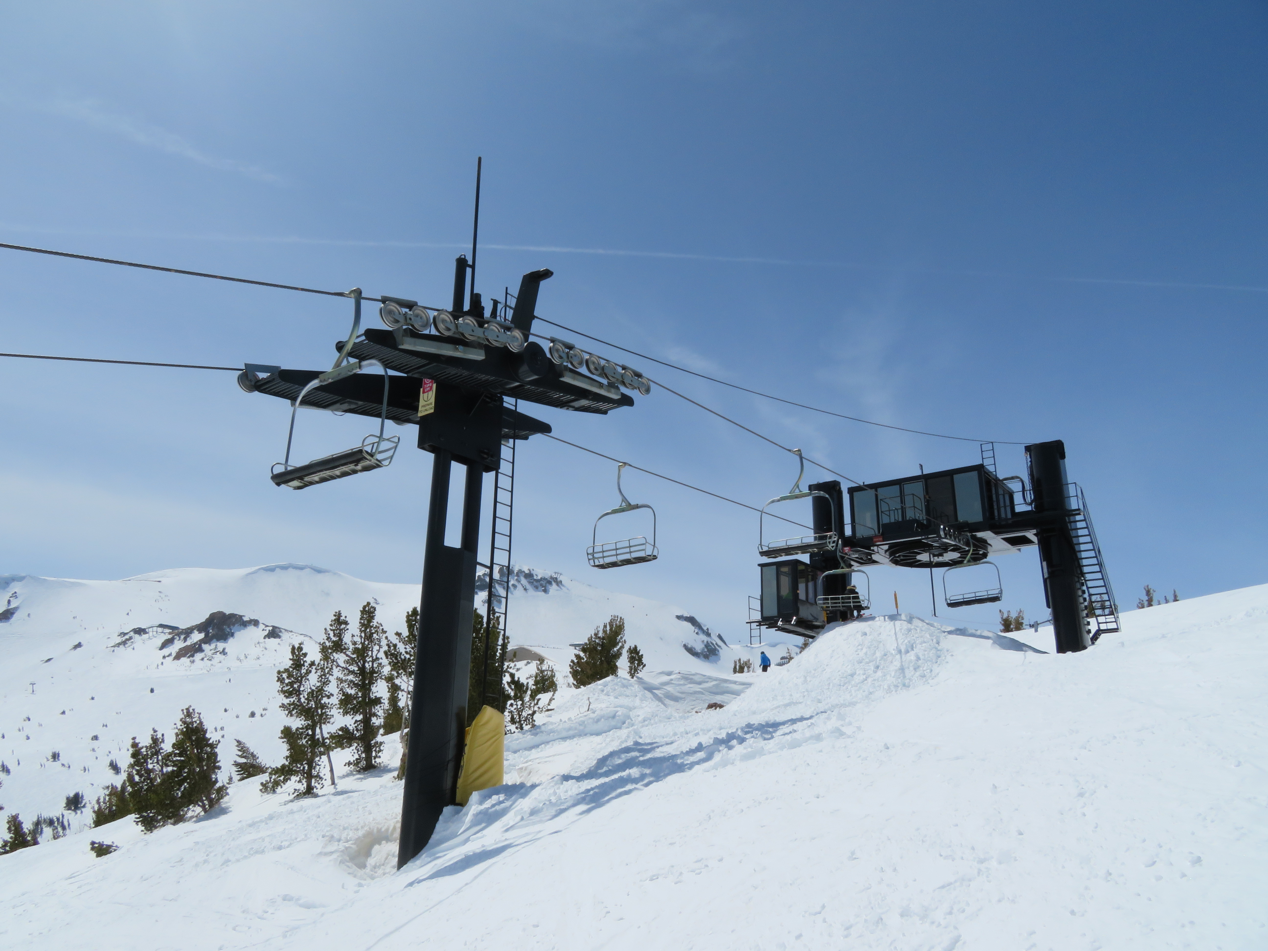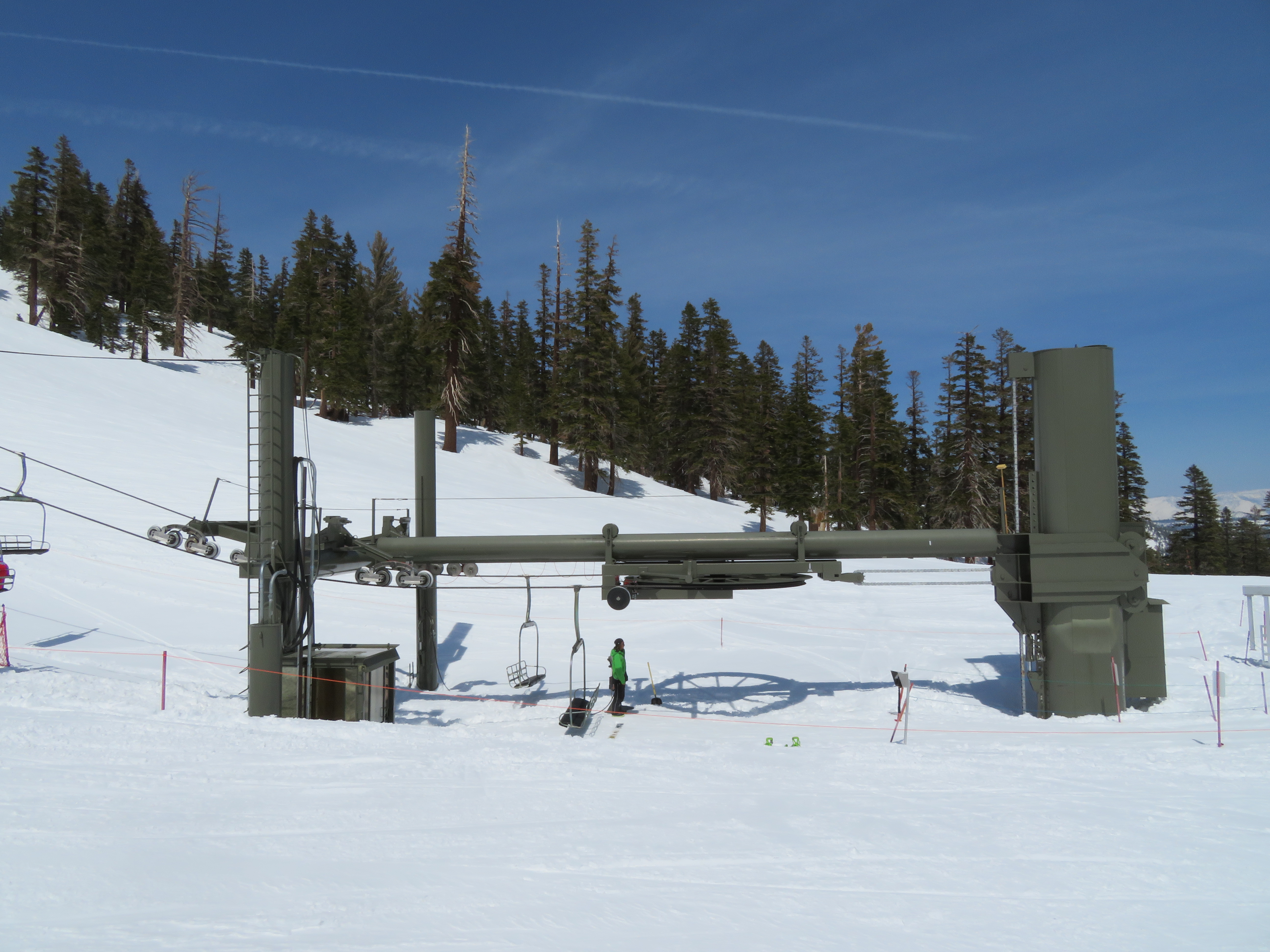 Top station built by Lift Engineering.This is the newest fixed-grip lift at Mammoth as of 2017.Yan towers with a mix of Yan and Doppelmayr line equipment.Middle part of the lift line.View up the steep top part.Yan “hubcap” sheaves.Lift line.Side view of the tension return terminal.Lift overview.Riding up an empty line.