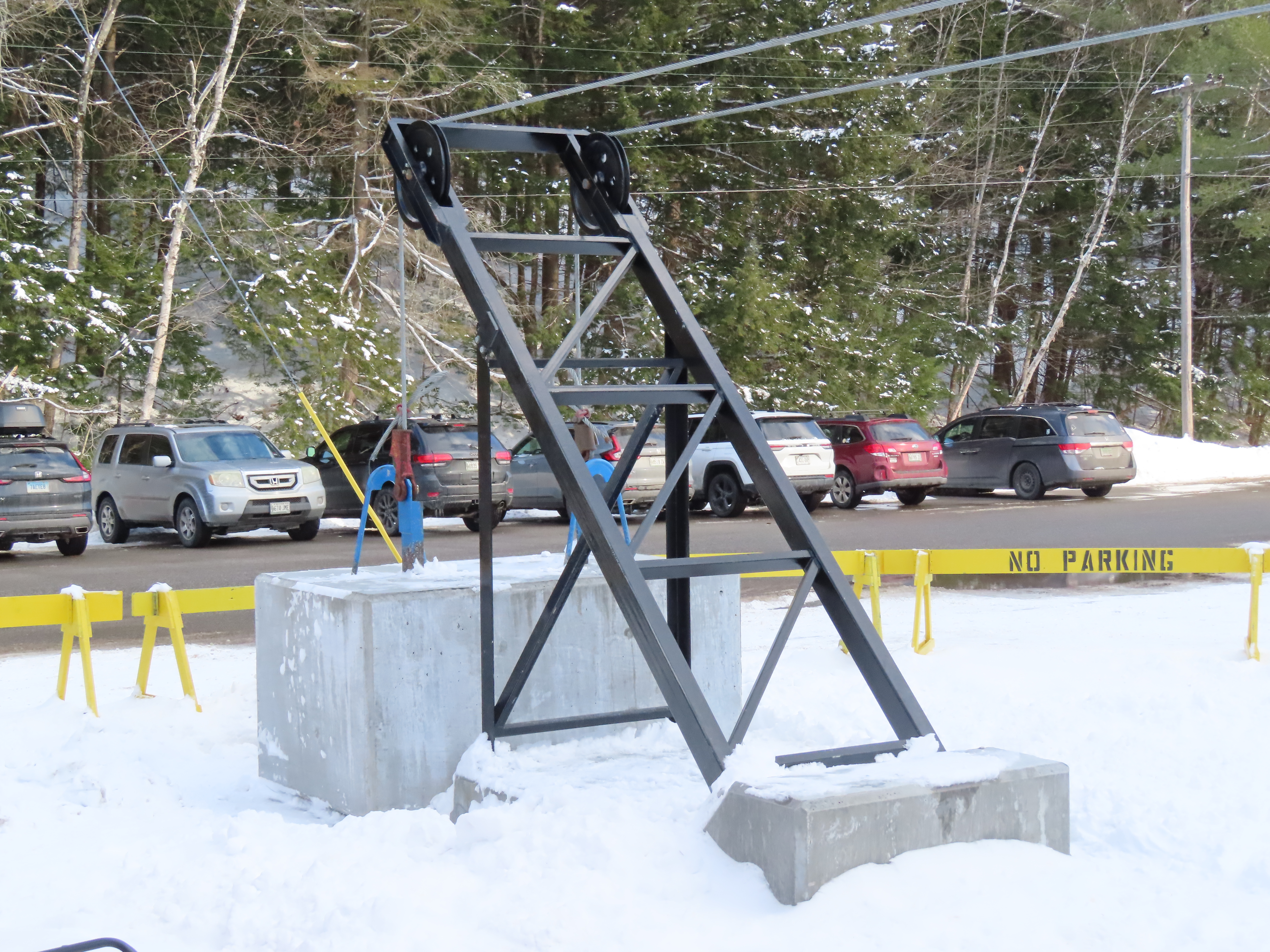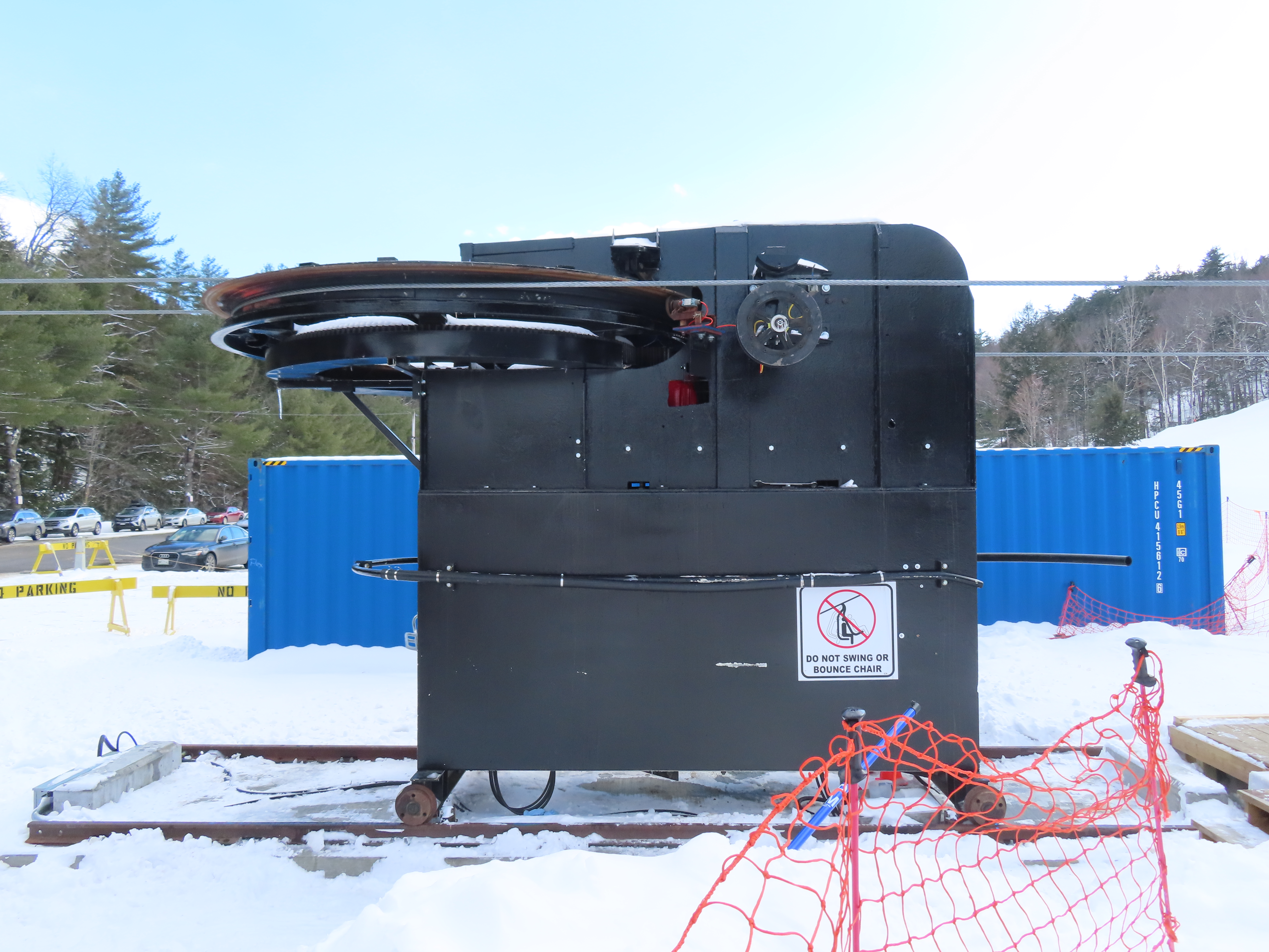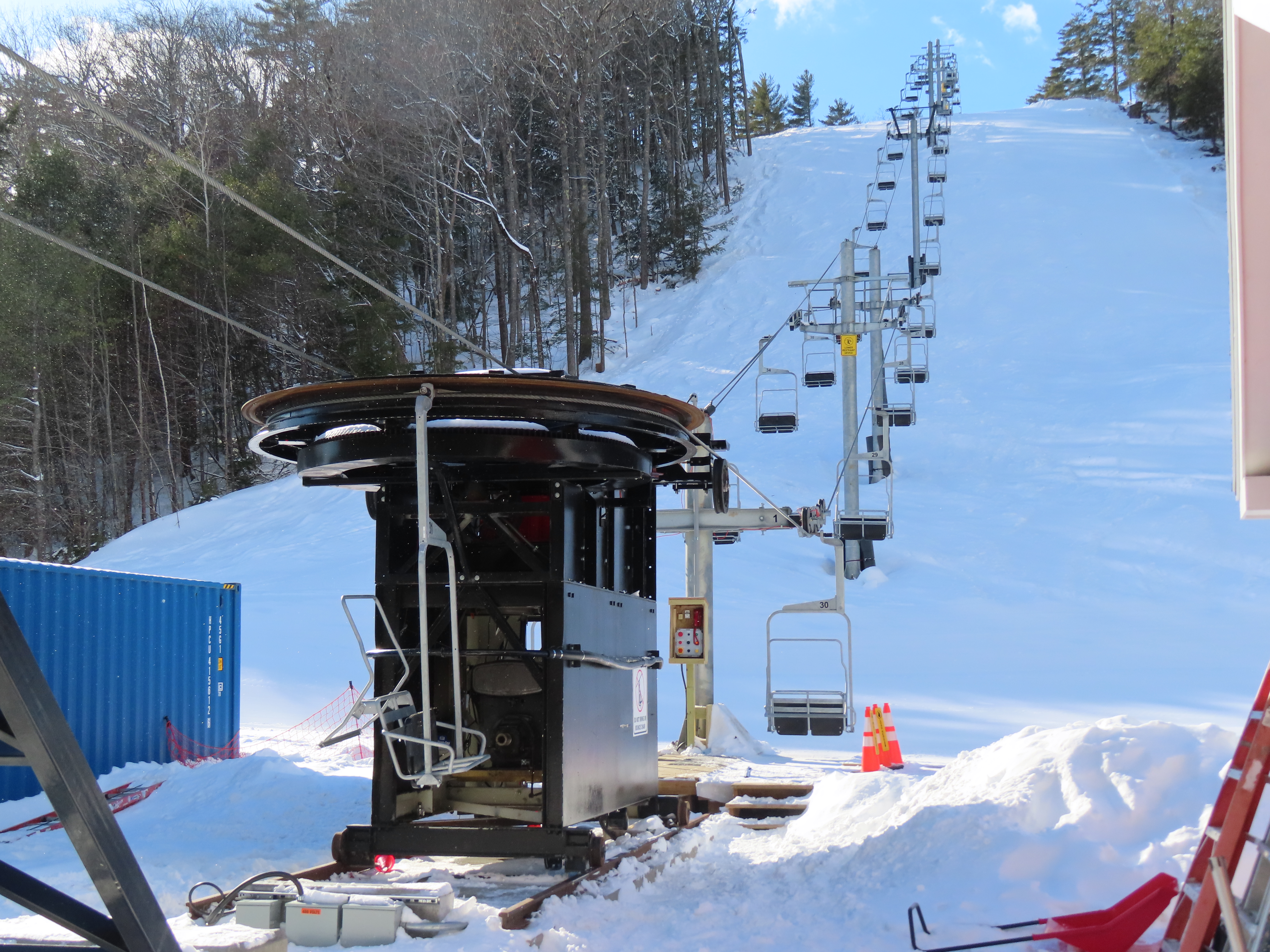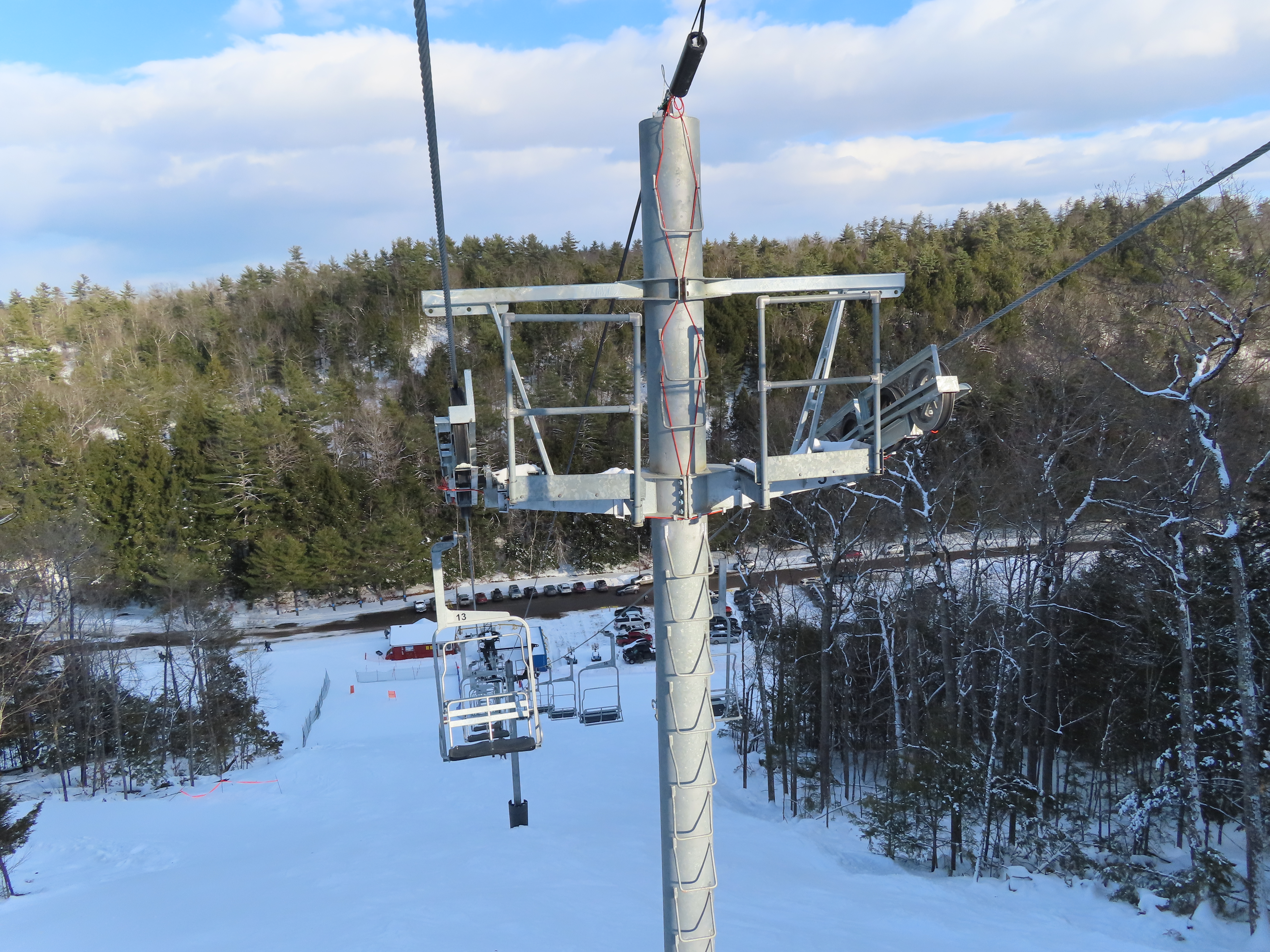 This is Lost Valley’s third Hall double, installed for the 2024-25 season.At Mount Southington, this was a beginner lift, but here it’s quite steep.Bottom drive station.Breakover towers.Side view of the drive unit.View up from the base area.New control system.Counterweight for tensioning.Galvanized tower with new lifting frame and catwalks.Upper station next to Chair 1’s bullwheel.Towers 7 and 8.Fixed return bullwheel.Middle section of the line where an old T-Bar used to run.Lower station overview.