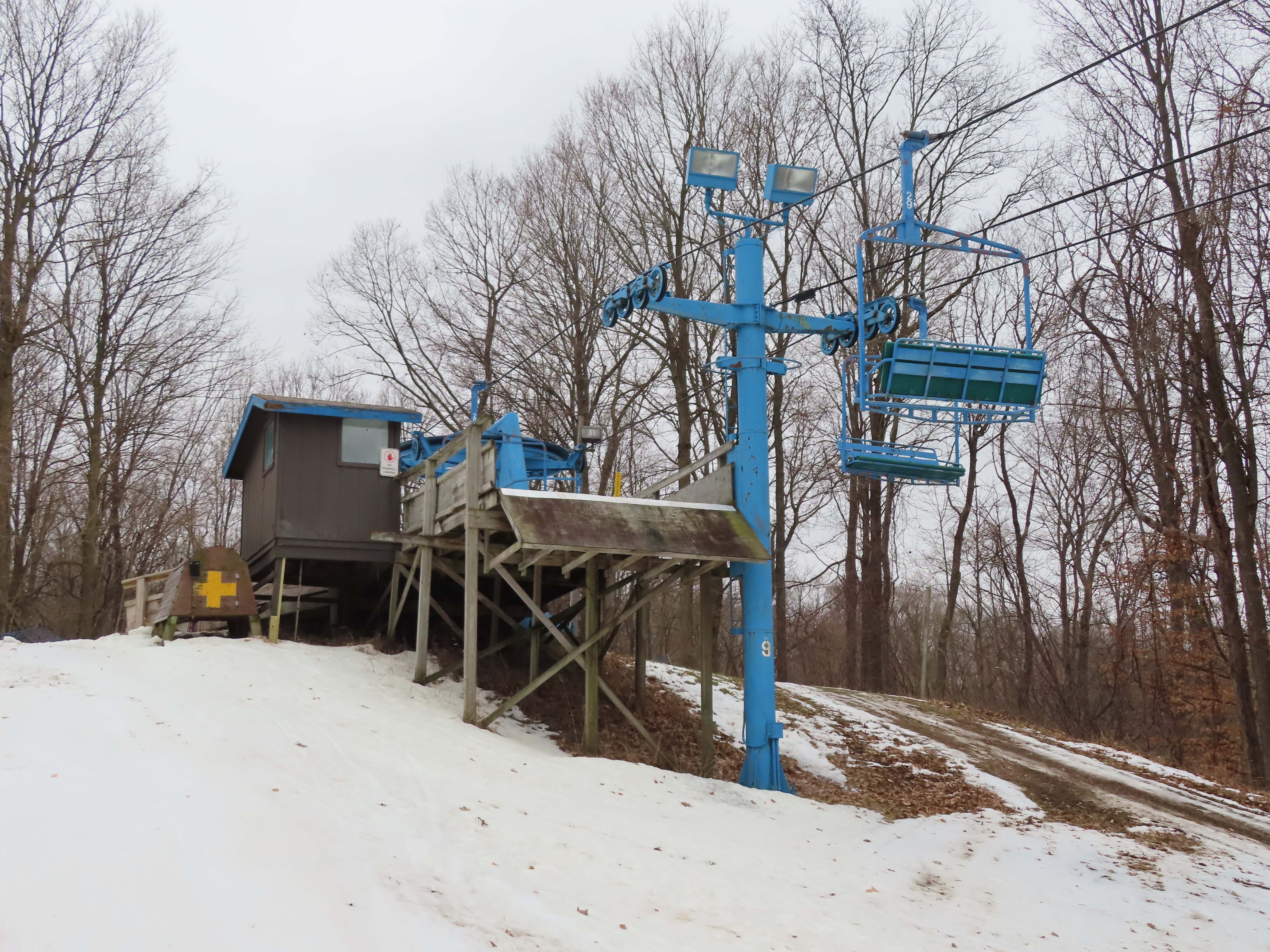 This quad chair was built to expand the mountain in 1982.Lift overview.Unloading platform at tower 9.View down the line.Upper part of the lift.The first three towers and drive terminal.Portal tower 1.Counterweight.Loading area.Another view up the line.