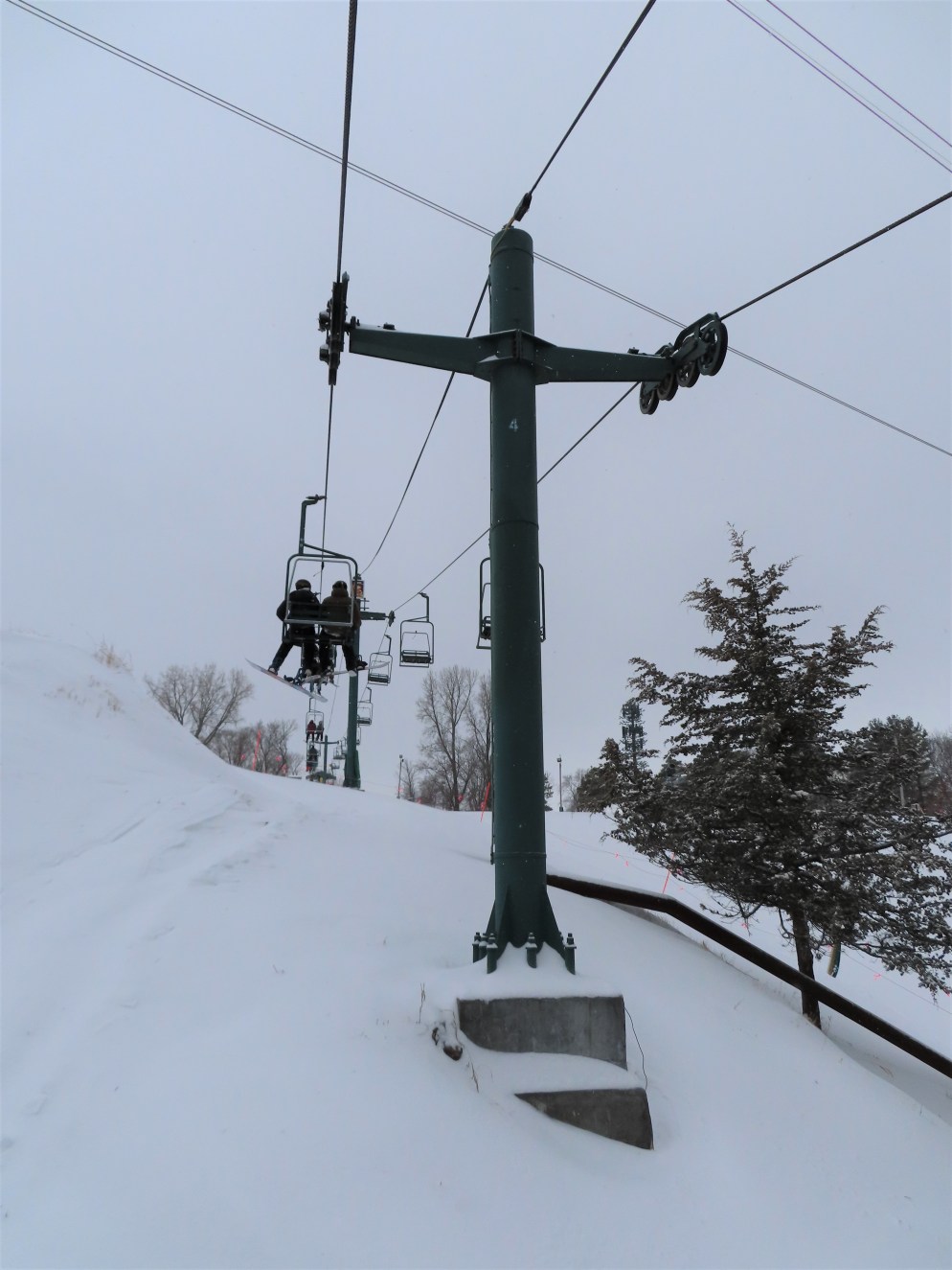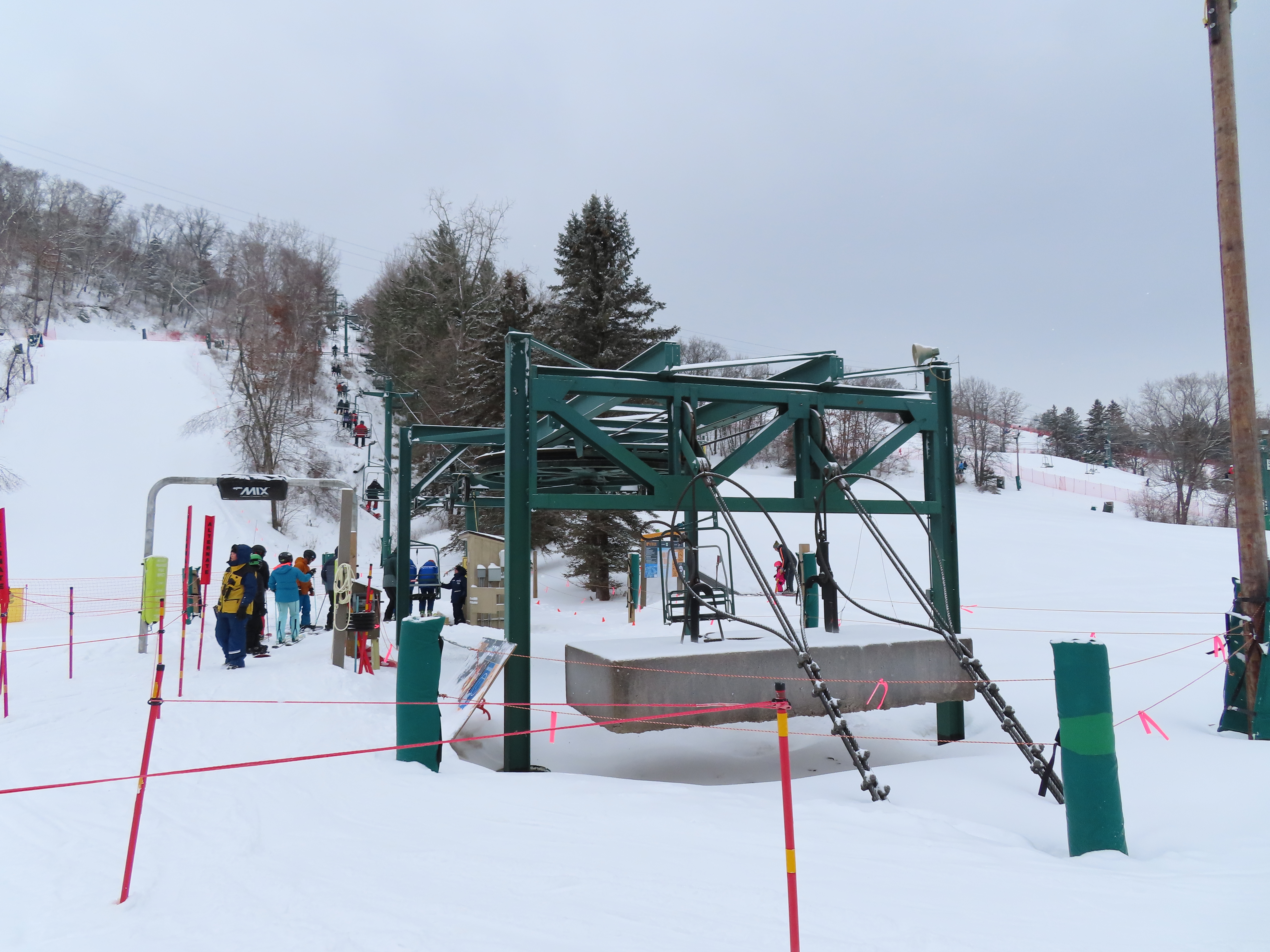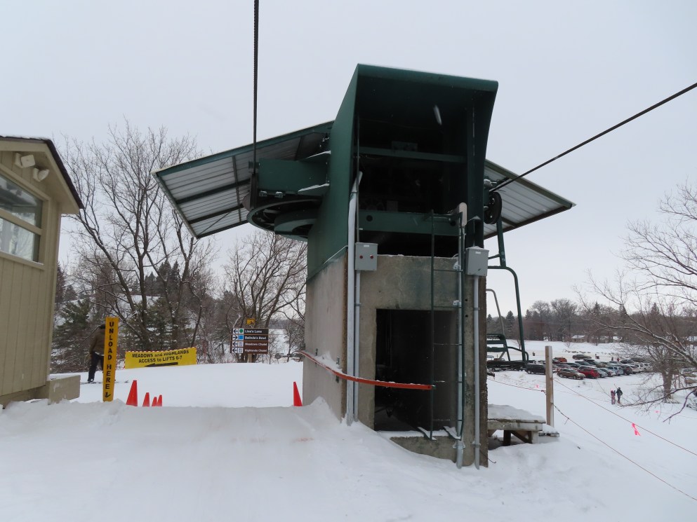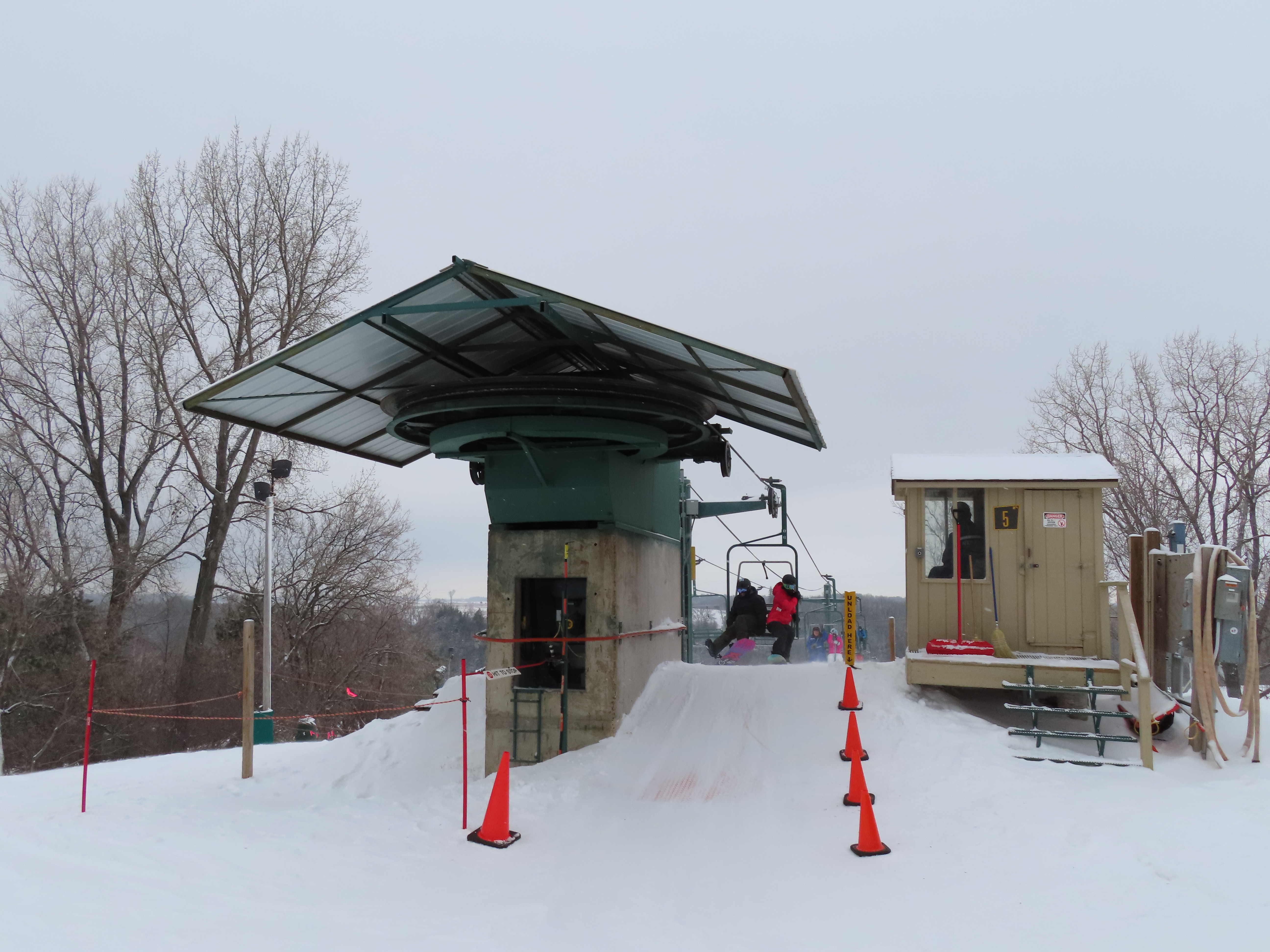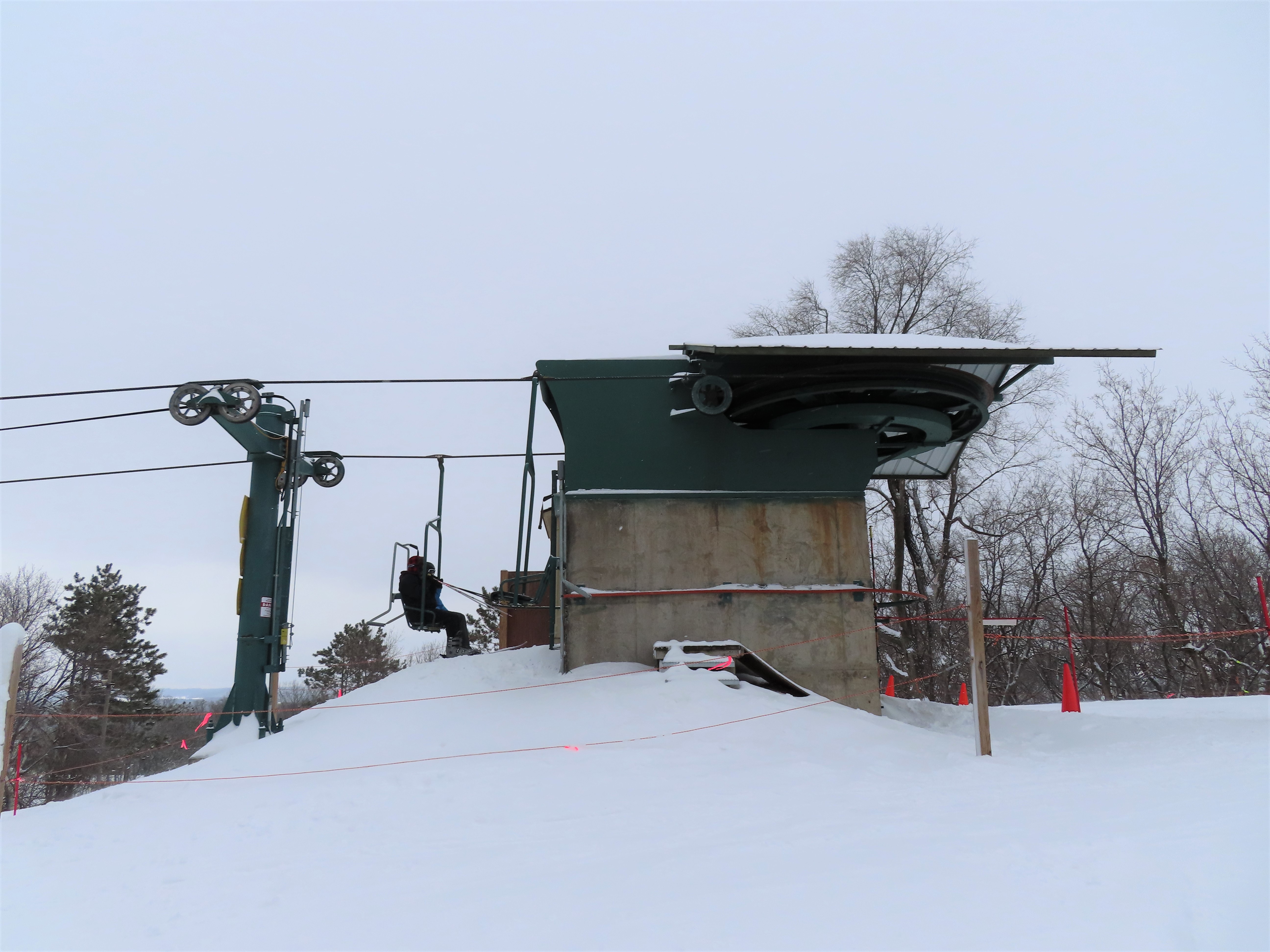 This lift is one of many similar Hall doubles at Afton Alps built in the late ’60s and early 70s.Counterweight for tensioning.Return bullwheel.Loading area.View back down the lift line.Upper part of the line.Arriving at the drive terminal.Unloading ramp.Side view of the top terminal.Lower station seen from above.