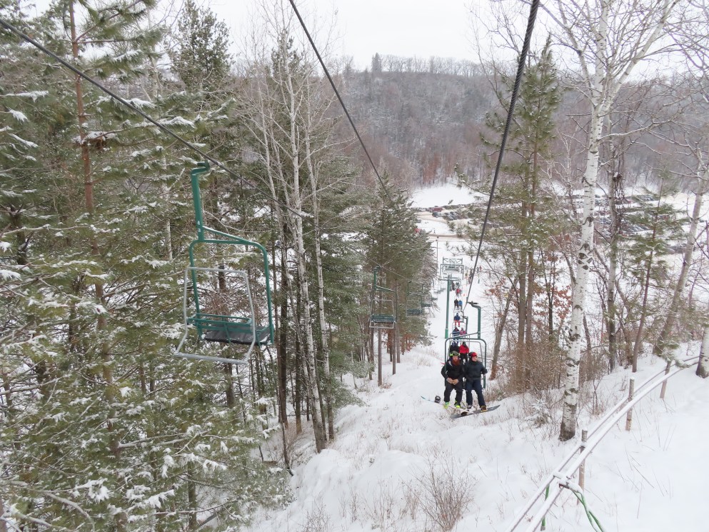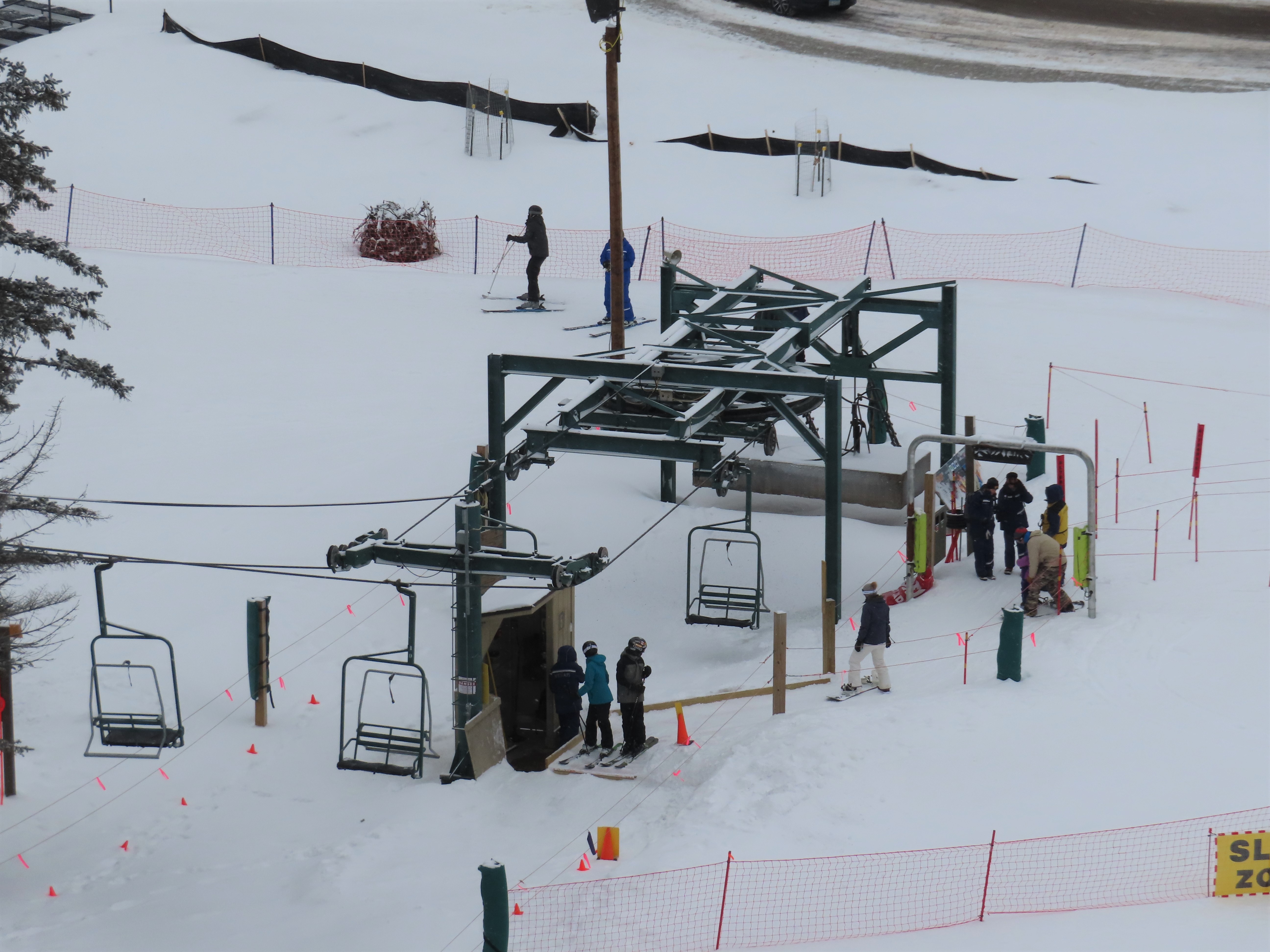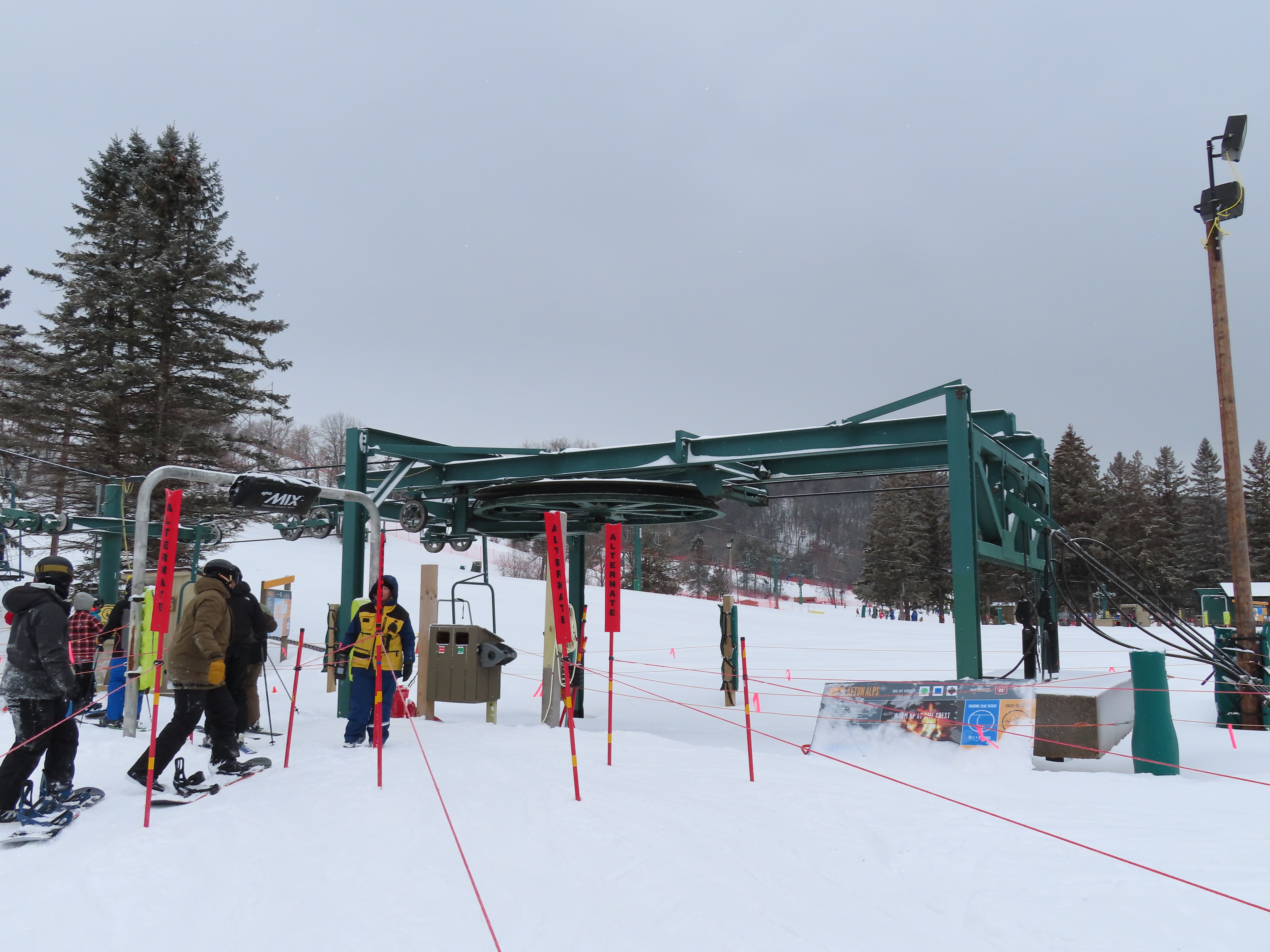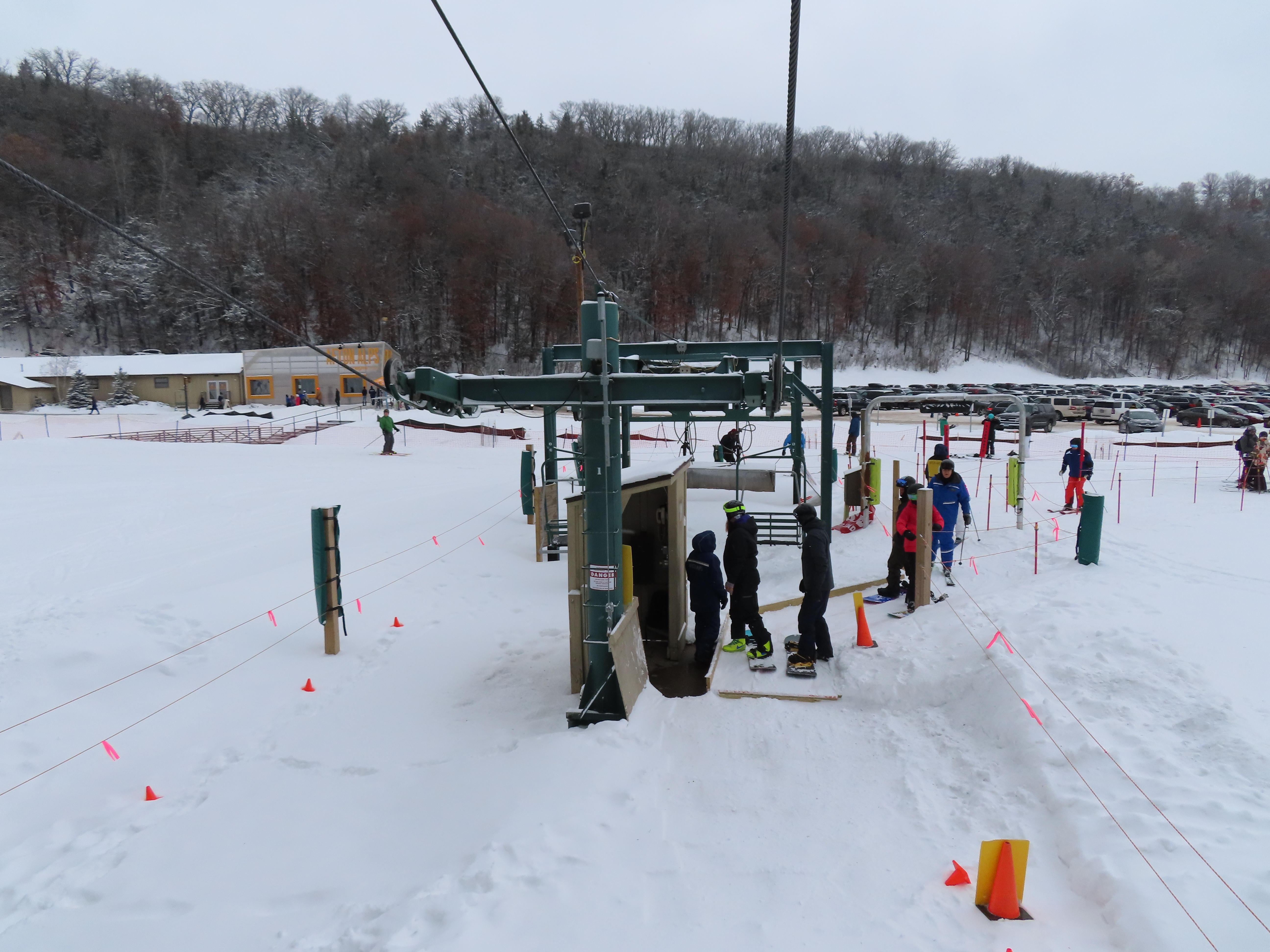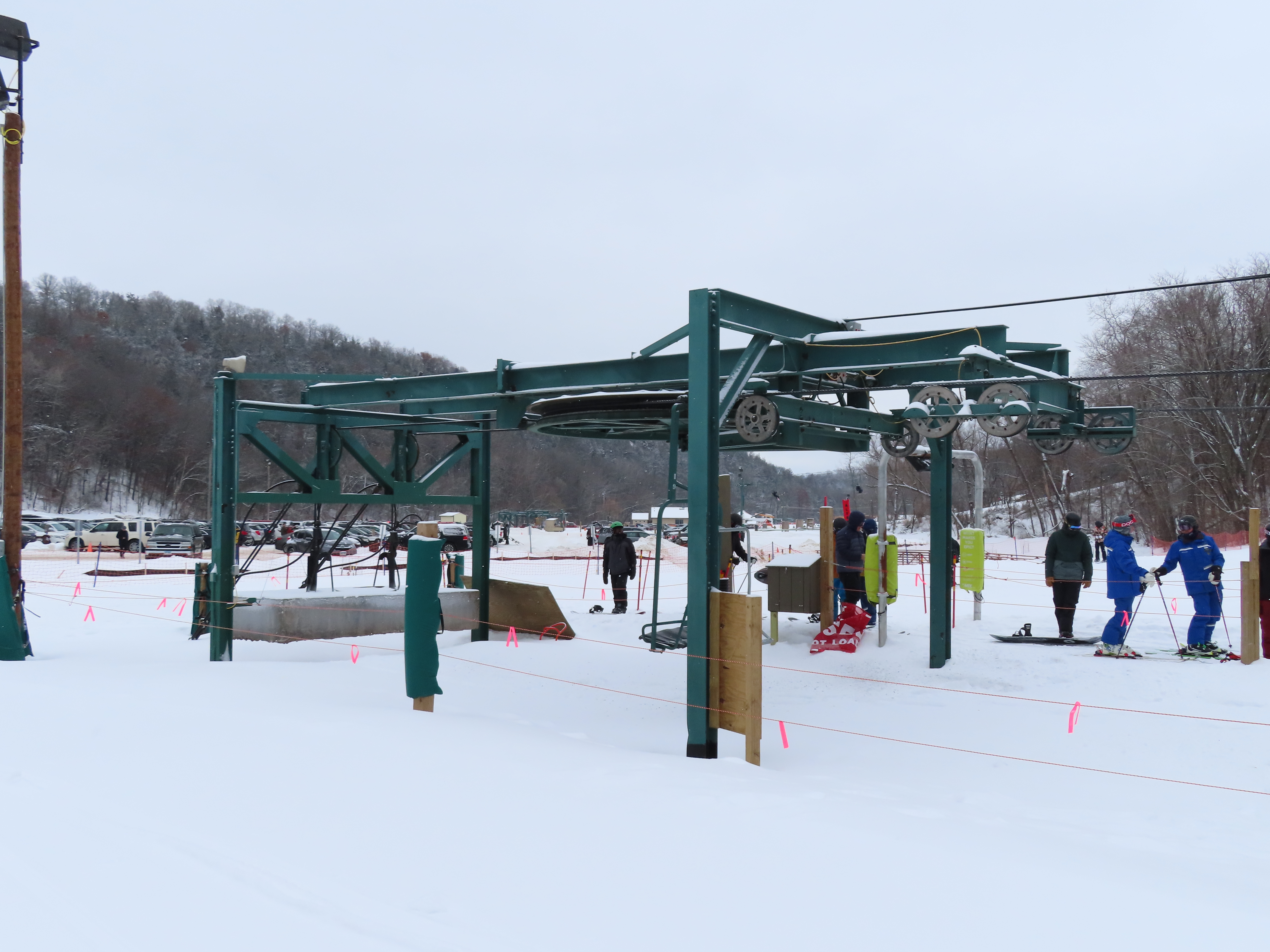 This lift is one of many similar Hall doubles at Afton Alps built in the late ’60s and early 70s.Counterweight for tensioning.Return bullwheel.Loading area.View back down the lift line.Upper part of the line.Arriving at the drive terminal.Unloading ramp.Side view of the top terminal.Lower station seen from above.