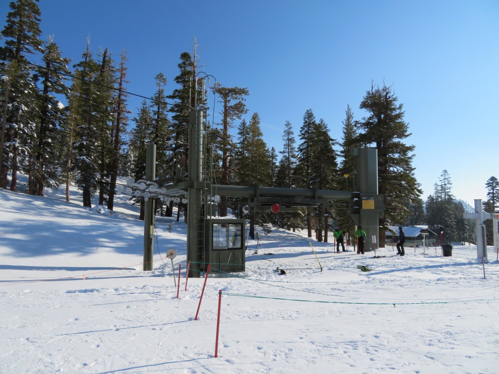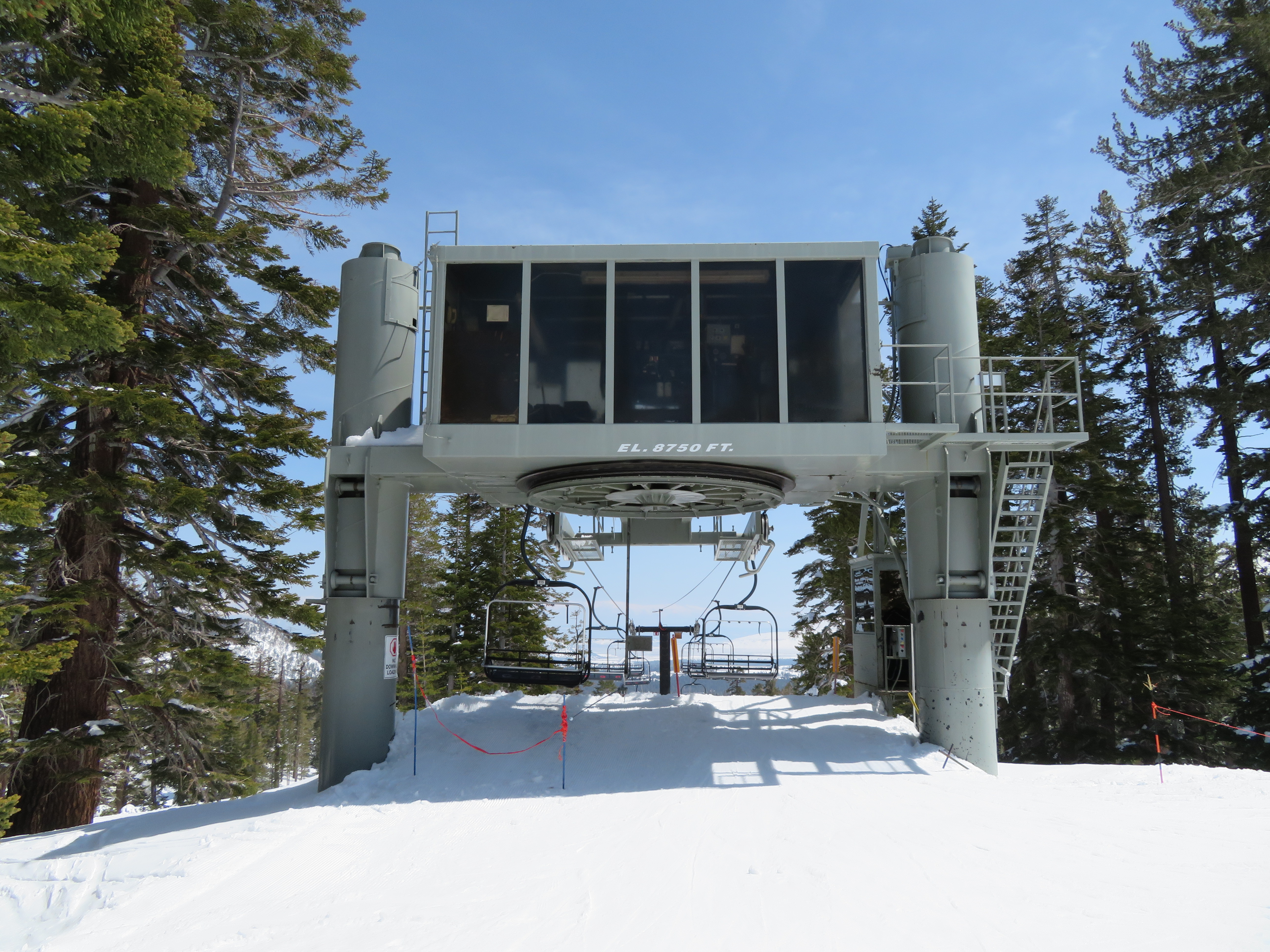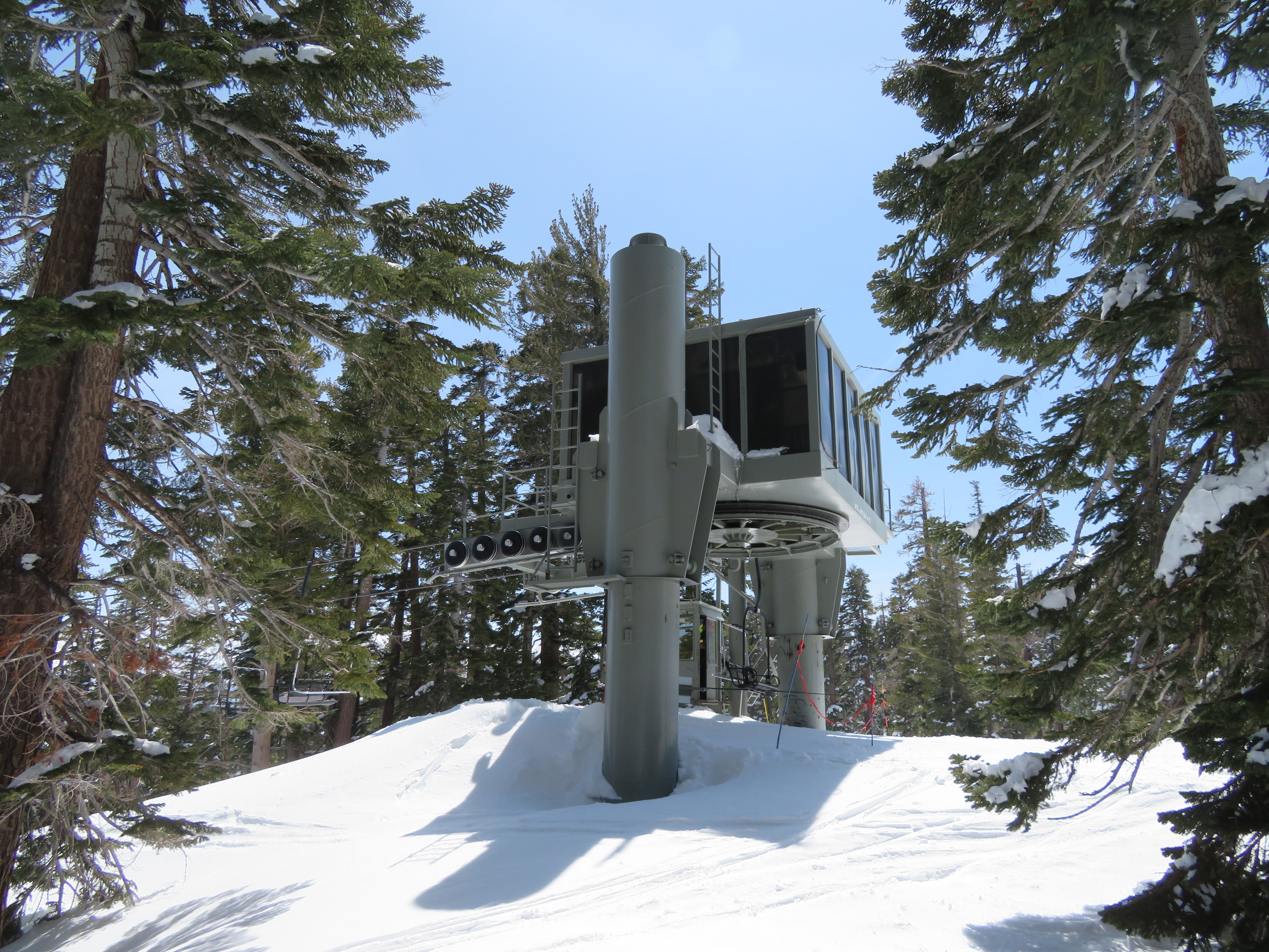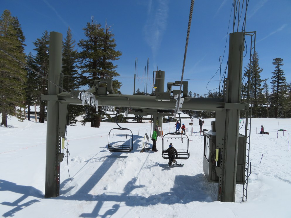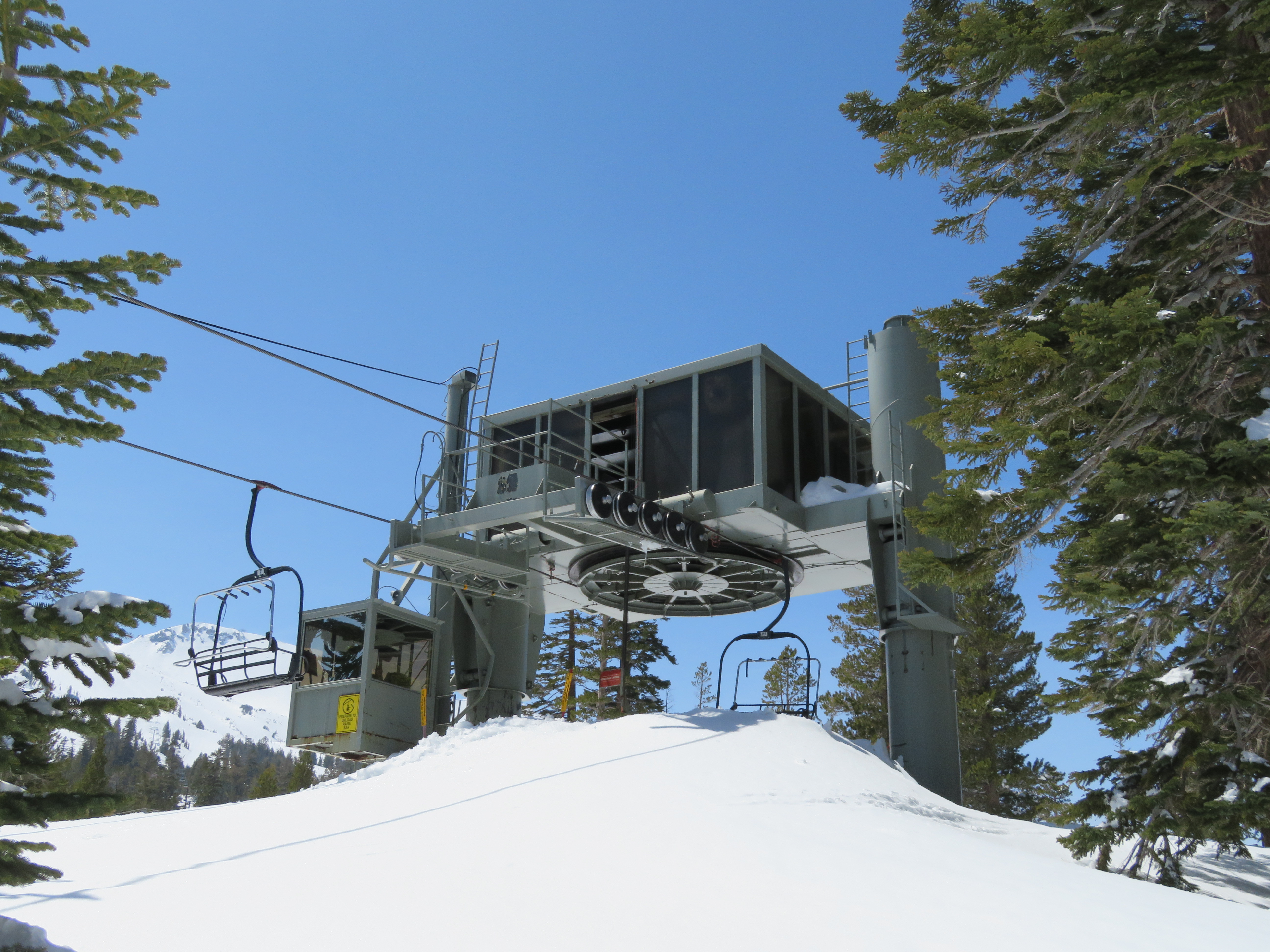 Tri-leg Lift Engineering terminal with height-adjustment.Lower lift line.Return bullwheel and tension carriage.Portal depression sheaves.View back down the line.Empty line.Top drive station.Another view of the drive.Motor room and drive bullwheel.Another lift line view.Looking up the line.Yan chairs with Doppelmayr restraining bars.