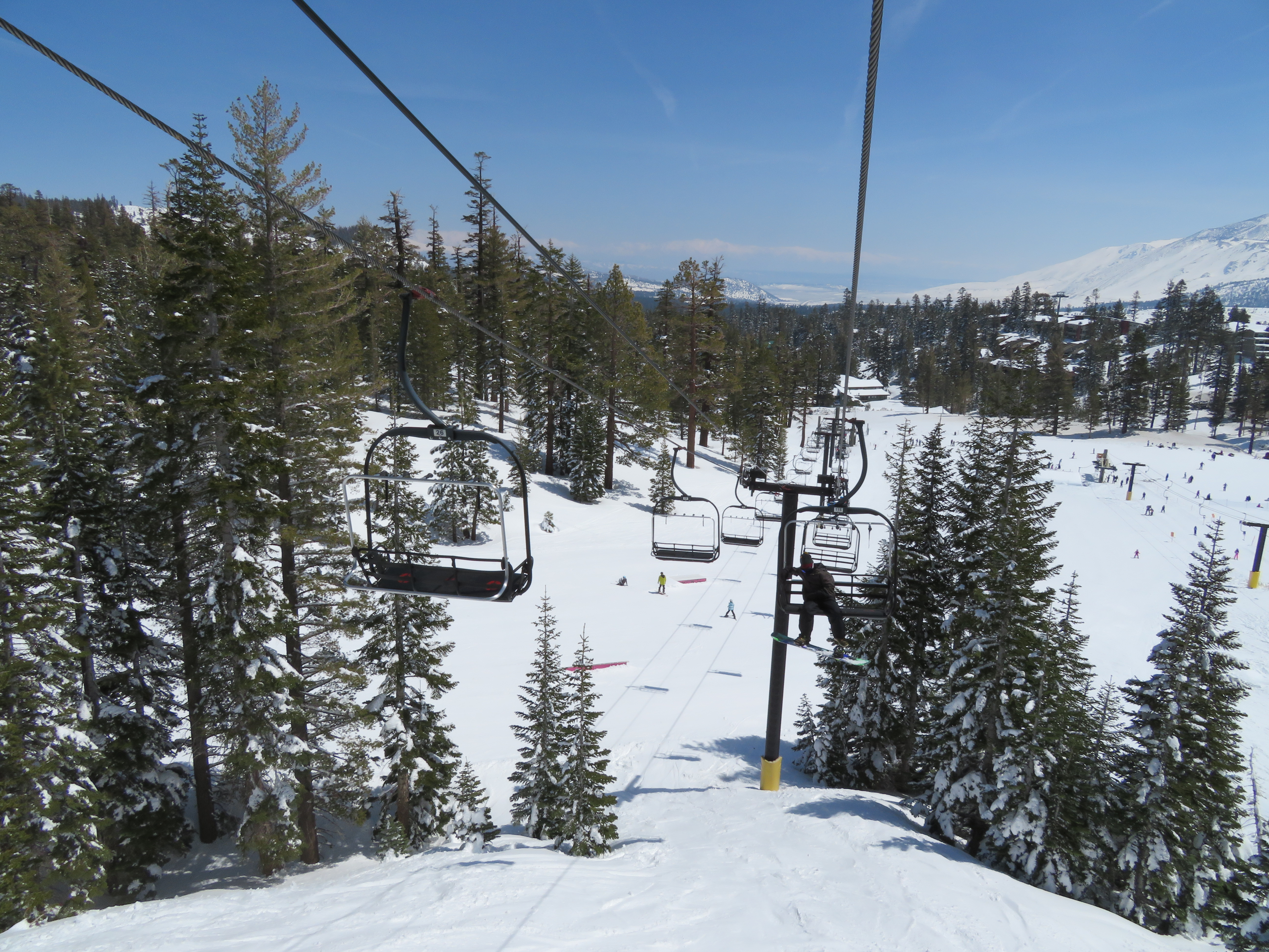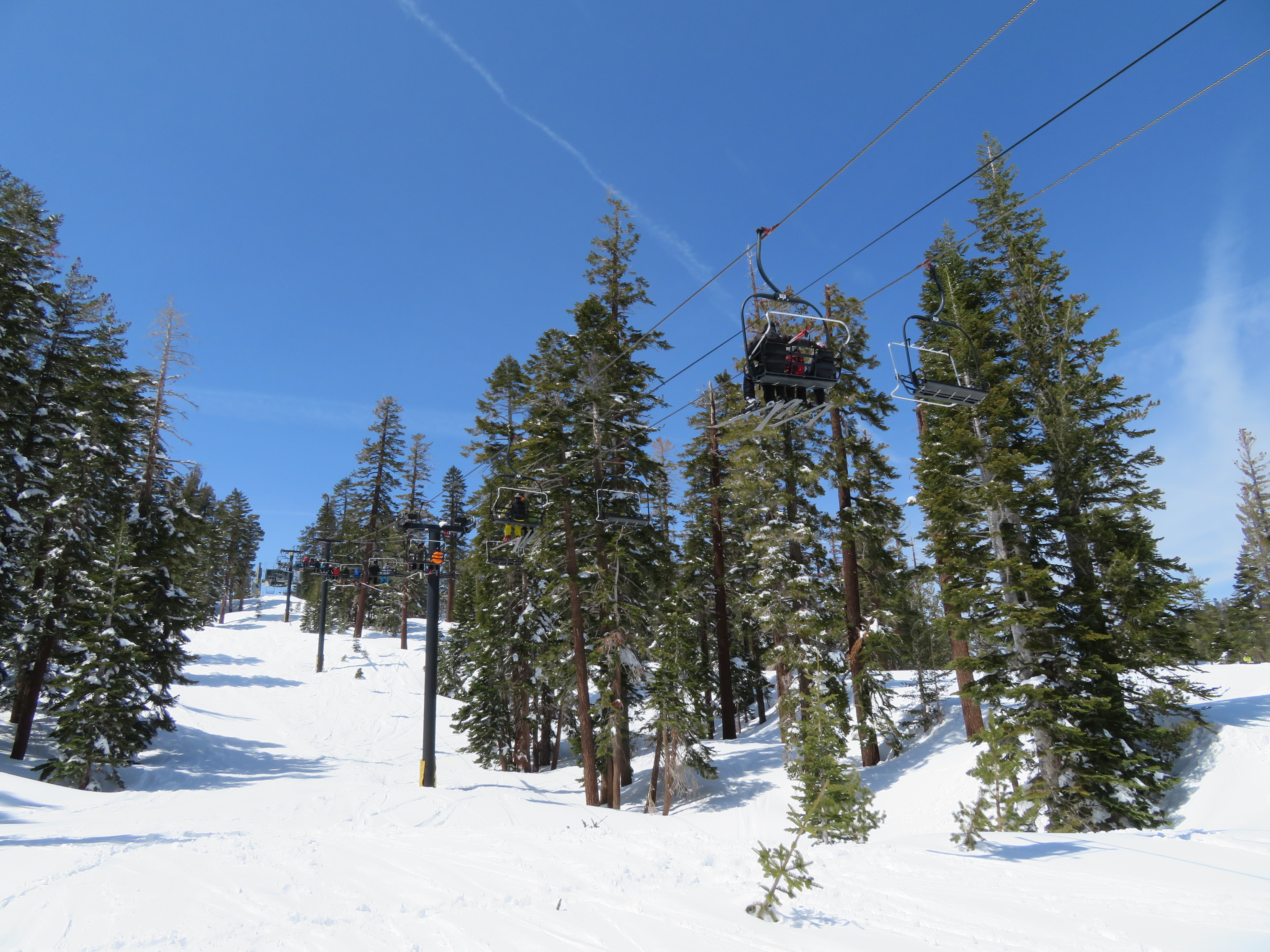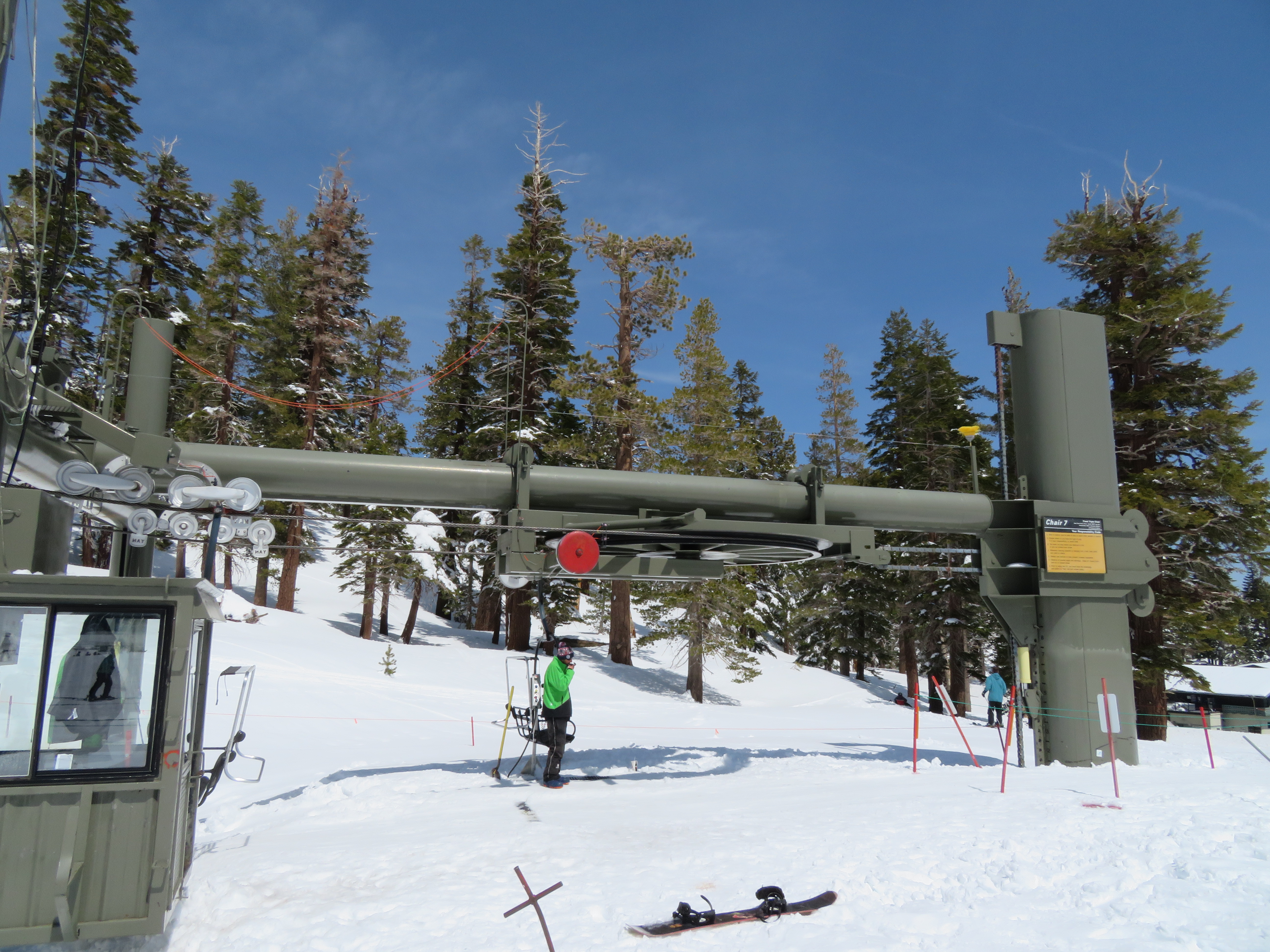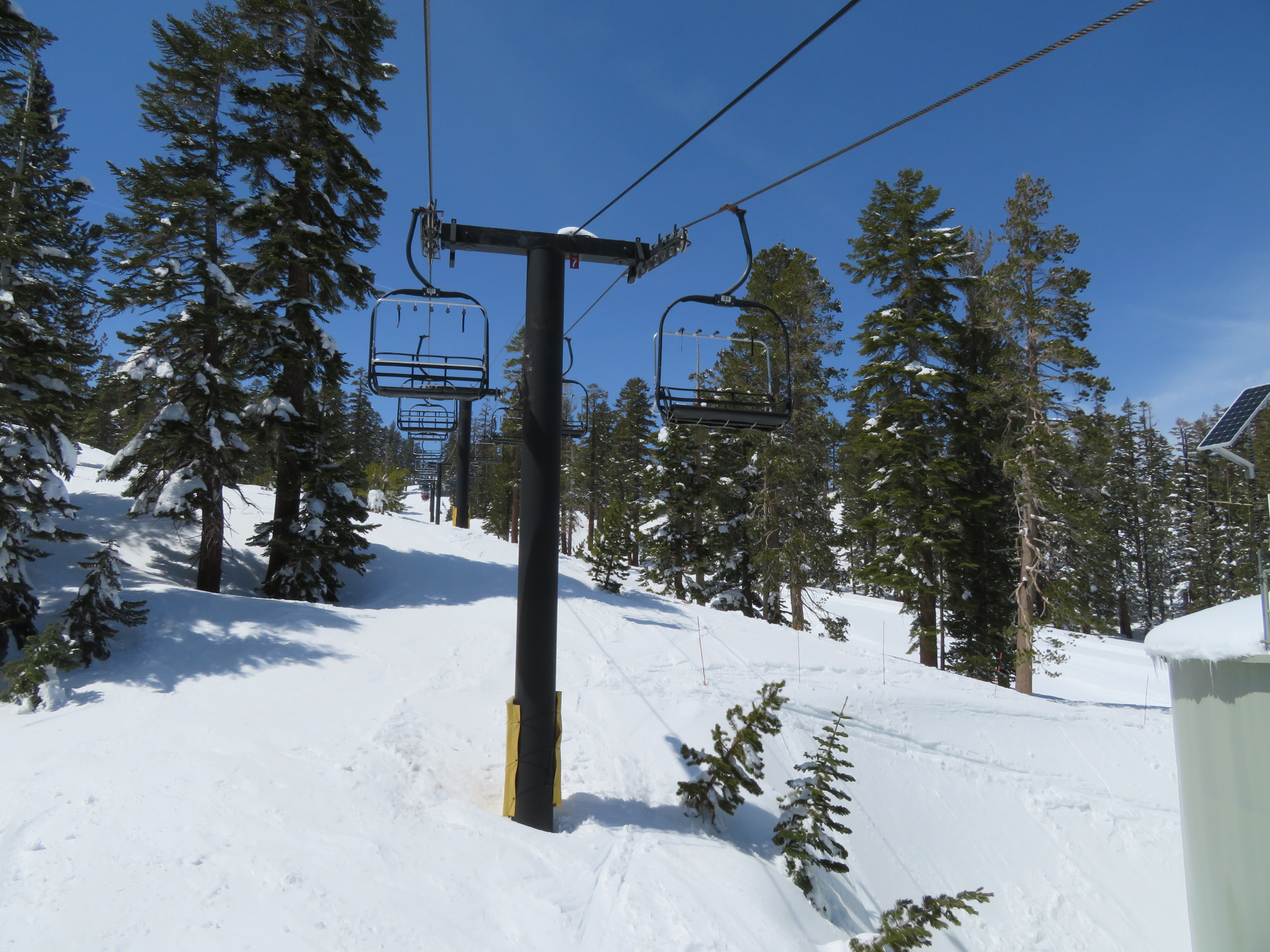 Tri-leg Lift Engineering terminal with height-adjustment.Lower lift line.Return bullwheel and tension carriage.Portal depression sheaves.View back down the line.Empty line.Top drive station.Another view of the drive.Motor room and drive bullwheel.Another lift line view.Looking up the line.Yan chairs with Doppelmayr restraining bars.