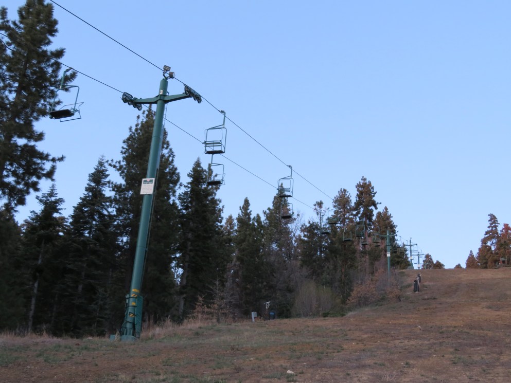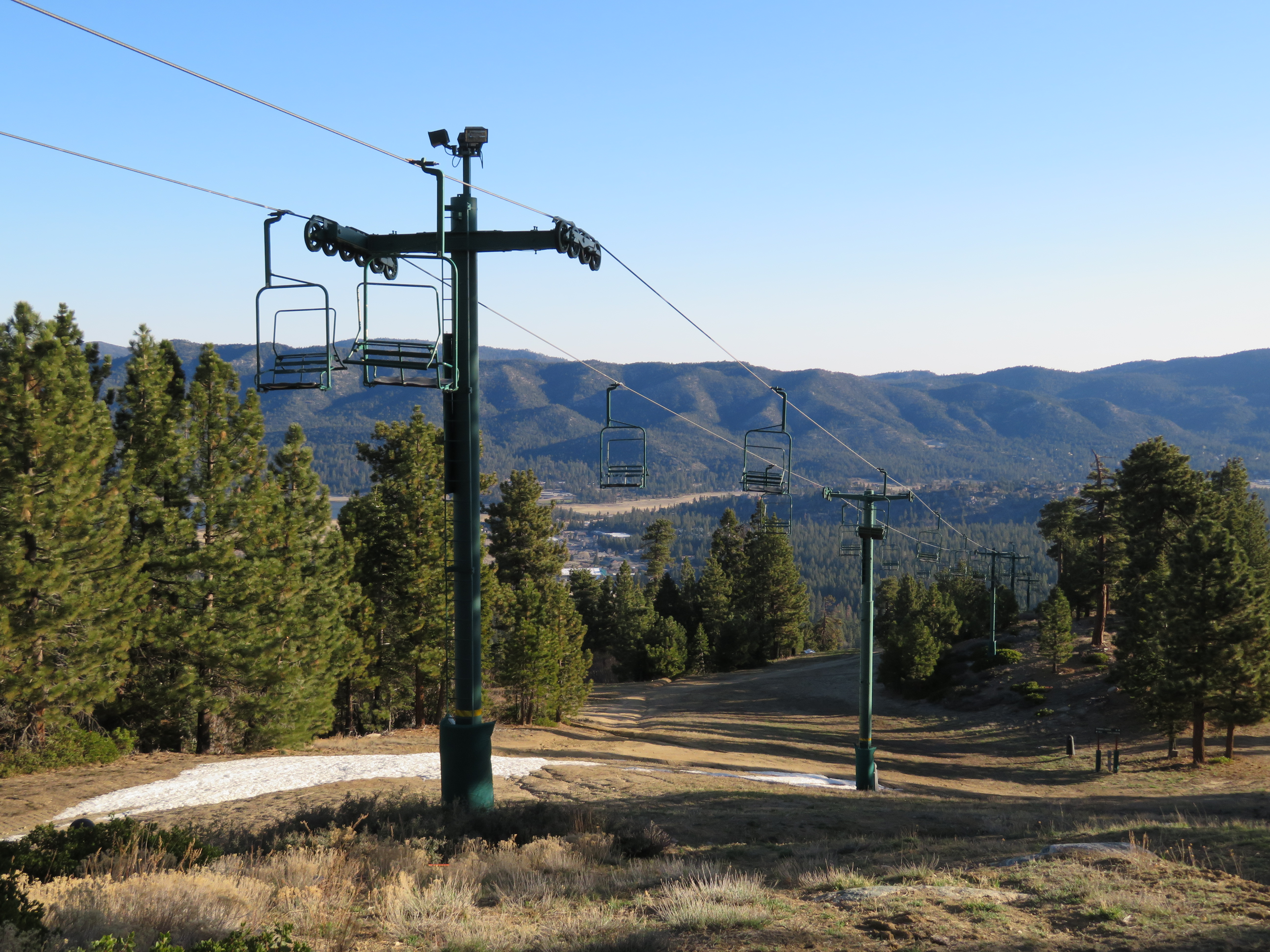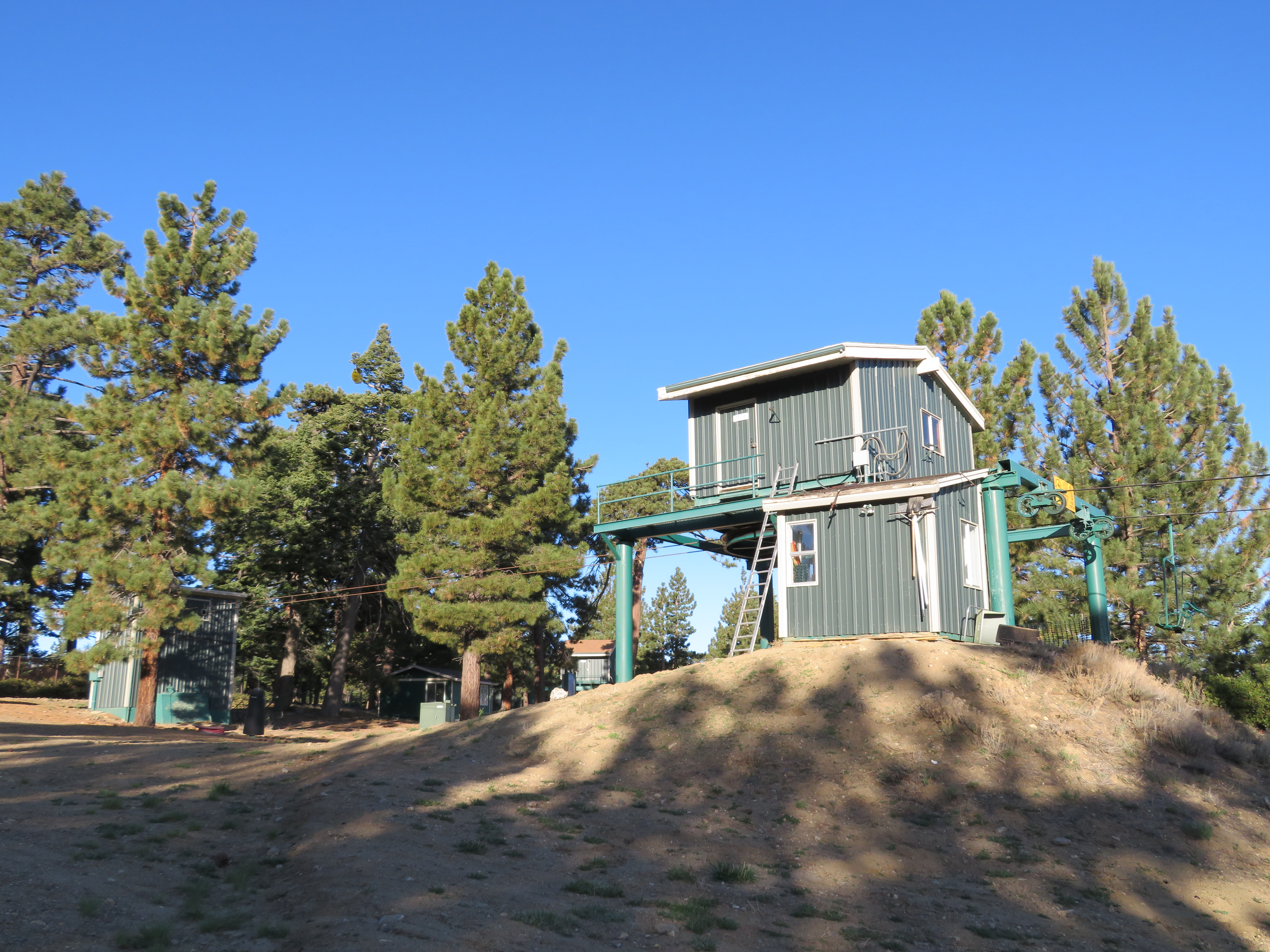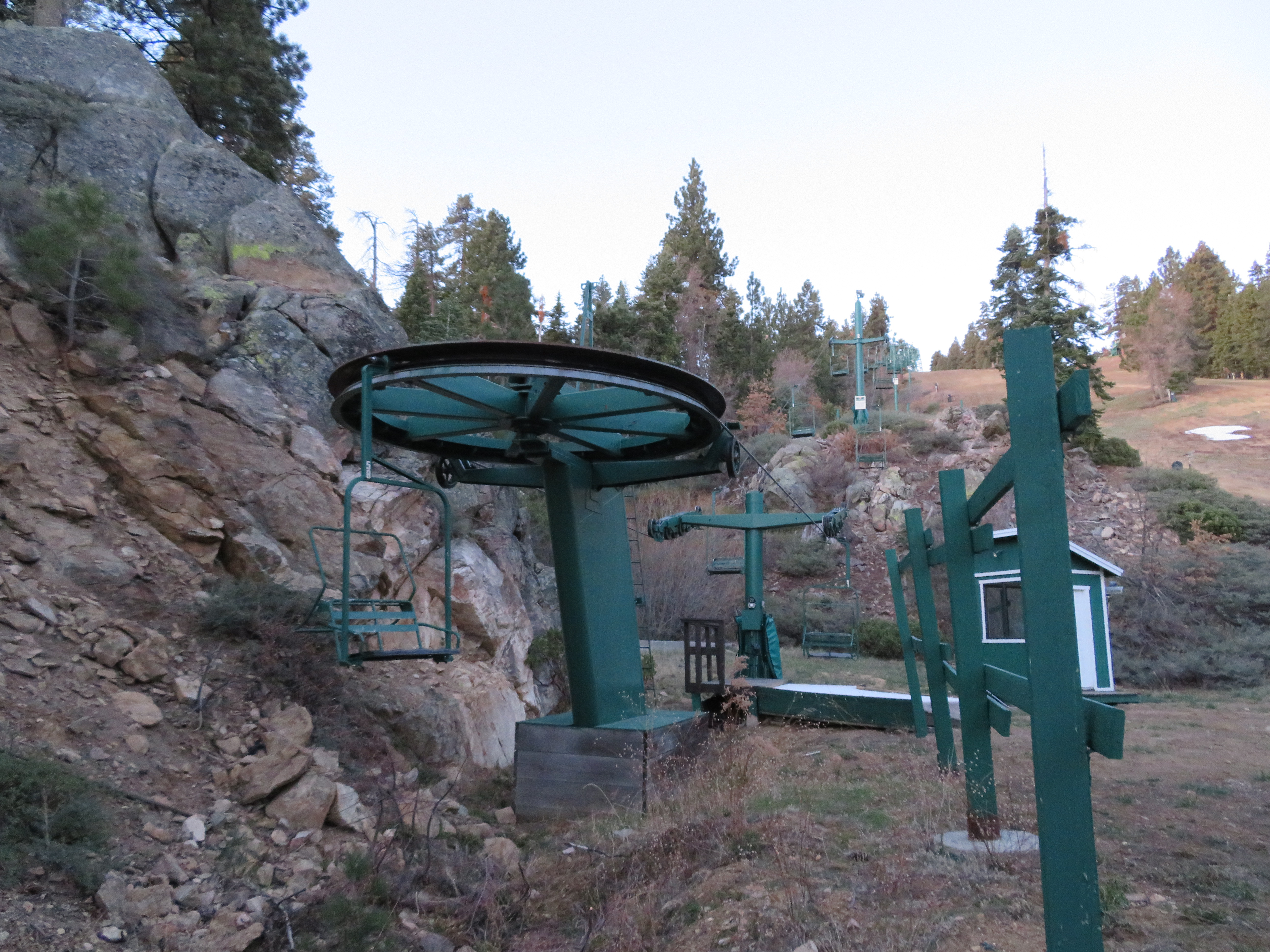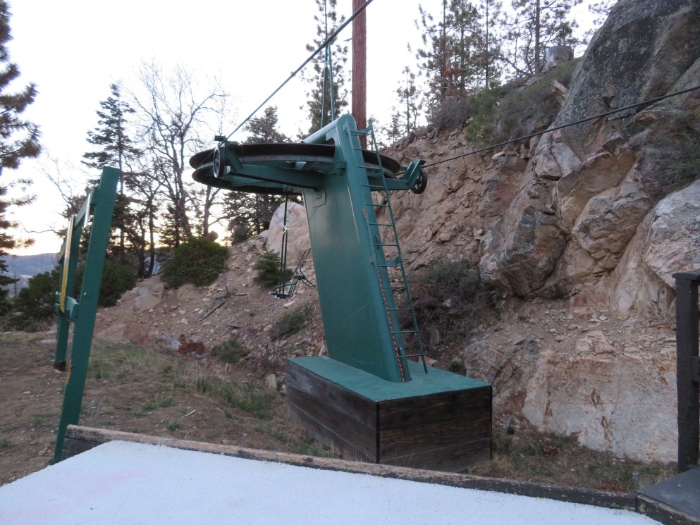 This lift was relocated with some CTEC towers added.Top drive/tension station.View down the upper lift line.Top terminal with counterweight way behind.Fixed bottom bullwheel behind the load point.Lower part of the line.View down the lift.Middle section of the line.