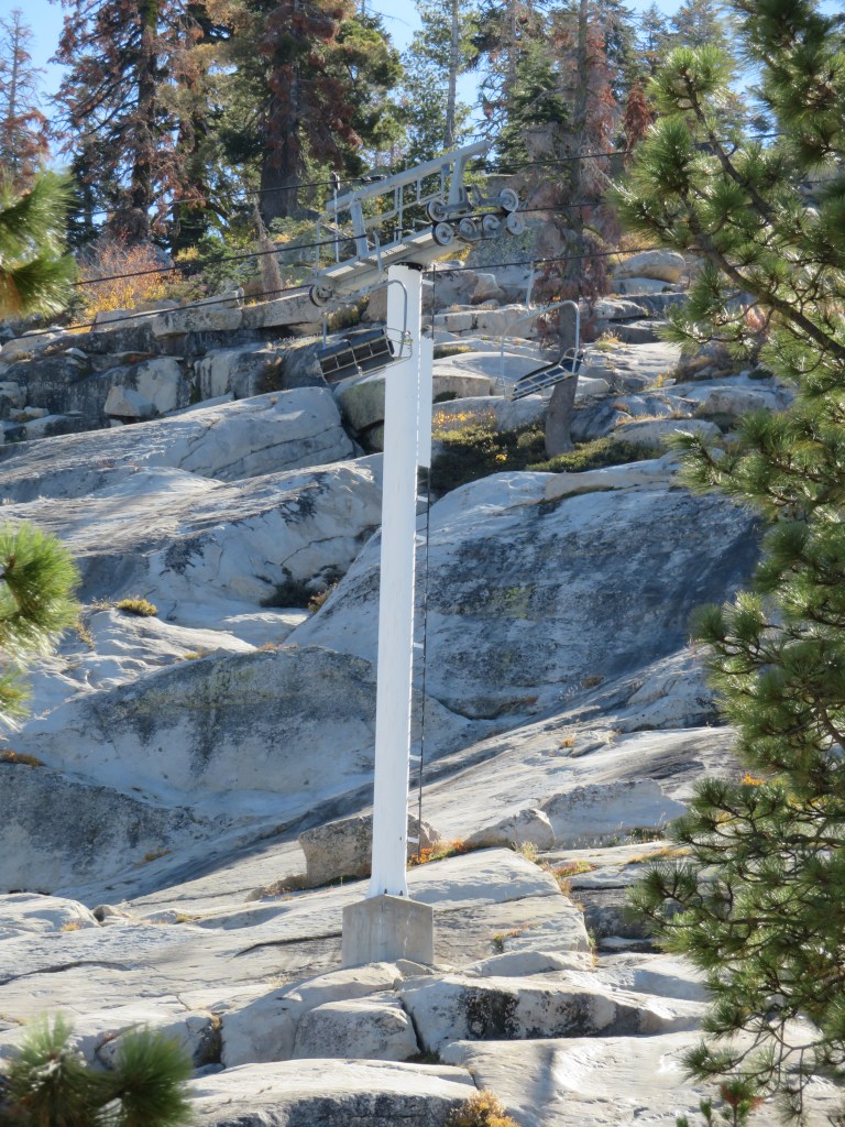 Chair 8 opened a massive expansion at Dodge Ridge in 1998.View down from tower 19.Drive bullwheel.This station design was only used a handful of times by CTEC.Side view of the drive.Upper section of the lift line.The top part of the lift is in the trees, the lower half in a large granite bowl without trees.Some of the towers are anchored into bedrock as there is no soil.The bottom terminal with hydraulic tensioning and solar power.Lower part of the lift line.First few towers.A second CTEC operator house is used for ski patrol and storage.Loading area and operator house.Garaventa CTEC controls.