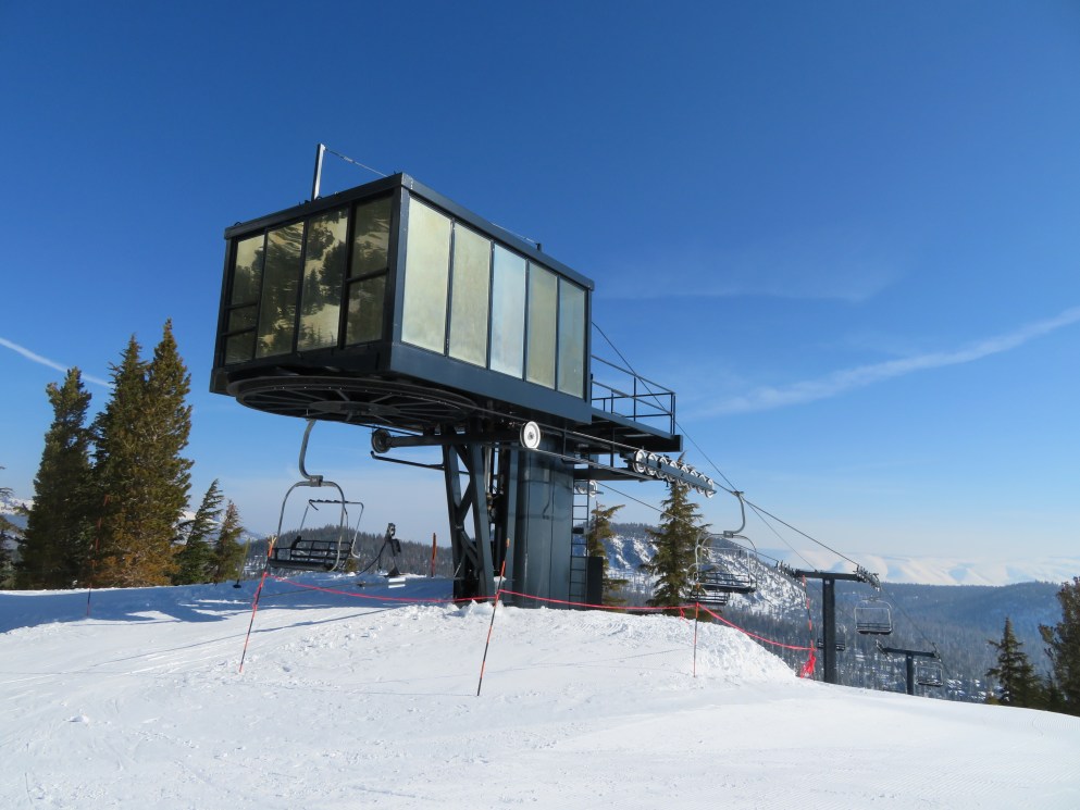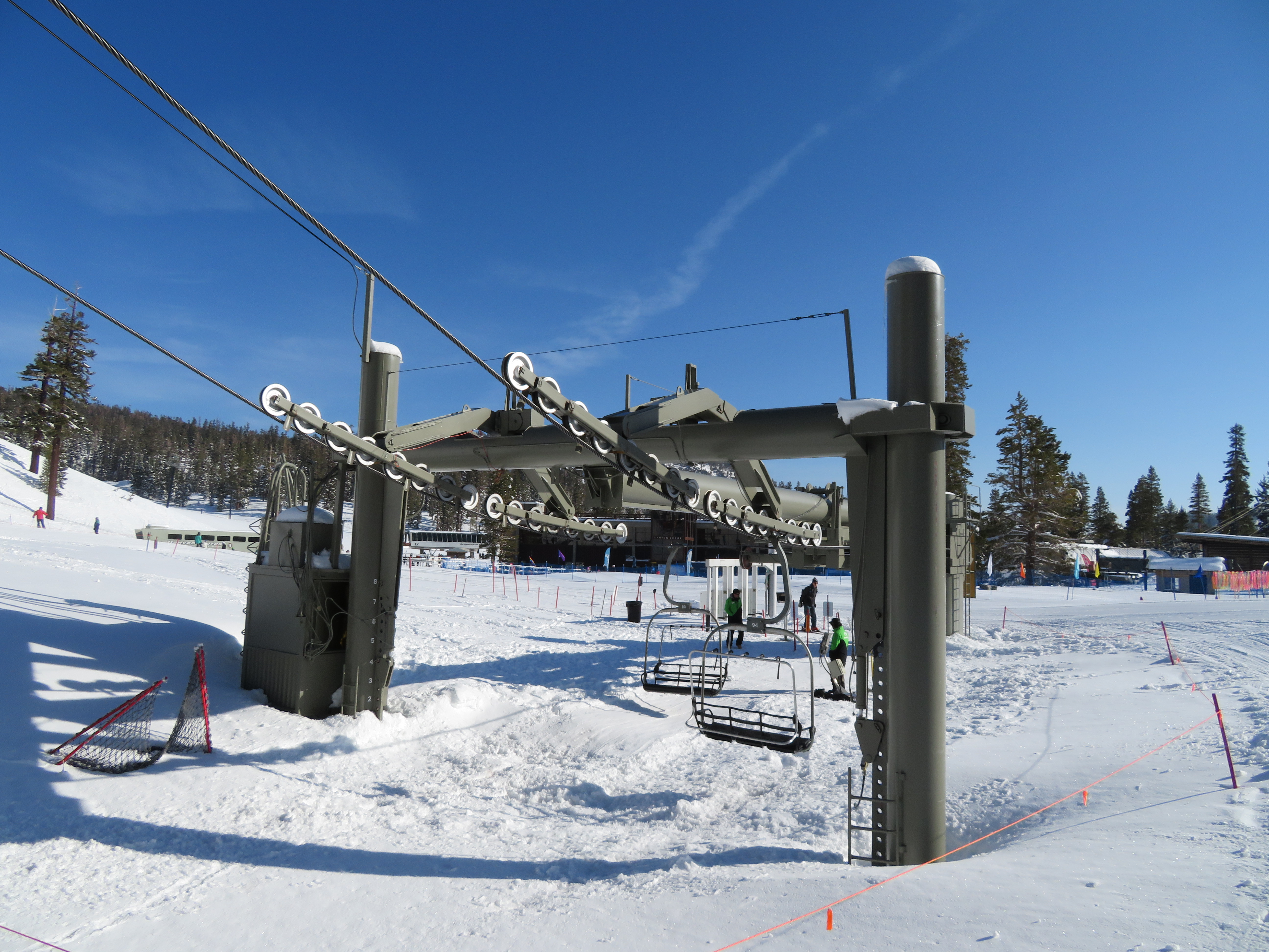 Lower station next to Canyon Lodge.Yan tension terminal.Portal sheaves.Leaving the base.Riding up the line.View back down.Fixed drive terminal up top.The entire lift.Top station overview.Lift line with Yan chairs.First few towers.Tension carriage.