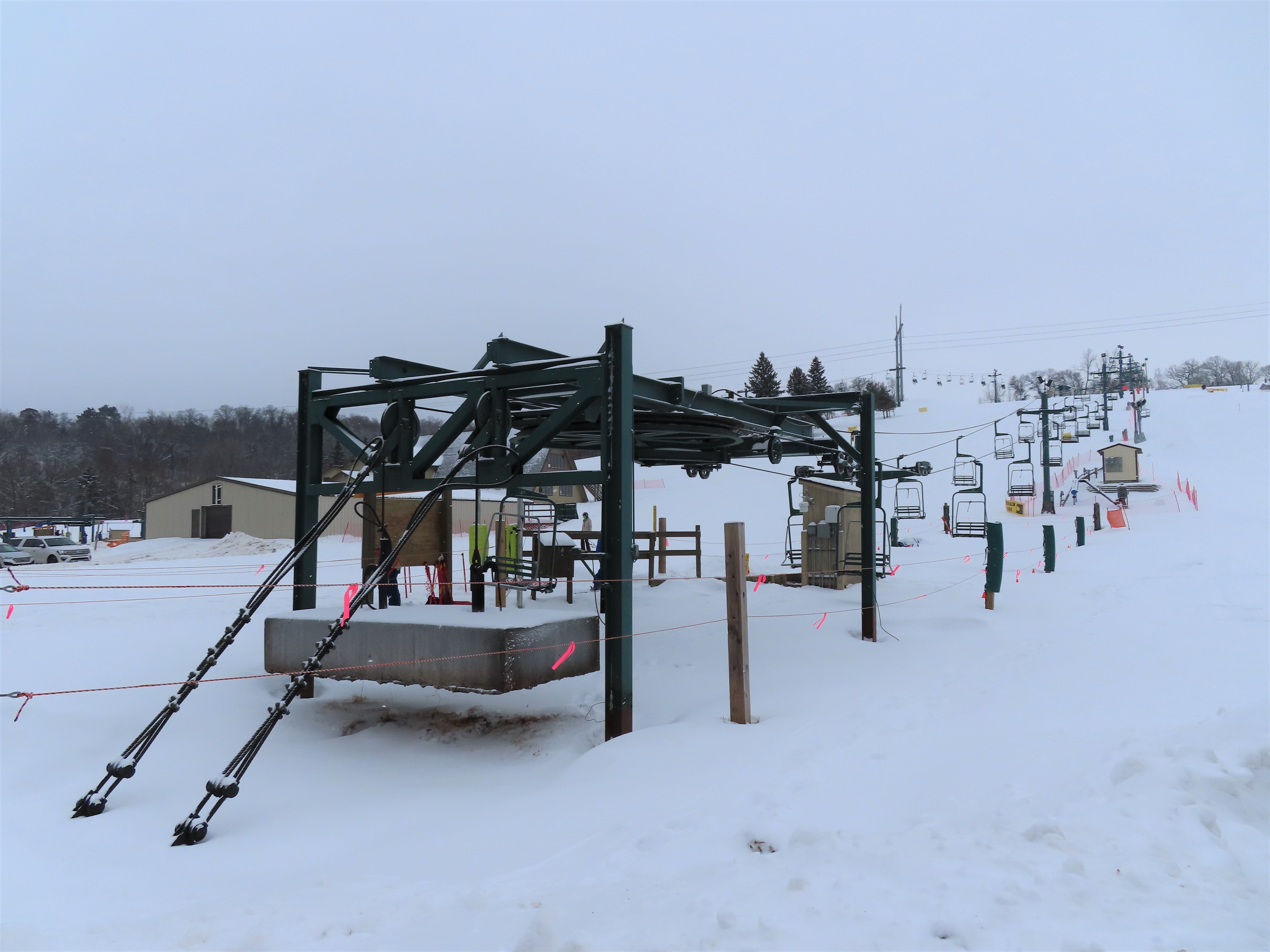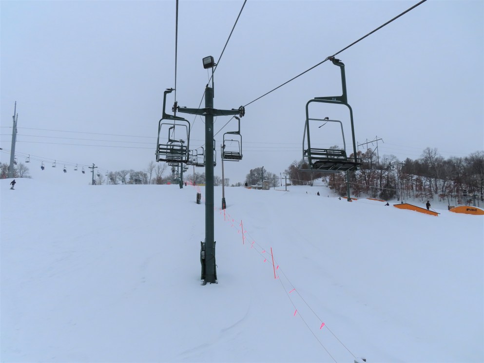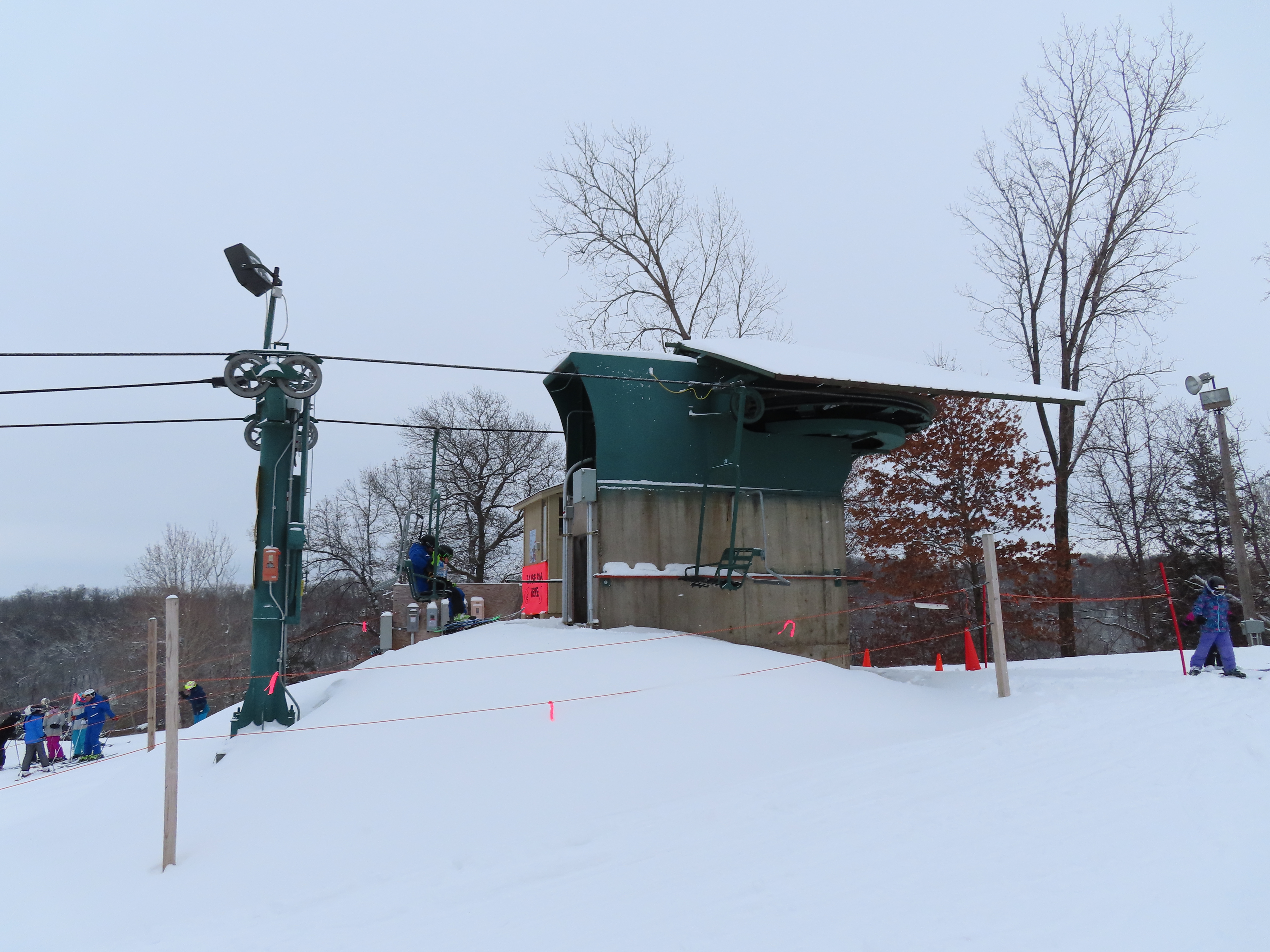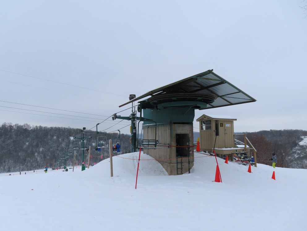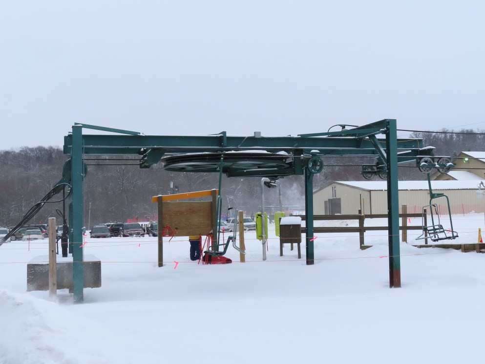 This beginner lift services the center part of the mountain.Side view of the top terminal.View down the lift line, which crosses under high voltage power lines.Middle lift line.Lower part of the line.Side look at the bottom station.Tensioning and lift line.Another view of the return station.Riding up.Looking back down the line.