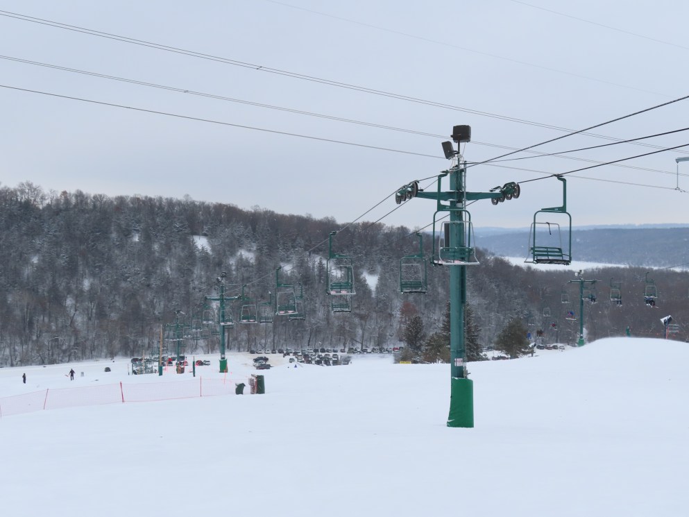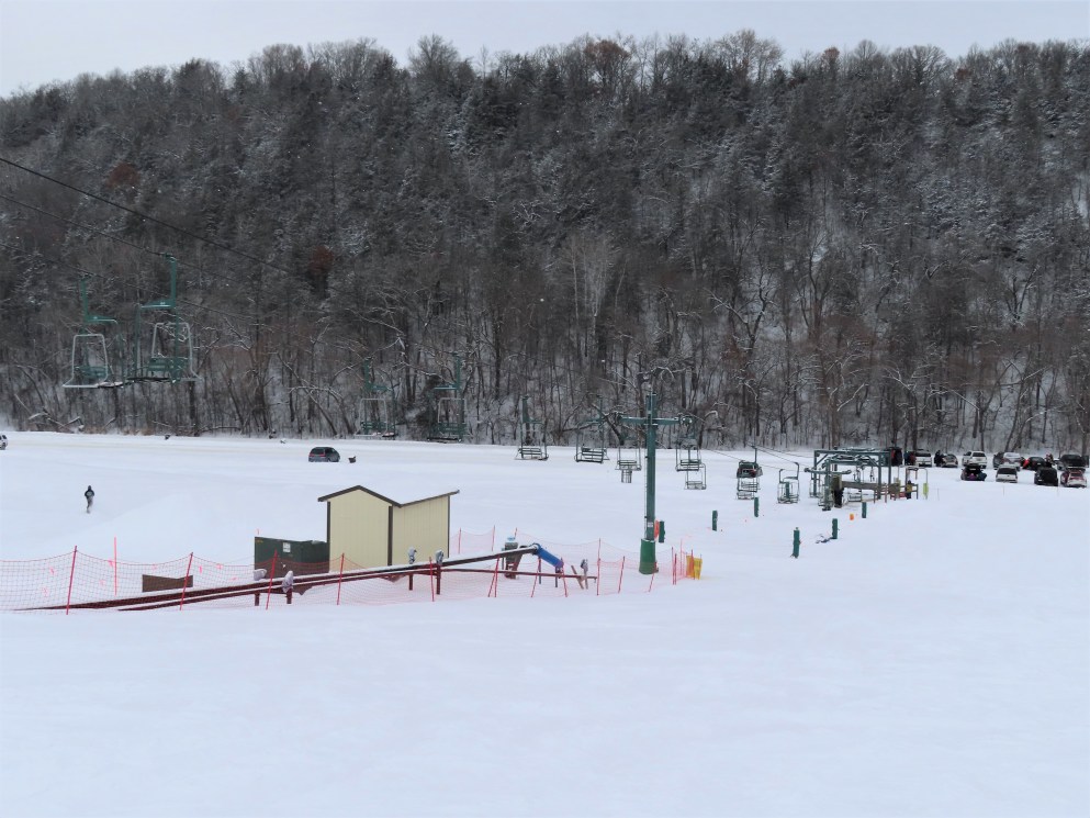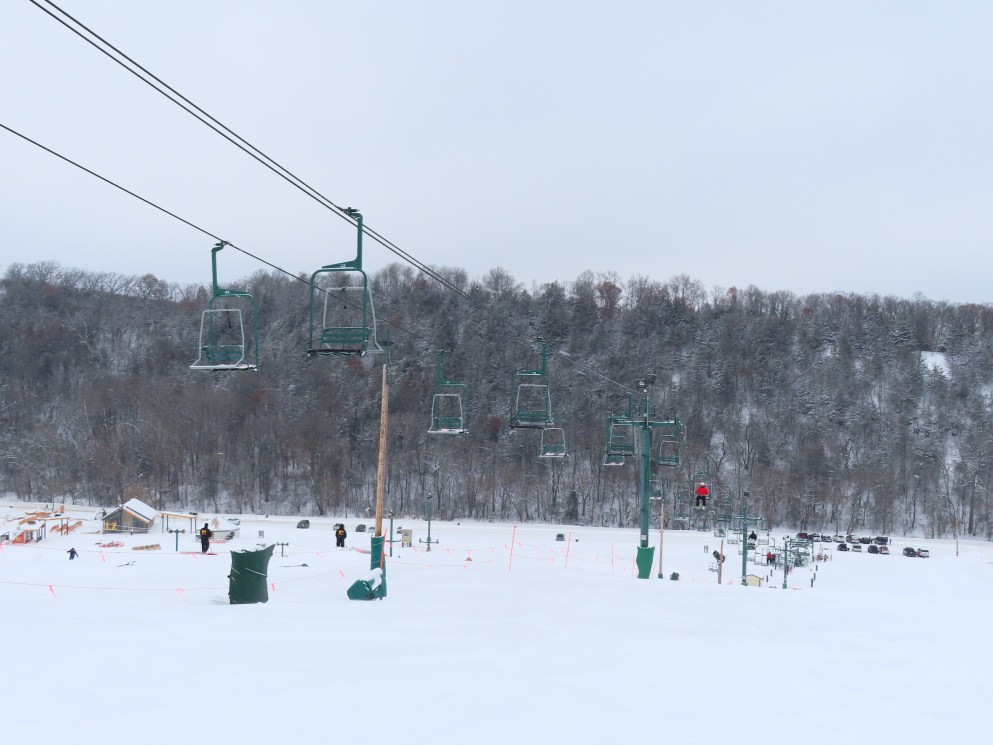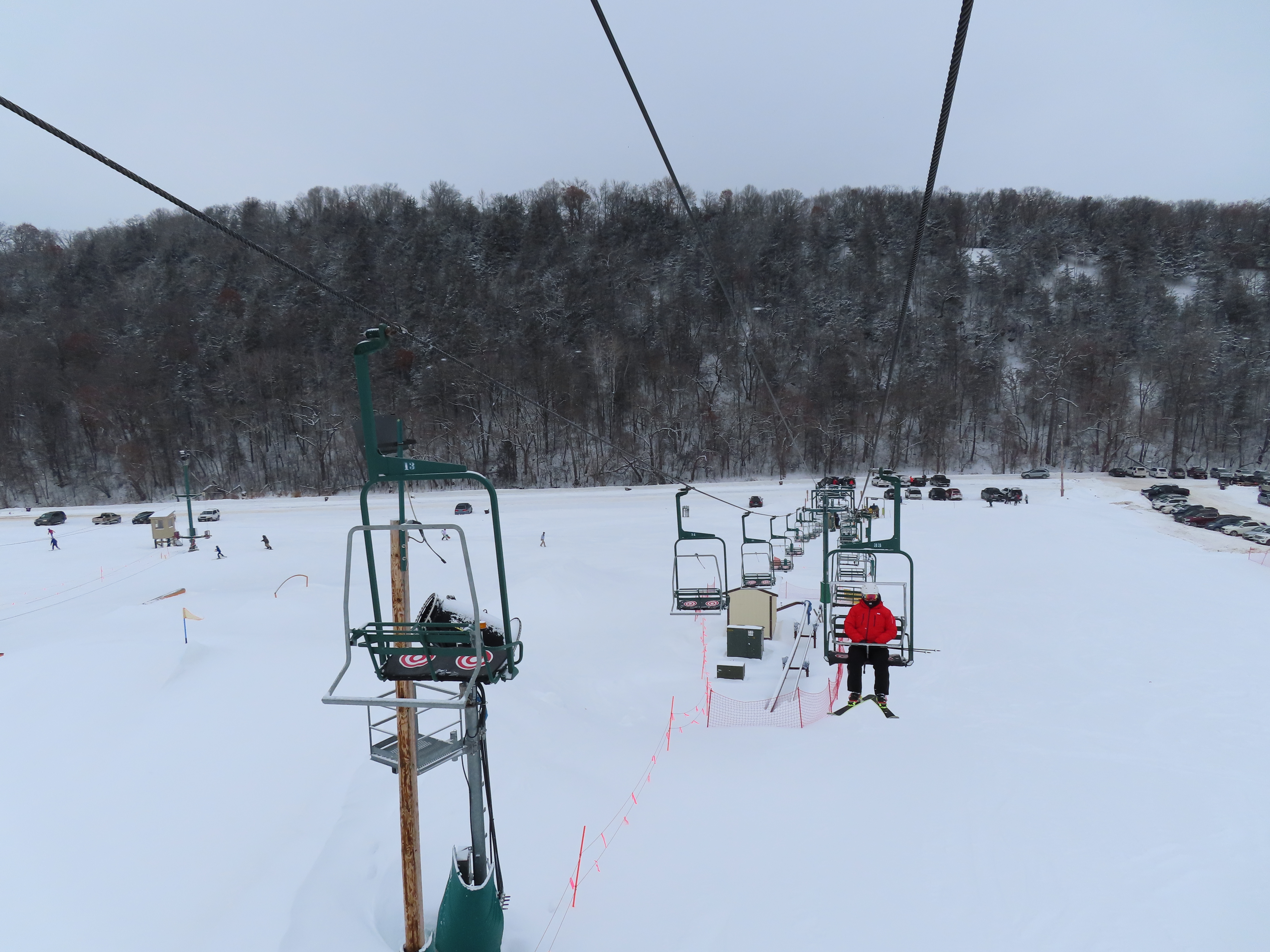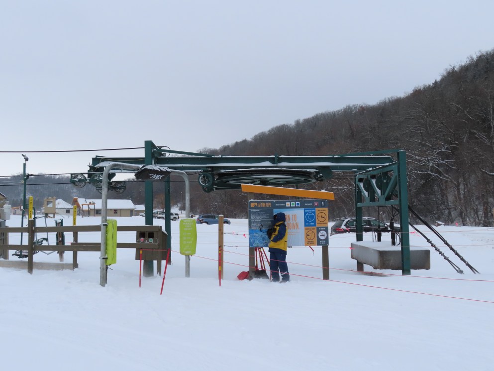 This beginner lift services the center part of the mountain.Side view of the top terminal.View down the lift line, which crosses under high voltage power lines.Middle lift line.Lower part of the line.Side look at the bottom station.Tensioning and lift line.Another view of the return station.Riding up.Looking back down the line.