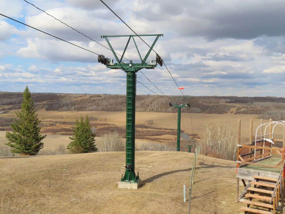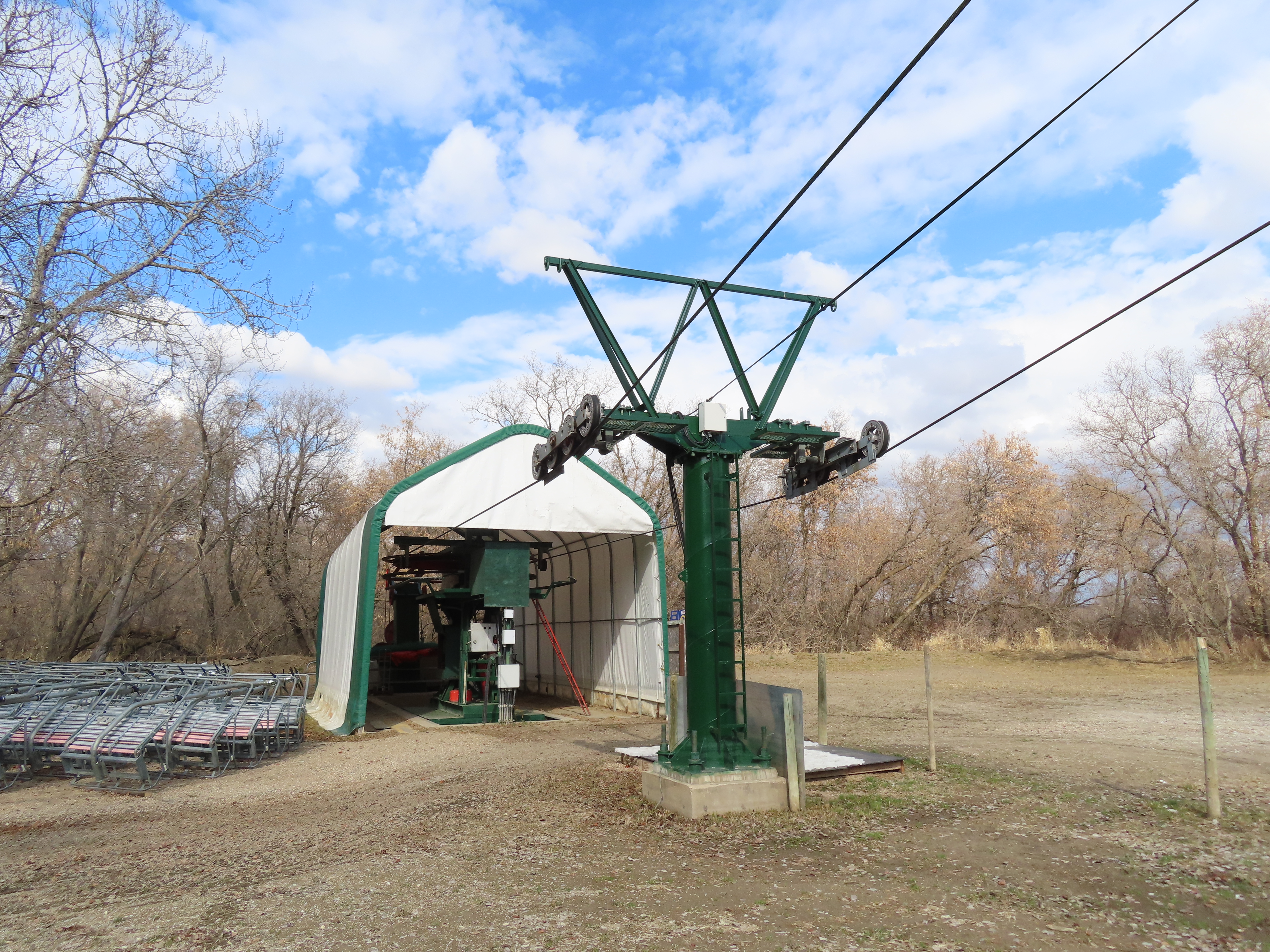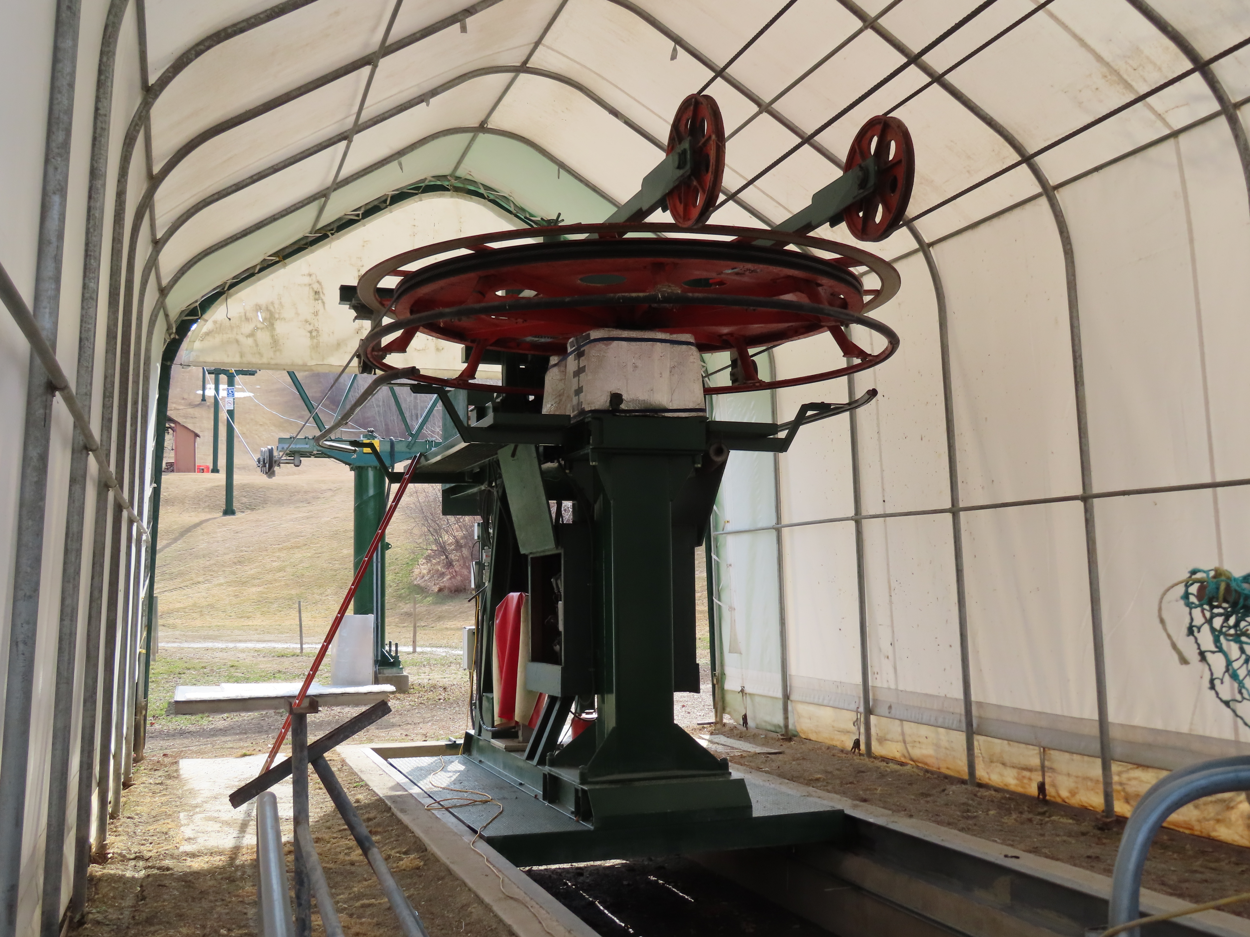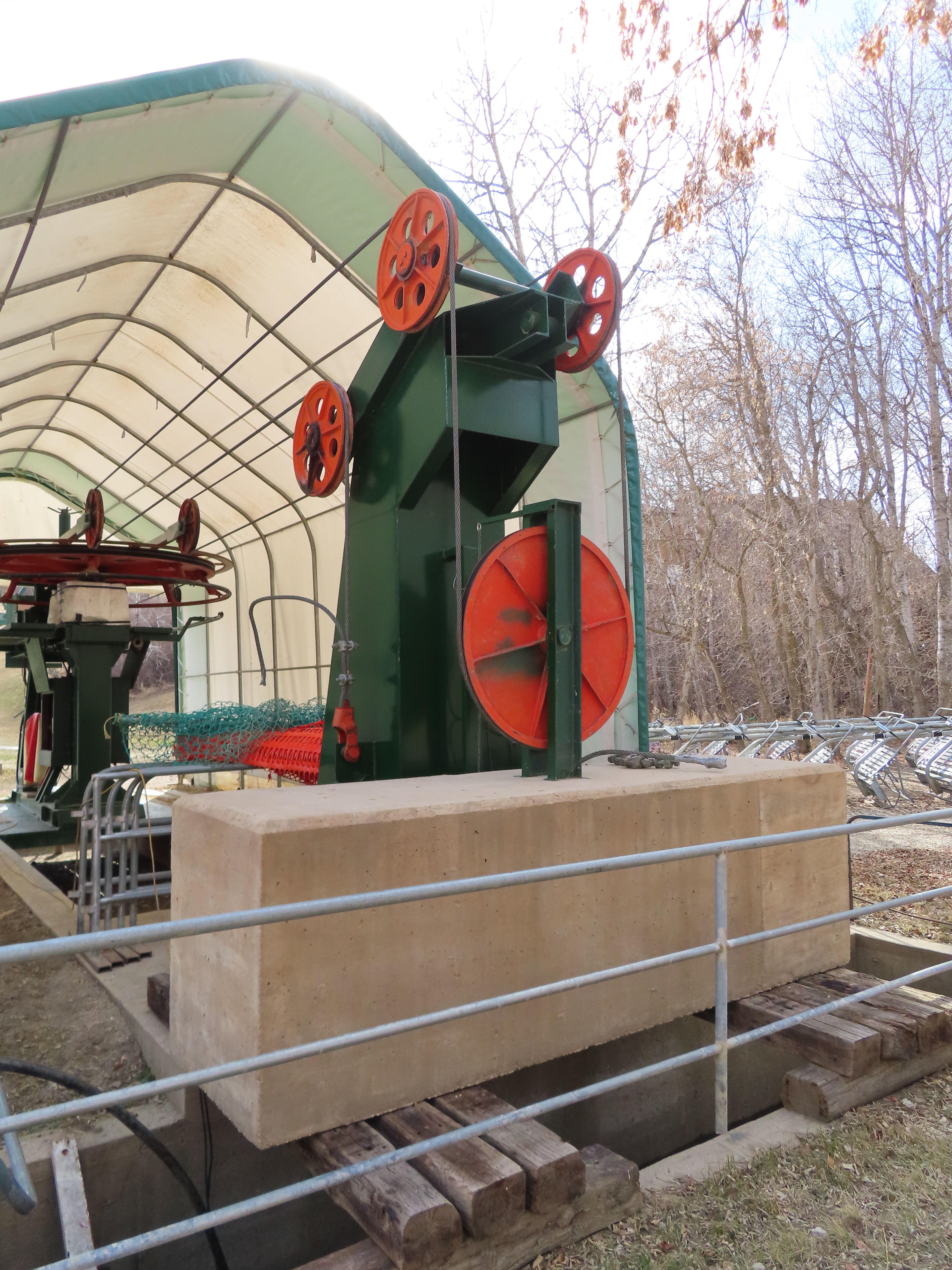 This relocated center pole double replaced a T-Bar.Drive station in a tent.Colorful counterweight.Drive station with tensioning.Towers with lifting frames. Note the old T-Bar station.Lower lift line.Tower 7.Unloading area.View from the top.Breakover towers and the upper station.