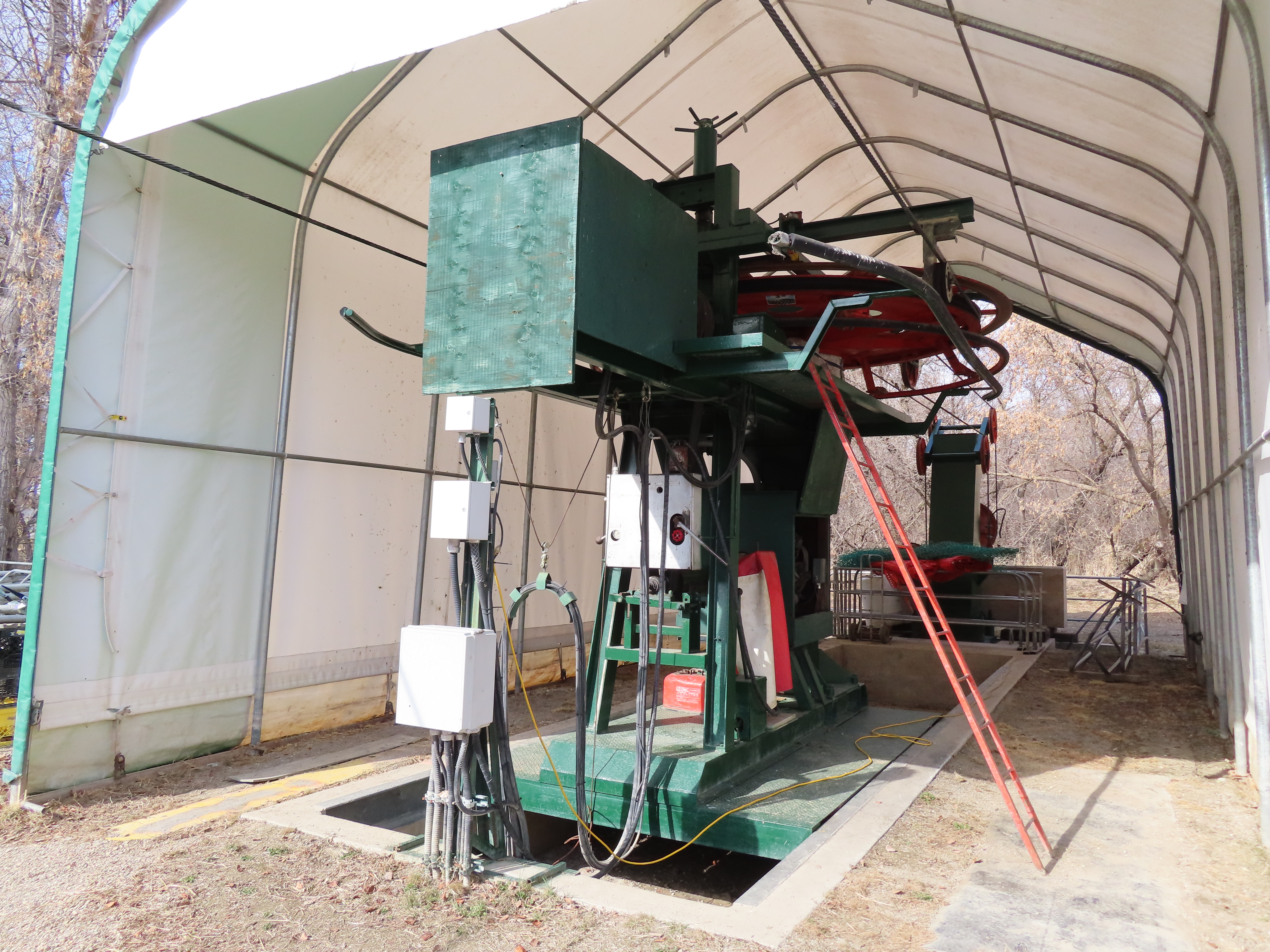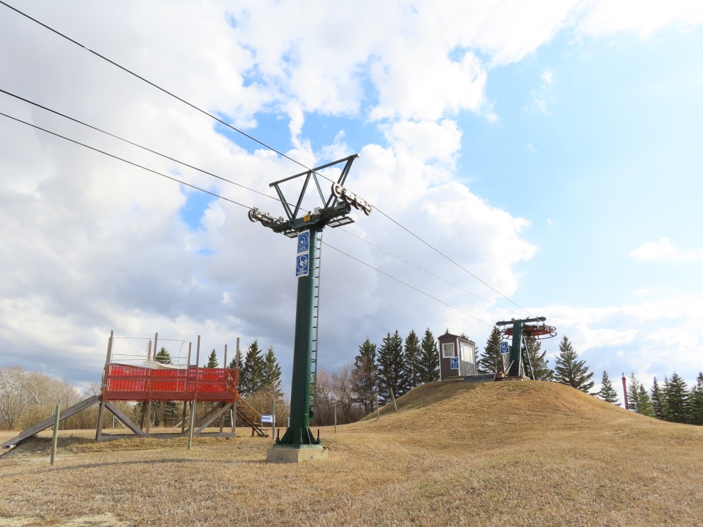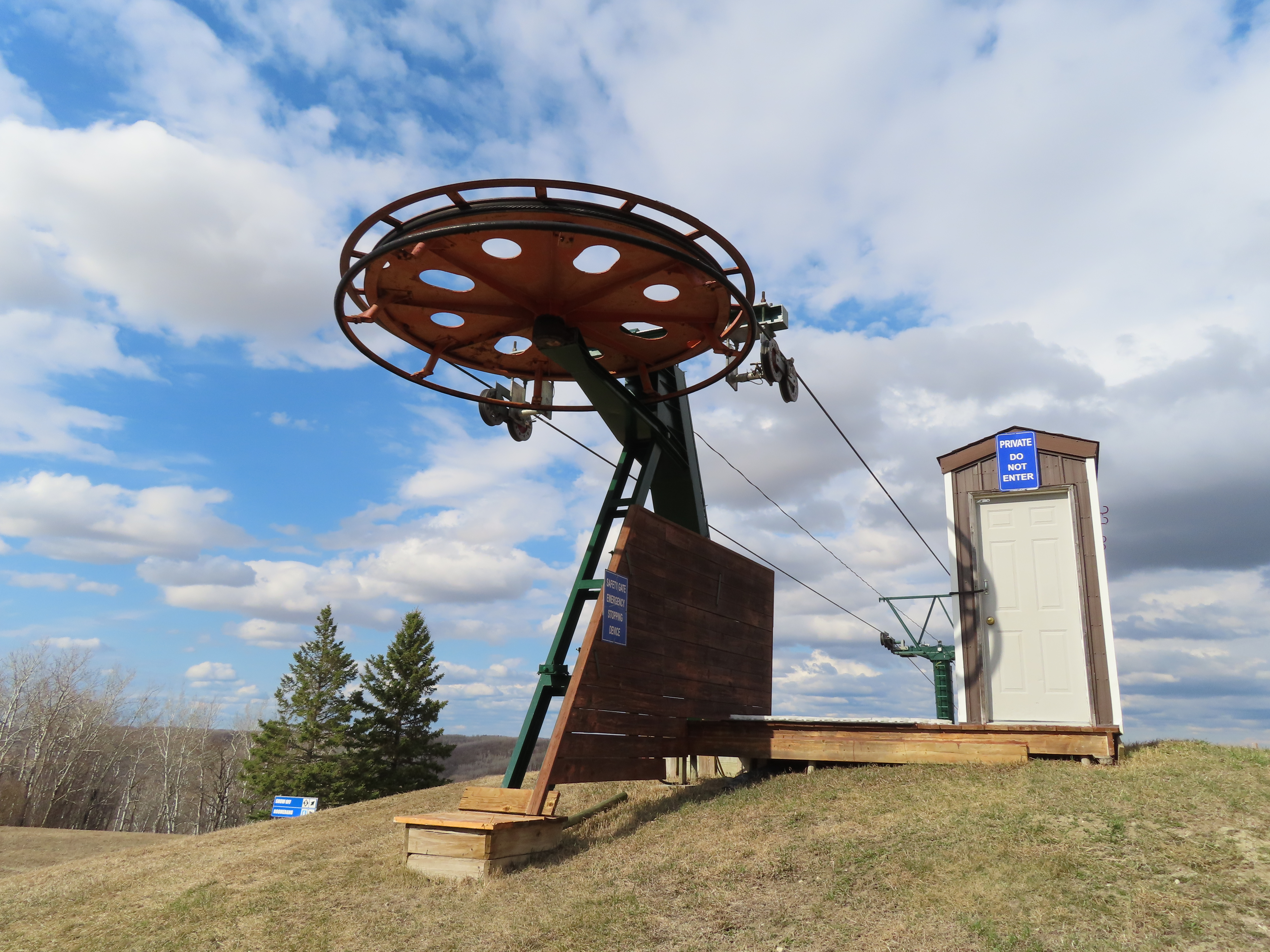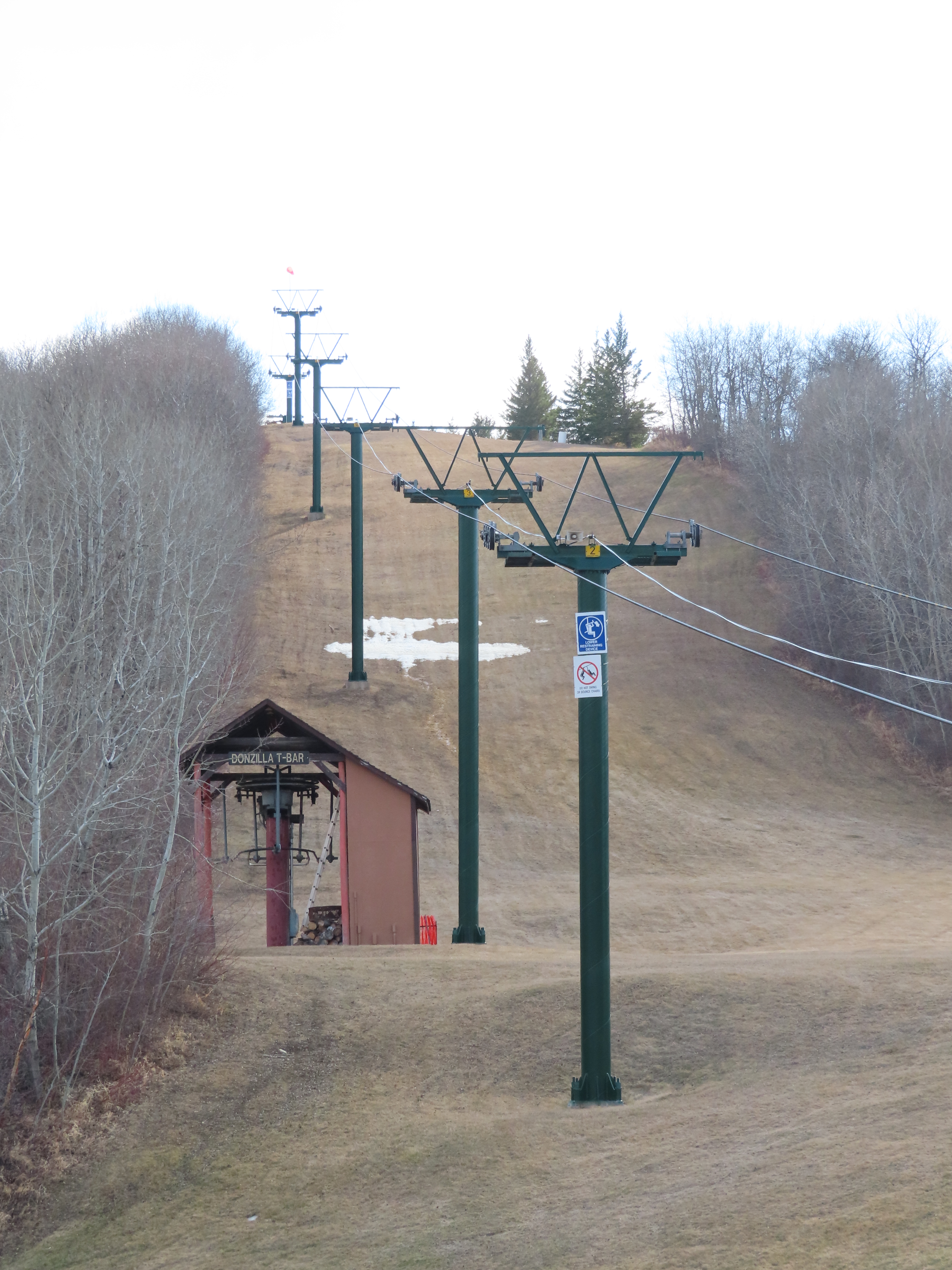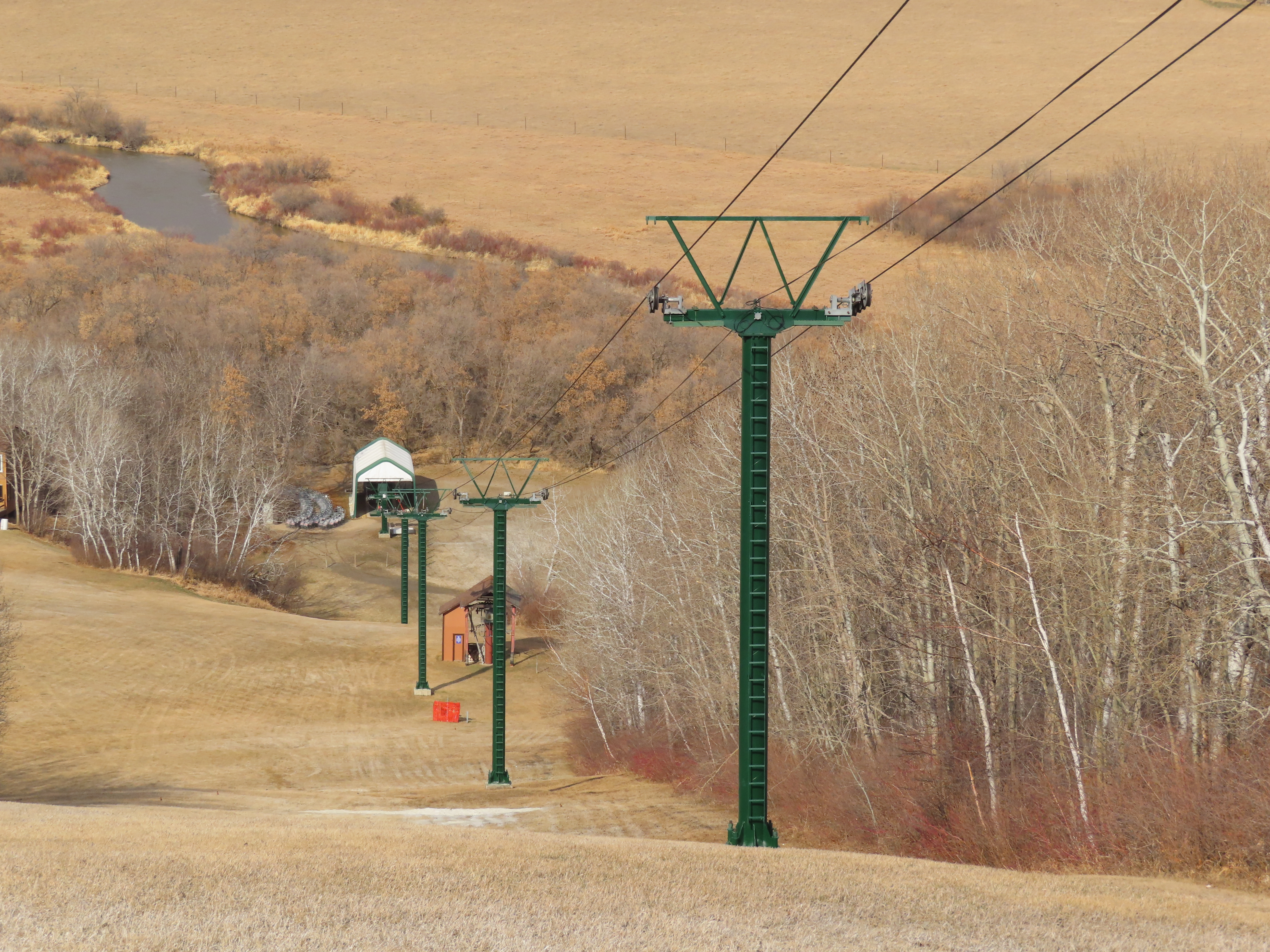 This relocated center pole double replaced a T-Bar.Drive station in a tent.Colorful counterweight.Drive station with tensioning.Towers with lifting frames. Note the old T-Bar station.Lower lift line.Tower 7.Unloading area.View from the top.Breakover towers and the upper station.