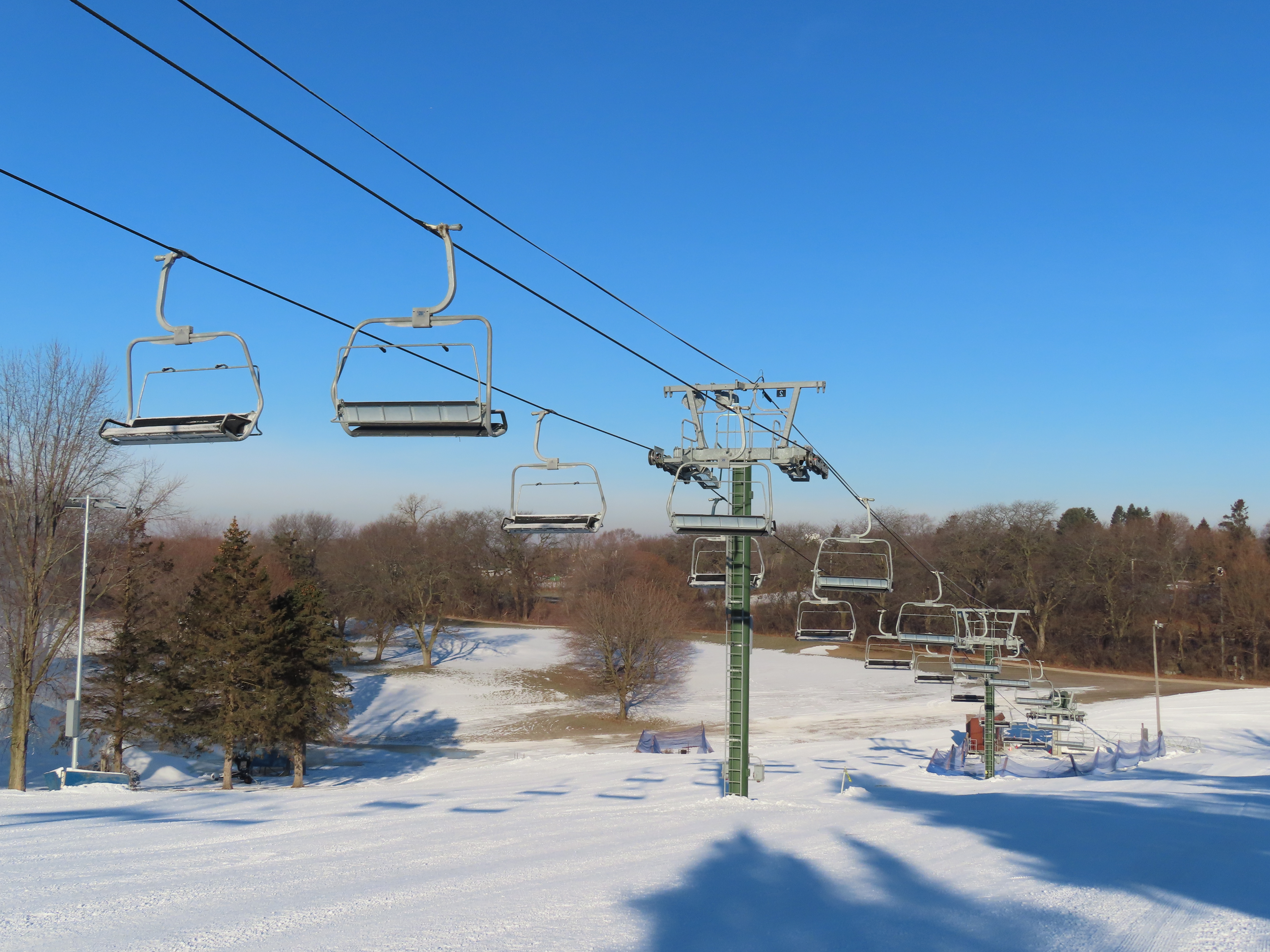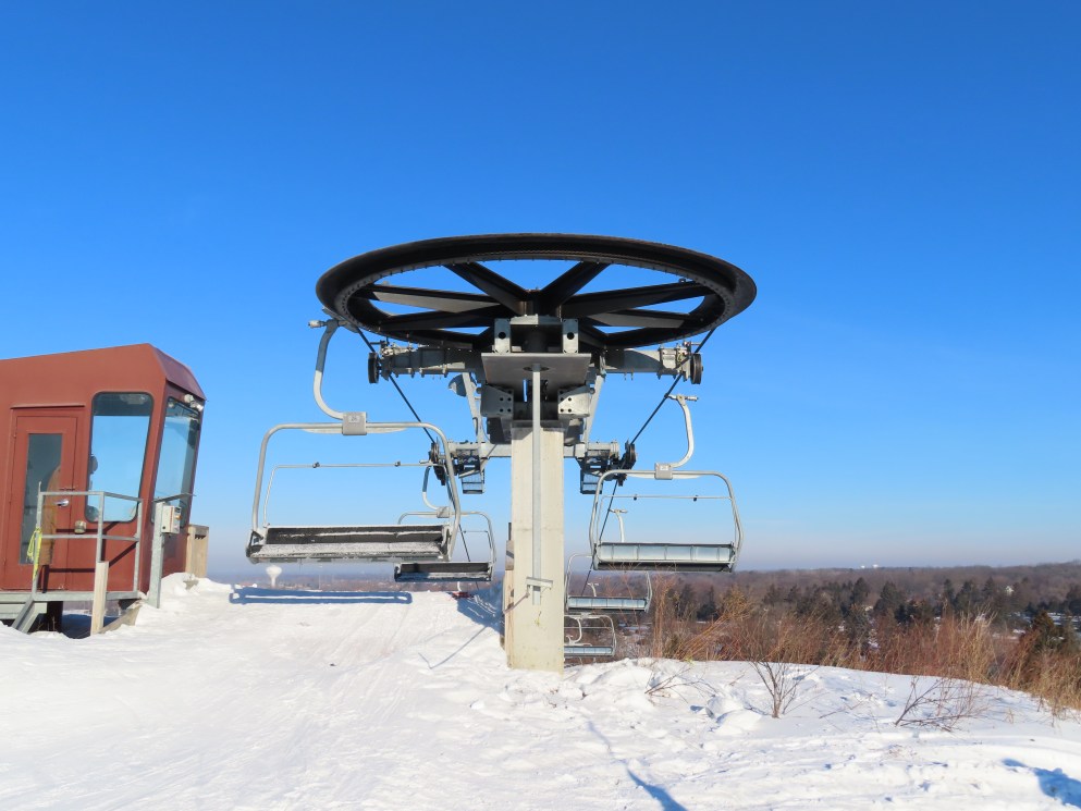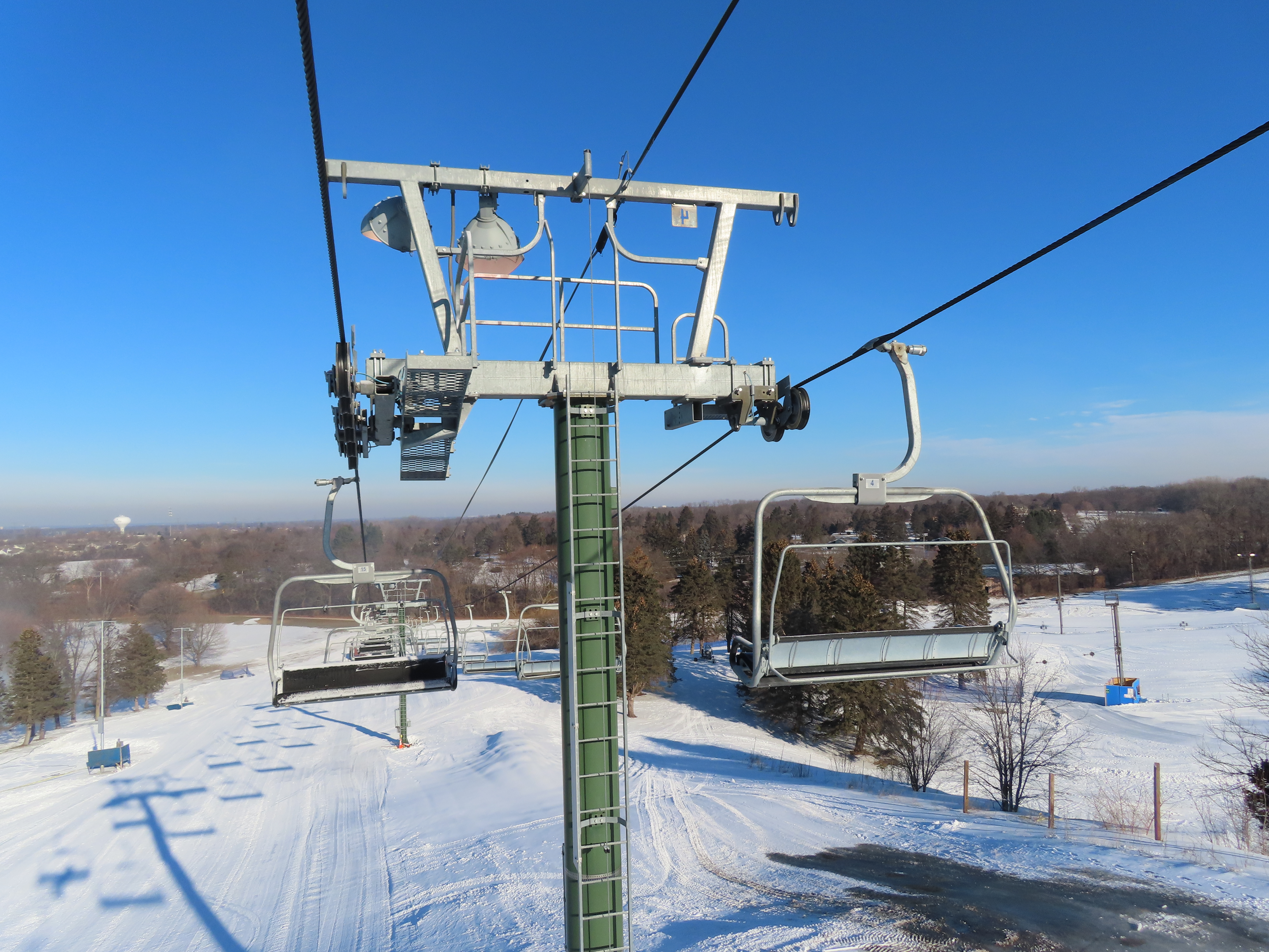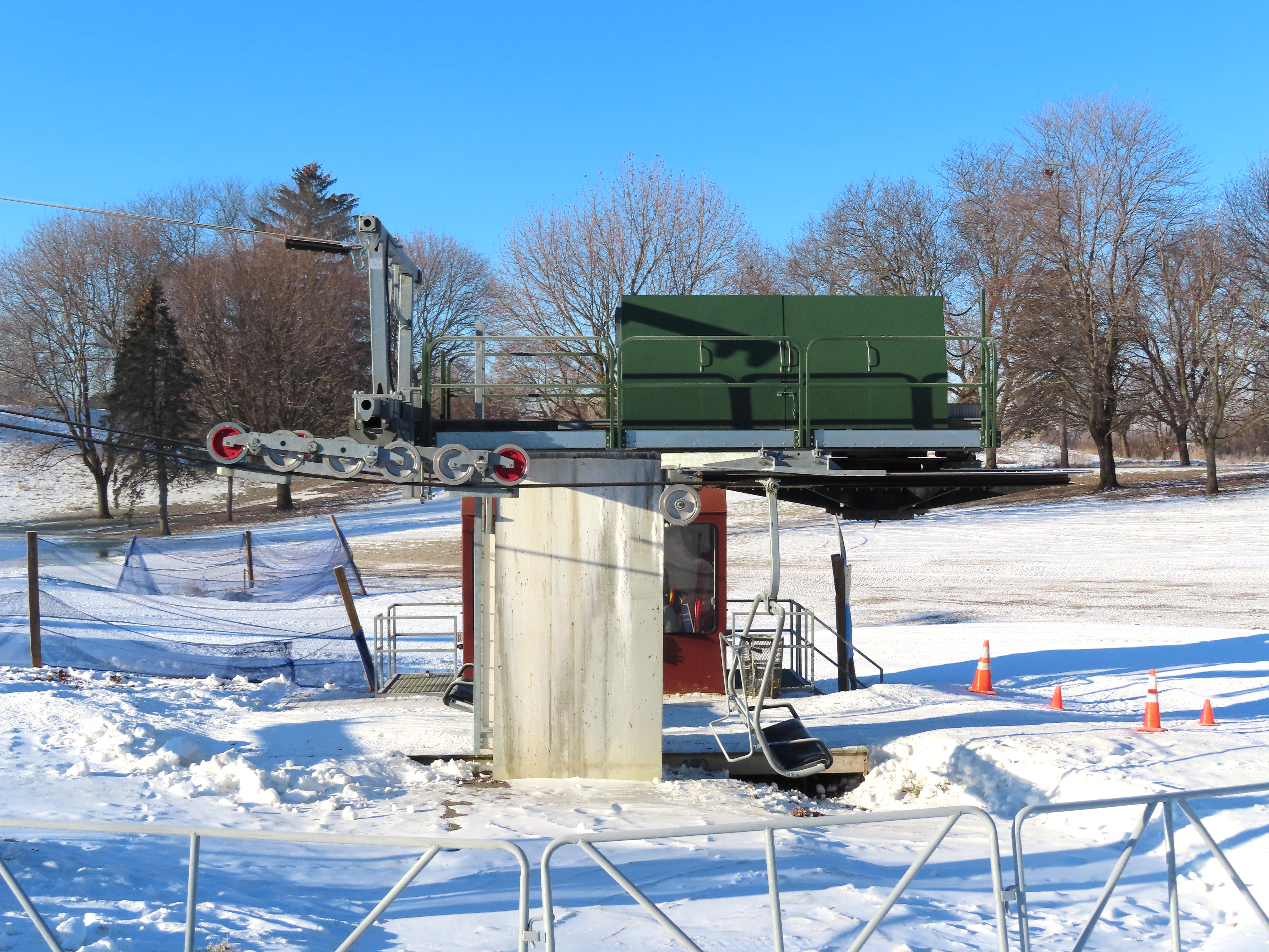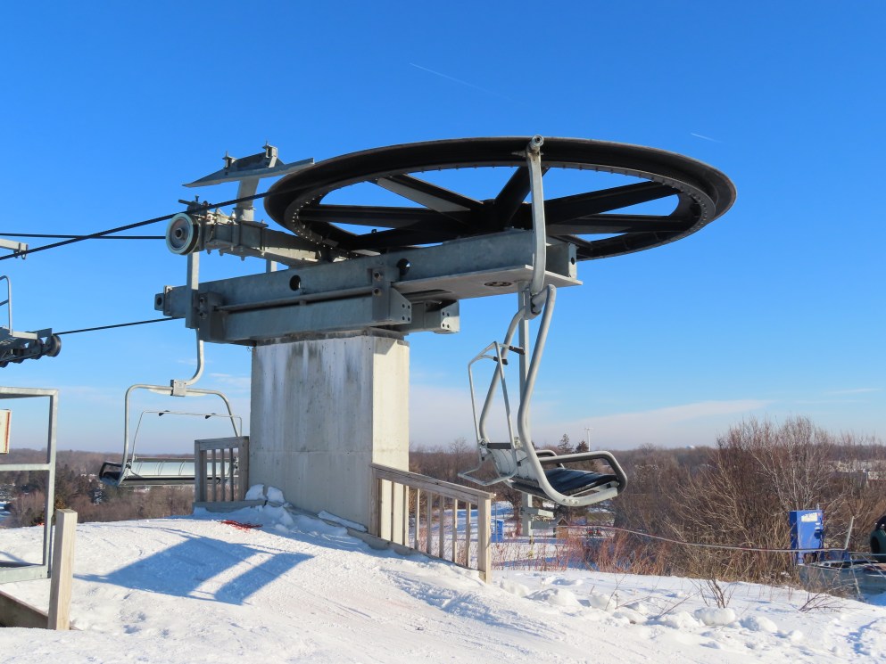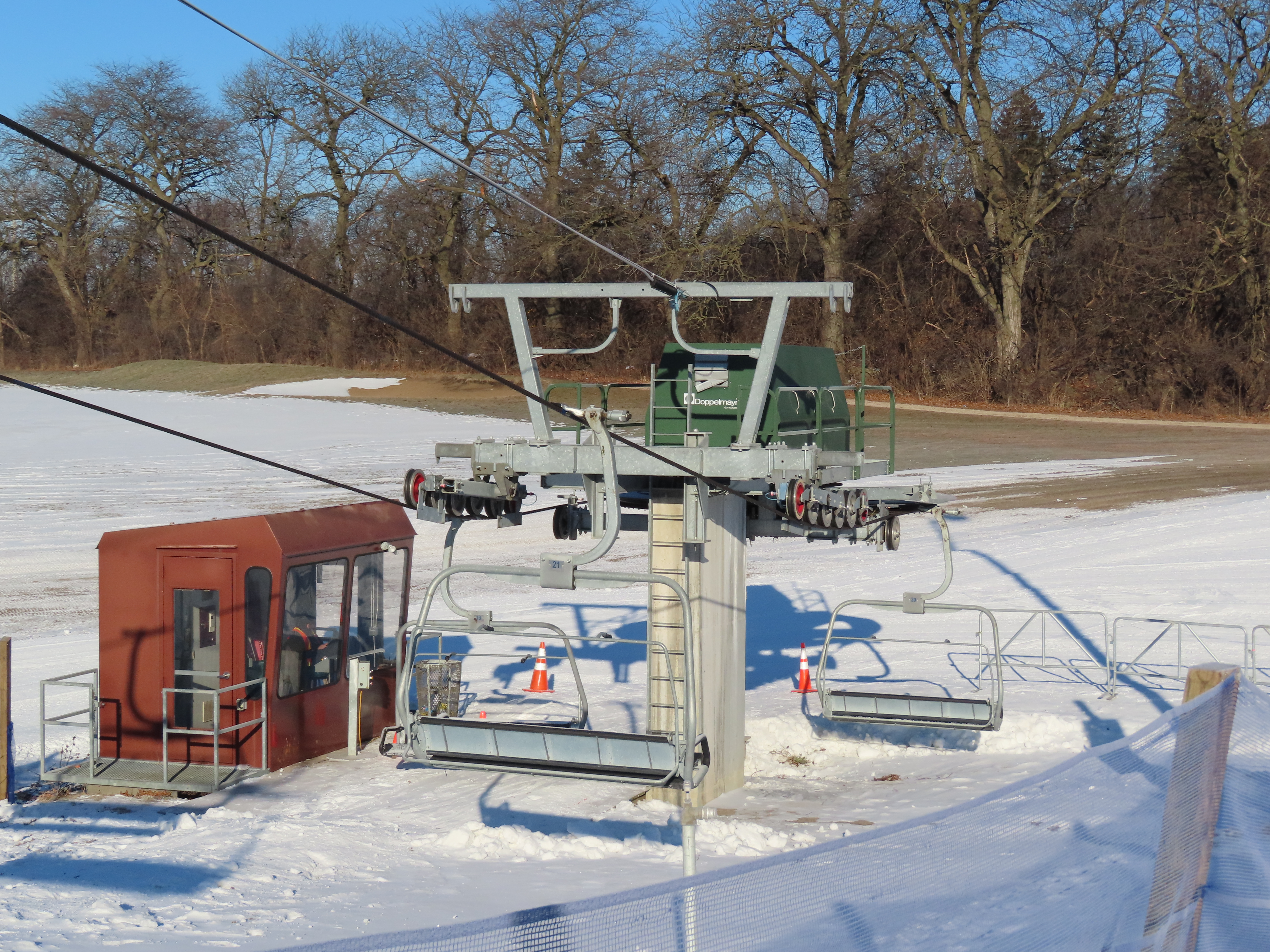 This lift is owned and operated by a suburban Chicago parks department.Before this Doppelmayr CTEC quad, there was a Borvig quad here.Upper part of the lift line.The first two towers.Lift line.Doppelmayr CTEC Eco drive.Loading area.Top station with tensioning.View from the summit.Doppelmayr tower head.The top bullwheel and tower 5.
