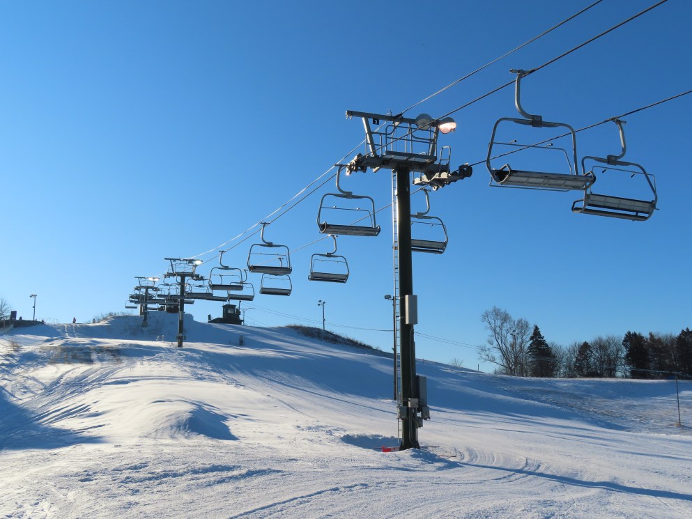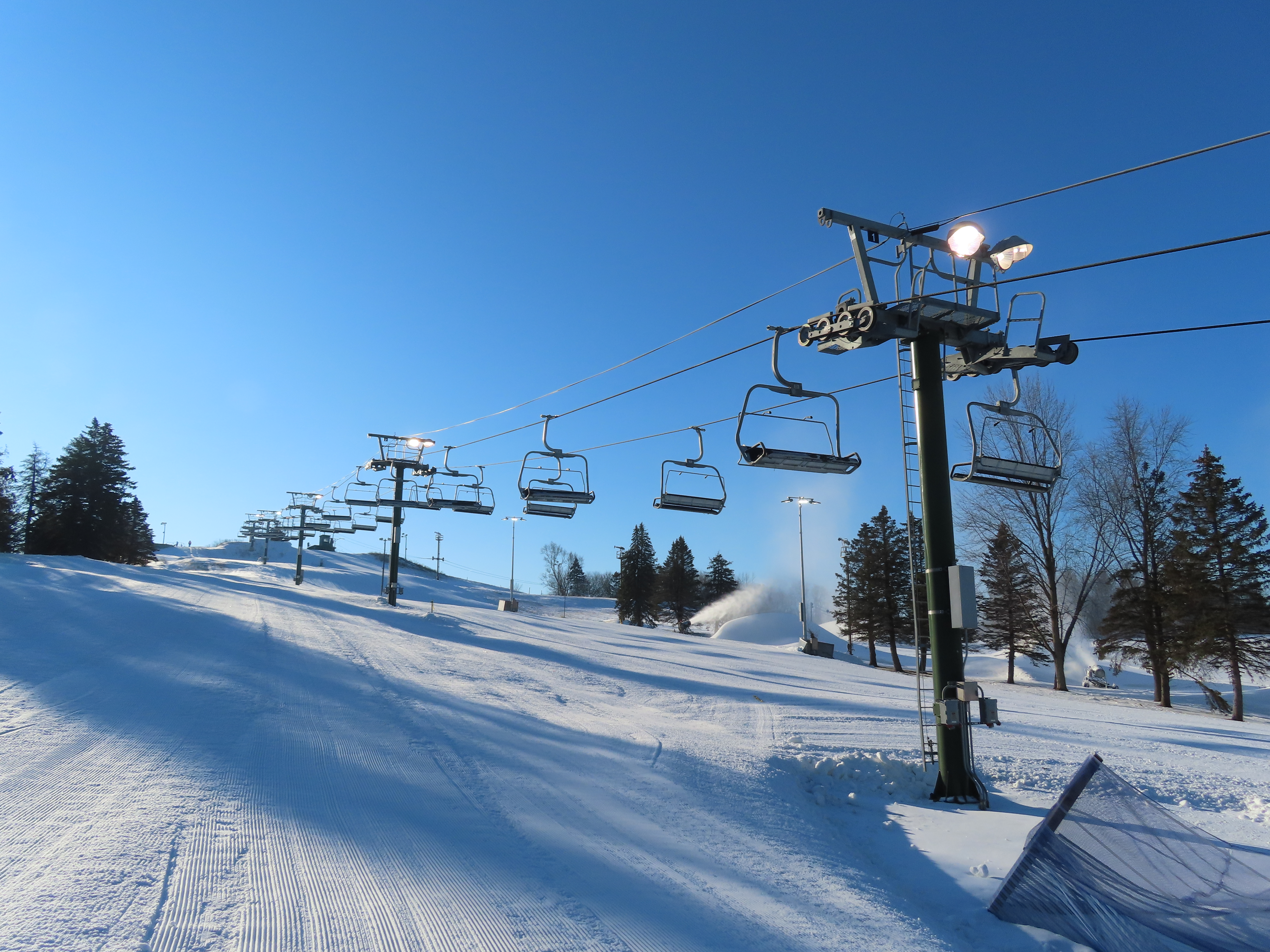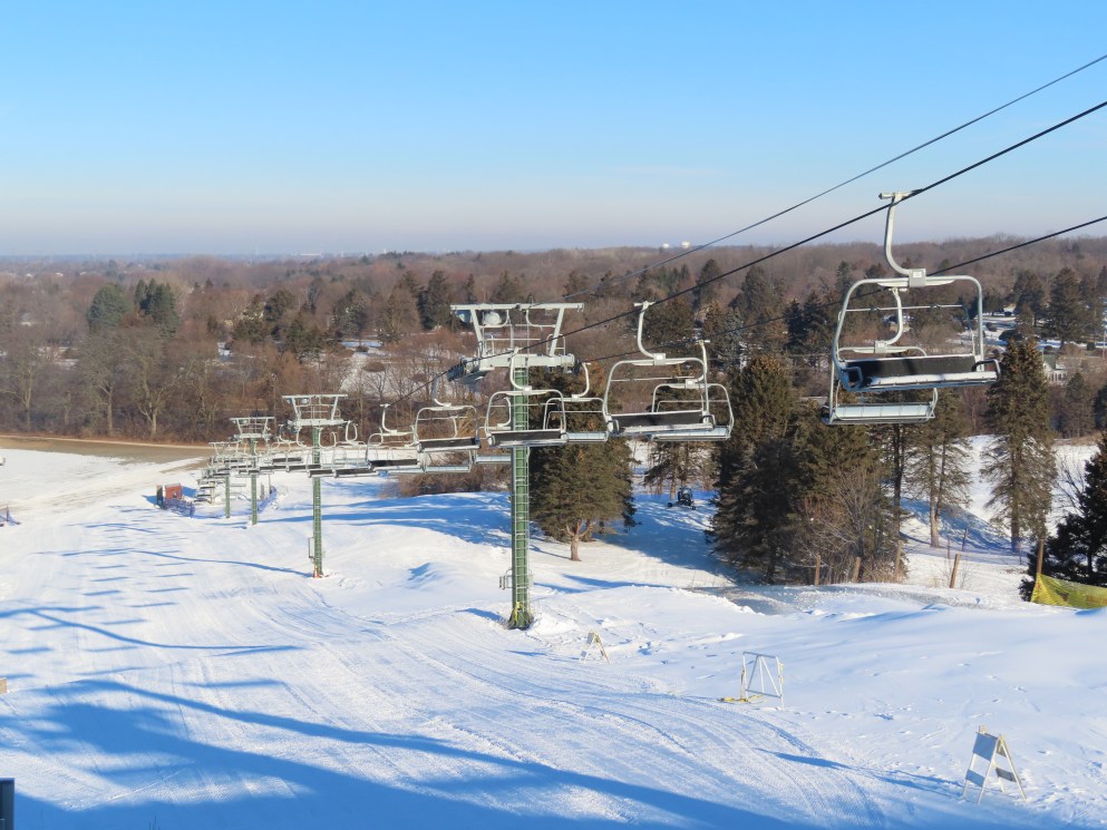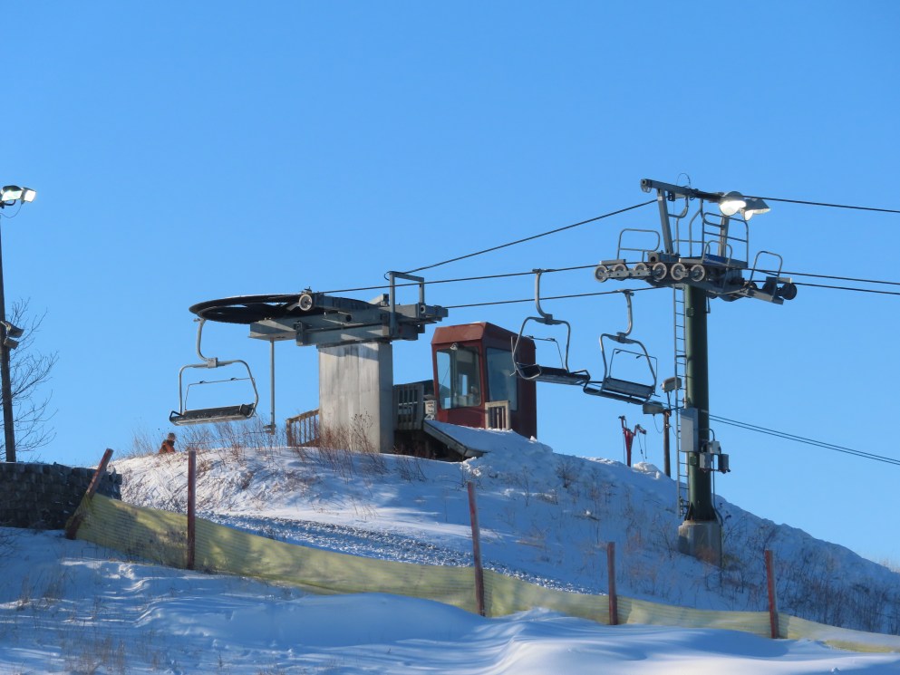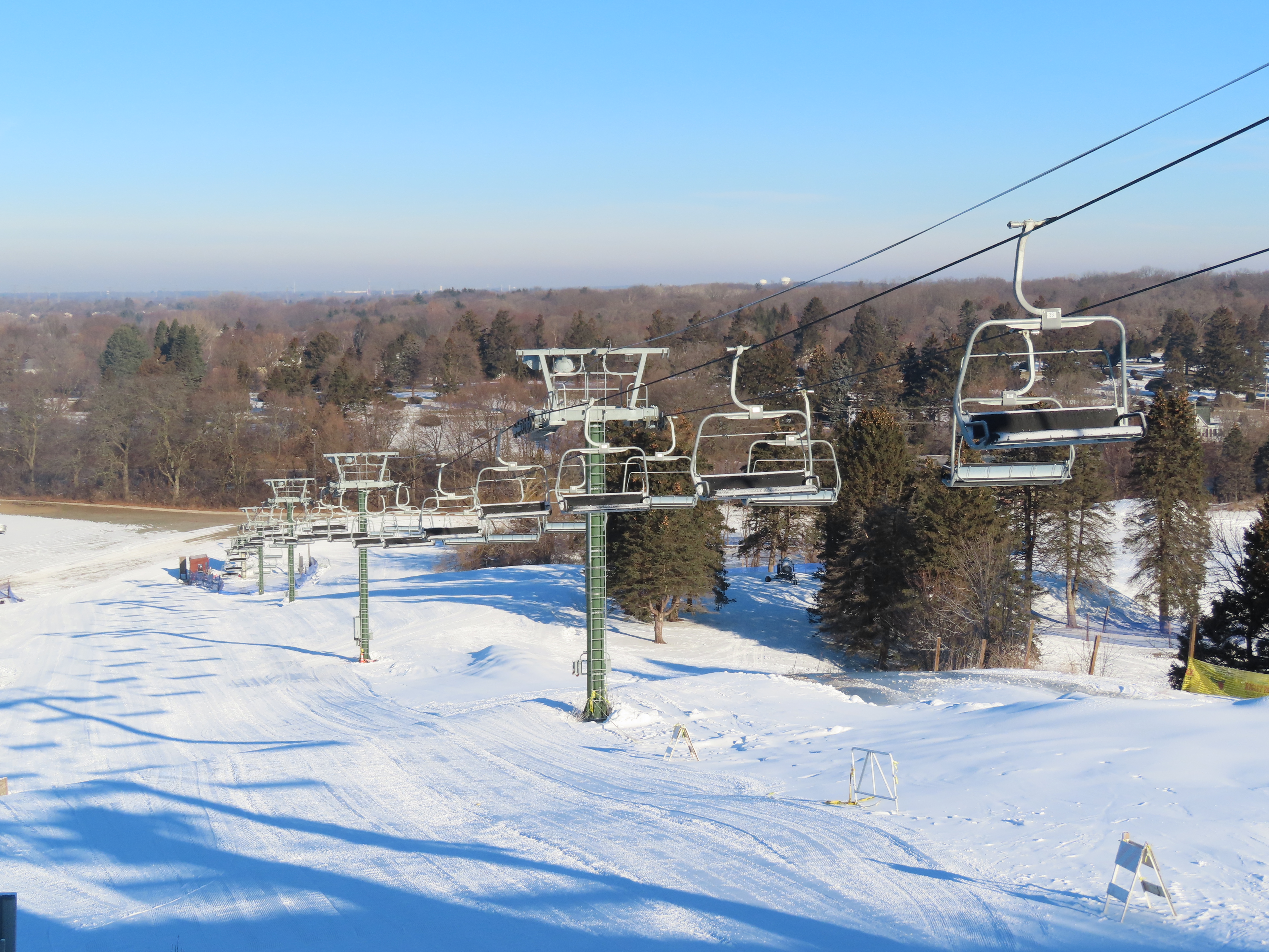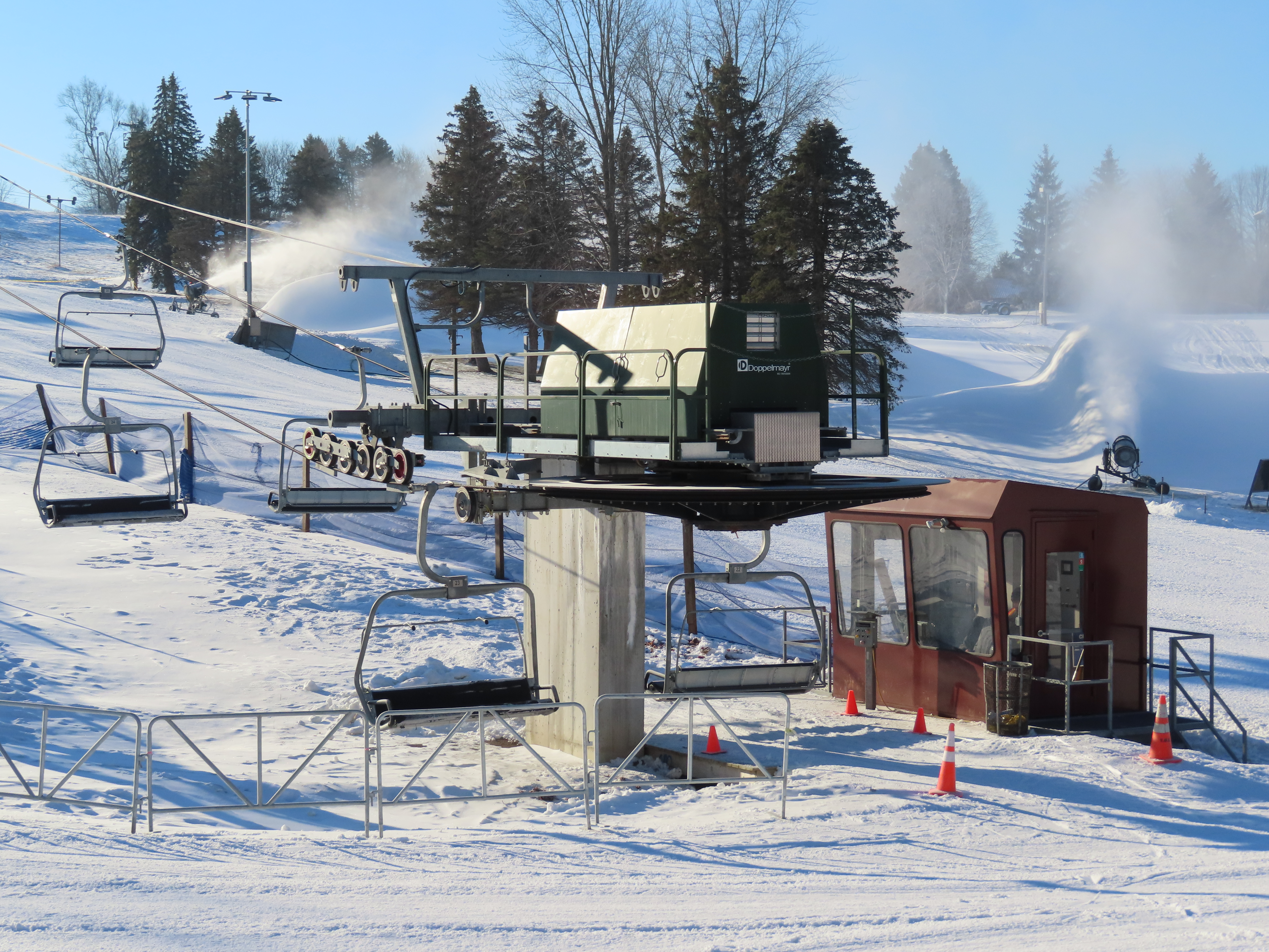 This lift is owned and operated by a suburban Chicago parks department.Before this Doppelmayr CTEC quad, there was a Borvig quad here.Upper part of the lift line.The first two towers.Lift line.Doppelmayr CTEC Eco drive.Loading area.Top station with tensioning.View from the summit.Doppelmayr tower head.The top bullwheel and tower 5.