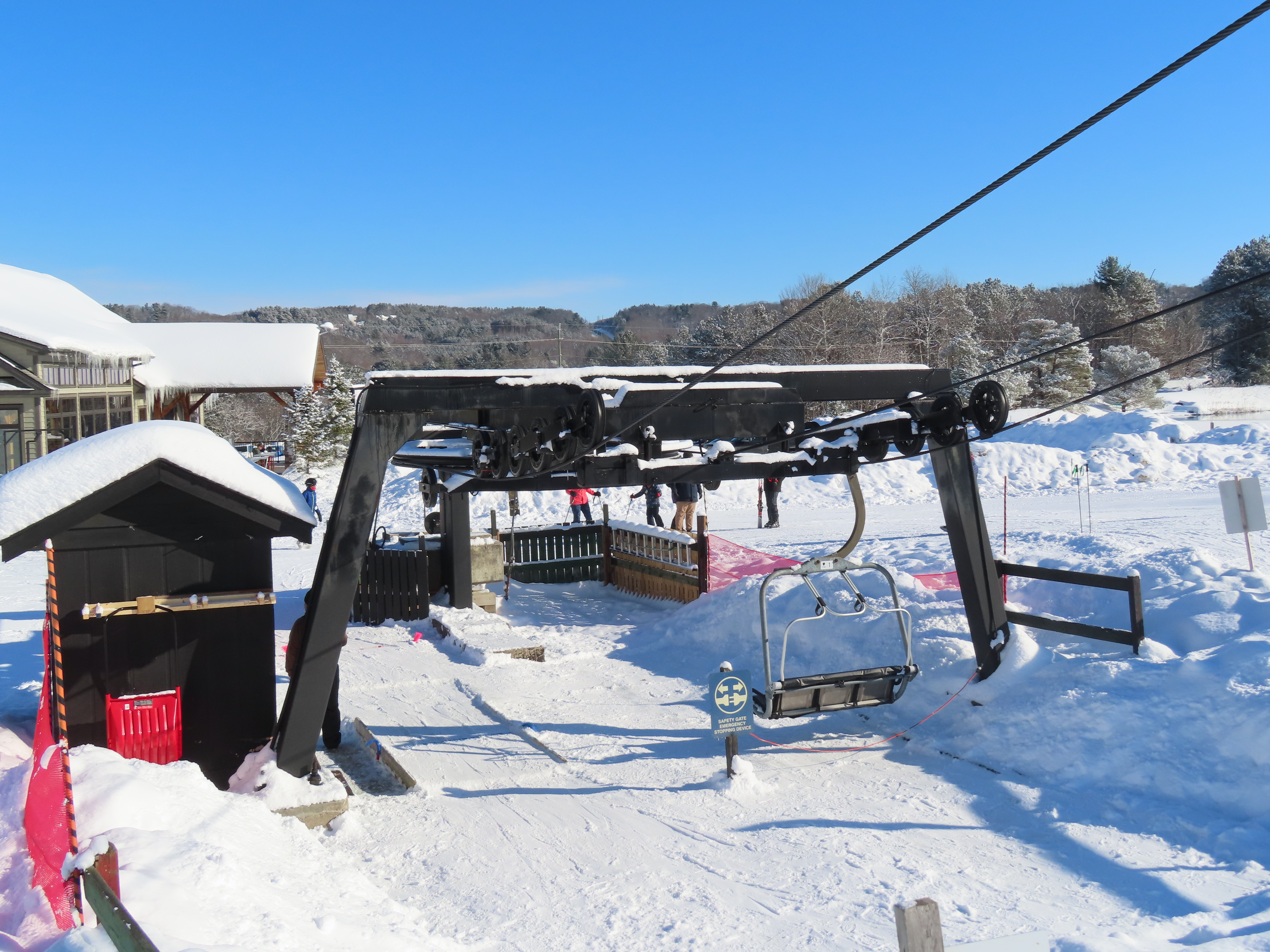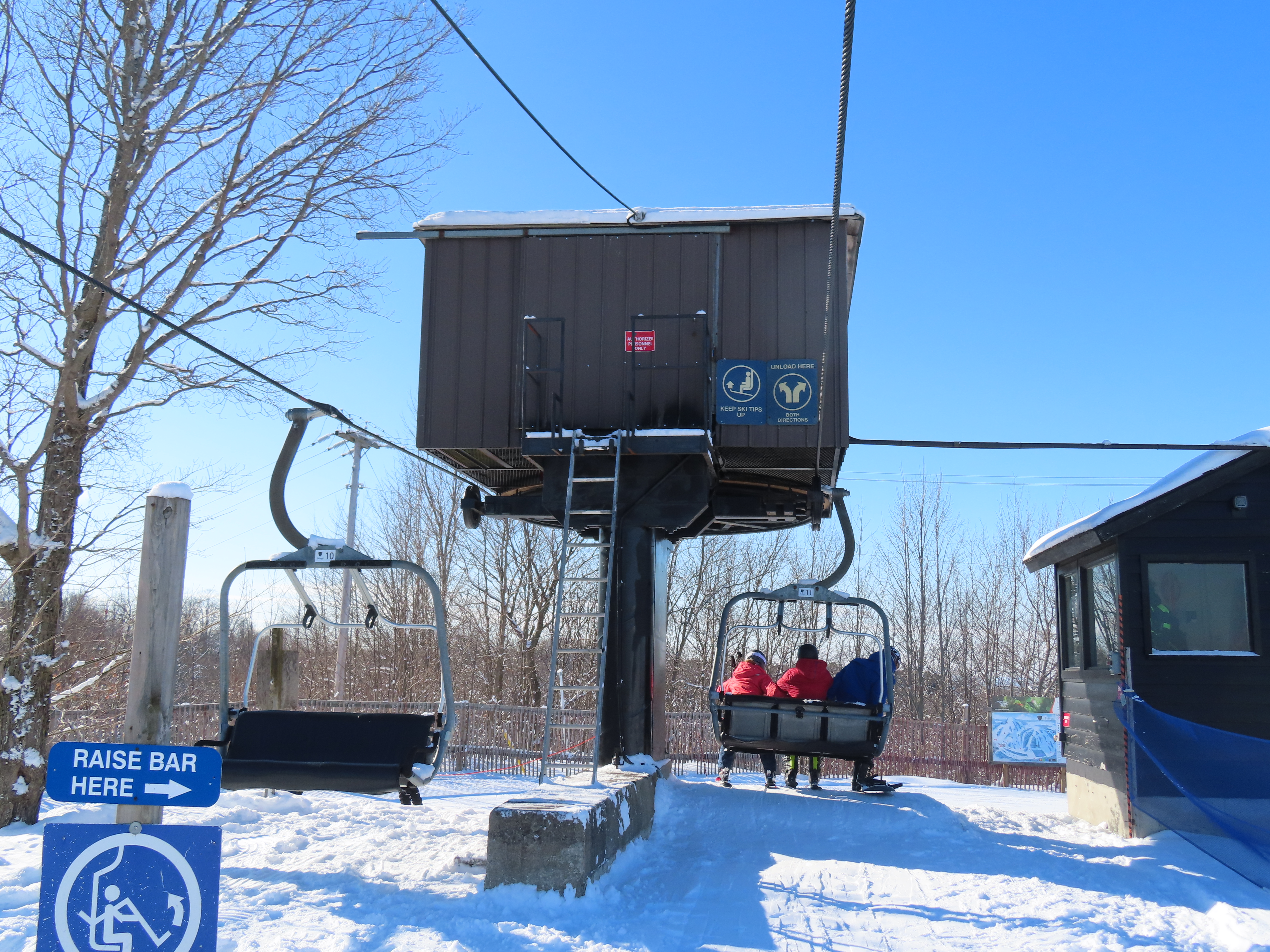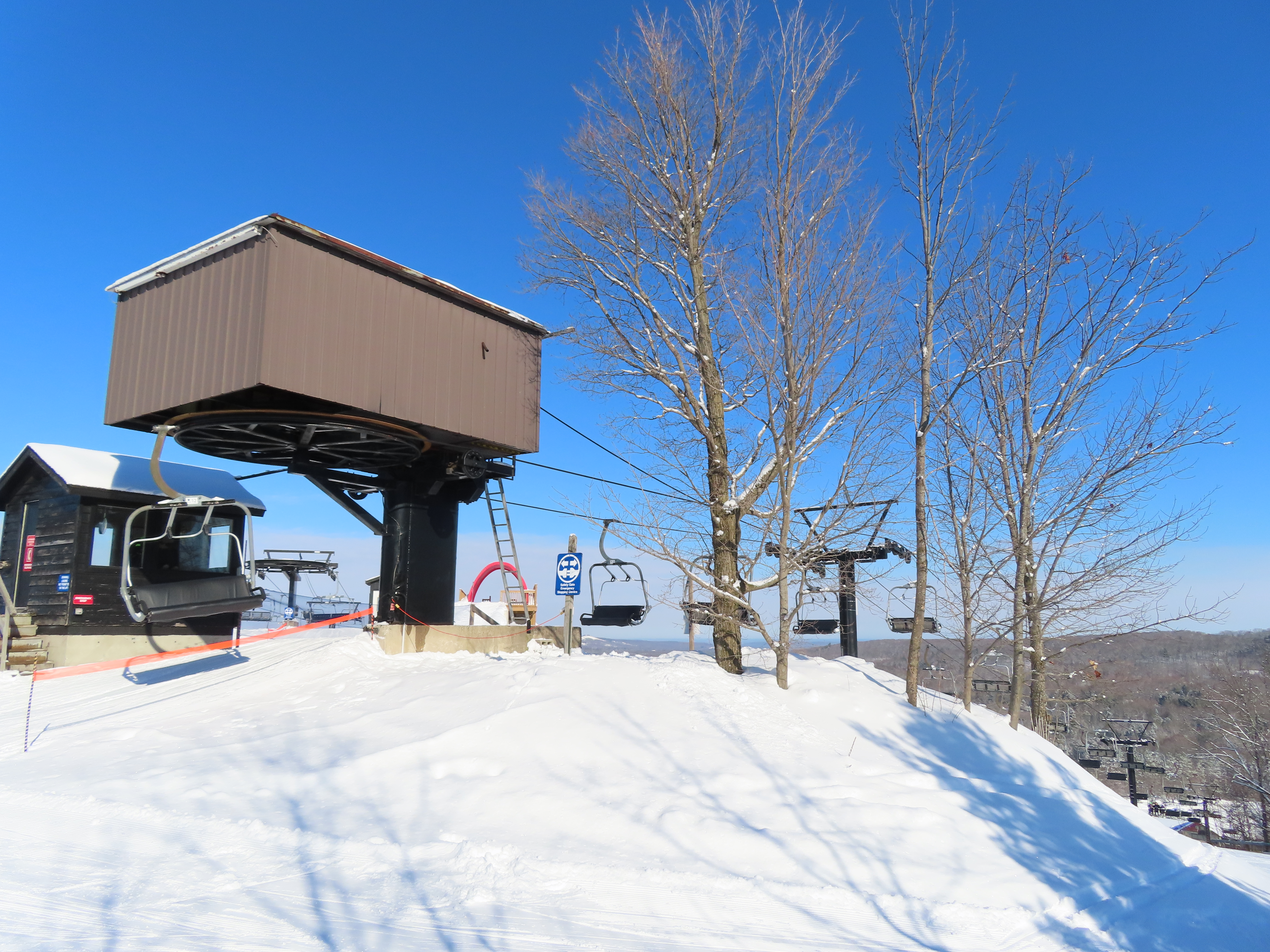 This short triple chair services a slope just outside the main lodge.Loading area and counterweight.Blue Mountain Lifts tower head with added lifting frame.Riding up the line.Nearing the summit.Arriving at the fixed drive up top.Unloading area and top operator house.Upper lift line overview.View from the summit.Looking down the line.Upper lift line.Most BM lifts were retrofitted with Poma chairs but this one received Leitner chairs.Side view of a support tower.