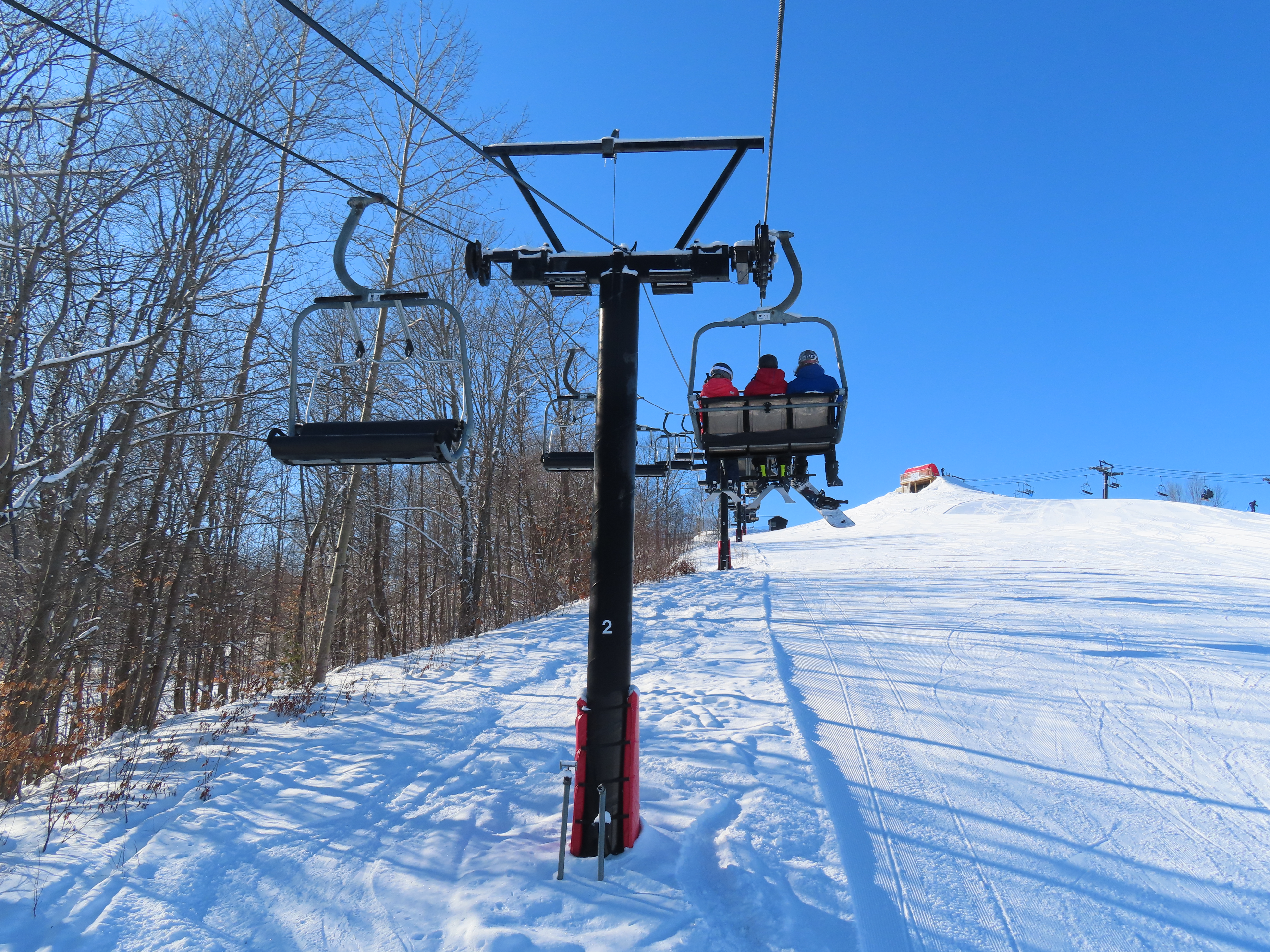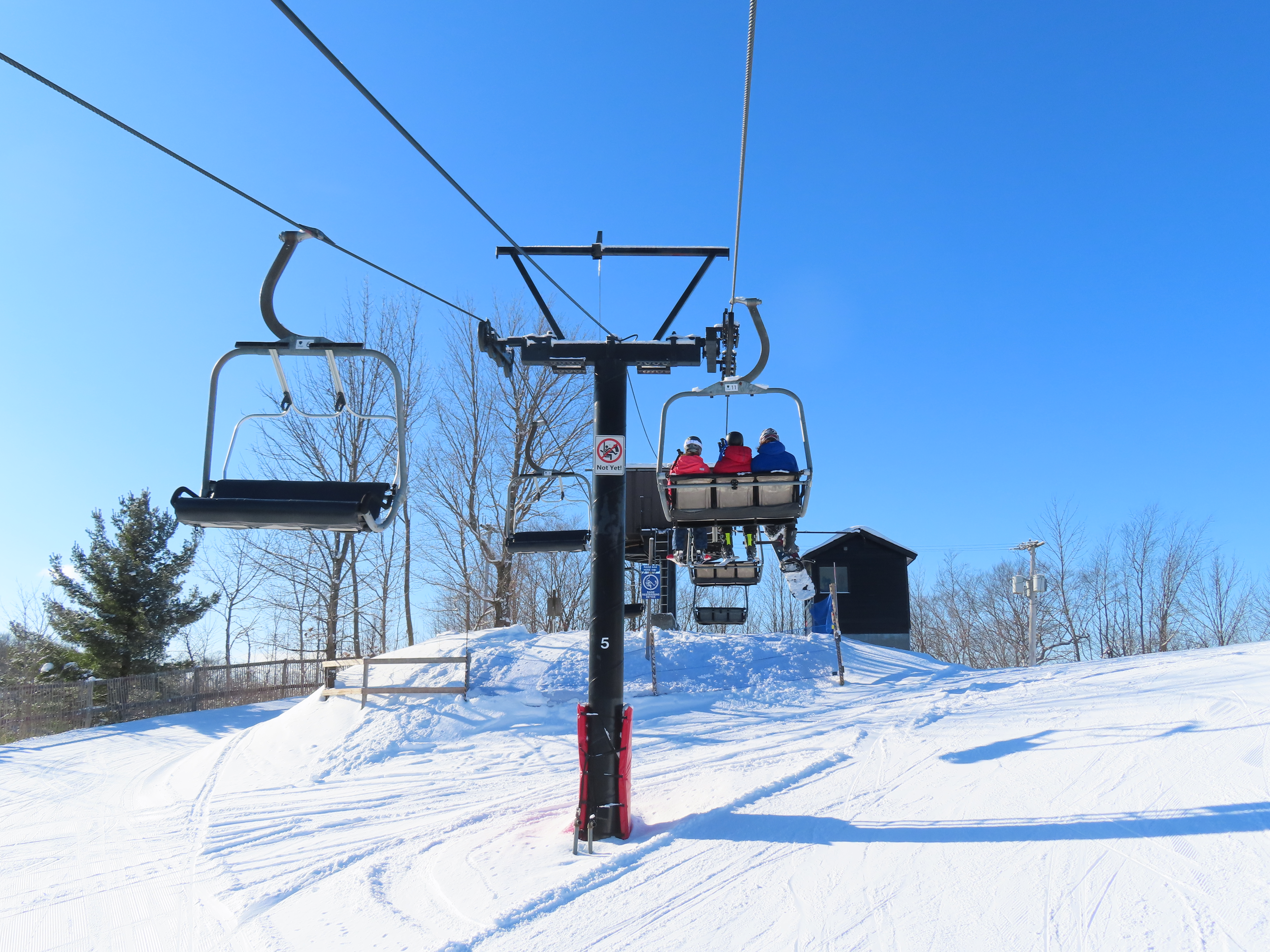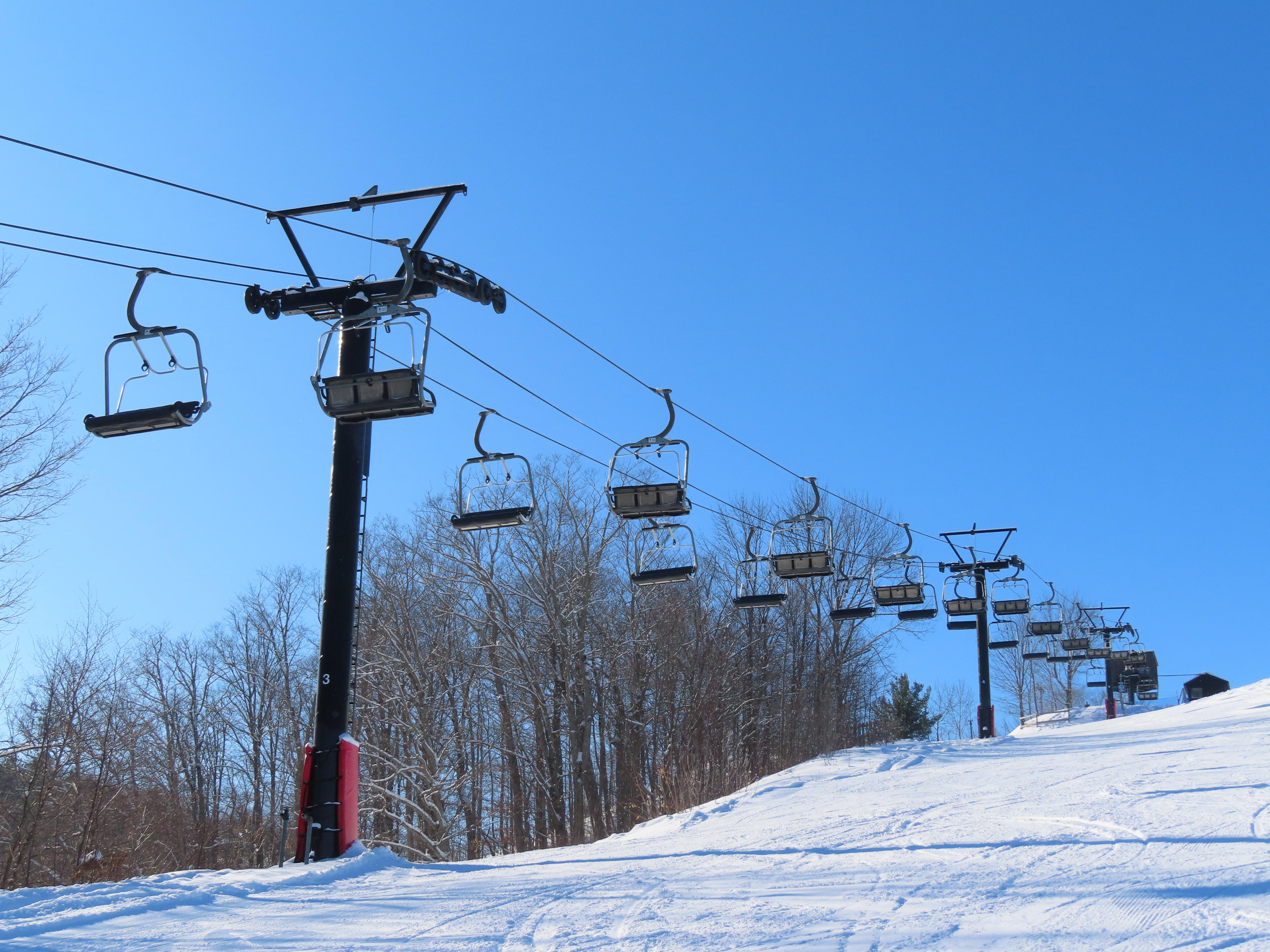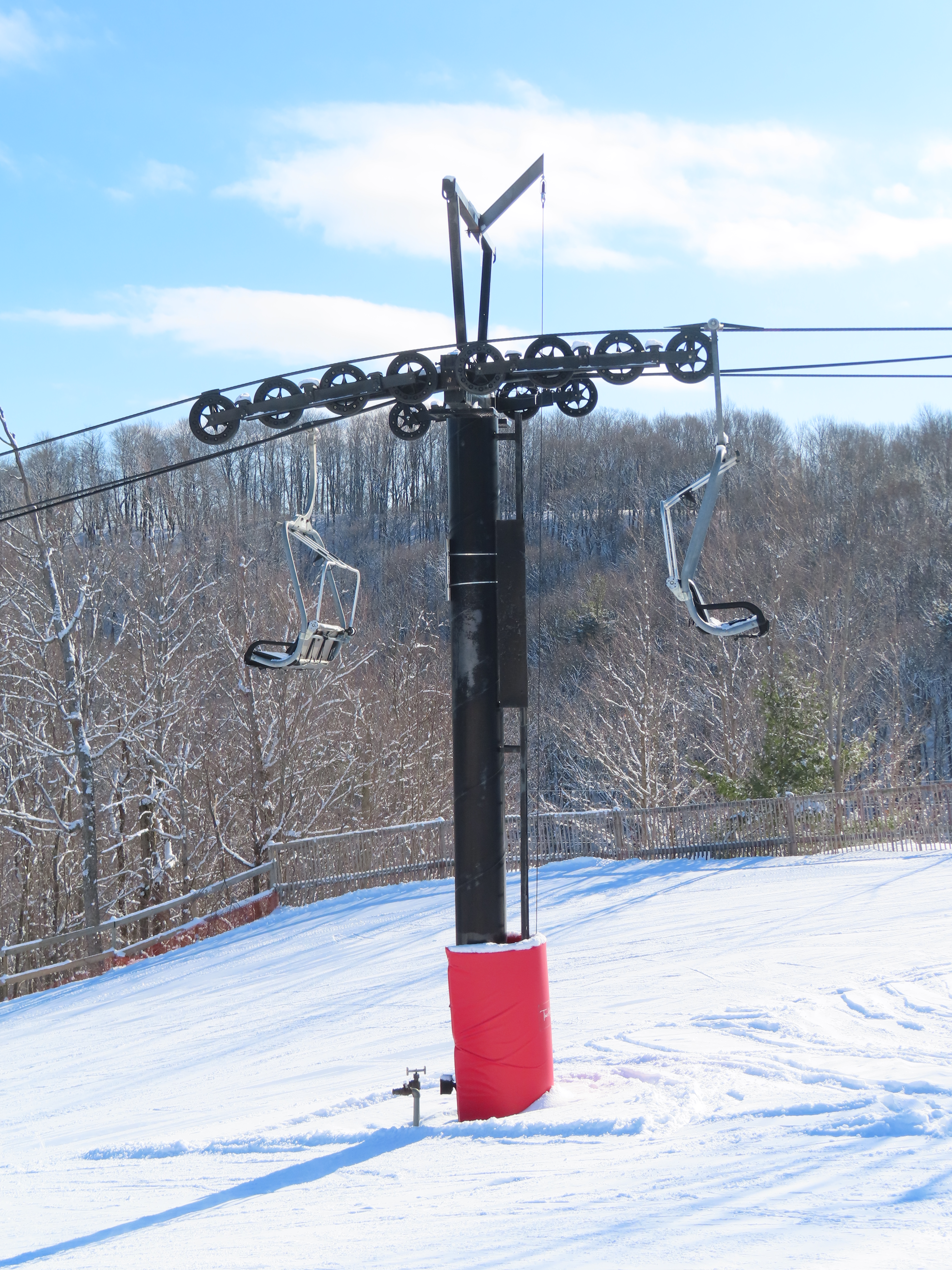 This short triple chair services a slope just outside the main lodge.Loading area and counterweight.Blue Mountain Lifts tower head with added lifting frame.Riding up the line.Nearing the summit.Arriving at the fixed drive up top.Unloading area and top operator house.Upper lift line overview.View from the summit.Looking down the line.Upper lift line.Most BM lifts were retrofitted with Poma chairs but this one received Leitner chairs.Side view of a support tower.