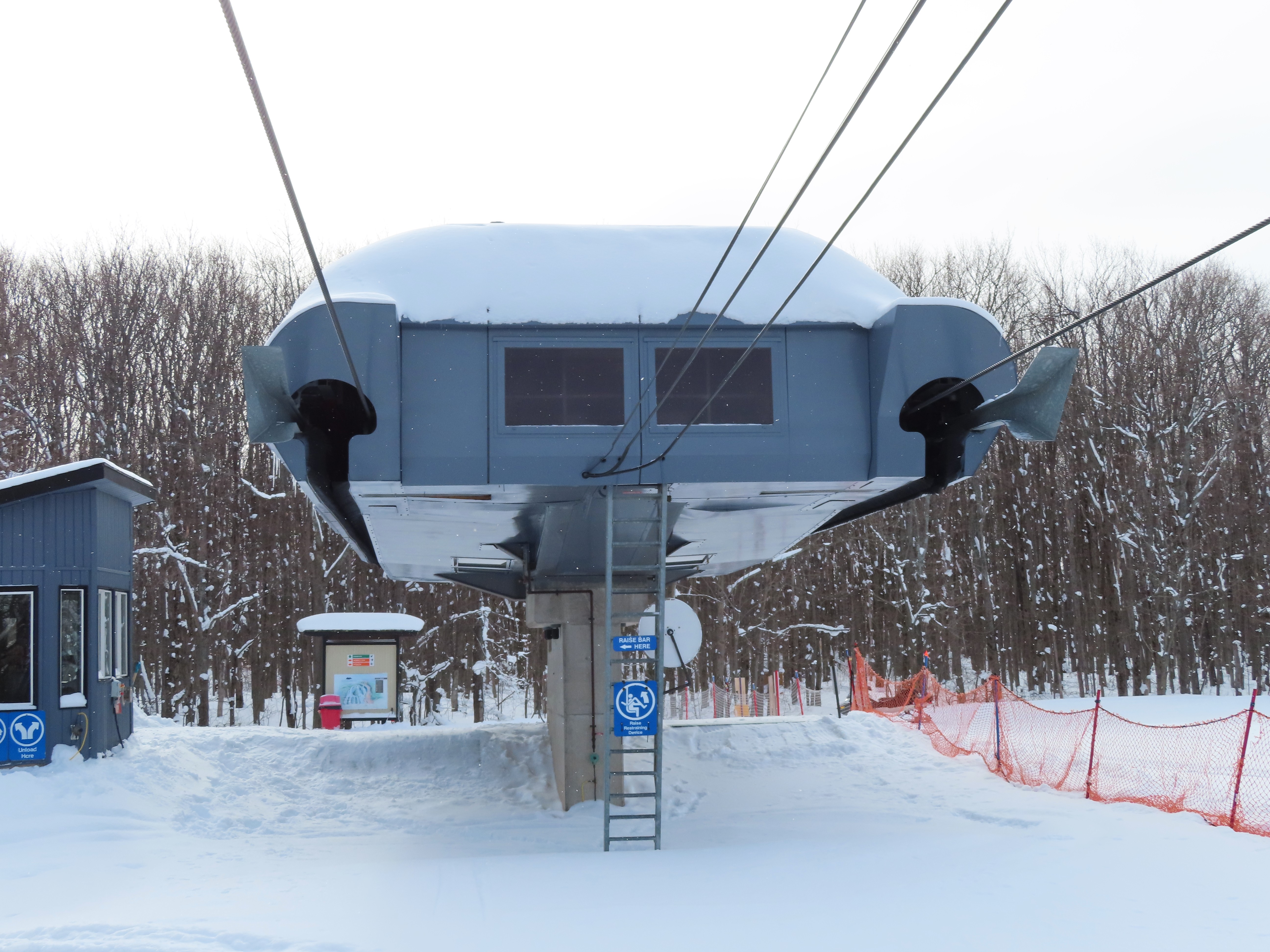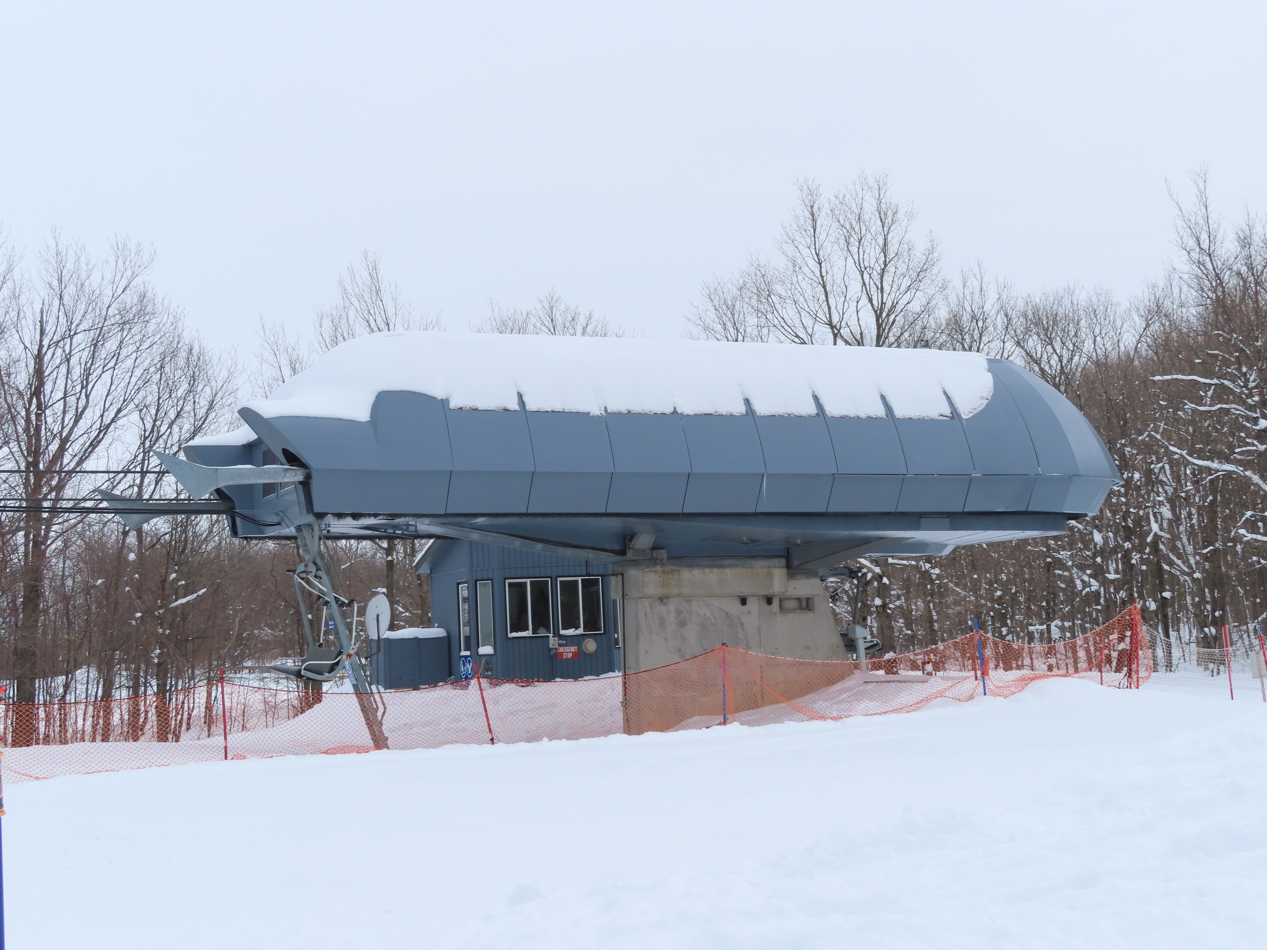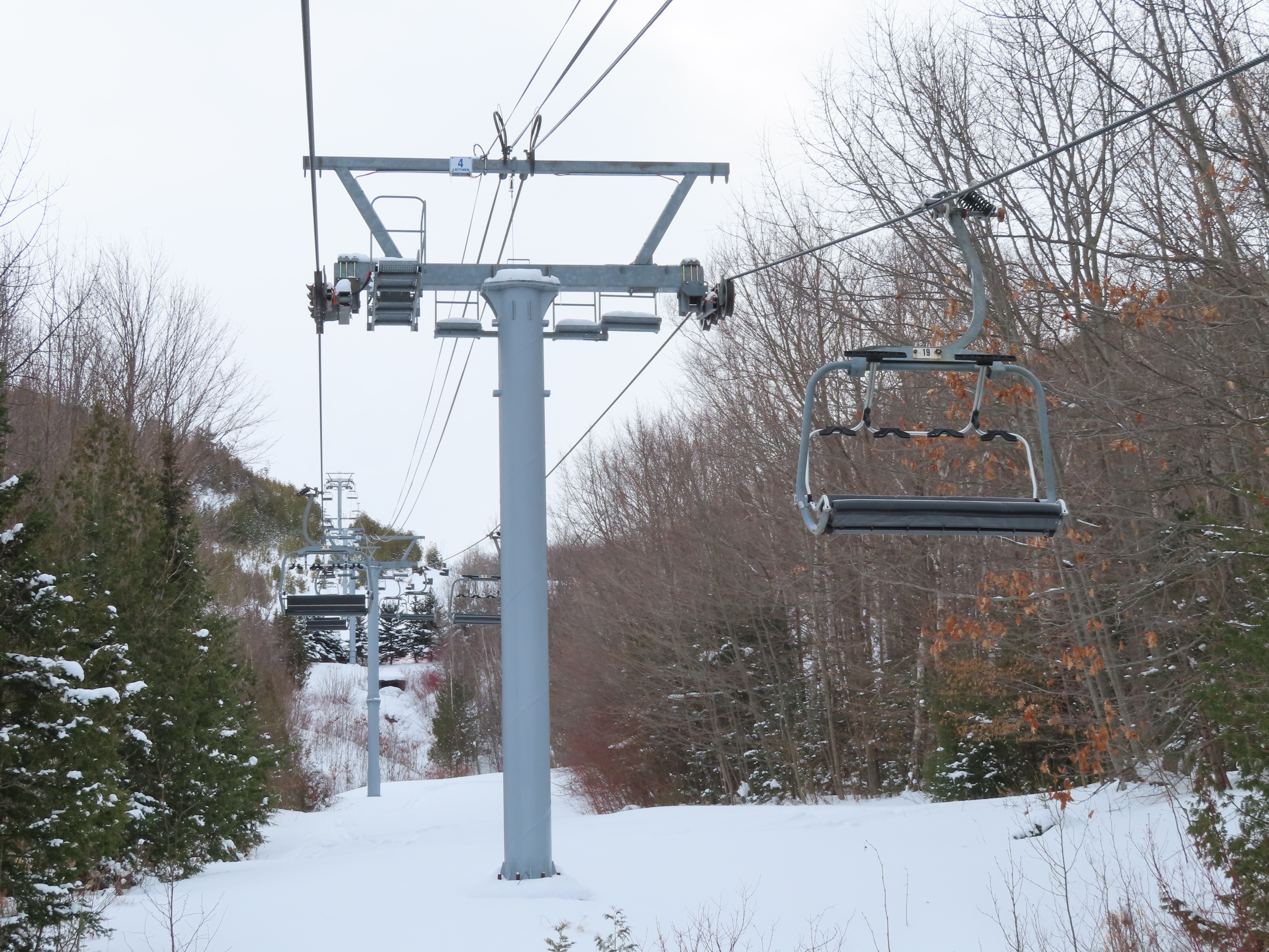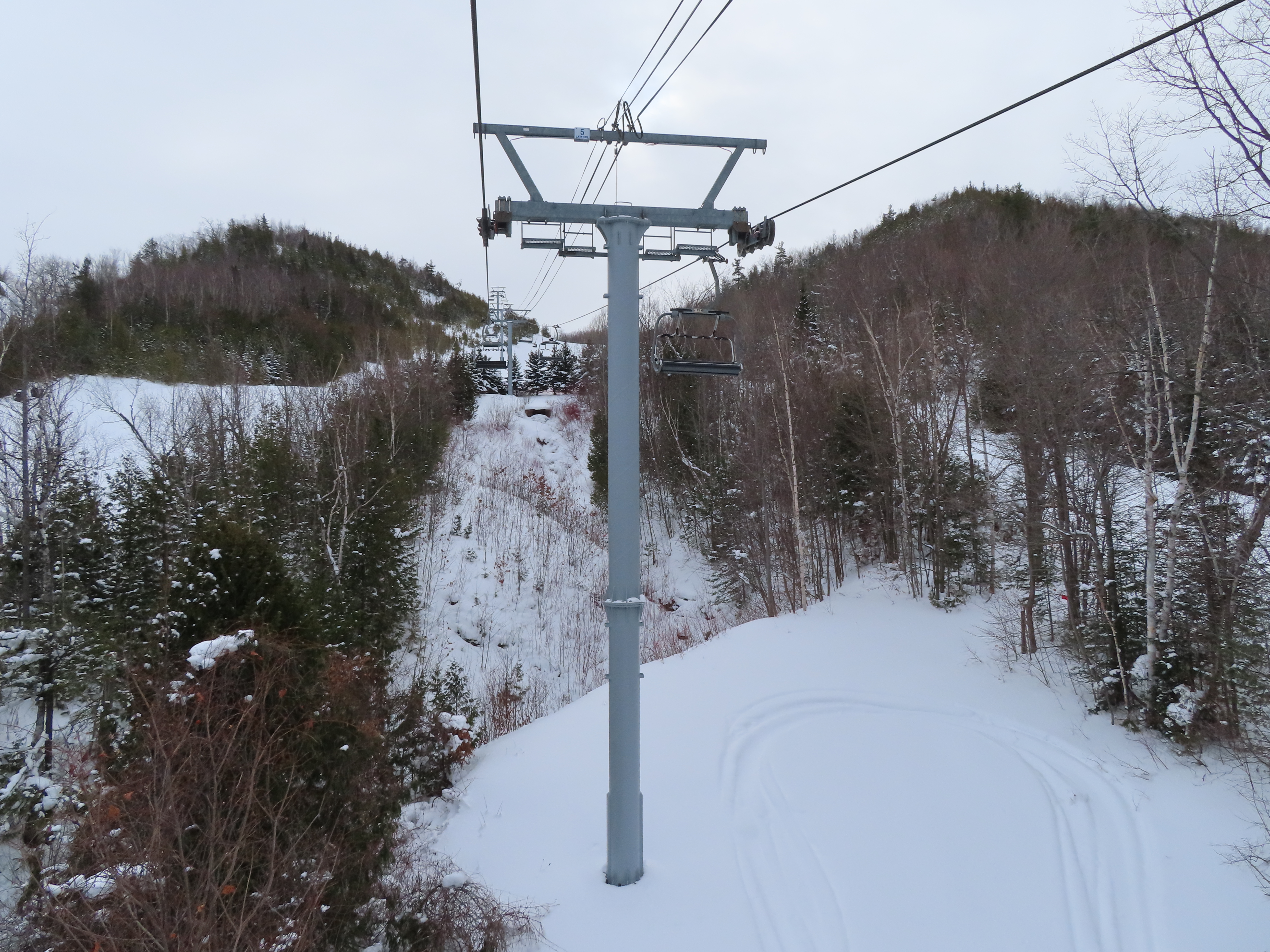 This base to summit detachable is one of just 10 built by Leitner in North America.The only Leitner detachable in Eastern Canada.Parking rail for all 40 chairs.This lift features relatively low capacity but high speed.Arriving at the return up top.A generator powers this station’s controls and tension system as no utility power reaches the top.Upgraded Leitner-Poma controls.Return bullwheel in action.Single tension cylinder in the top station.View from the summit.Middle part of the lift line.Riding up the line at tower 4.Galvanized chair with restraint bar and footrests.Tower 5.Towers 8 and 9.View back down the steepest part of the line.Tower 9.Monopod top station.Drive station with two diesel backups.Hanger and grip.Tower 10 with combination assemblies.Leitner Report entry.Page two of the Leitner Report entry from initial construction.