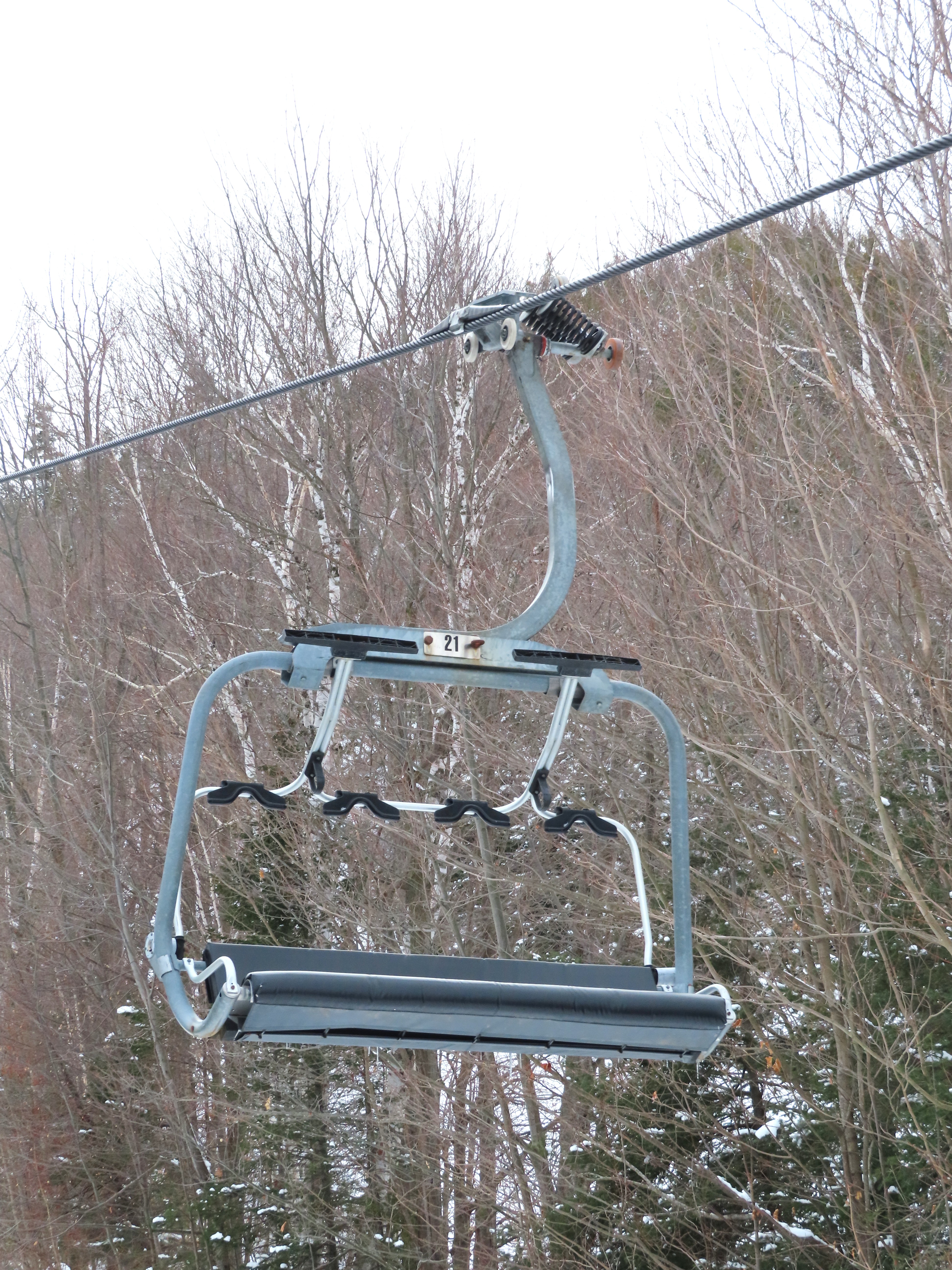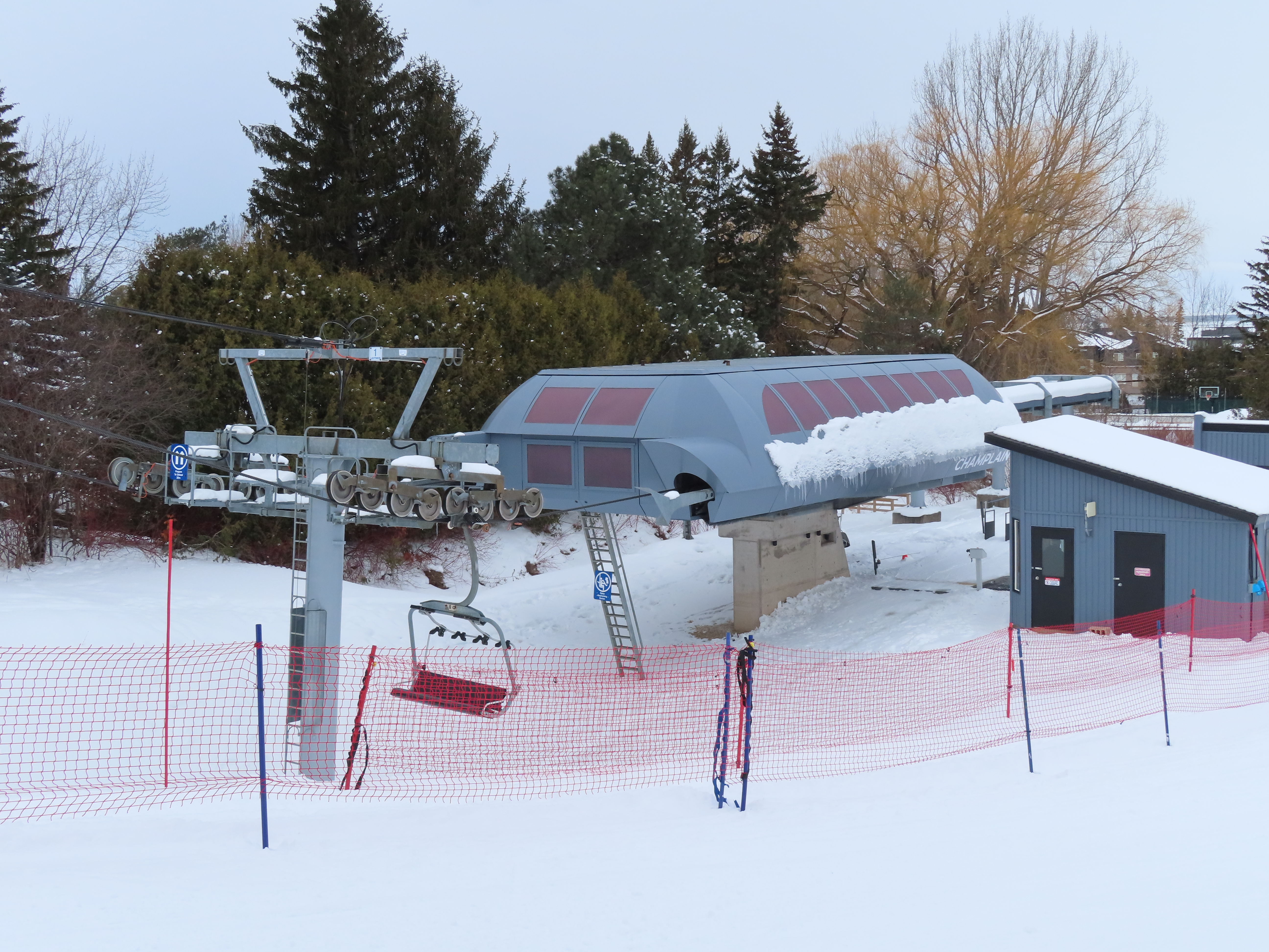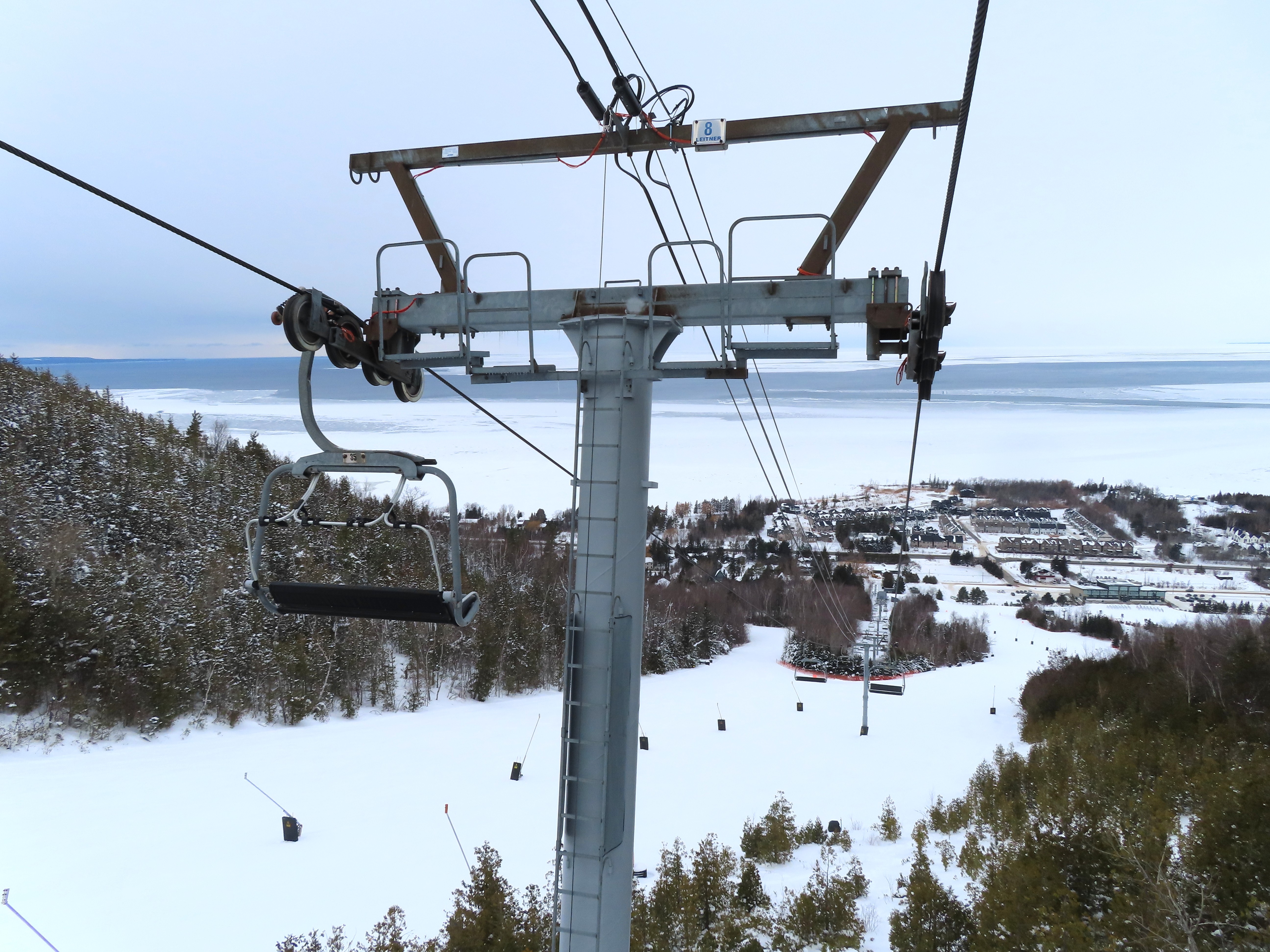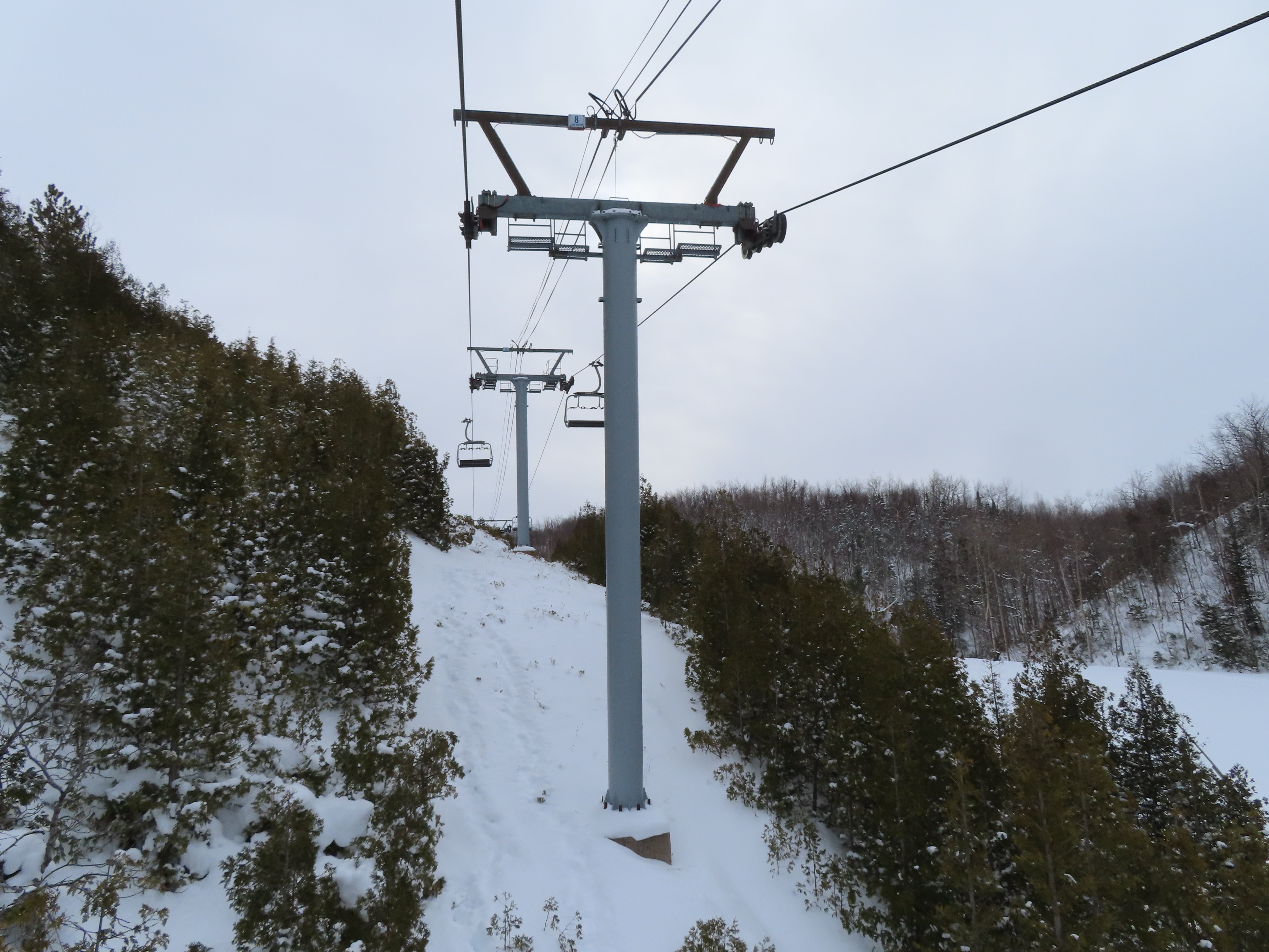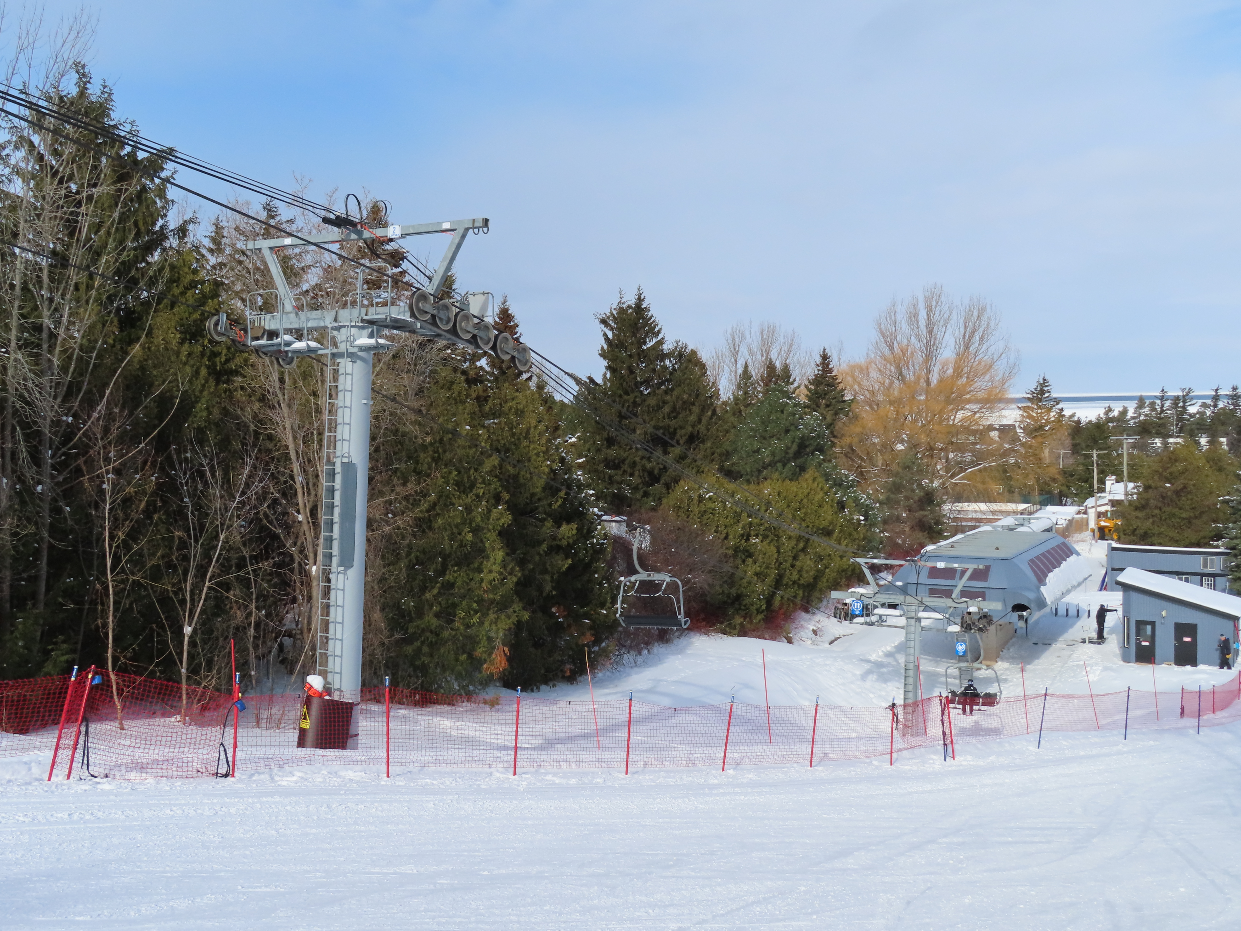 This base to summit detachable is one of just 10 built by Leitner in North America.The only Leitner detachable in Eastern Canada.Parking rail for all 40 chairs.This lift features relatively low capacity but high speed.Arriving at the return up top.A generator powers this station’s controls and tension system as no utility power reaches the top.Upgraded Leitner-Poma controls.Return bullwheel in action.Single tension cylinder in the top station.View from the summit.Middle part of the lift line.Riding up the line at tower 4.Galvanized chair with restraint bar and footrests.Tower 5.Towers 8 and 9.View back down the steepest part of the line.Tower 9.Monopod top station.Drive station with two diesel backups.Hanger and grip.Tower 10 with combination assemblies.Leitner Report entry.Page two of the Leitner Report entry from initial construction.