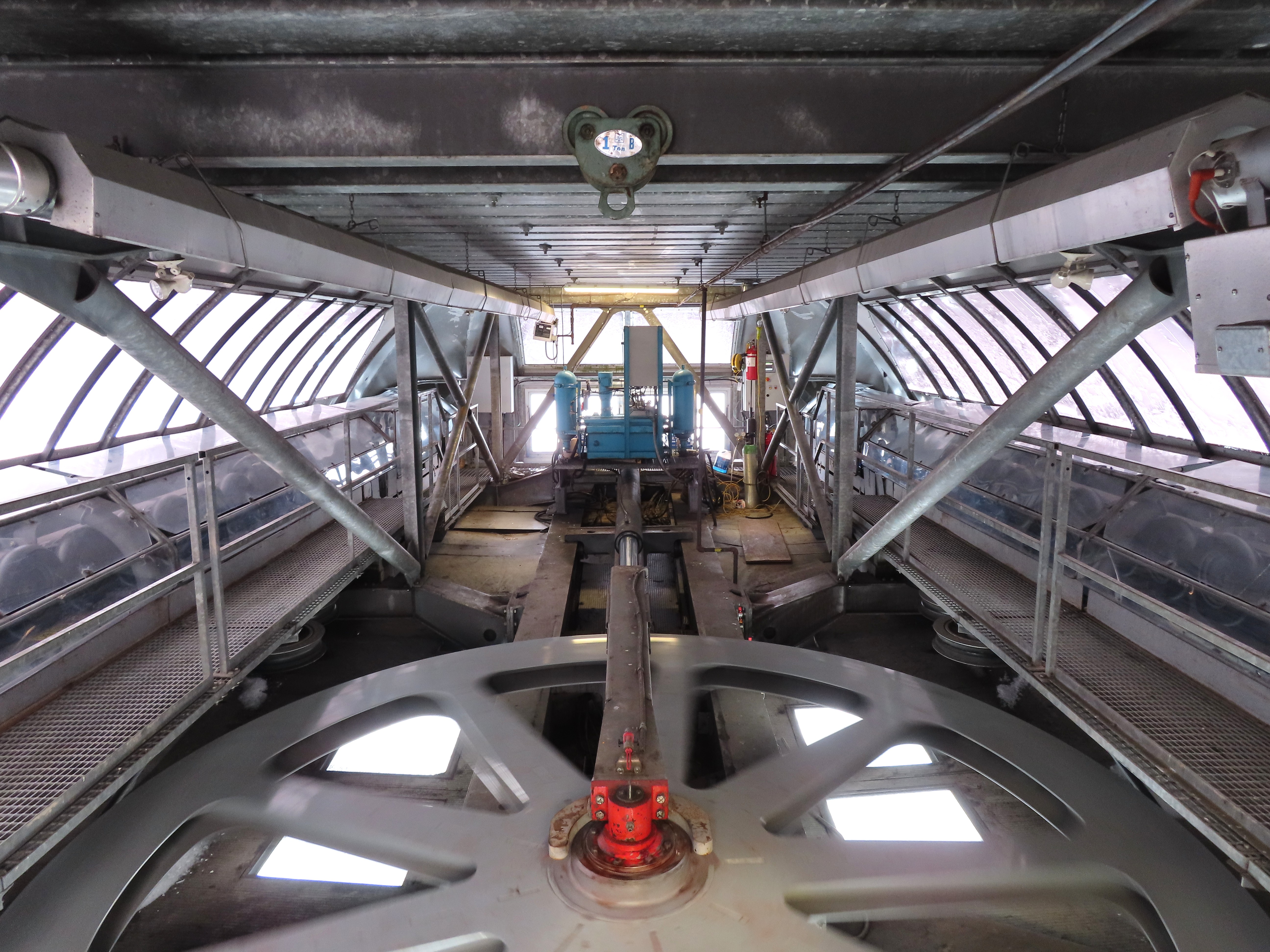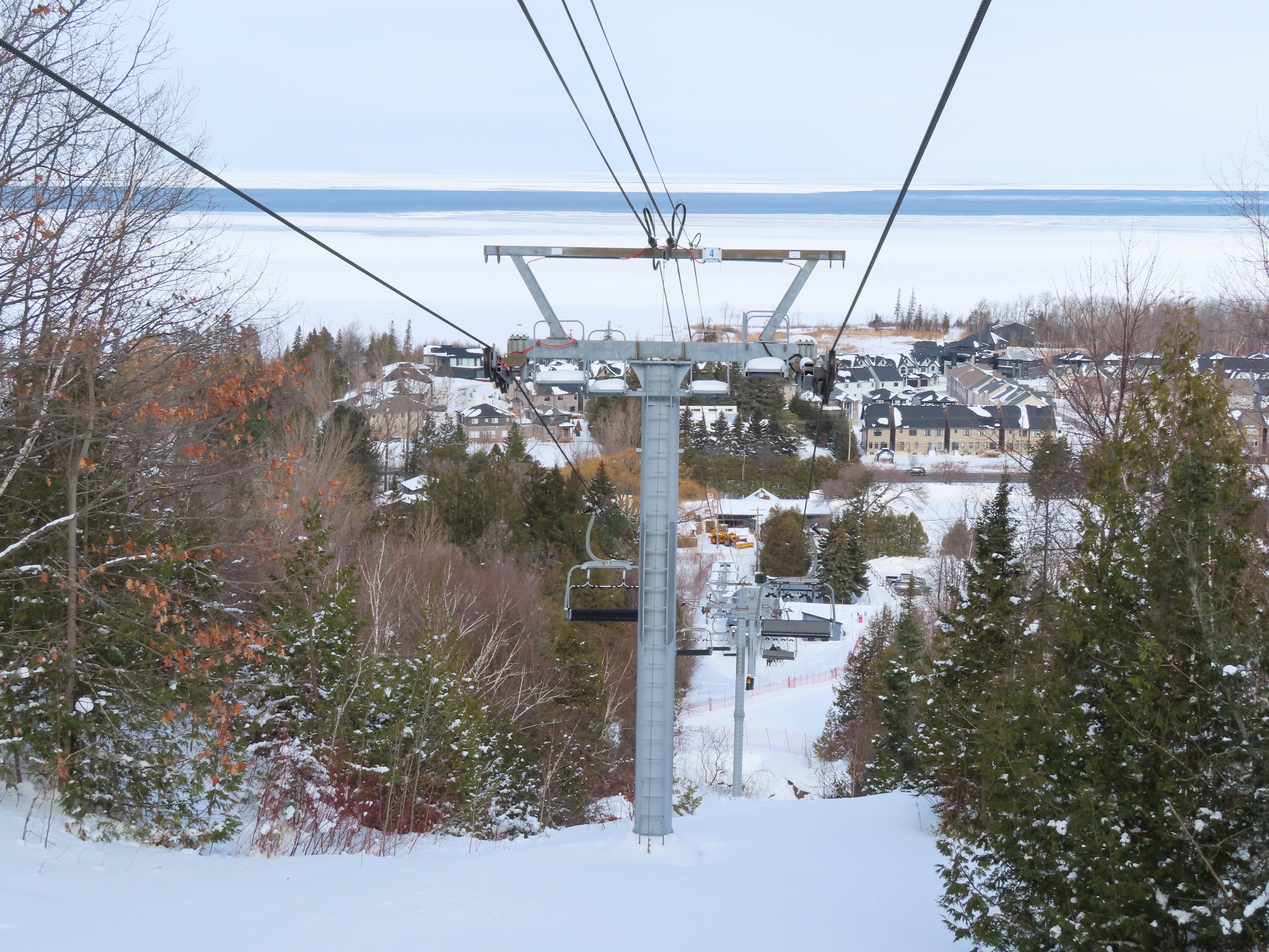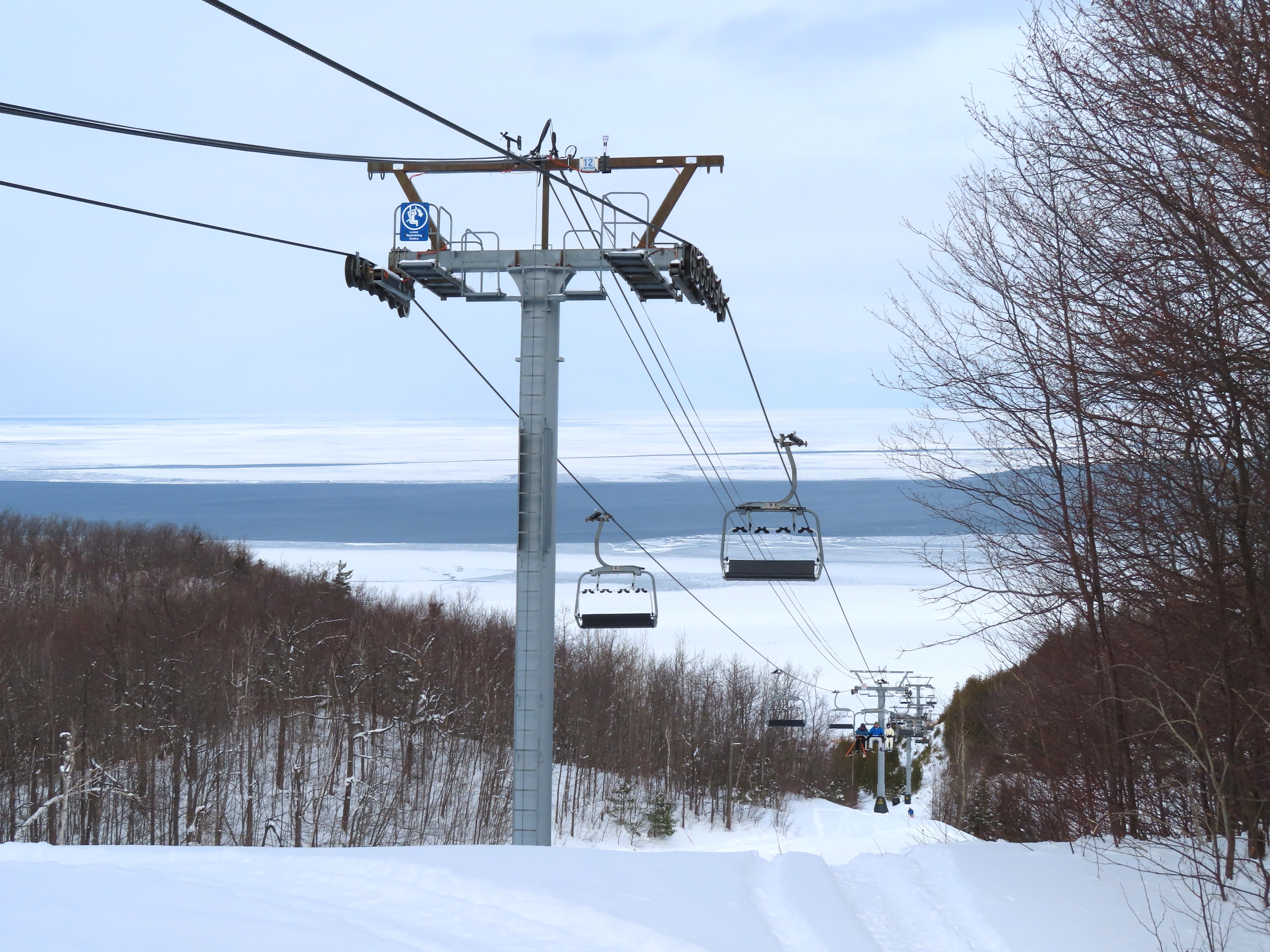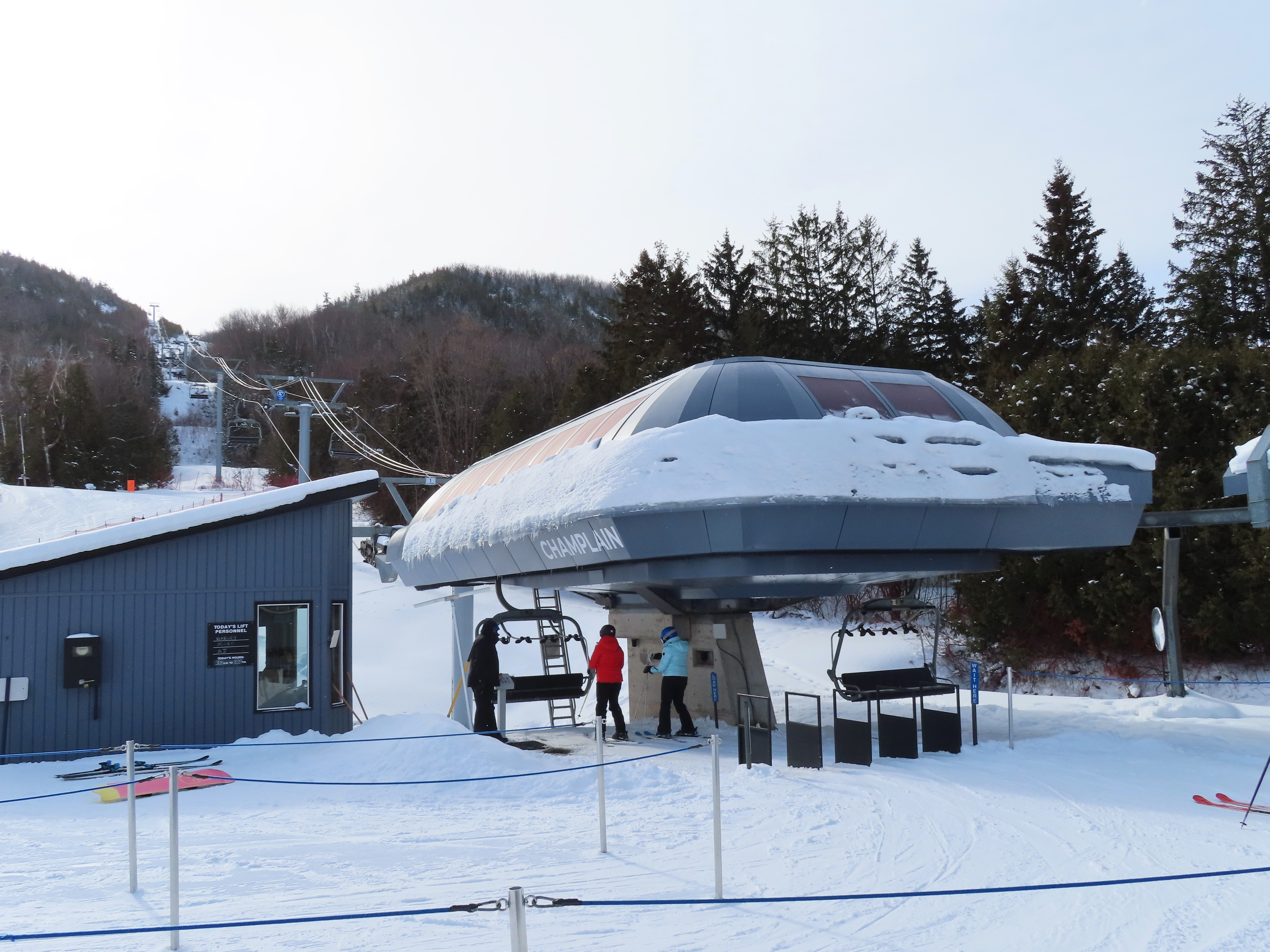 This base to summit detachable is one of just 10 built by Leitner in North America.The only Leitner detachable in Eastern Canada.Parking rail for all 40 chairs.This lift features relatively low capacity but high speed.Arriving at the return up top.A generator powers this station’s controls and tension system as no utility power reaches the top.Upgraded Leitner-Poma controls.Return bullwheel in action.Single tension cylinder in the top station.View from the summit.Middle part of the lift line.Riding up the line at tower 4.Galvanized chair with restraint bar and footrests.Tower 5.Towers 8 and 9.View back down the steepest part of the line.Tower 9.Monopod top station.Drive station with two diesel backups.Hanger and grip.Tower 10 with combination assemblies.Leitner Report entry.Page two of the Leitner Report entry from initial construction.