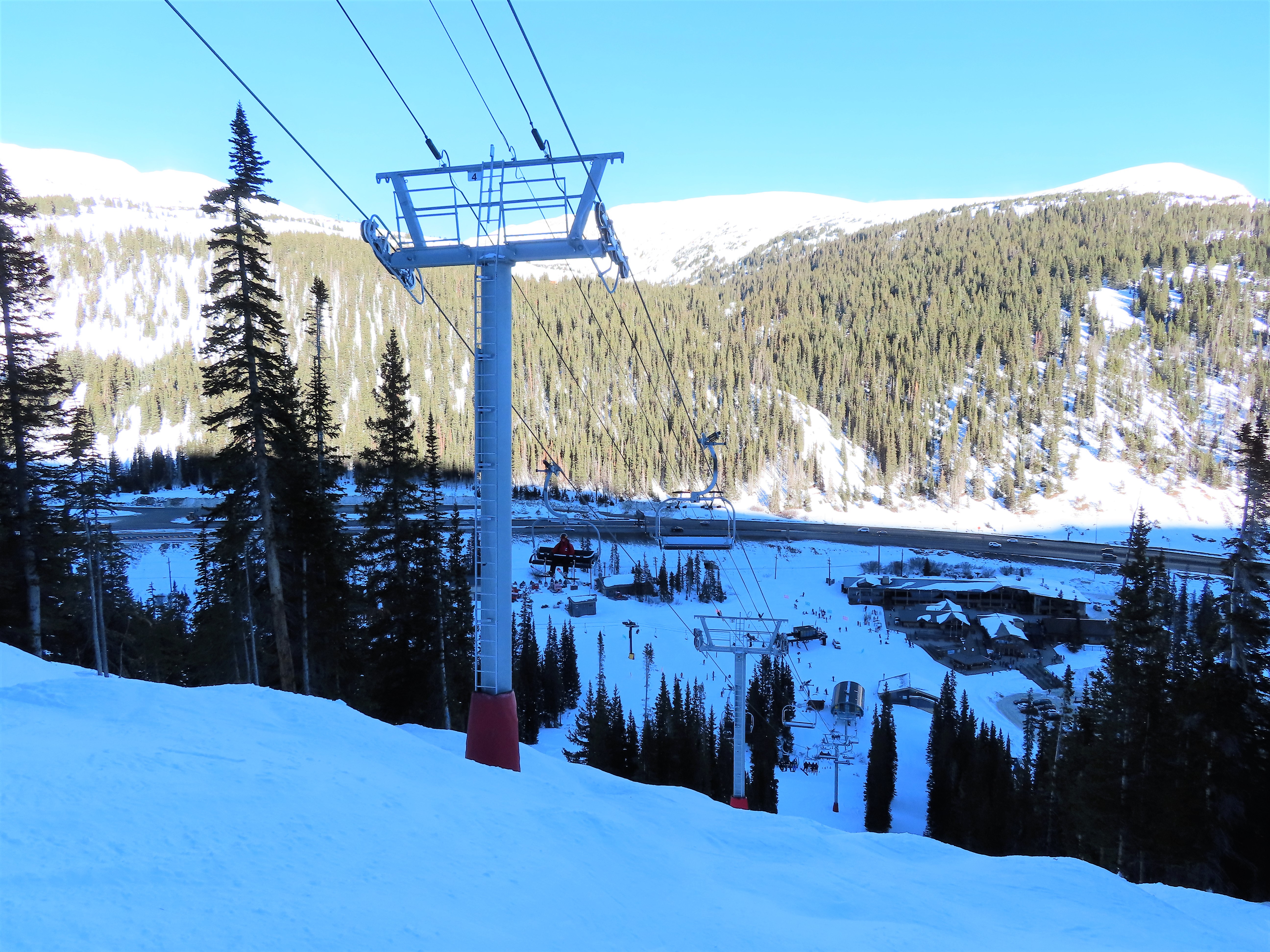 This Leitner-Poma detachable quad became the first high speed lift at Loveland in 2018.It replaced a Yan triple known as Chair 1.Tower 2.A three section tower.The lift line is short and steep with a ride time under five minutes.Tower 7 near the summit.Arriving at the return terminal.Side view of the top station.View up the lift line at tower 6.Lower lift line.T4.Tower 1 and the drive station.Loading area and maintenance rail.Side view of the top terminal.The entire lift line.Another view of the bottom station.