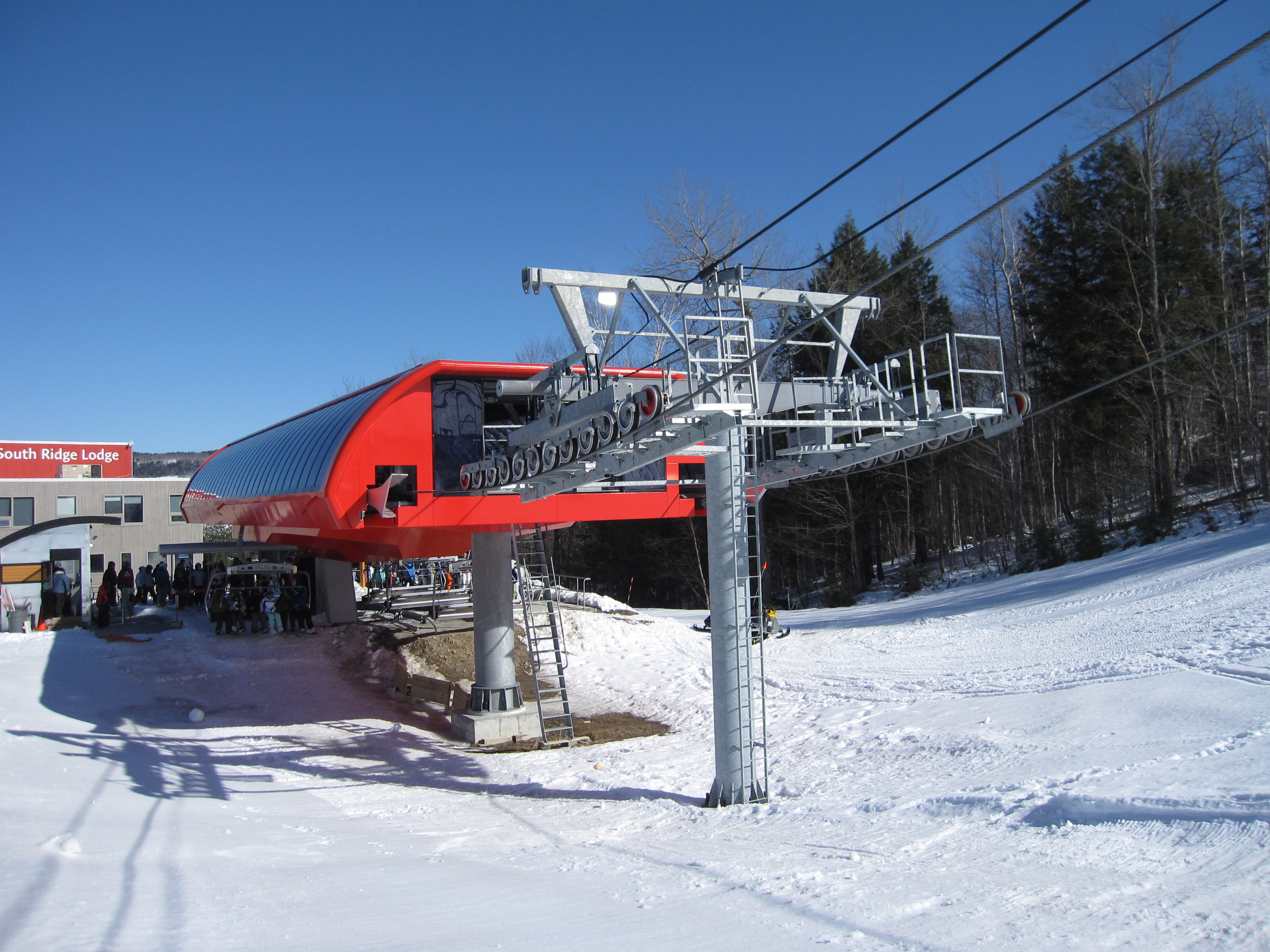 Bottom terminal at South Ridge.Riding up near the base.View up the line.Doppelmayr European-style tower.Top terminal arrival side.Unloading area.View down the line.Bottom terminal from above.Another view of the bottom station.Underside of the Uni-G station.Cabin parking facility, if you can call it that.Chair side unload ramp.Side view of the drive station.