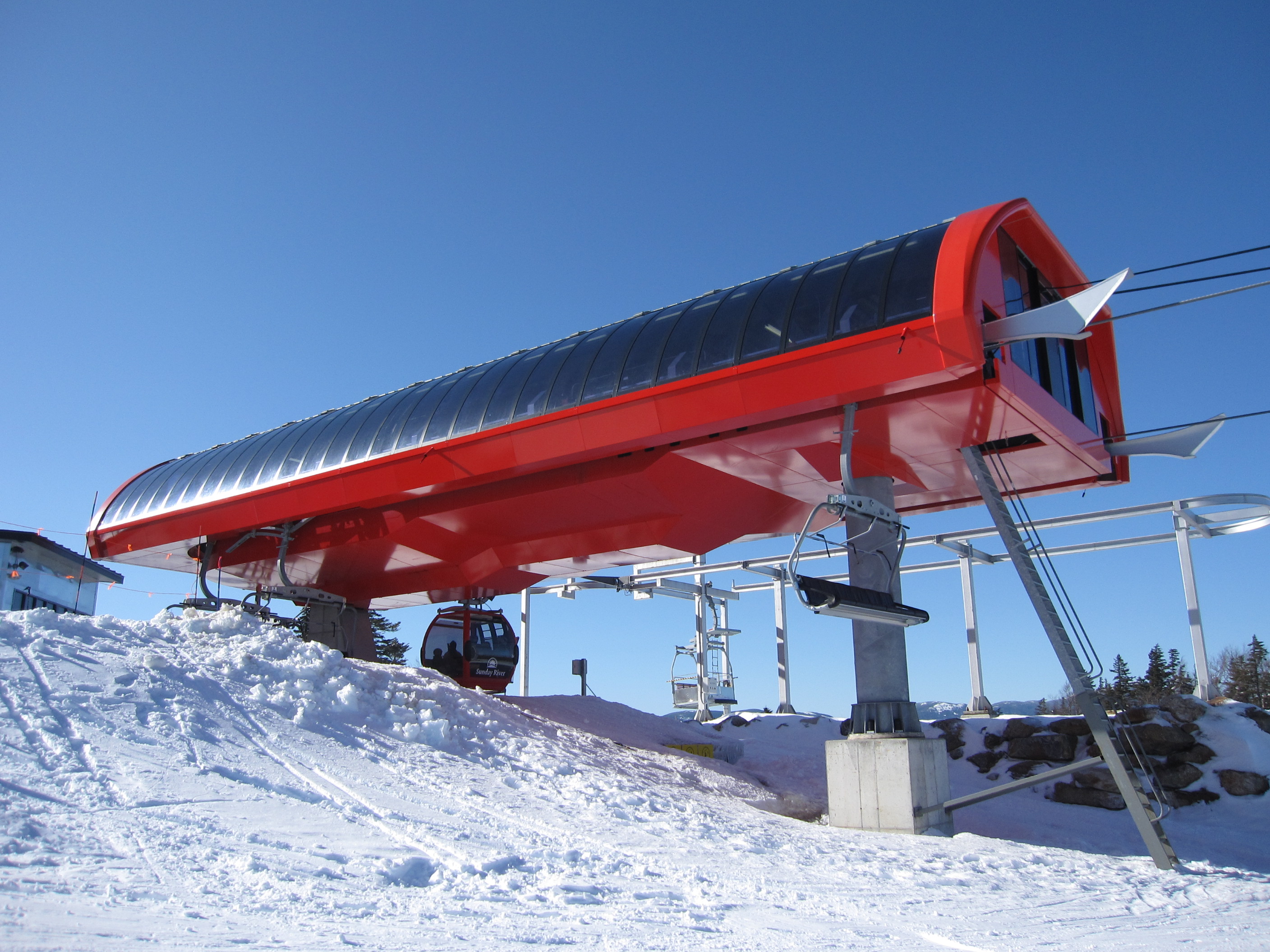 Press release says the derailment was because of high wind. The lift was being run at slow speed when the incident happened. take a look at Photo #5 of Chondola Sunday River pics to see how the lift cable feeds into the top terminal. The lift was being run at low speed to minimize the swinging of the gondola cabins, but the cabin still swung too much and hit the cable feed rails. (if i read the Press Release correctly)