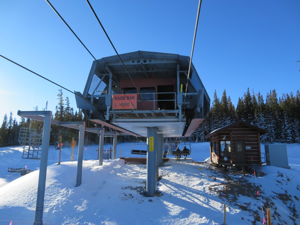 Upper lift line view.Middle part of the line.Lower lift line.Garaventa CTEC re-used Doppelmayr tower tubes from the previous Doppelmayr triple chair called Stump Park.Stealth return station.Bottom terminal and lift line.The tower tubes were reused from a previous Doppelmayr fixed-grip.Arriving at the drive.Unloading ramp.View down the upper part of the line.Middle section.Top terminal with maintenance rail.