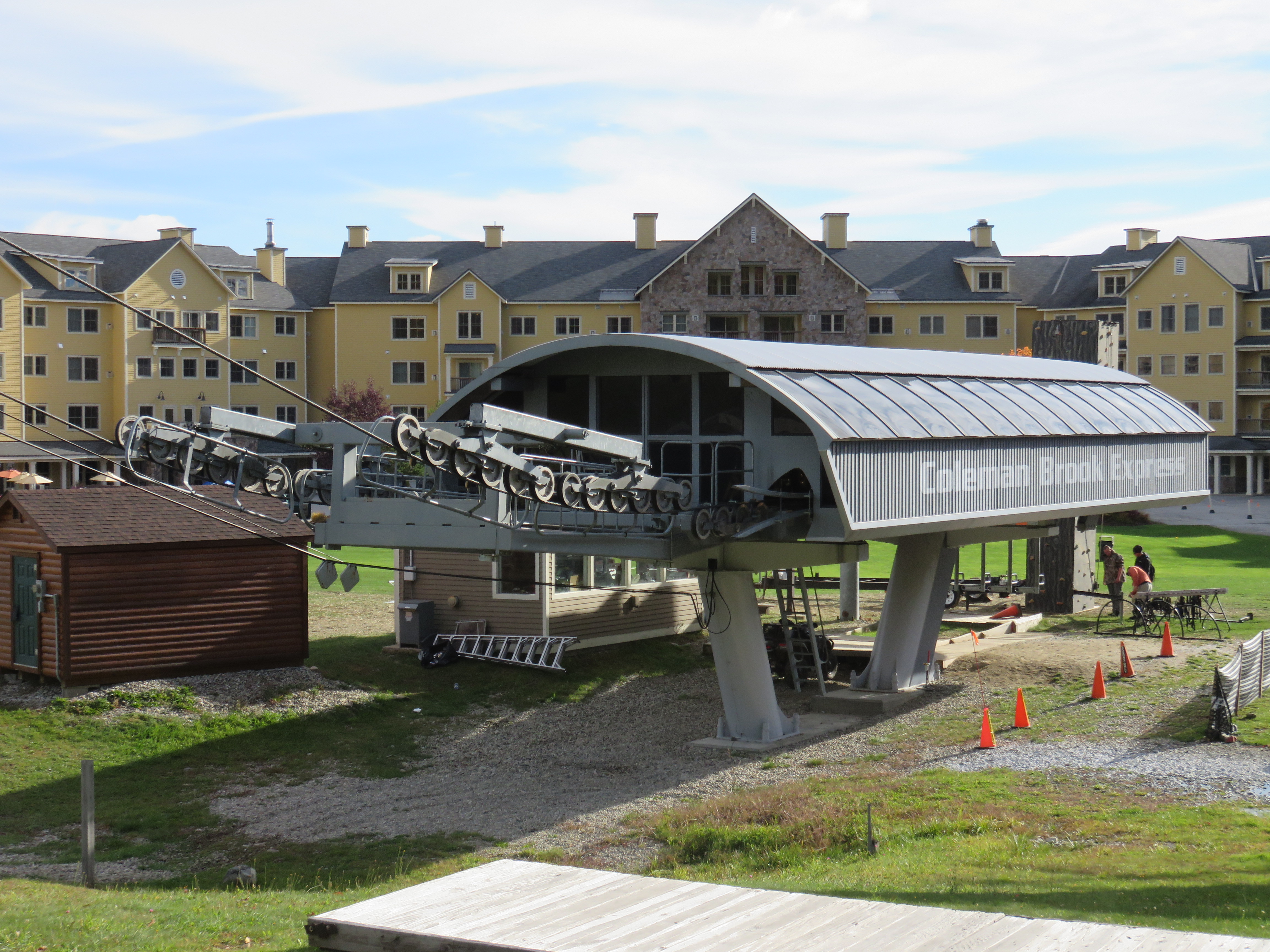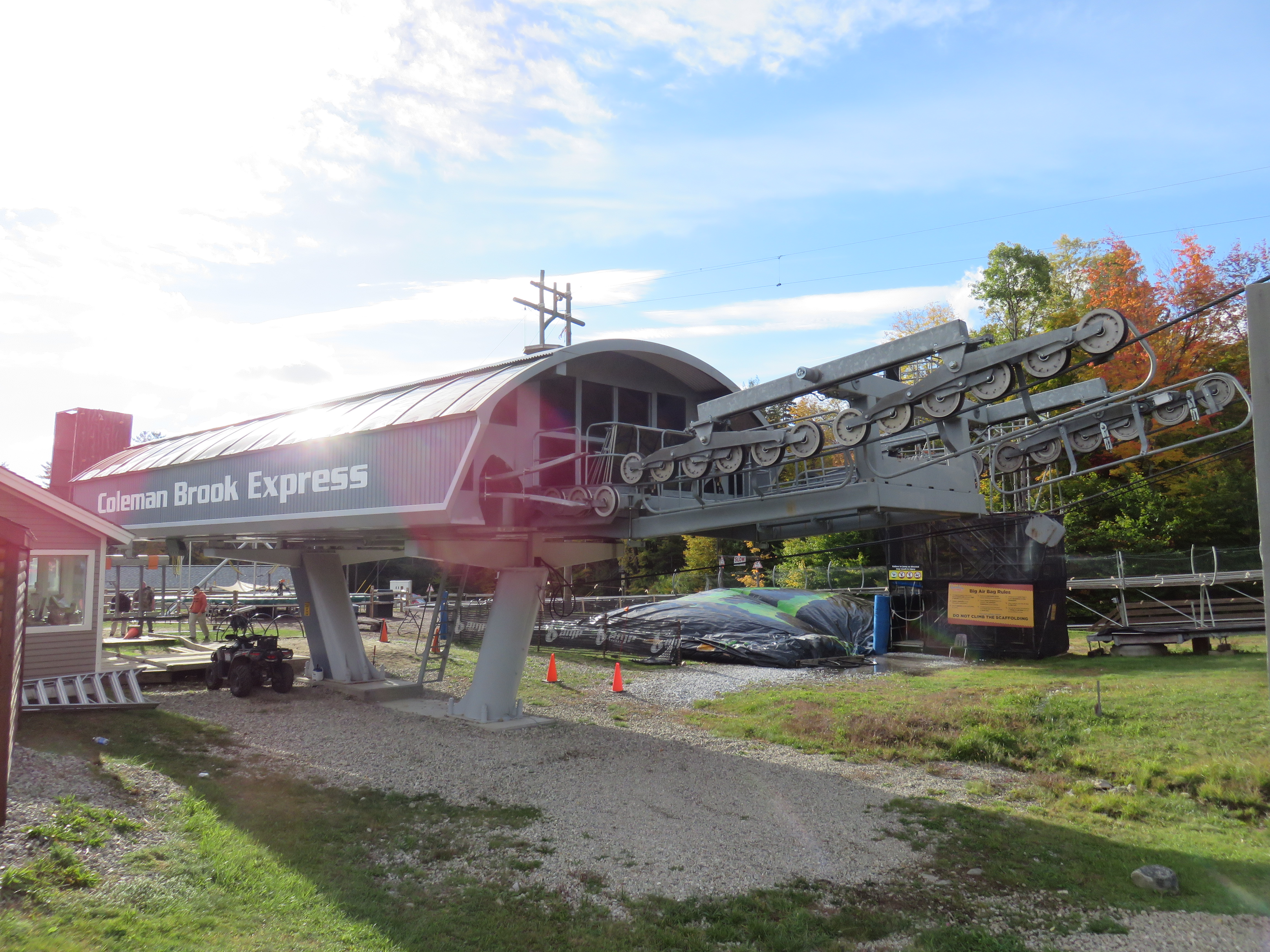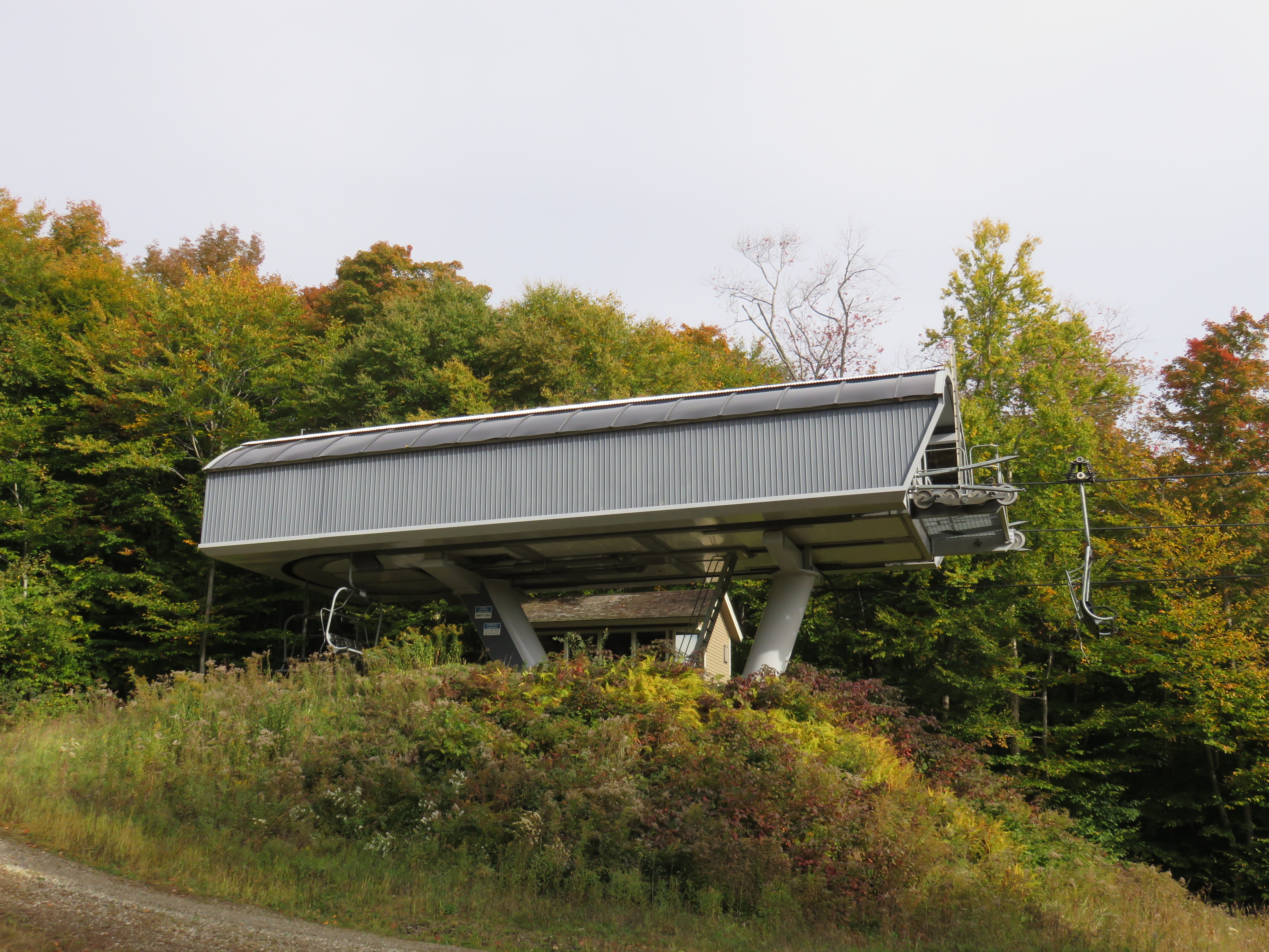 Top station with drive.View down from the summit.Drive station side view.View up the line.This is one of the only lifts in the US that crosses over active railroad tracks.Lower terminal at Jackson Gore.Leitner-Poma Omega return station.Loading area in winter.
