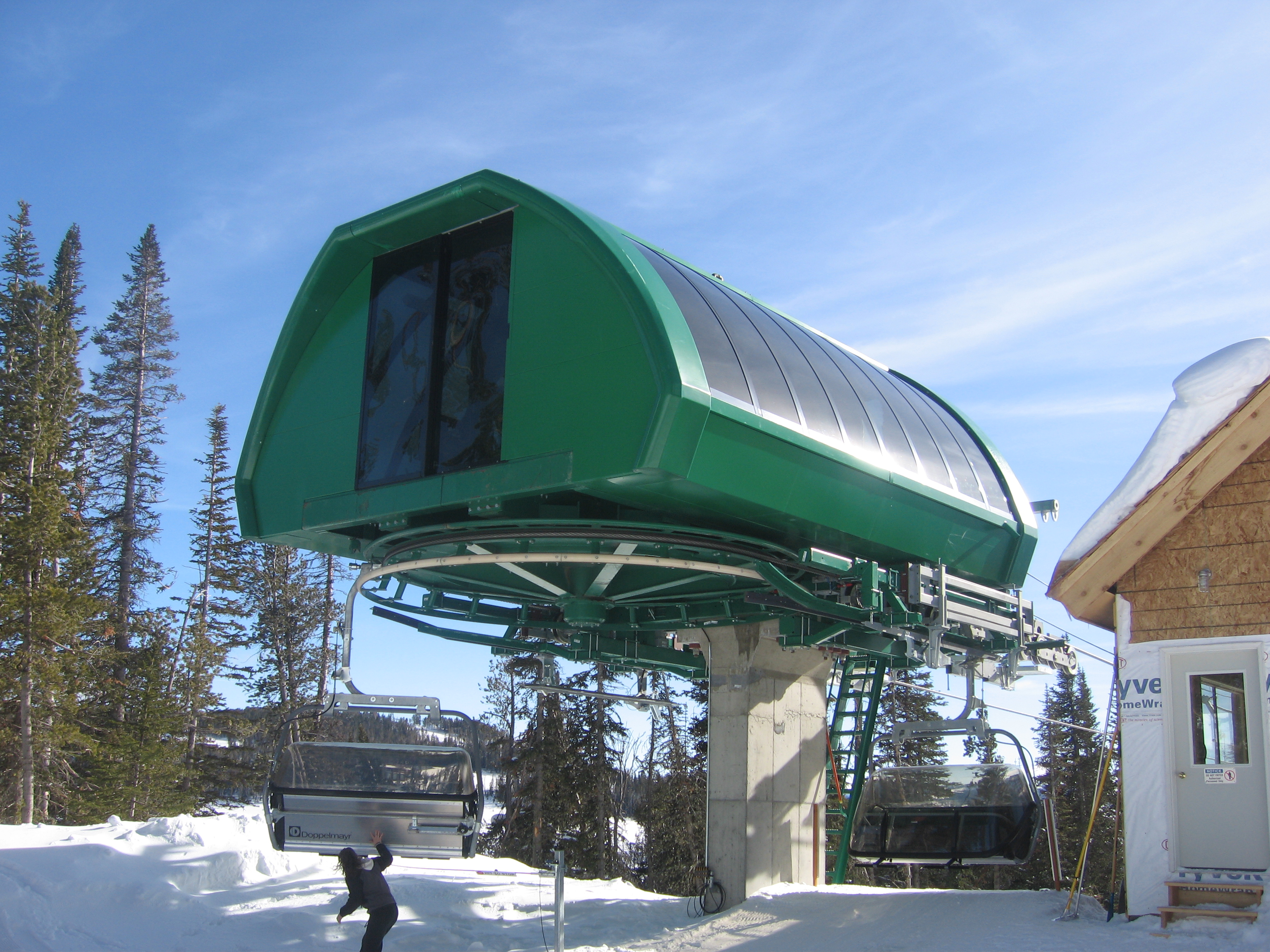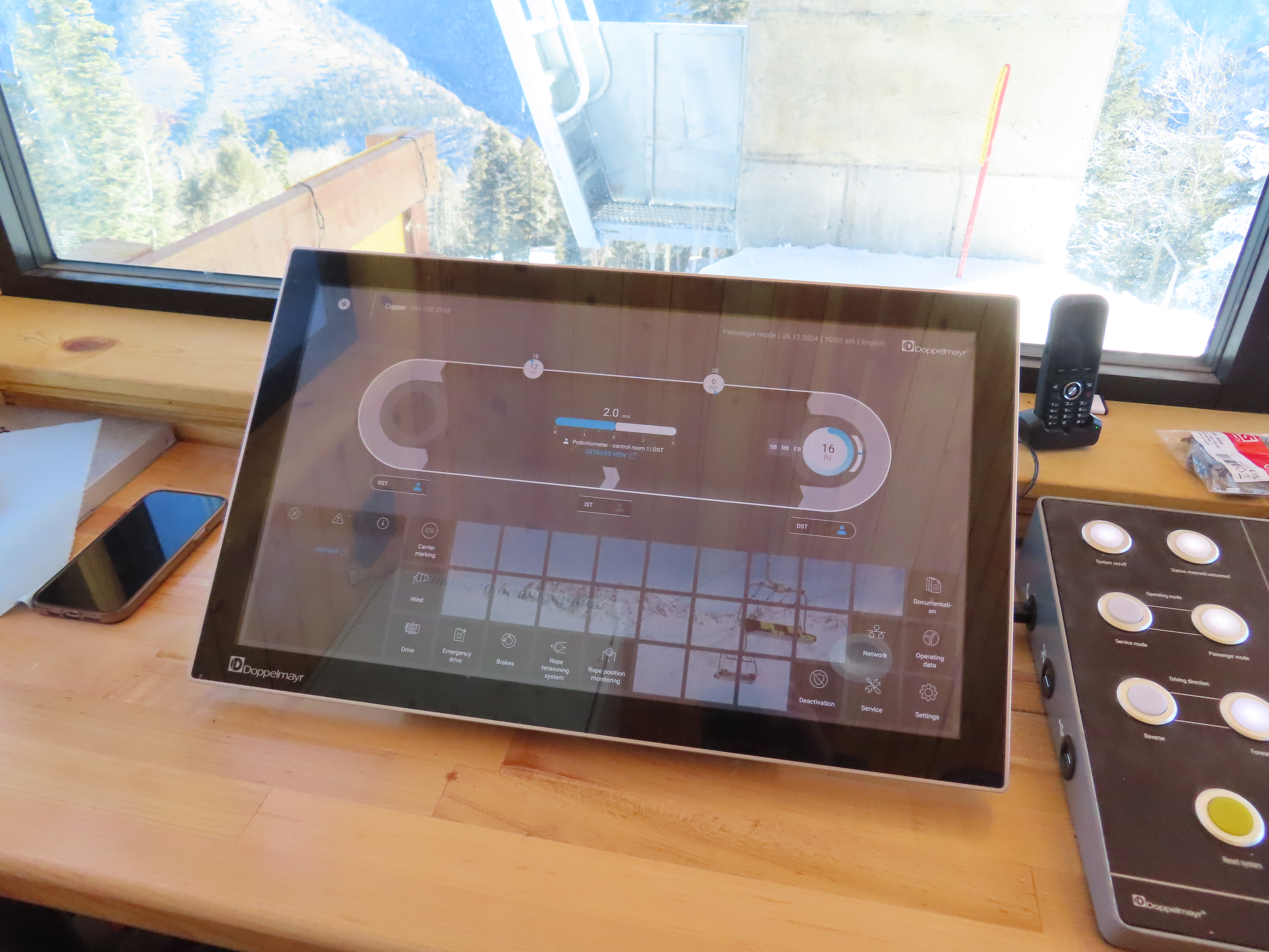 That touchscreen says the lift is running at 2 m/s, which is below the overview table’s suggested line speed of 500 ft per minute (need 2.5 m.s for that) for a ride time of of 11.6 minutes. That’s still not bad for almost 1,500 feet of skiing back down! One wonders if they could routinely run it at even 450 ft per minute? It’d save 1.3 minutes :)