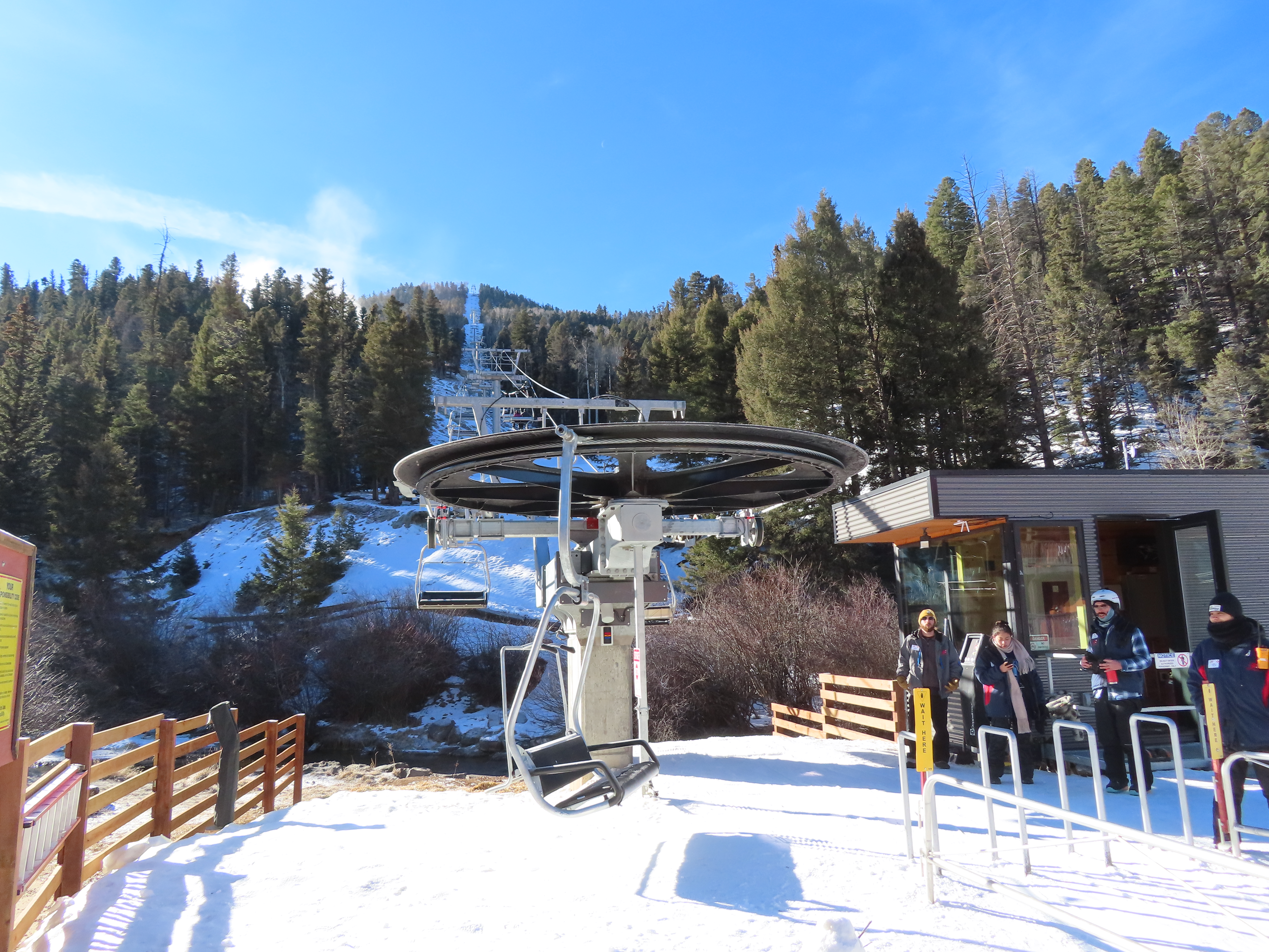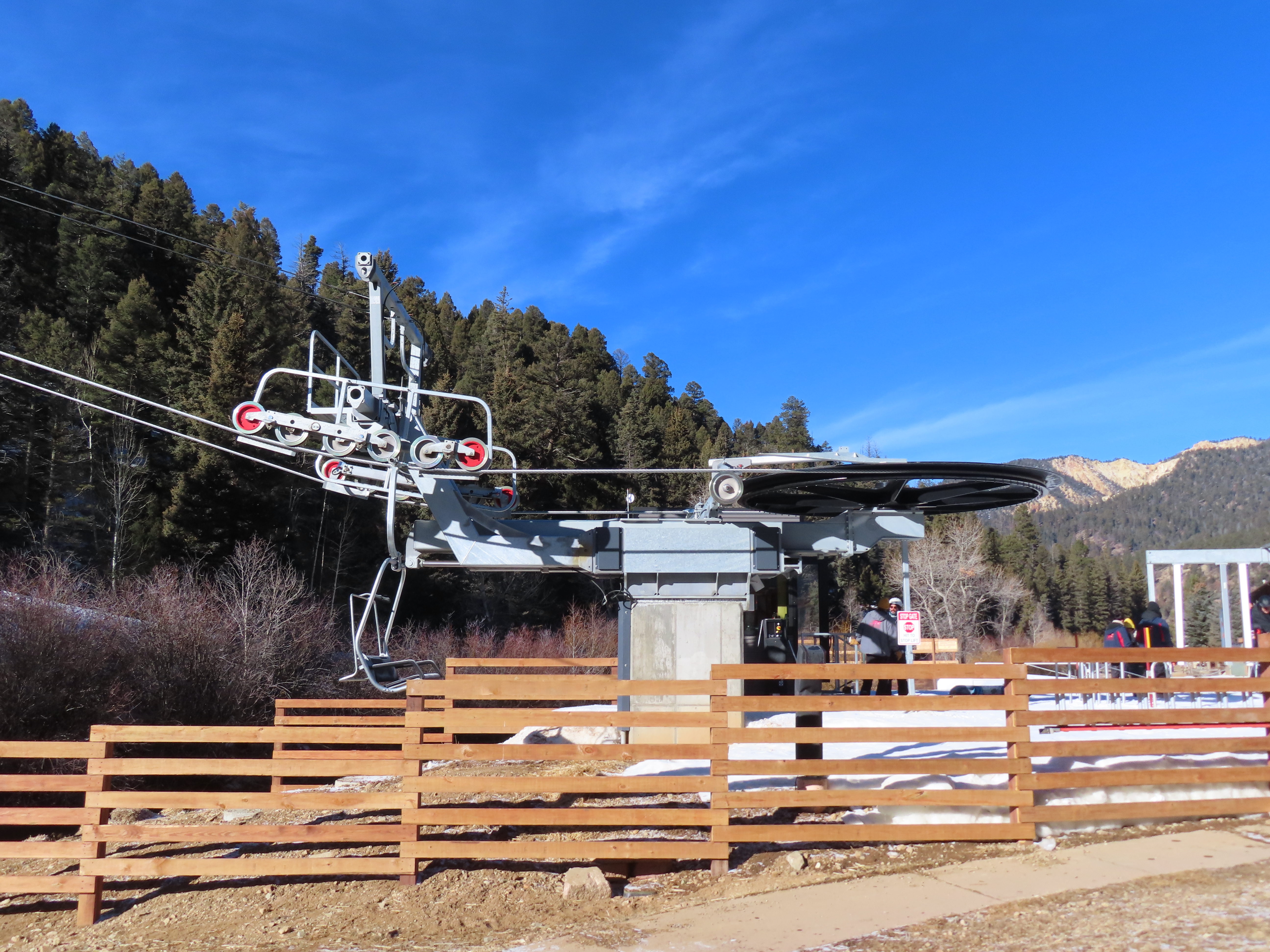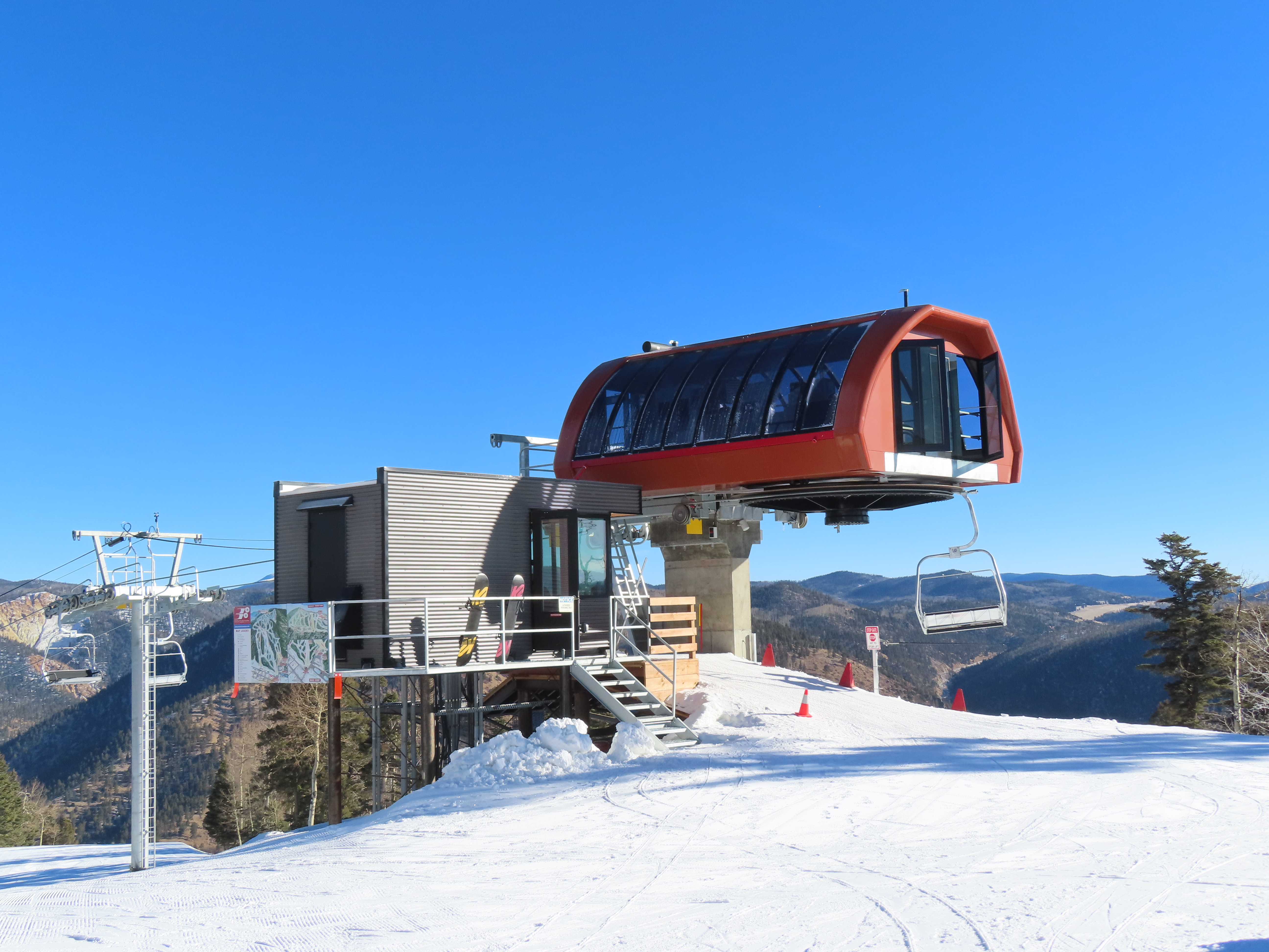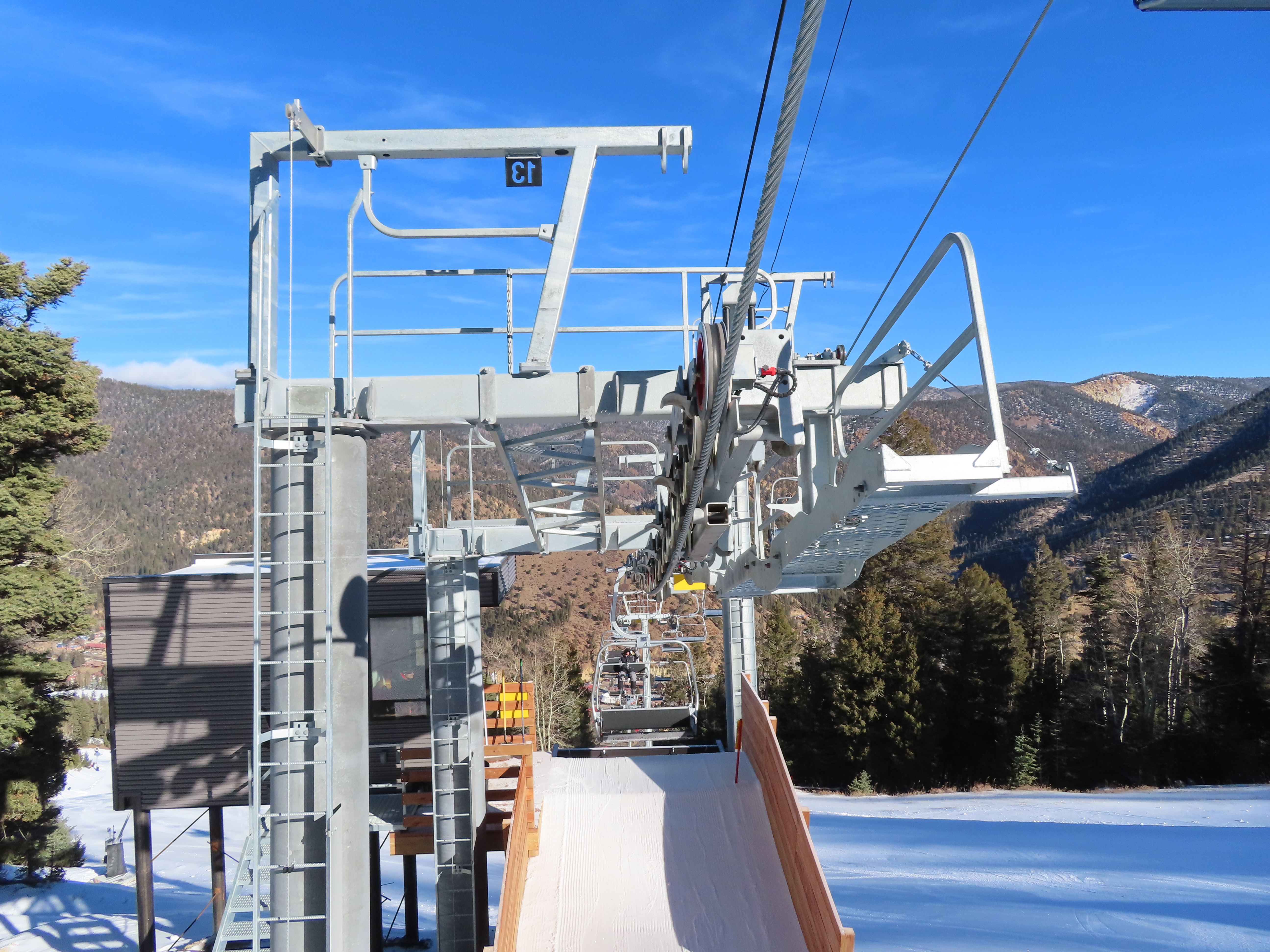 This top drive triple replaced a Riblet double relocated to Red River in 1993.The unloading area and motor room.View from the summit.Rare large, fixed drive terminal.The line splits height at a middle unload station.Return terminal.Station with hydraulic tensioning.Side view of the base terminal.Lift overview.The lift crosses the Red River just after boarding.Tower 4.Riding up the line.Nearing the middle station.Beginners can offload here.Half tower 13.View back down the long line.Nearing the summit.Tower 18.View back down near the top of the lift.Arriving at the drive, located at over 10,000 feet.Doppelmayr Connect touchscreen.Operator controls.Another view of the drive.Middle station with split and half towers.Looking up at the mid unload.Tower 10.Tower 1.View up the line at tower 2.Middle section of the line.Combo assemblies on tower 6.Another view of the mid station.Top station next to sister Doppelmayr triple chair Platinum.