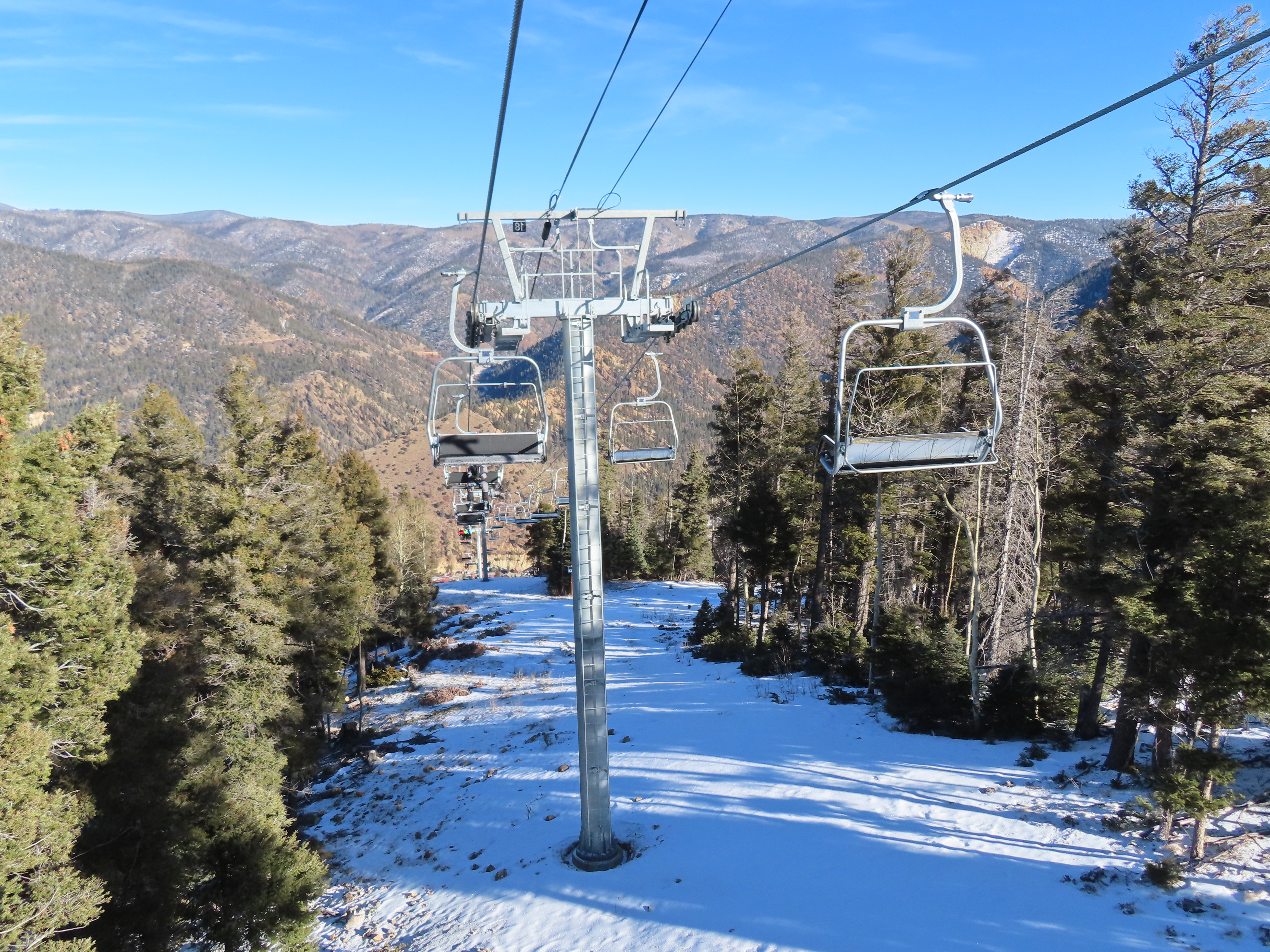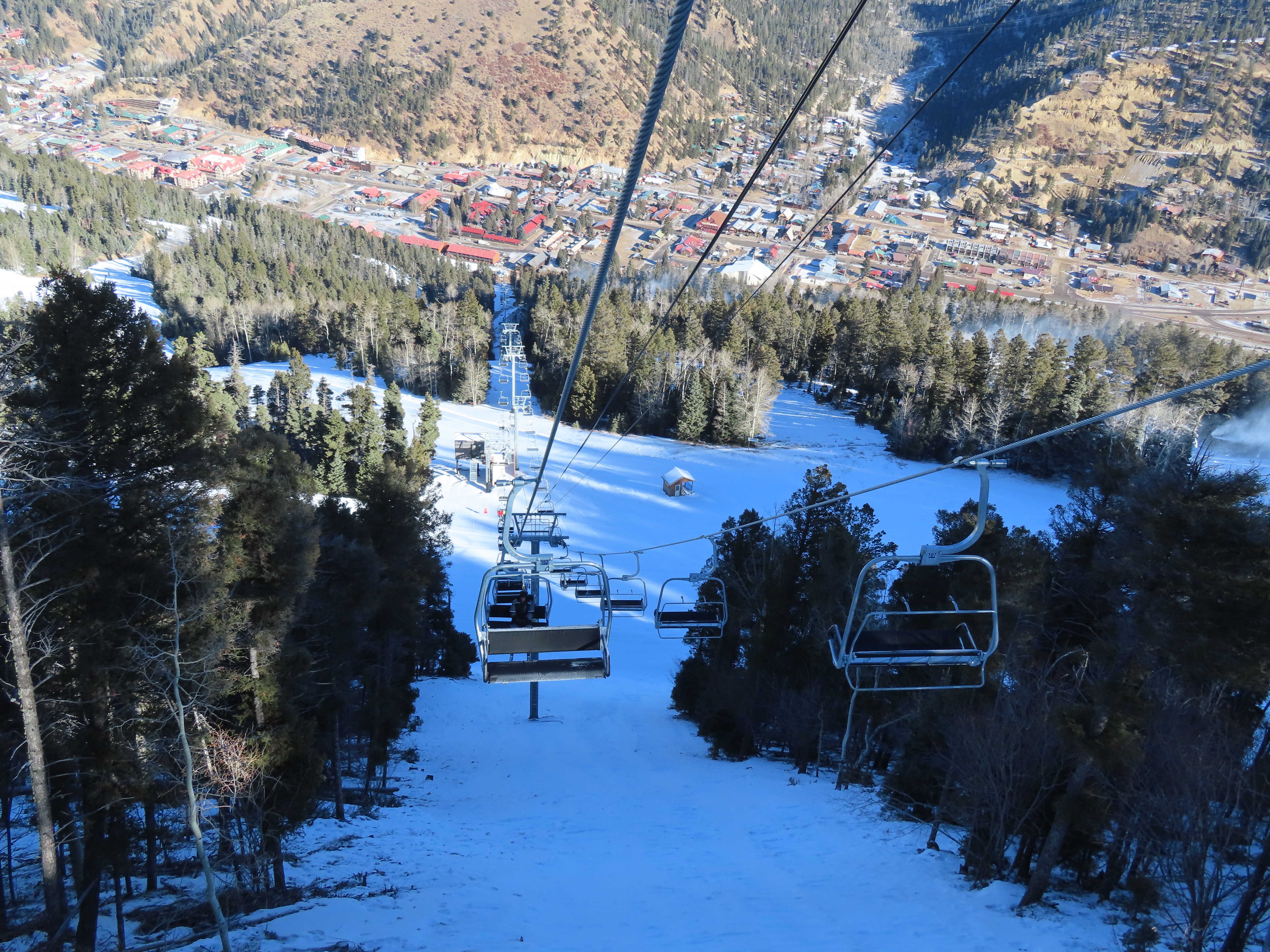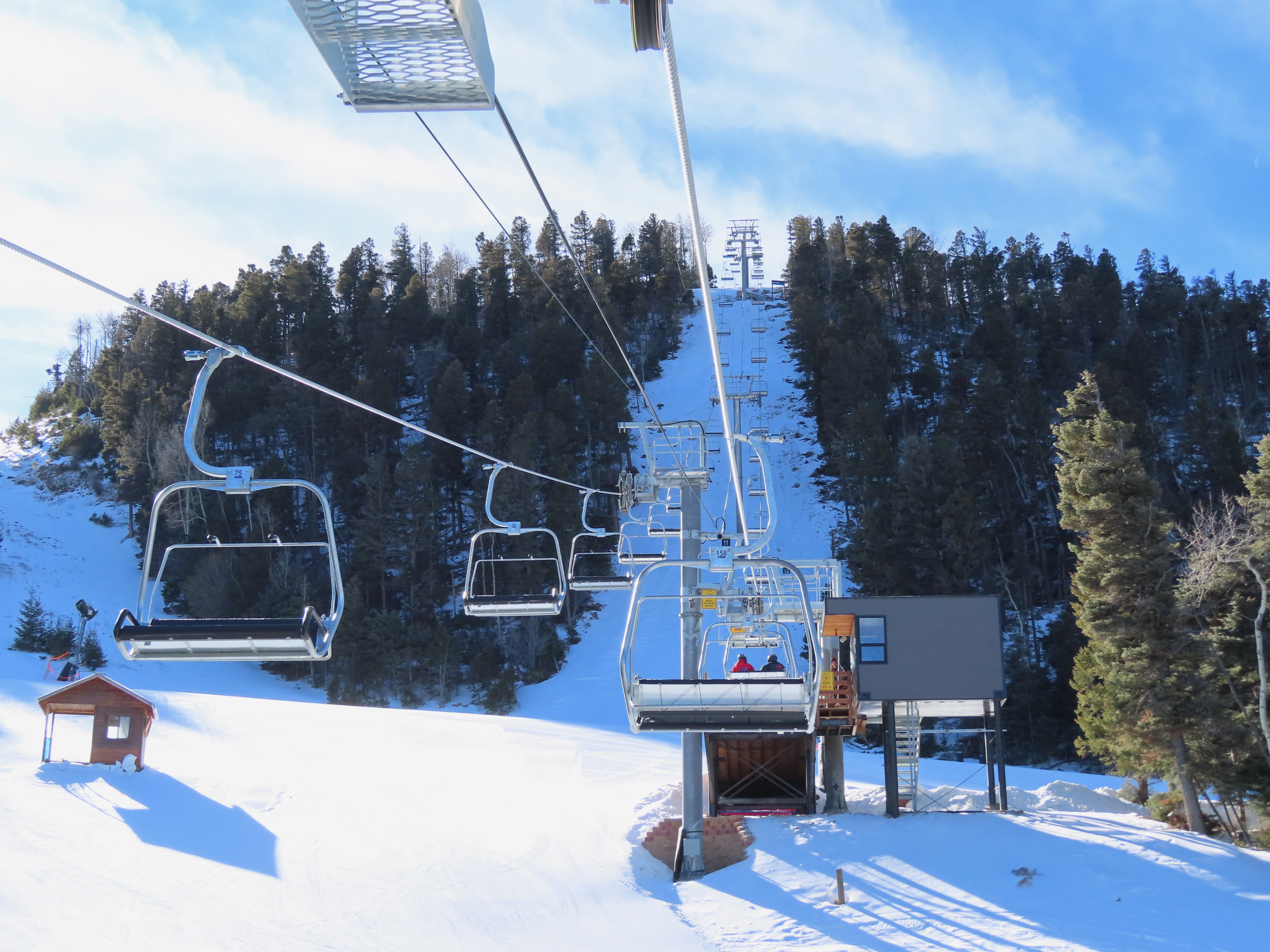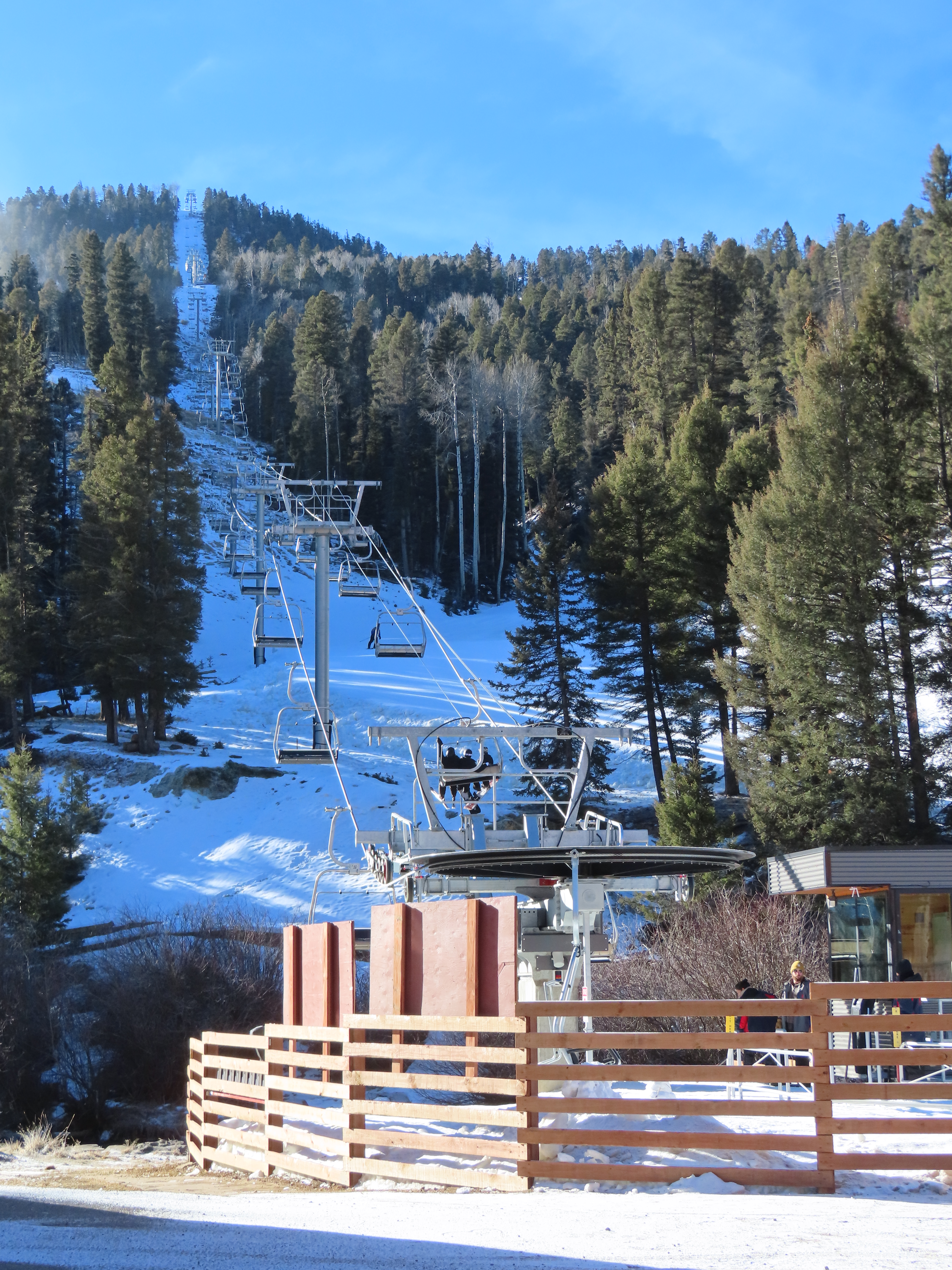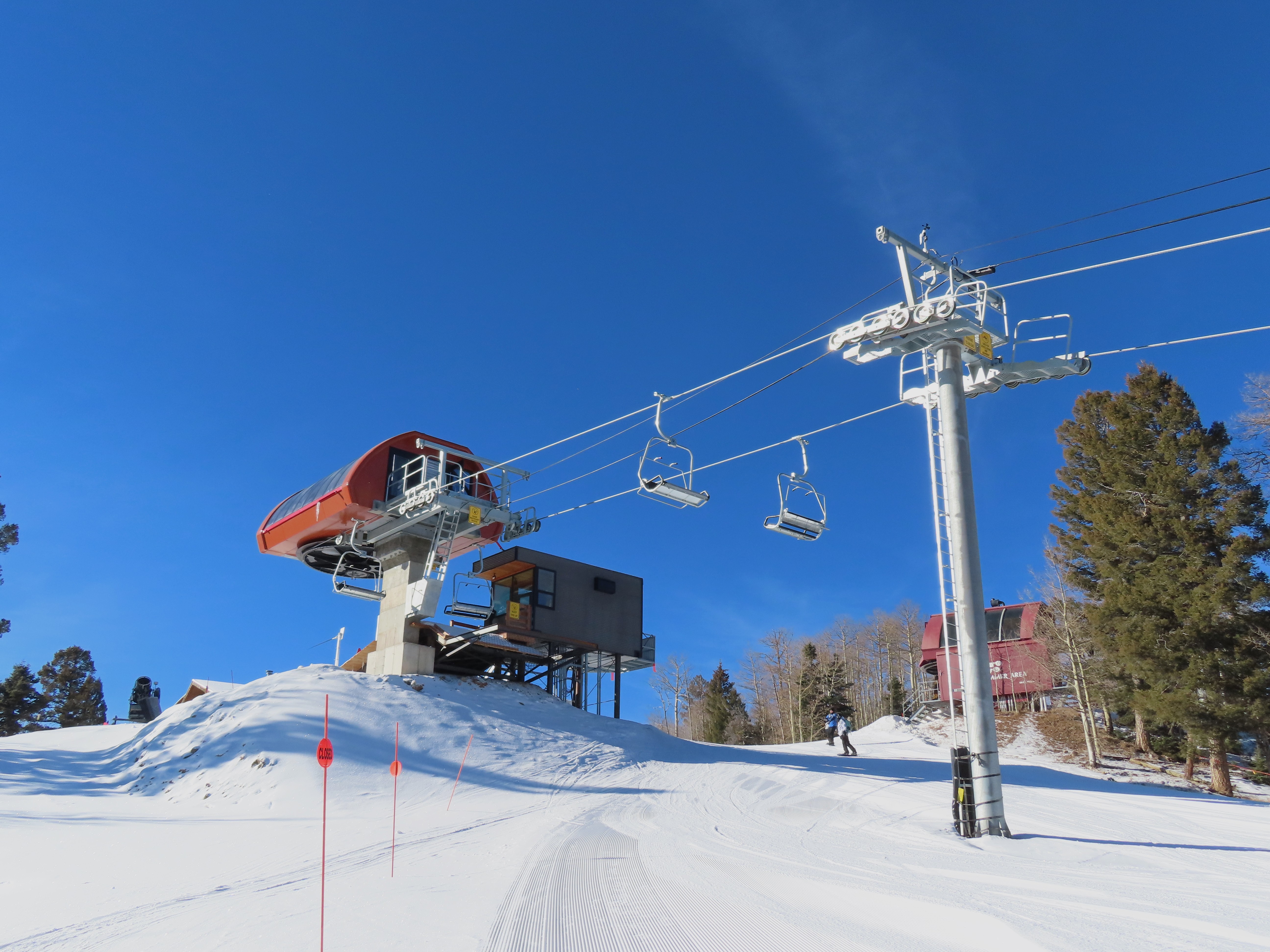 This top drive triple replaced a Riblet double relocated to Red River in 1993.The unloading area and motor room.View from the summit.Rare large, fixed drive terminal.The line splits height at a middle unload station.Return terminal.Station with hydraulic tensioning.Side view of the base terminal.Lift overview.The lift crosses the Red River just after boarding.Tower 4.Riding up the line.Nearing the middle station.Beginners can offload here.Half tower 13.View back down the long line.Nearing the summit.Tower 18.View back down near the top of the lift.Arriving at the drive, located at over 10,000 feet.Doppelmayr Connect touchscreen.Operator controls.Another view of the drive.Middle station with split and half towers.Looking up at the mid unload.Tower 10.Tower 1.View up the line at tower 2.Middle section of the line.Combo assemblies on tower 6.Another view of the mid station.Top station next to sister Doppelmayr triple chair Platinum.