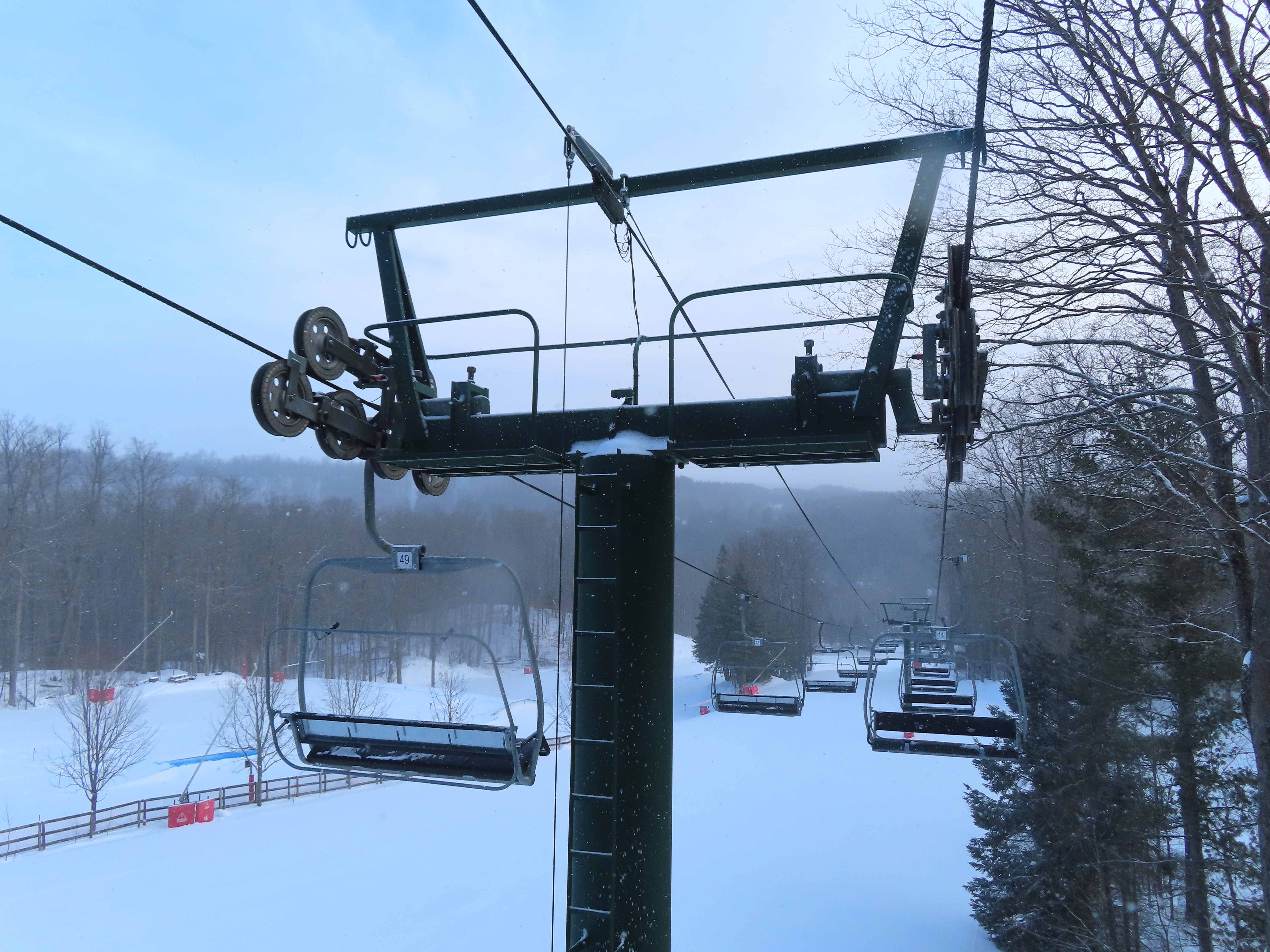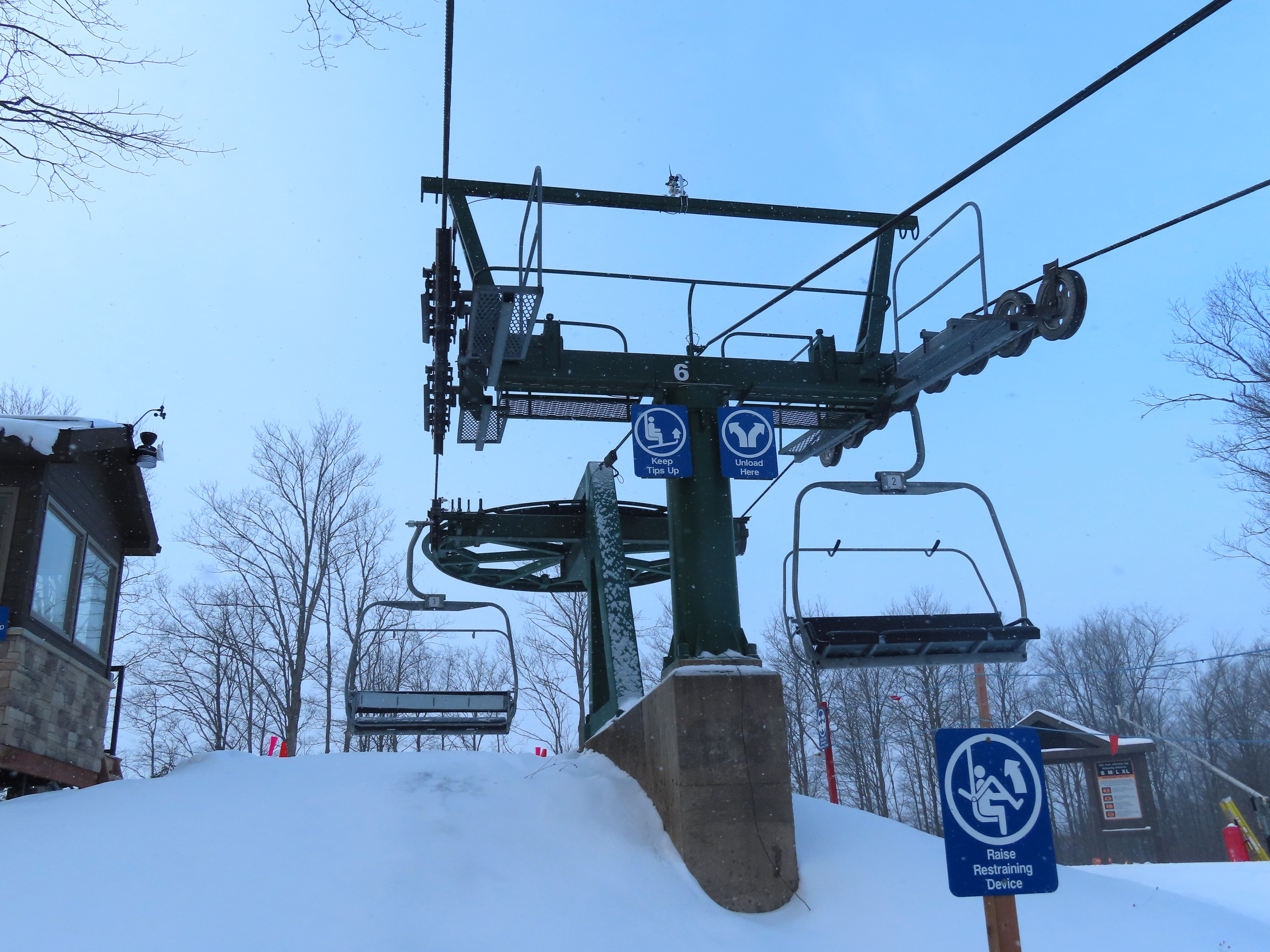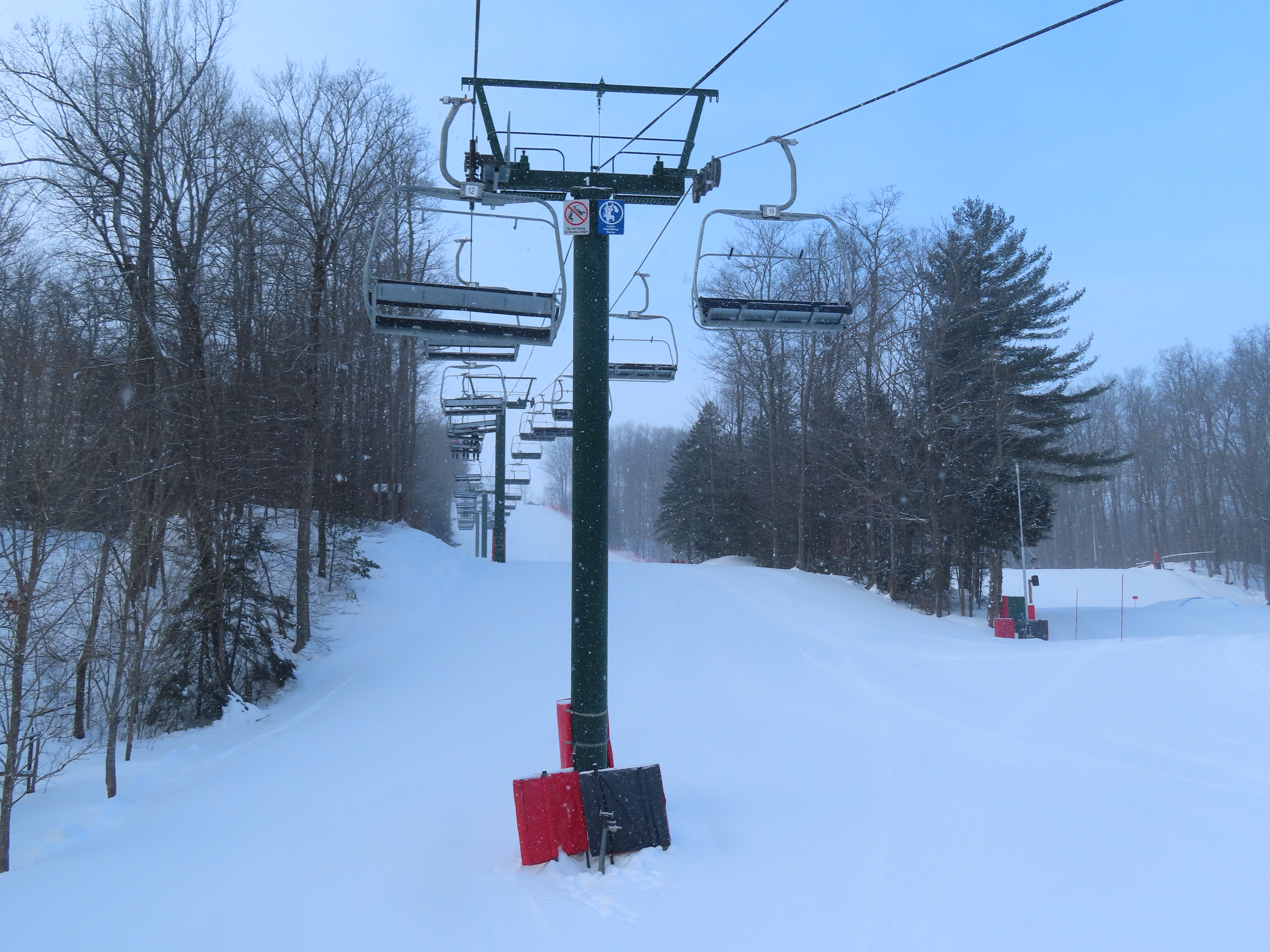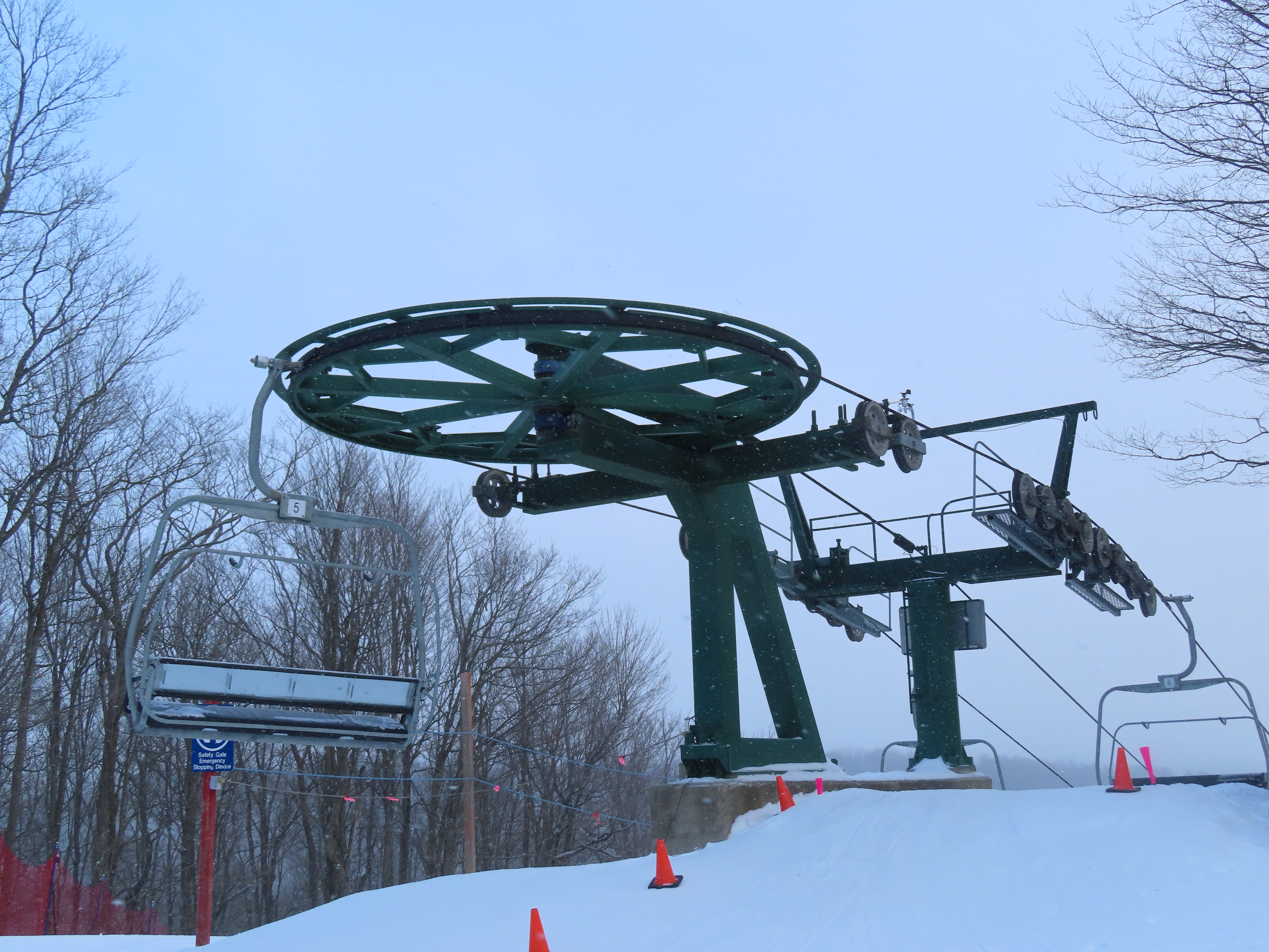 This is the last remaining of several Blue Mountain lifts built at Caledon.Lift overview.Arriving at the top terminal.Return bullwheel at the summit.This lift mostly services a terrain park.View down the line.Upper lift line.Tower 1 and the bottom station.View riding up.A tower head with combination assemblies.
