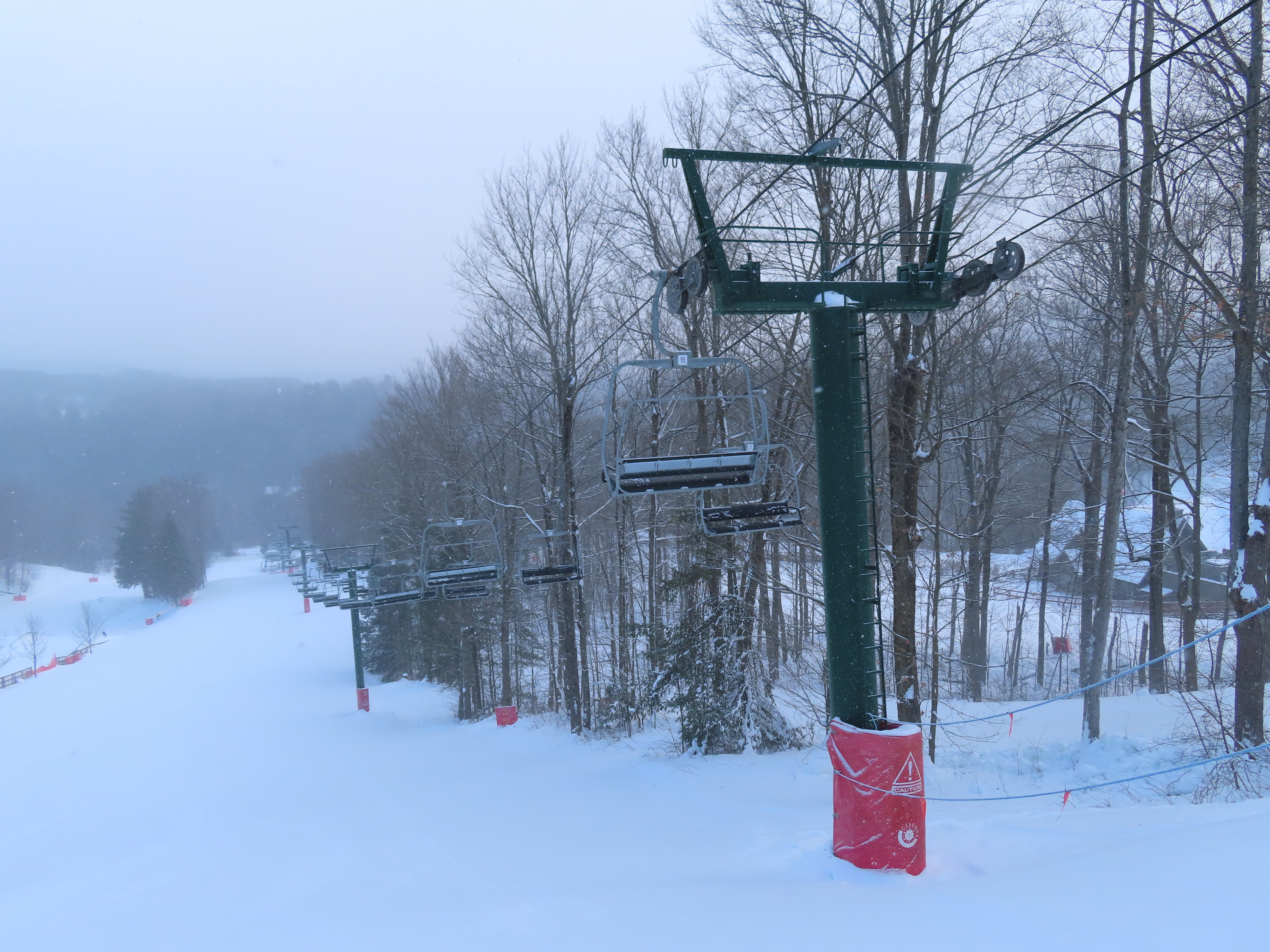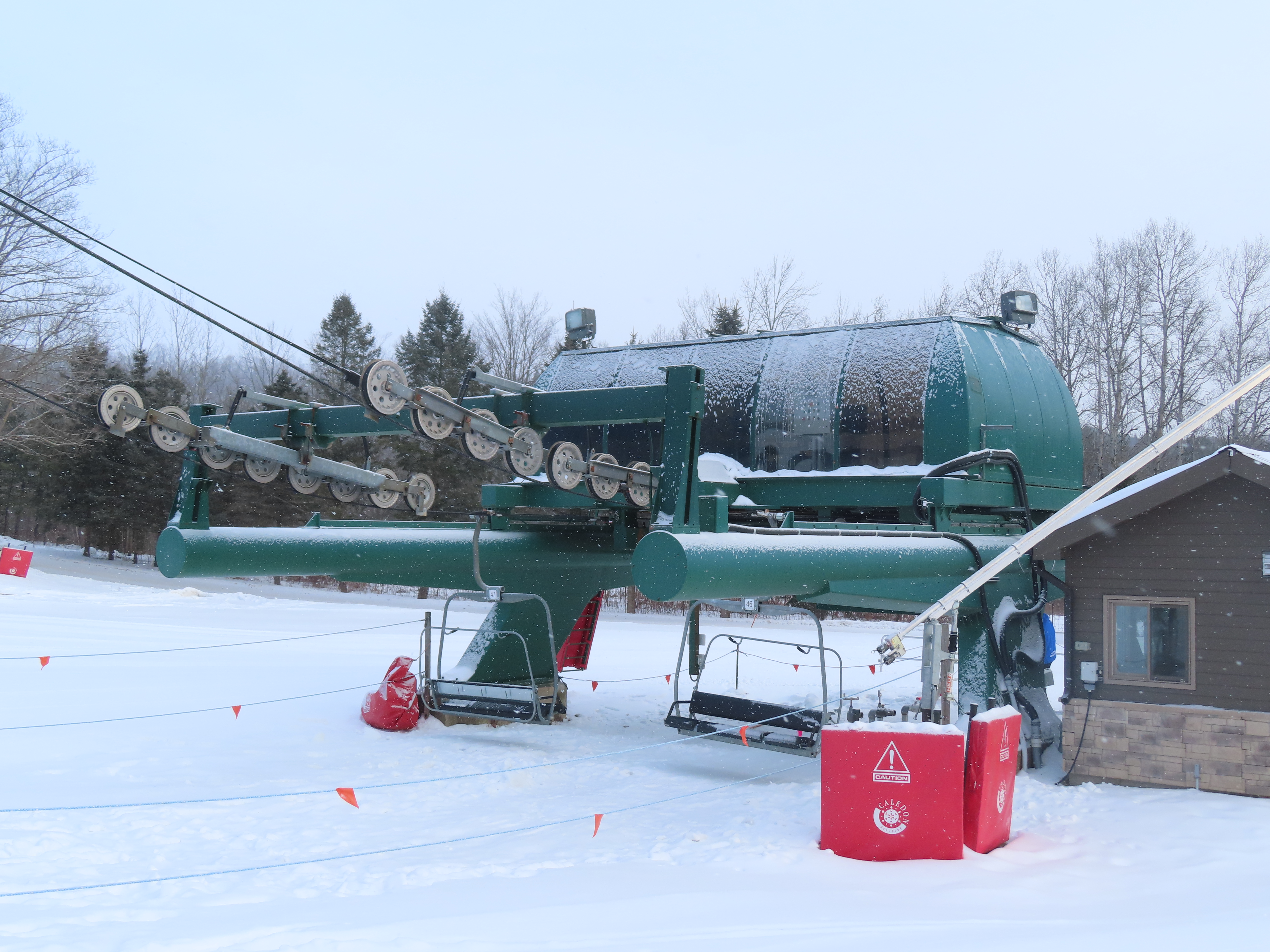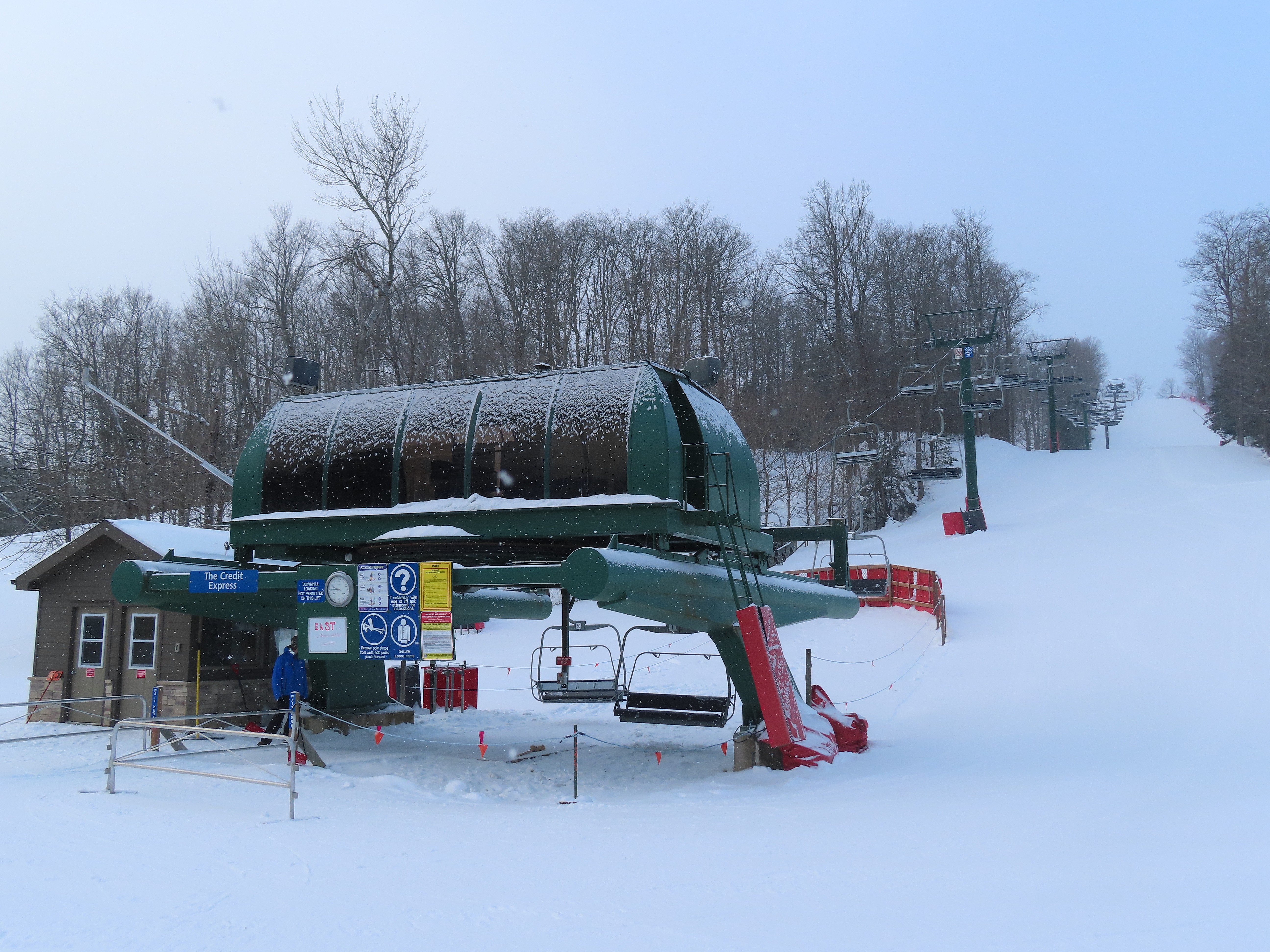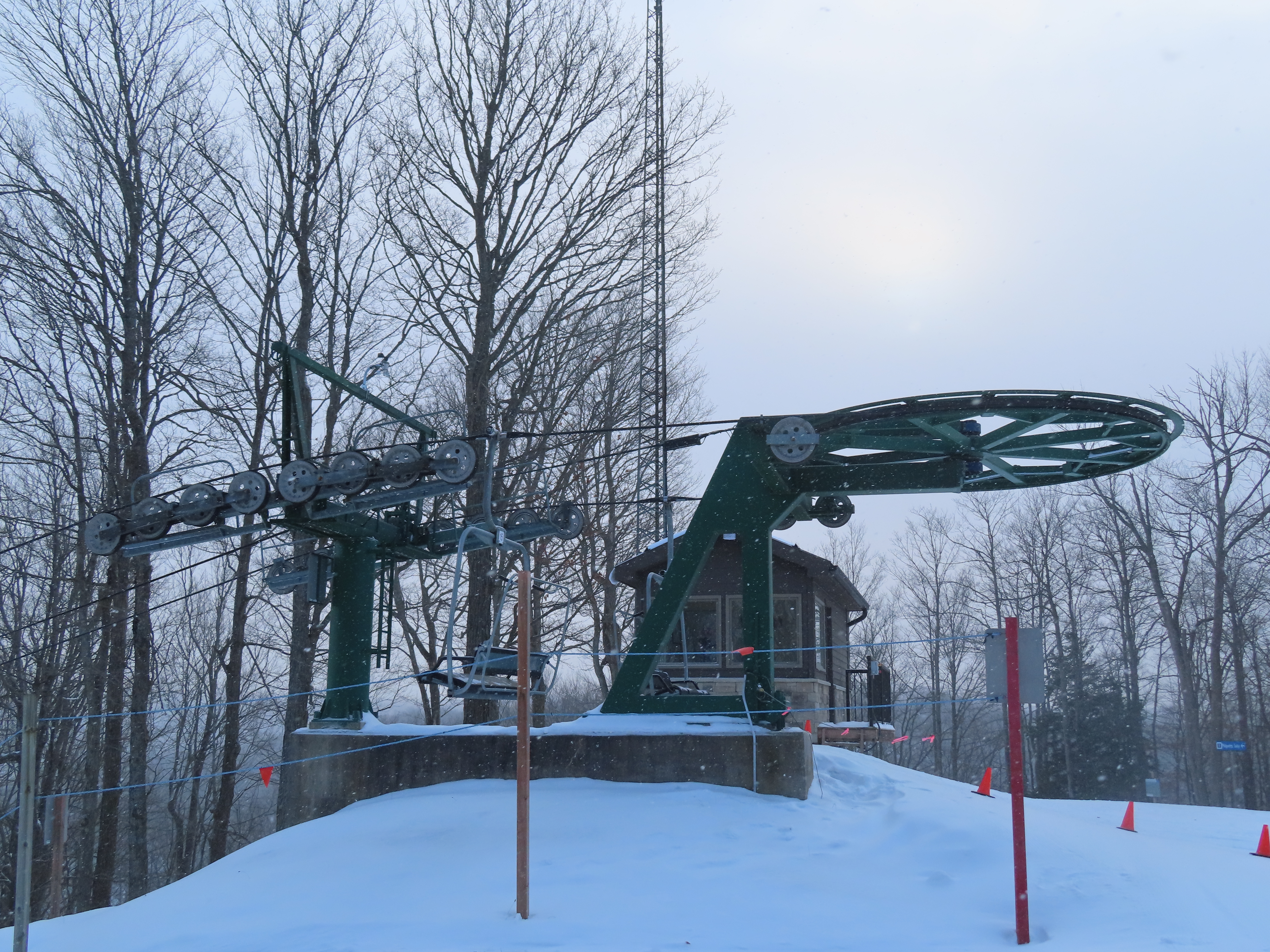 This is the last remaining of several Blue Mountain lifts built at Caledon.Lift overview.Arriving at the top terminal.Return bullwheel at the summit.This lift mostly services a terrain park.View down the line.Upper lift line.Tower 1 and the bottom station.View riding up.A tower head with combination assemblies.